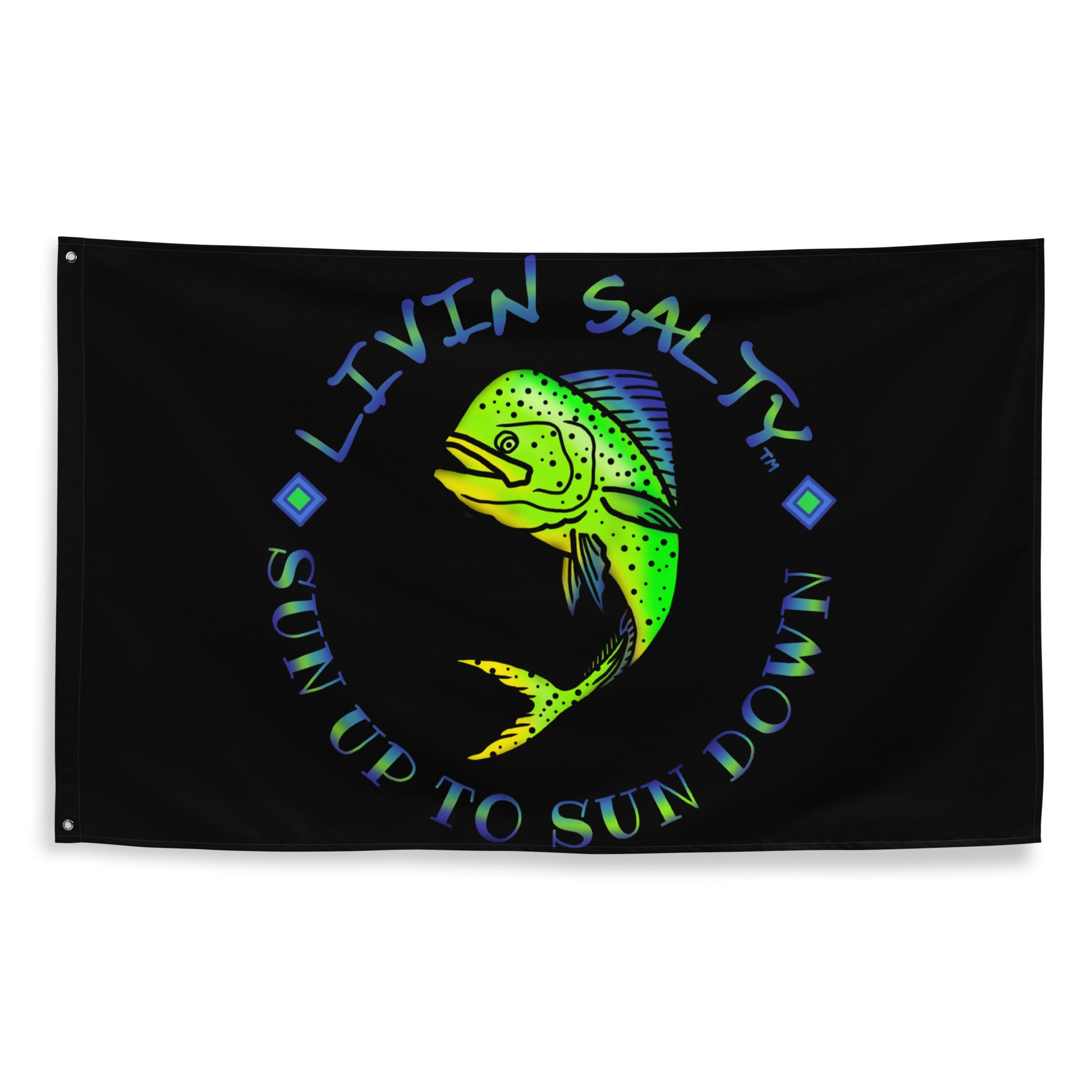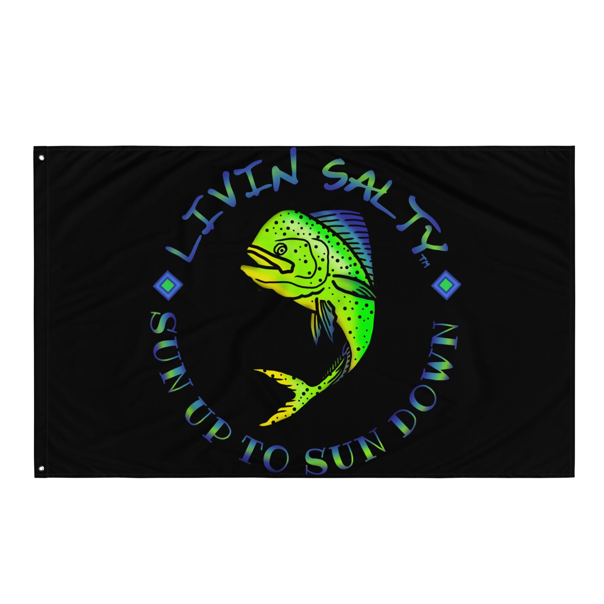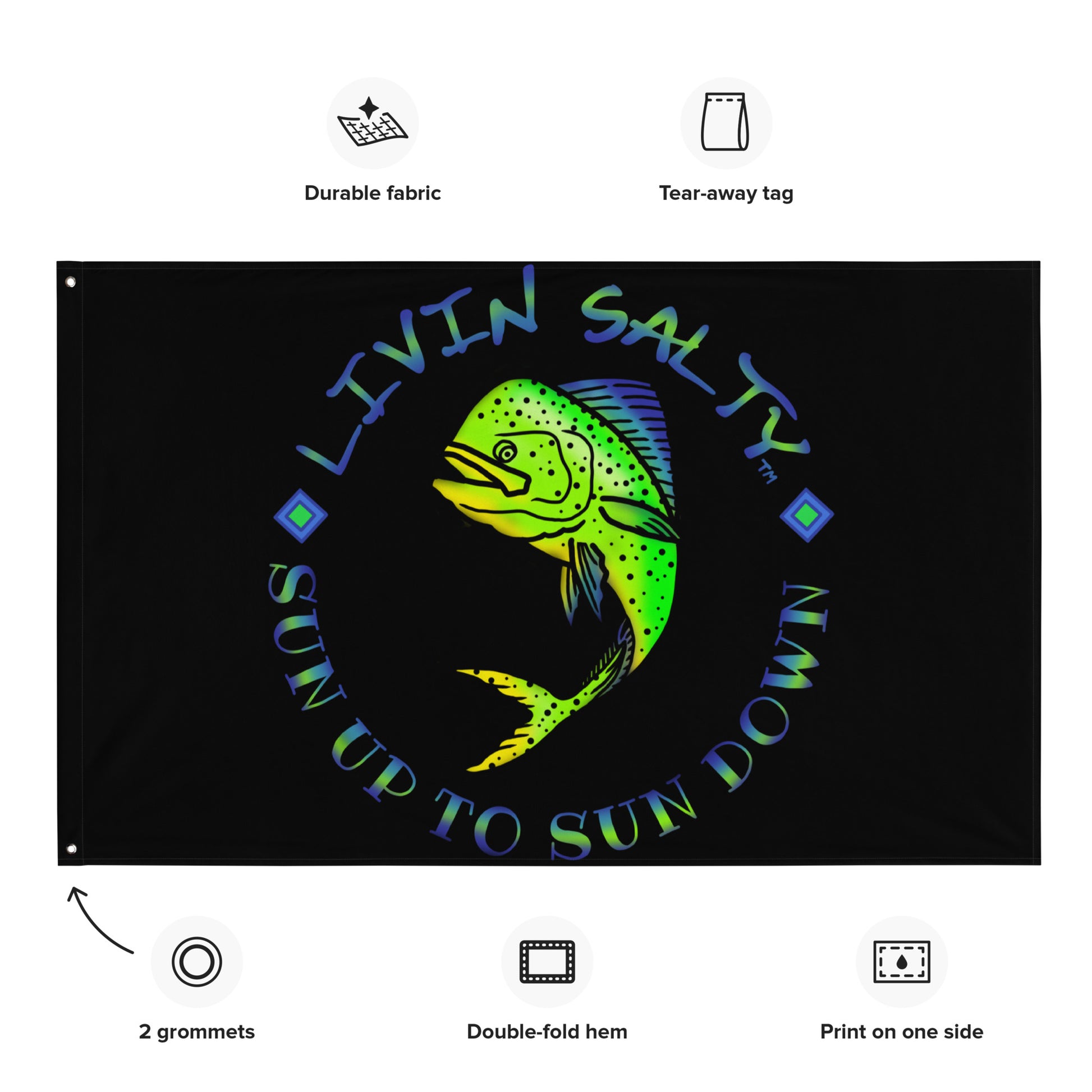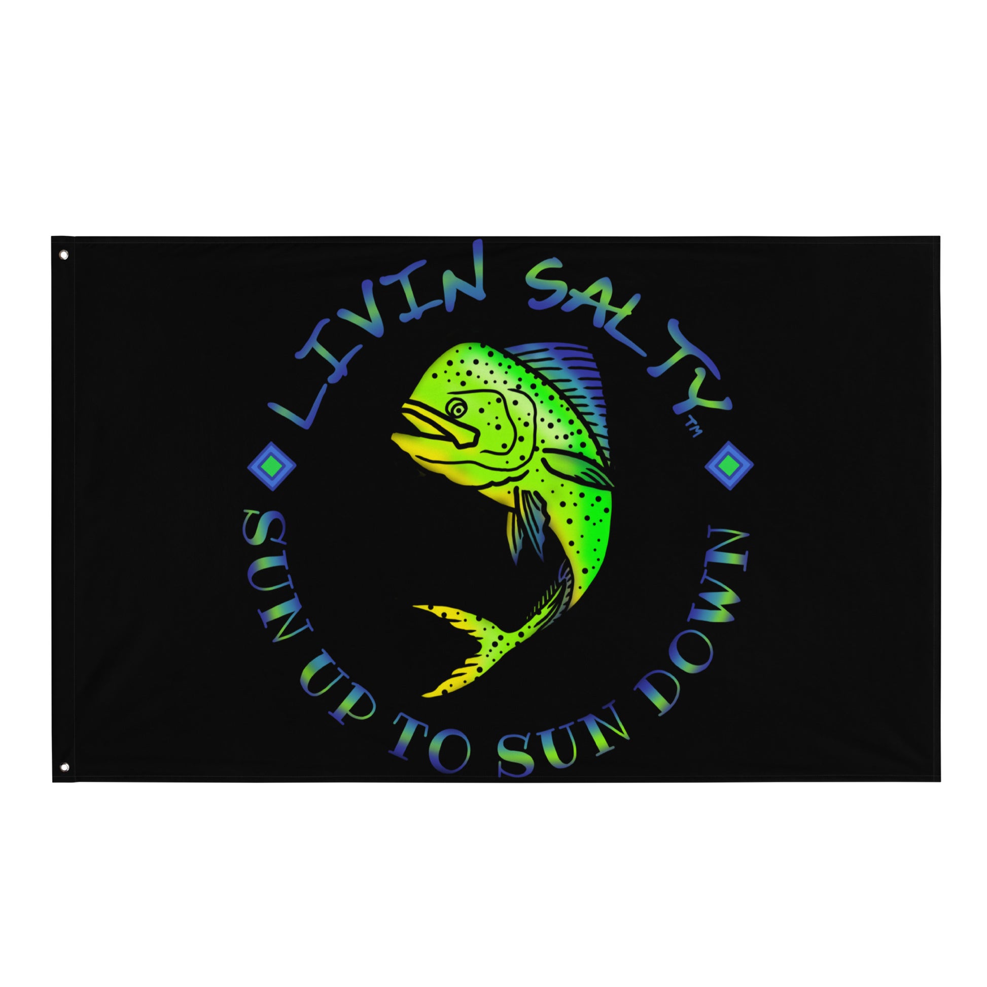 Featuring black flag with colorful LIVIN SALTY Mahi, sun up to sun down.