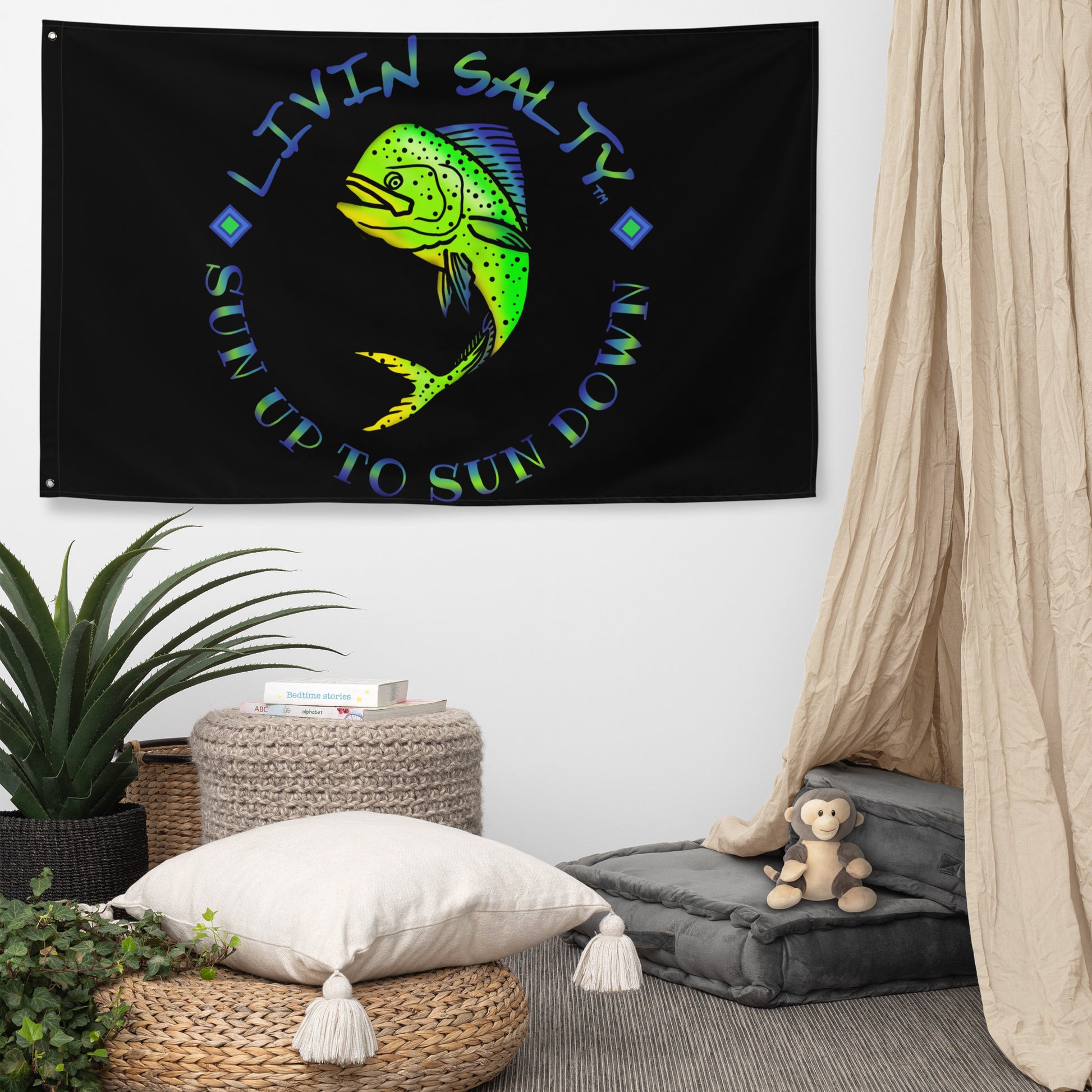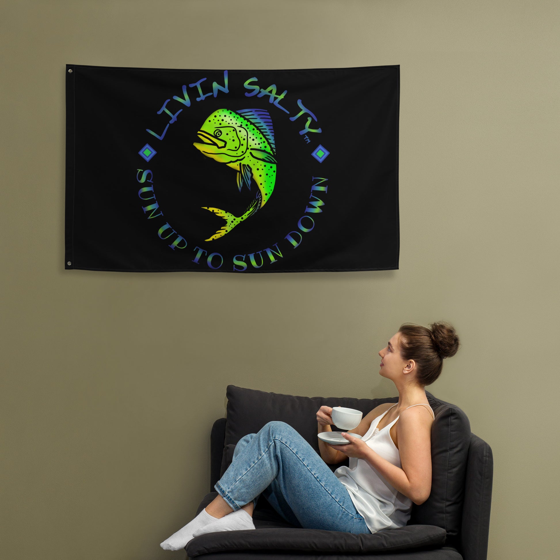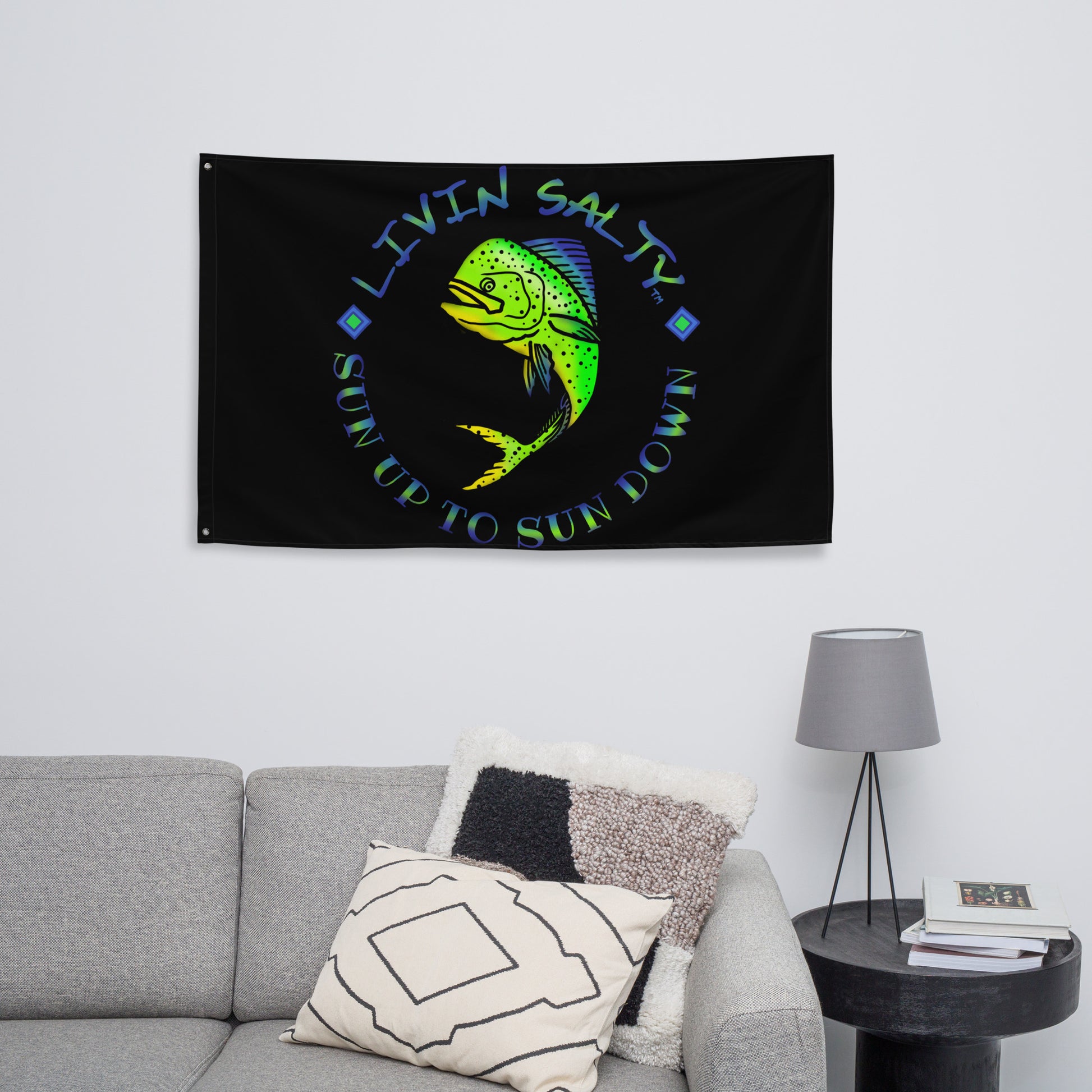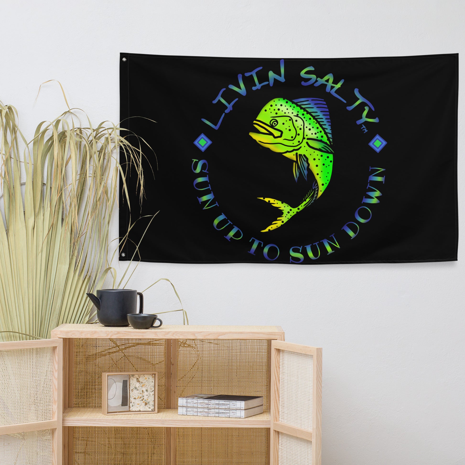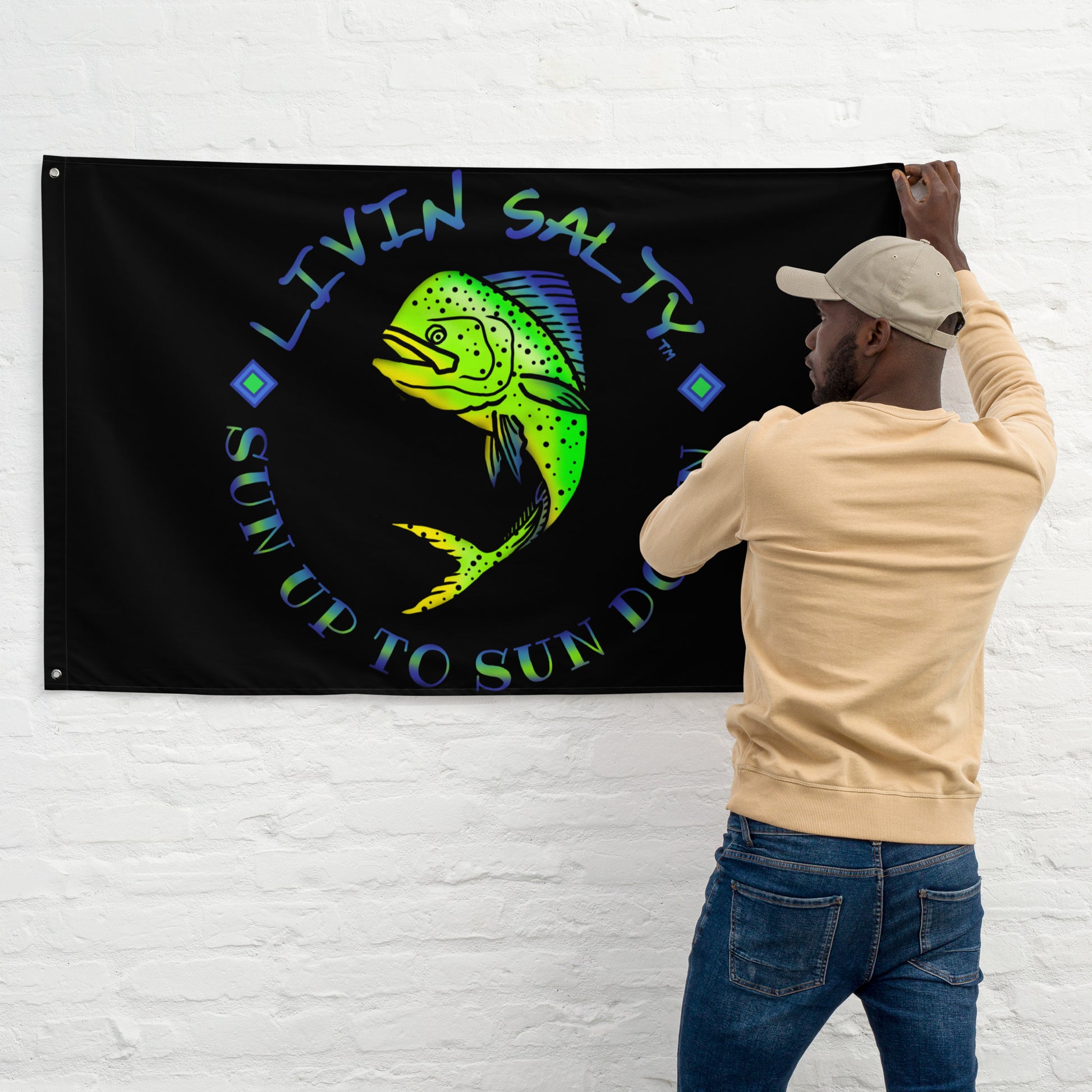 Featuring black flag with colorful LIVIN SALTY Mahi, sun up to sun down.