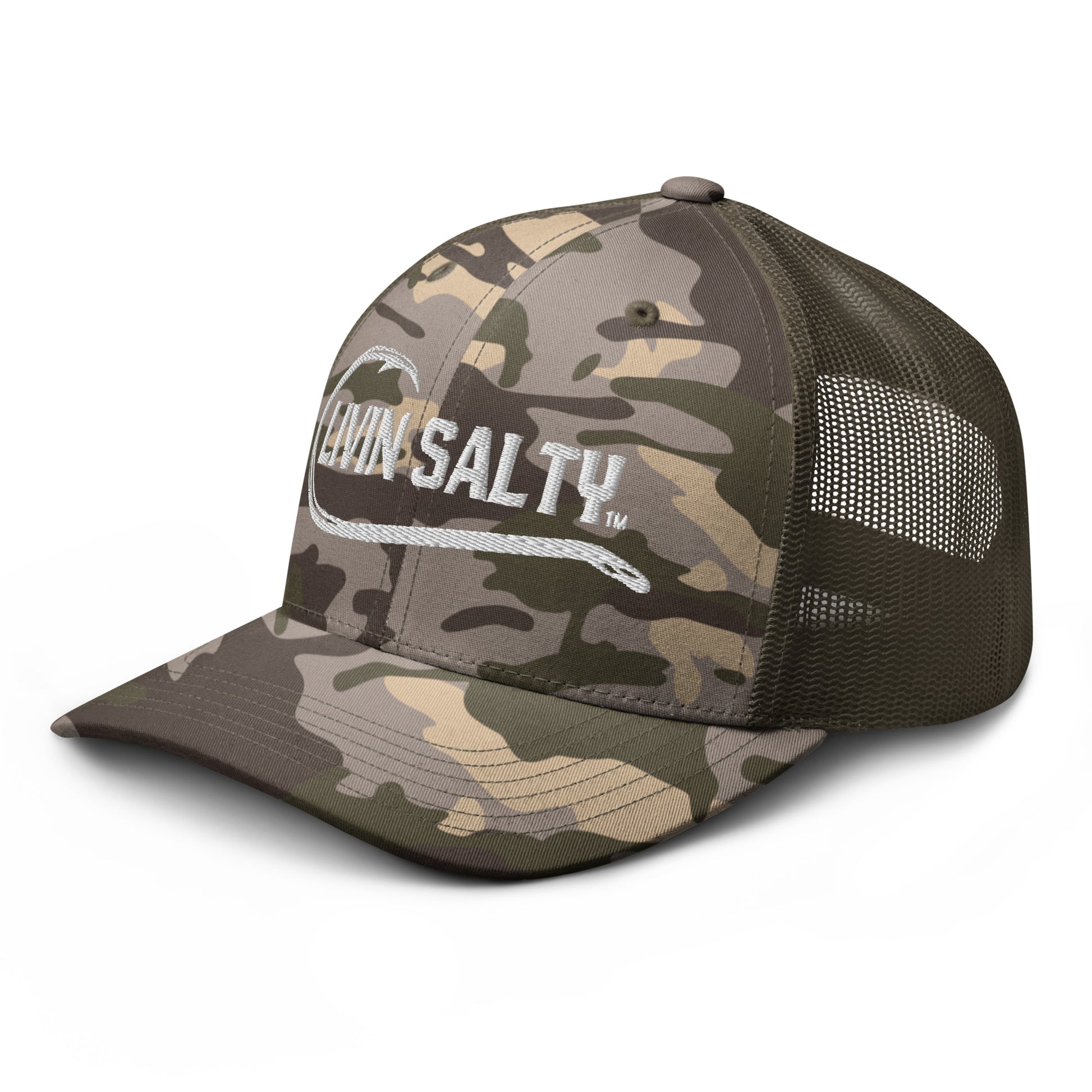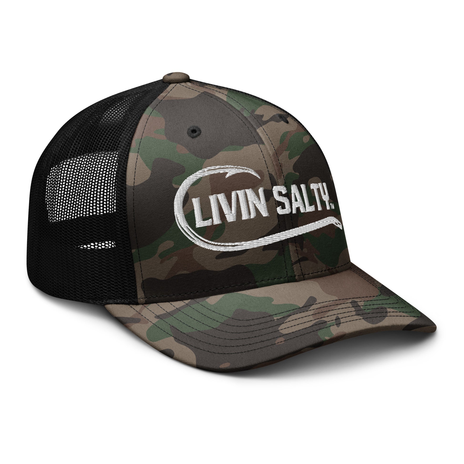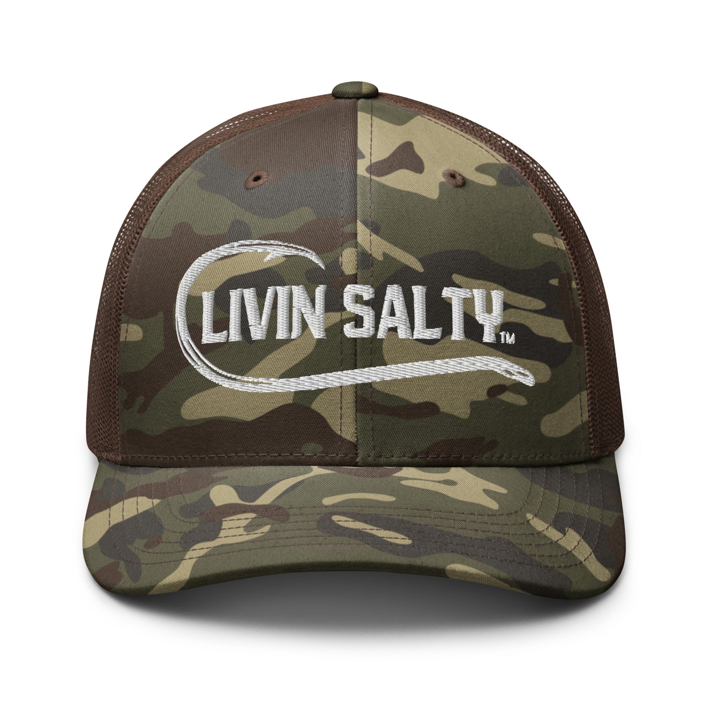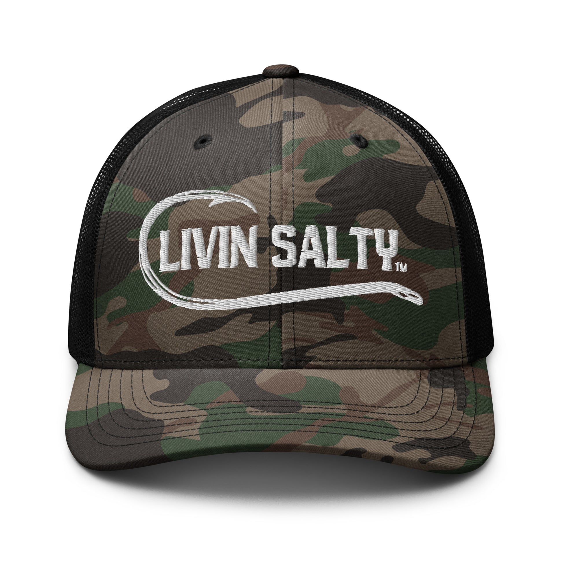 Camouflage LIVIN SALTY fishing hook logo trucker hat