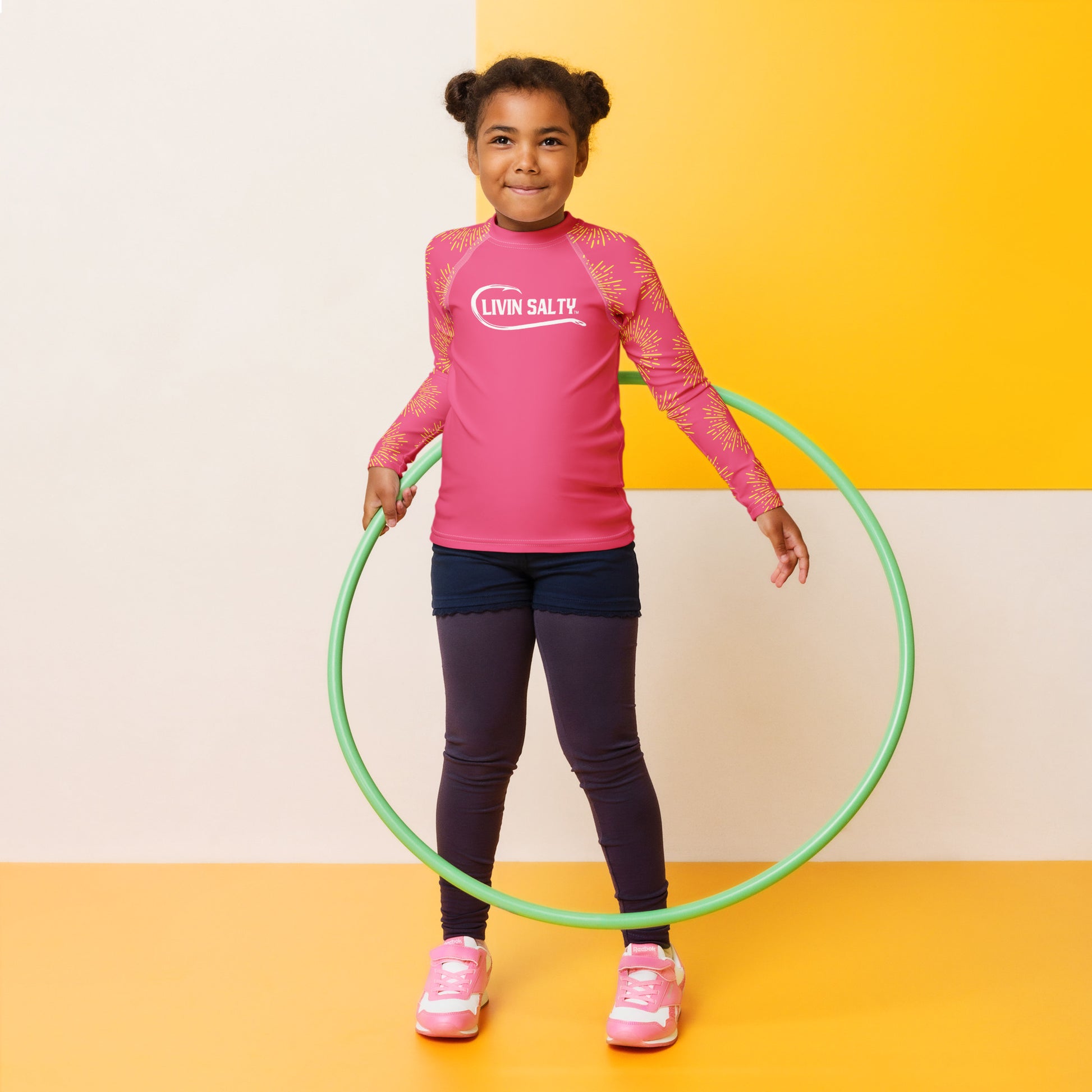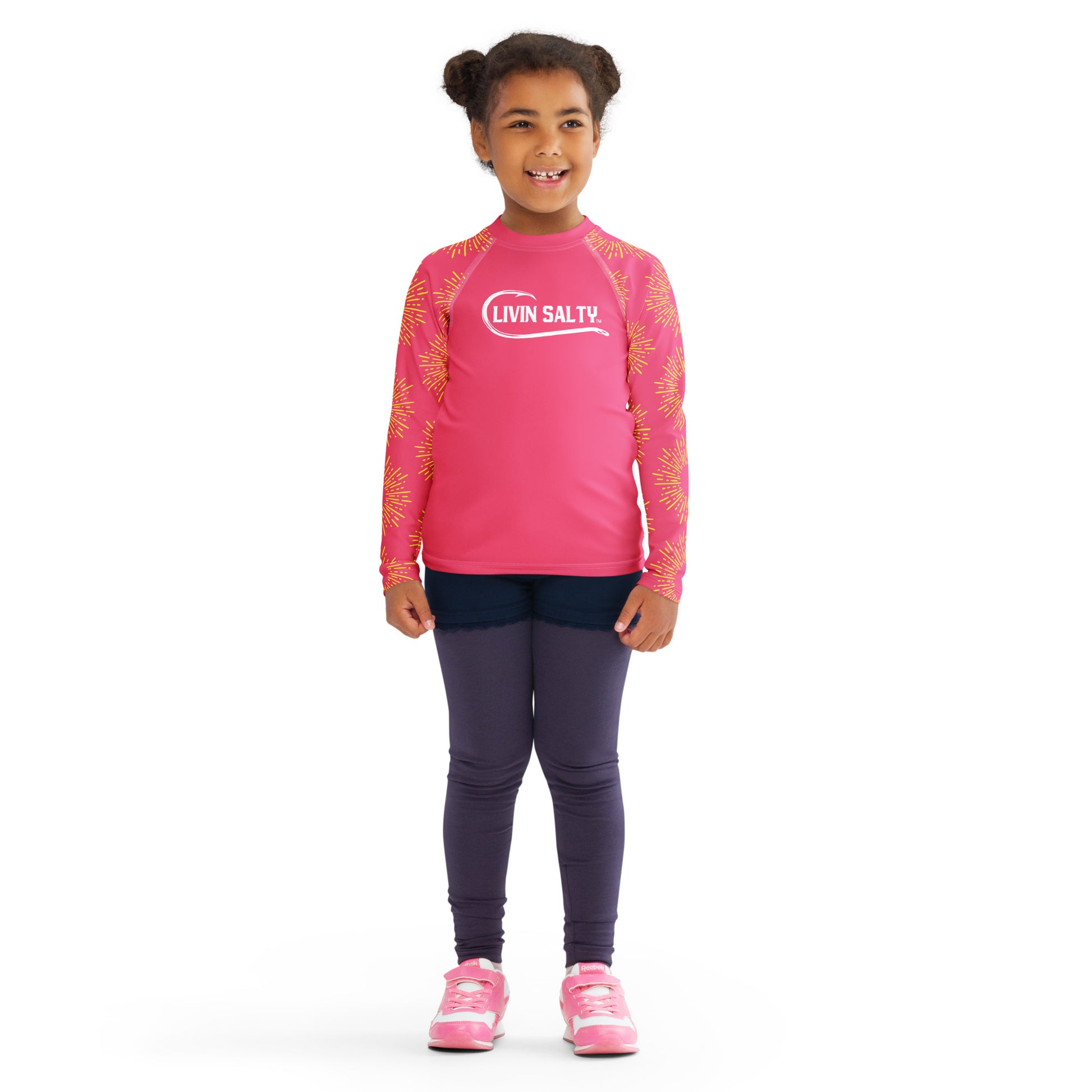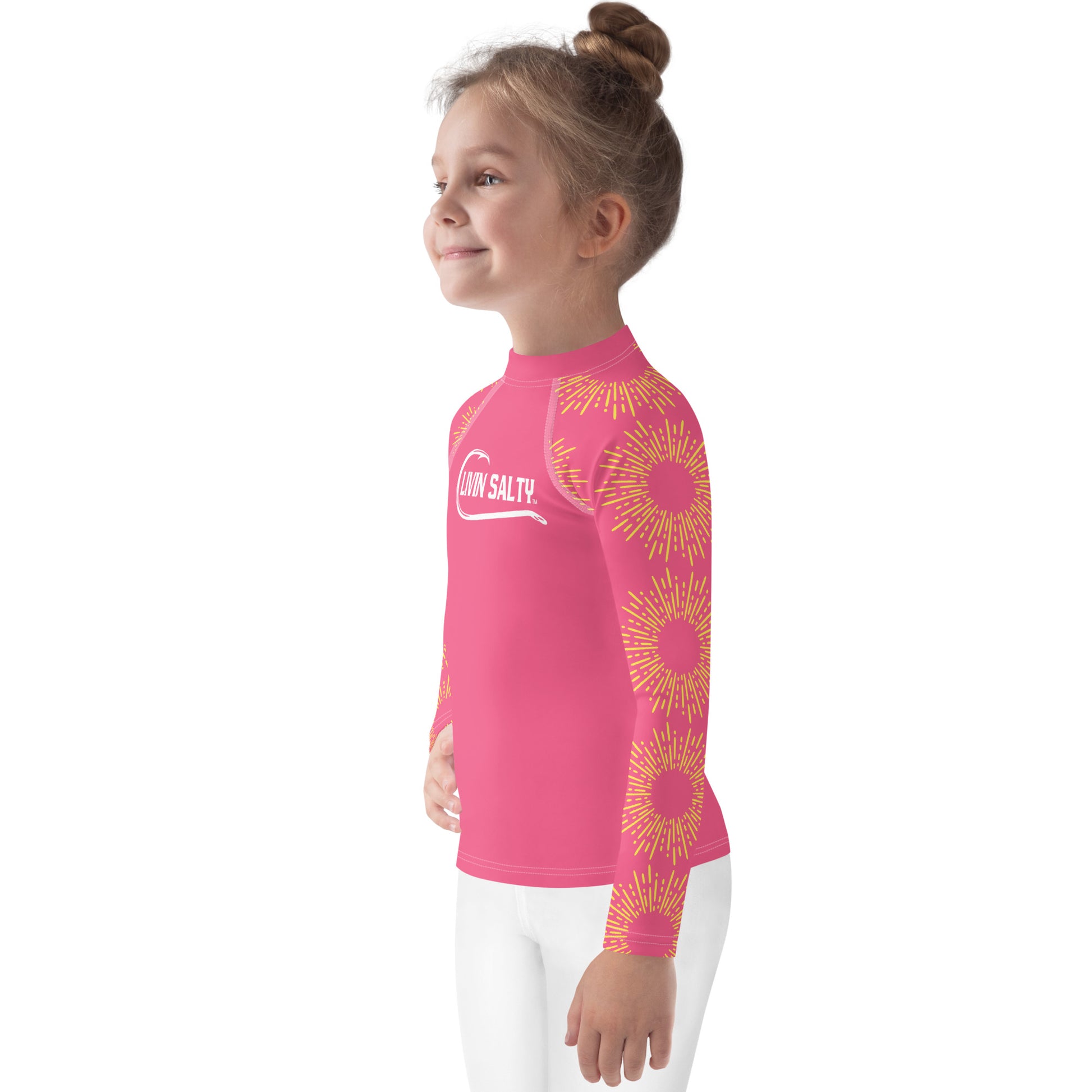Featuring this pink long sleeve swimwear LIVIN SALTY rash guard.