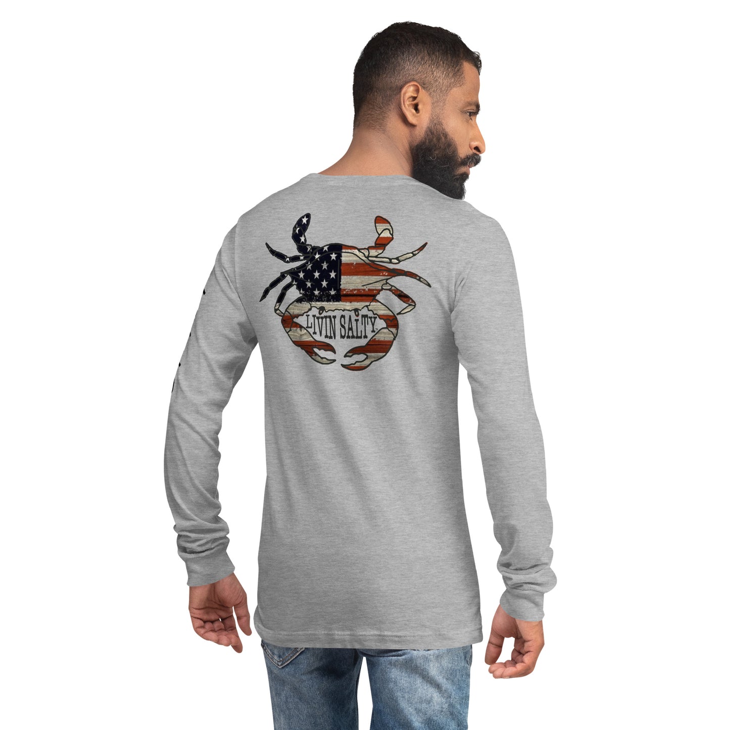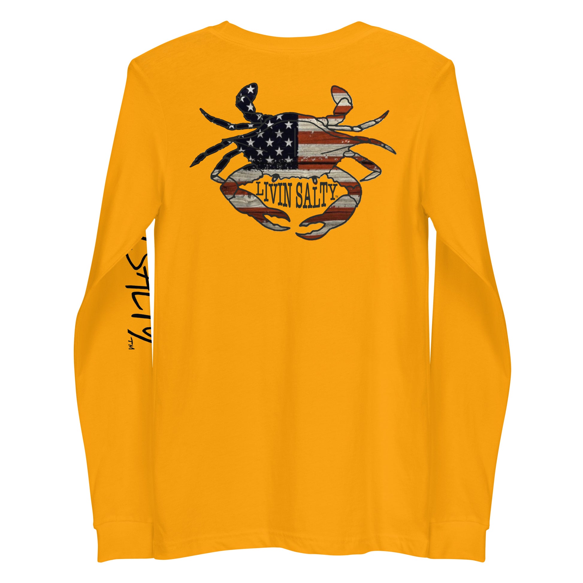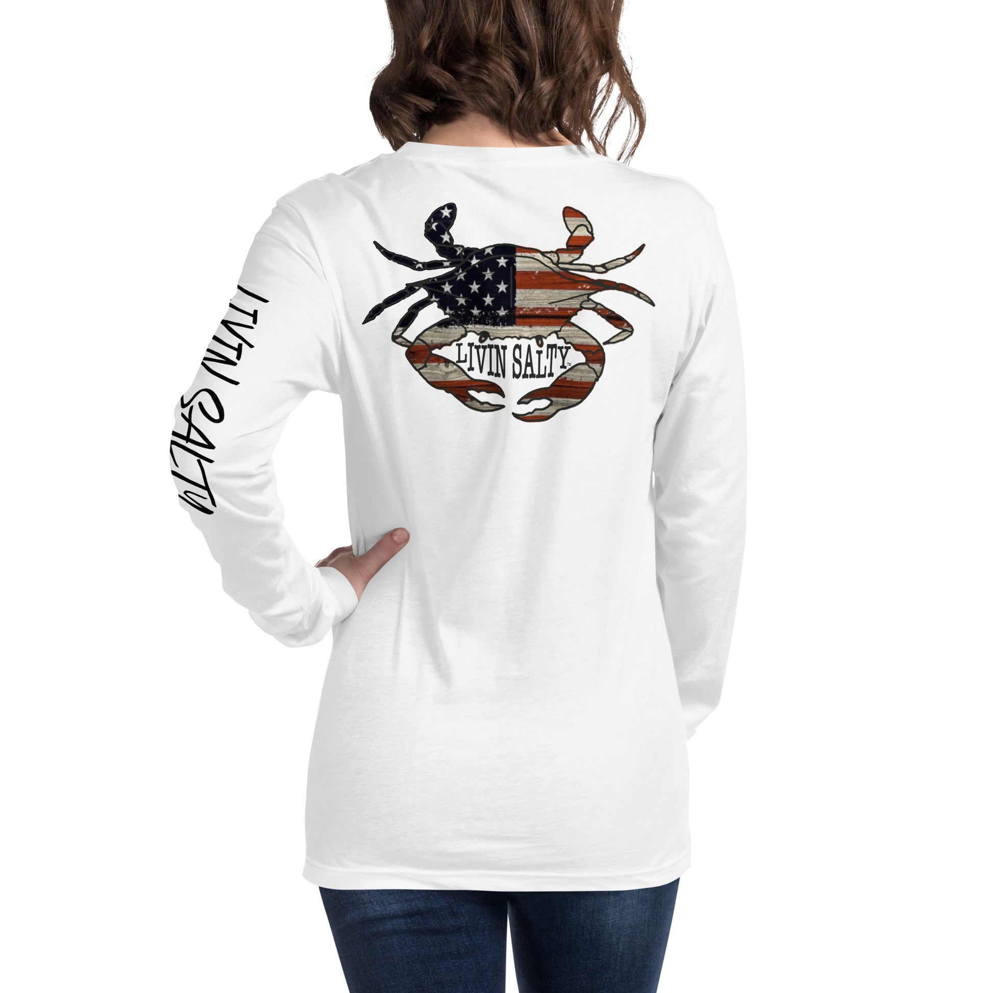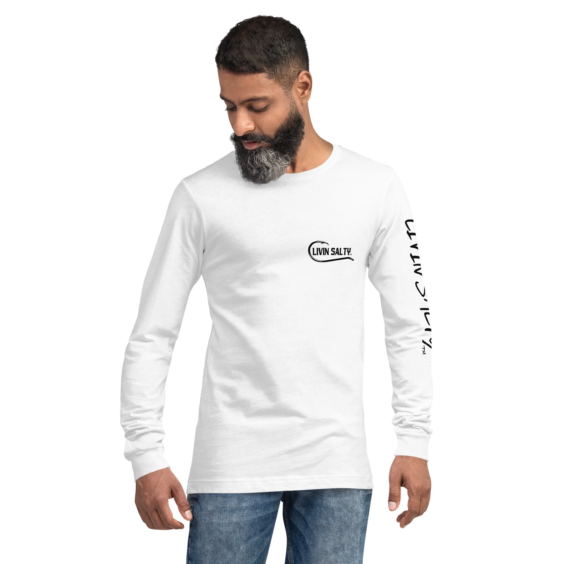 Featuring long sleeve tee with LIVIN SALTY on left chest and down left sleeve. Also contains the crab design on the back.