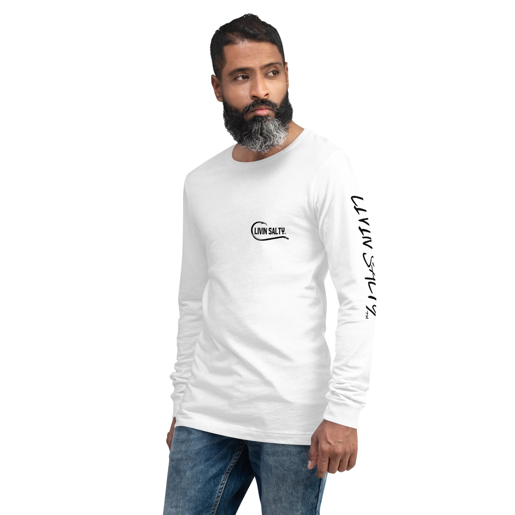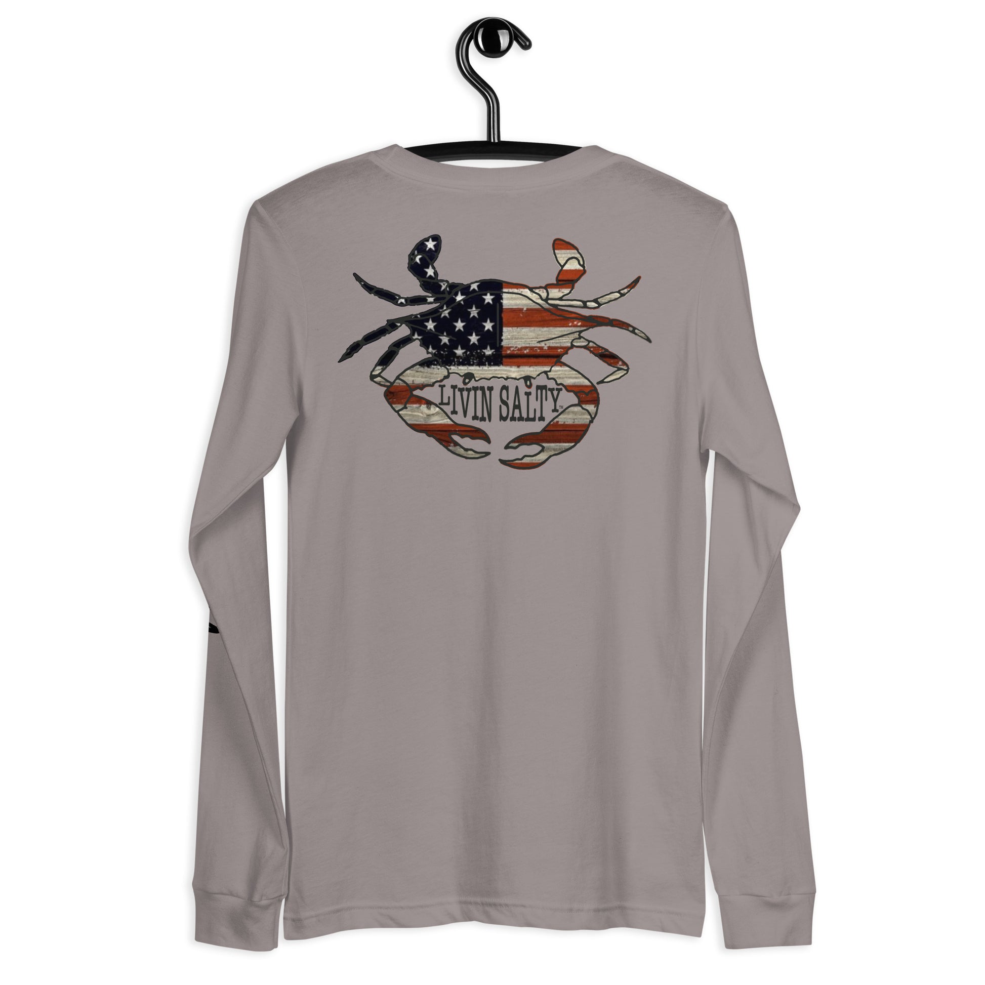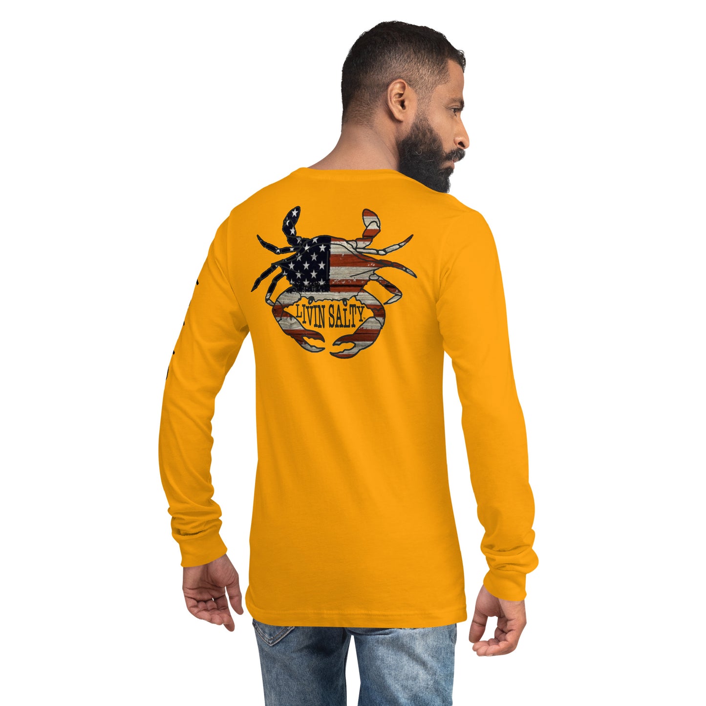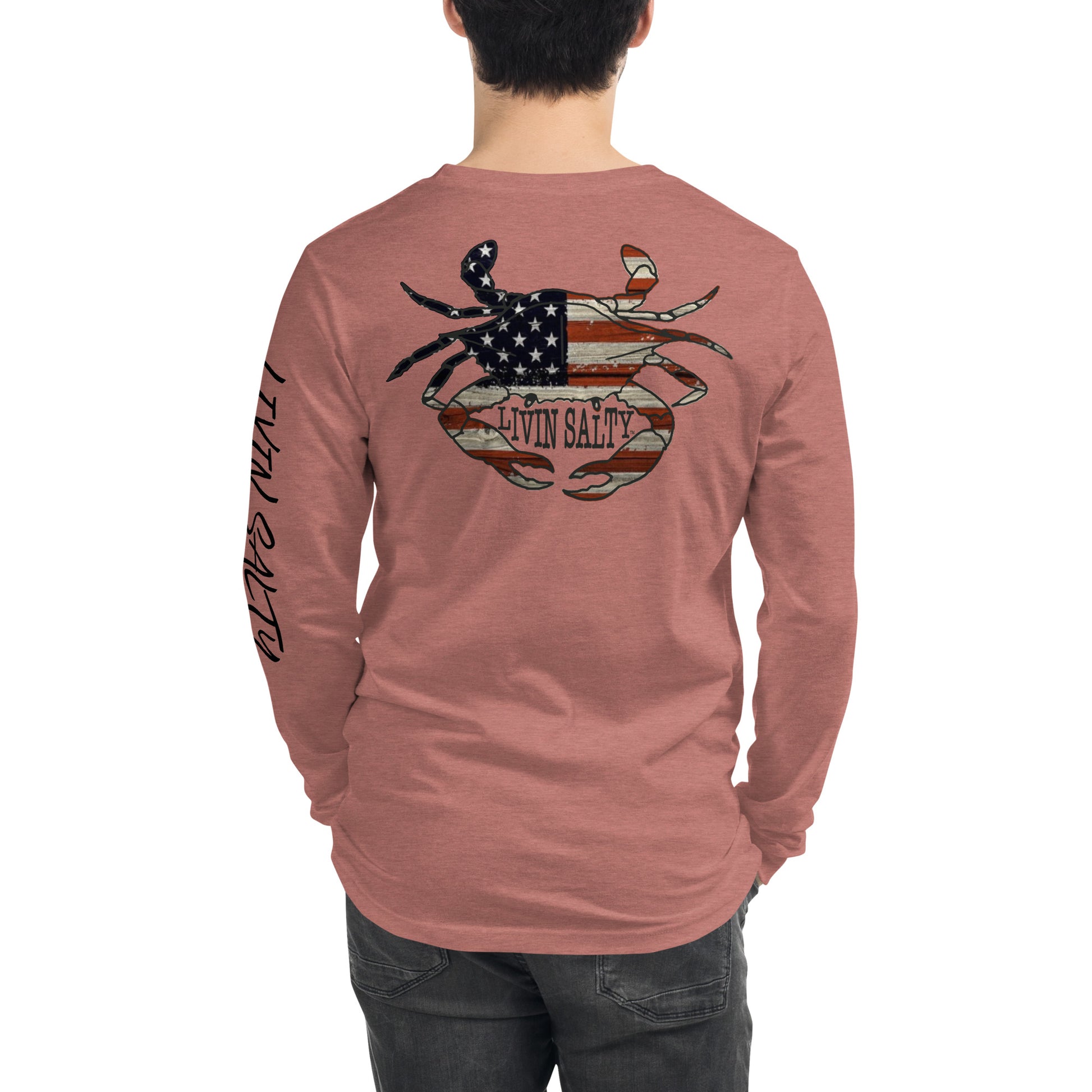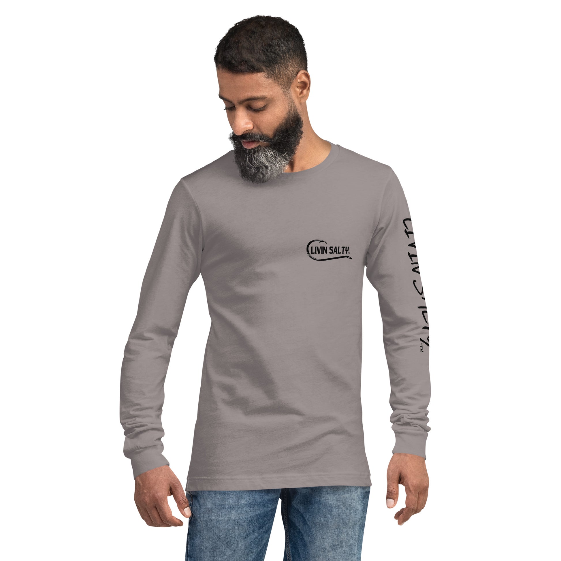 Featuring long sleeve tee with LIVIN SALTY on left chest and down left sleeve. Also contains the crab design on the back.