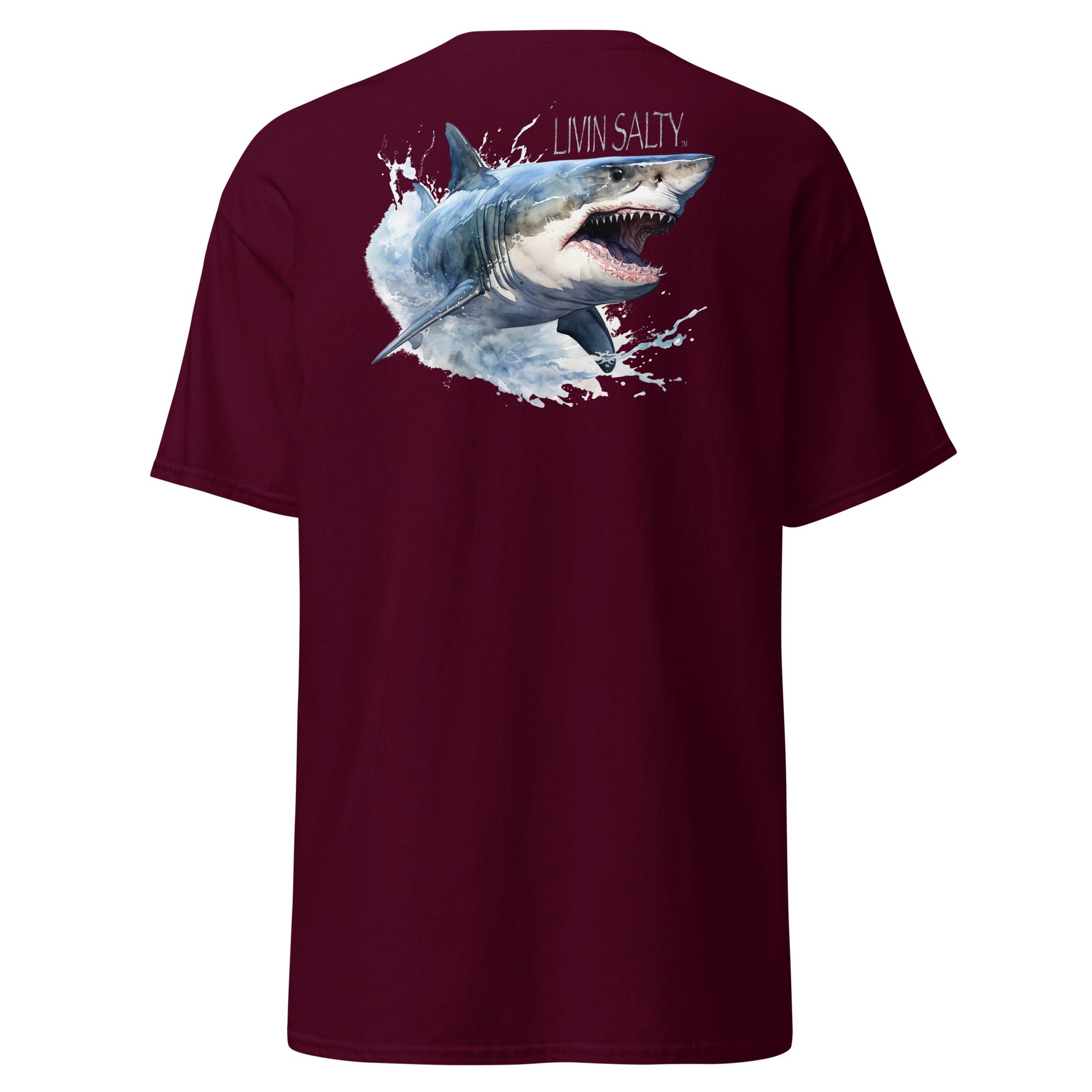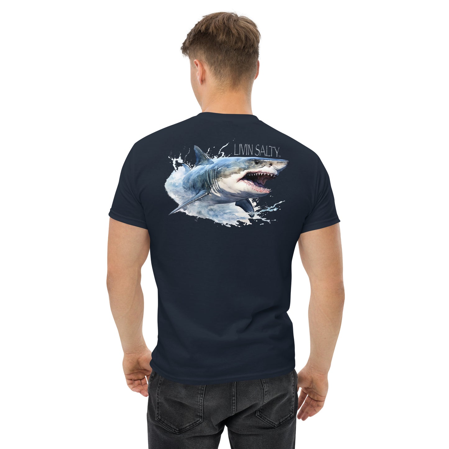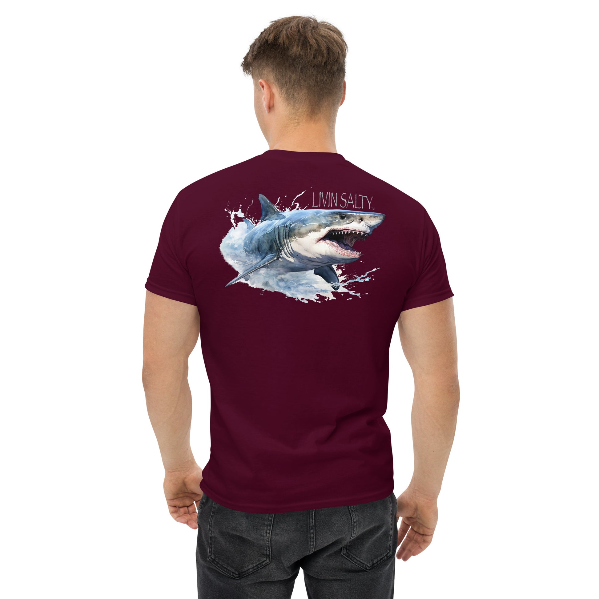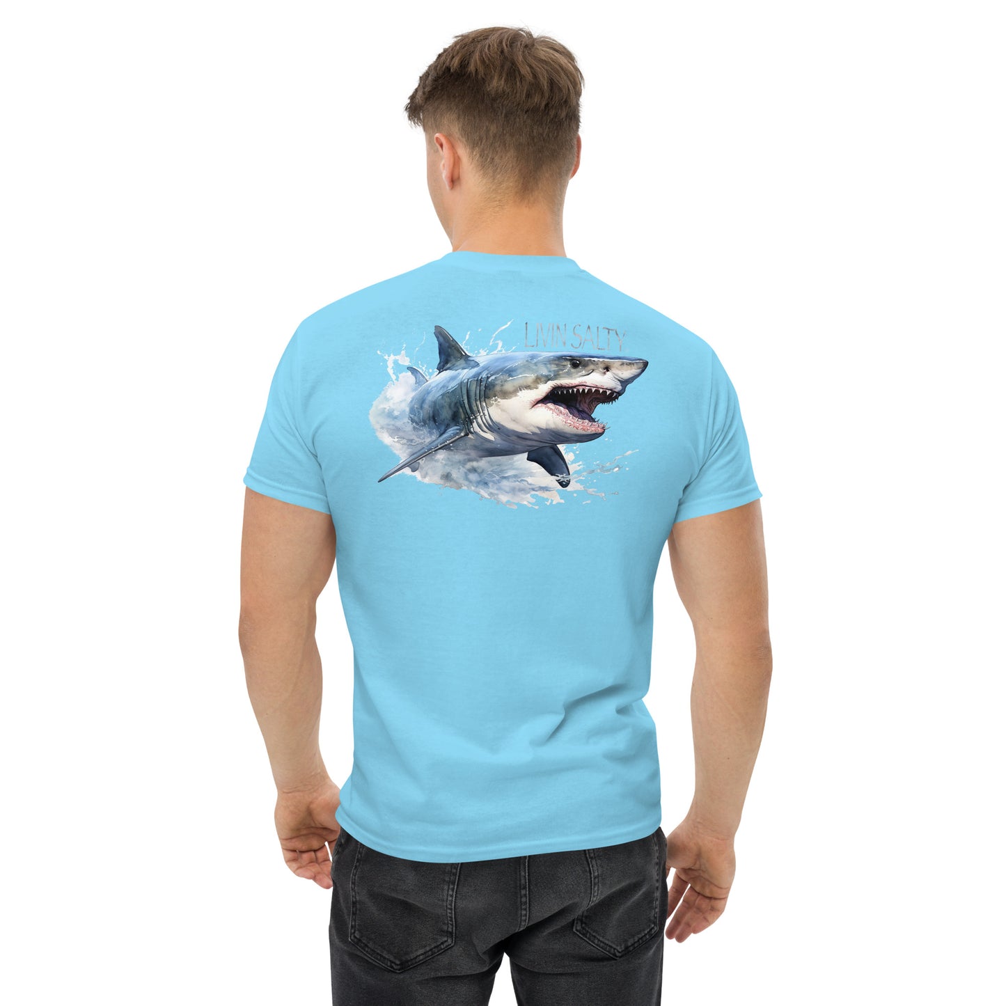 Featuring this Unisex tee with LIVIN SALTY hook logo on front chest, and Shark design on the back.