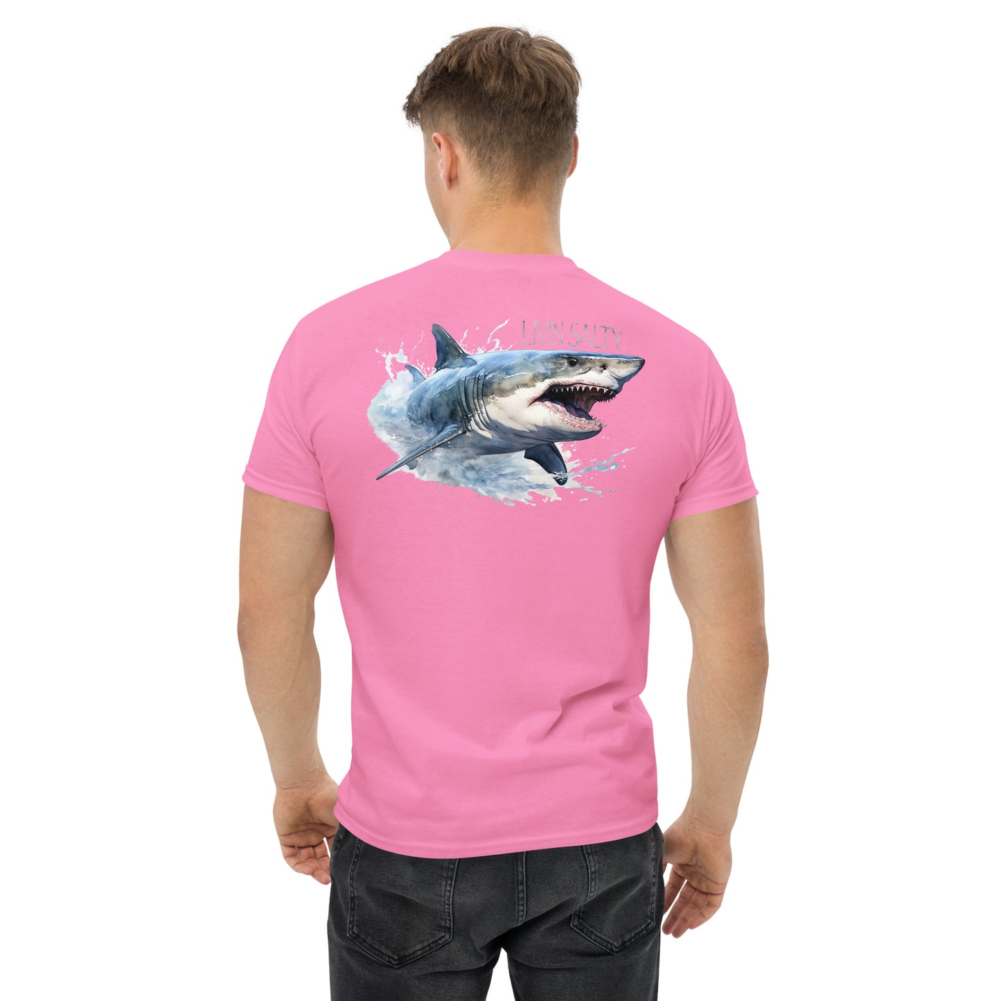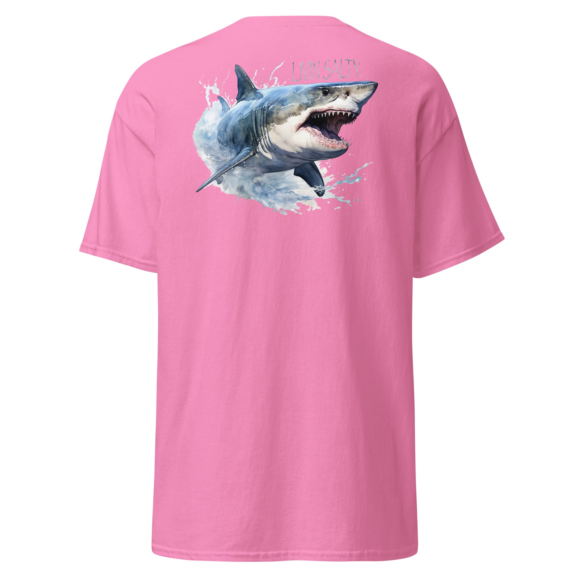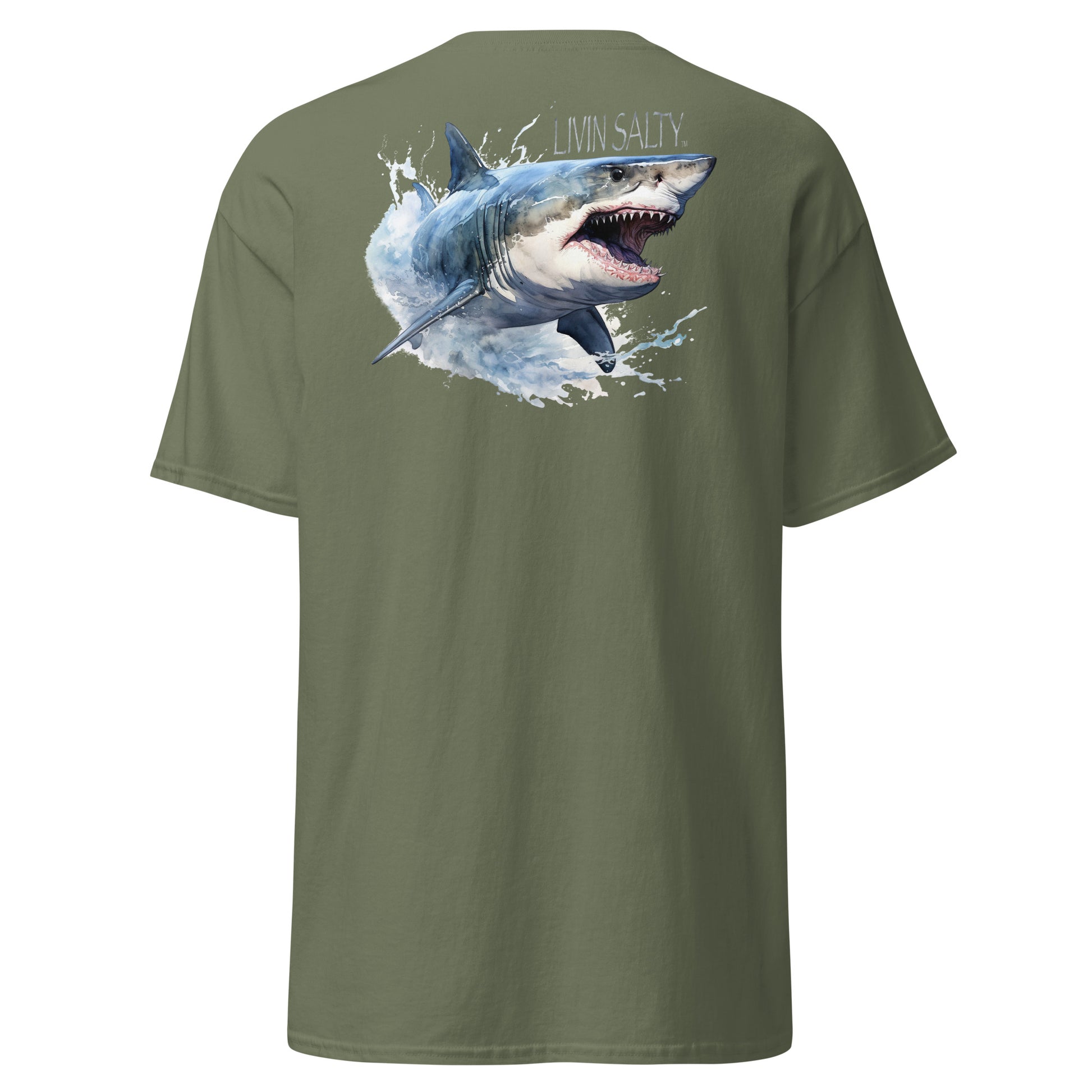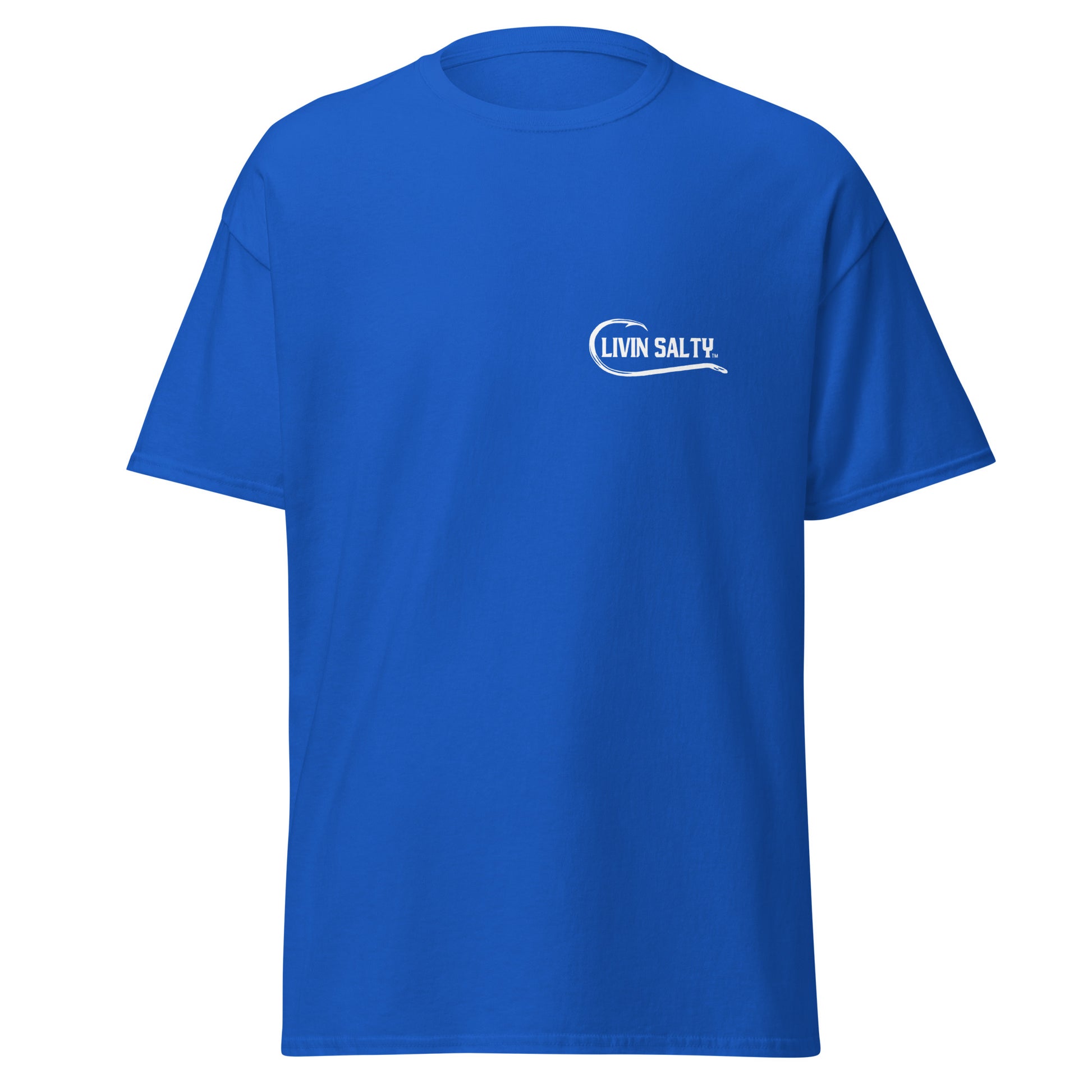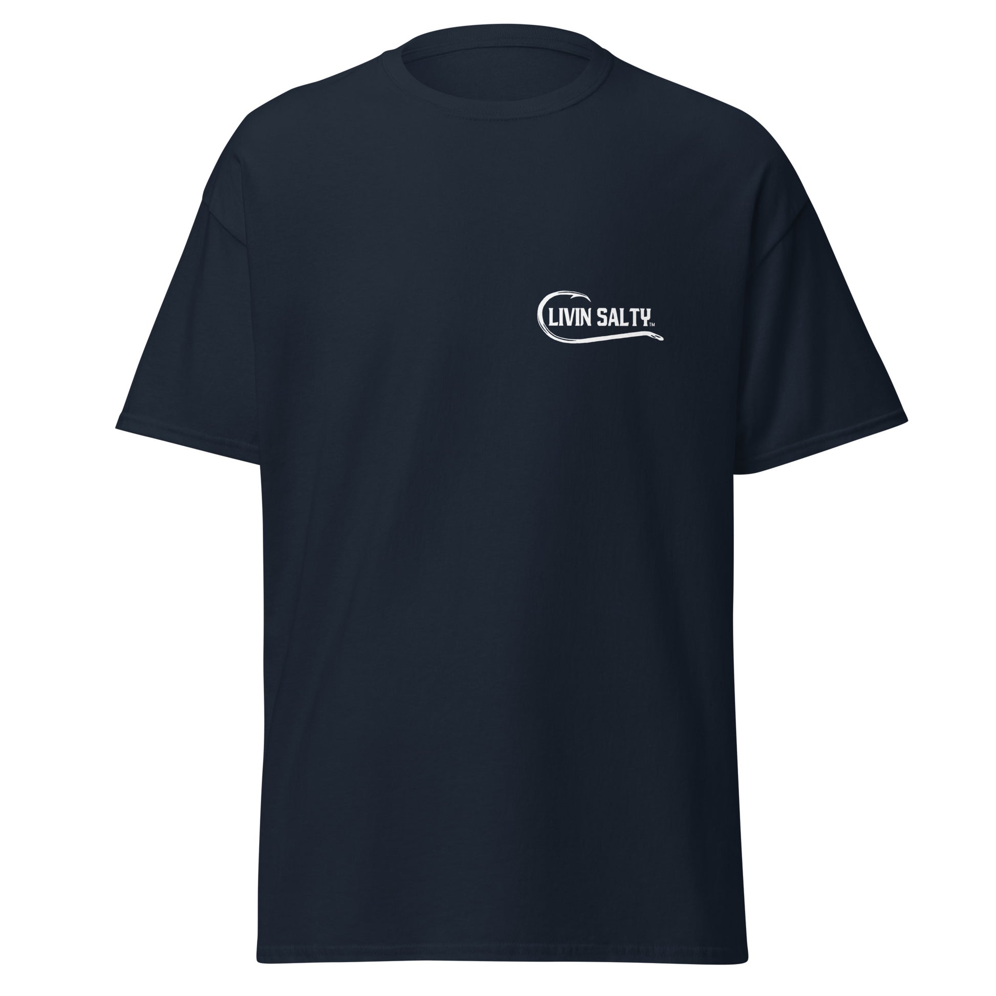 Featuring this Unisex tee with LIVIN SALTY hook logo on front chest, and Shark design on the back.