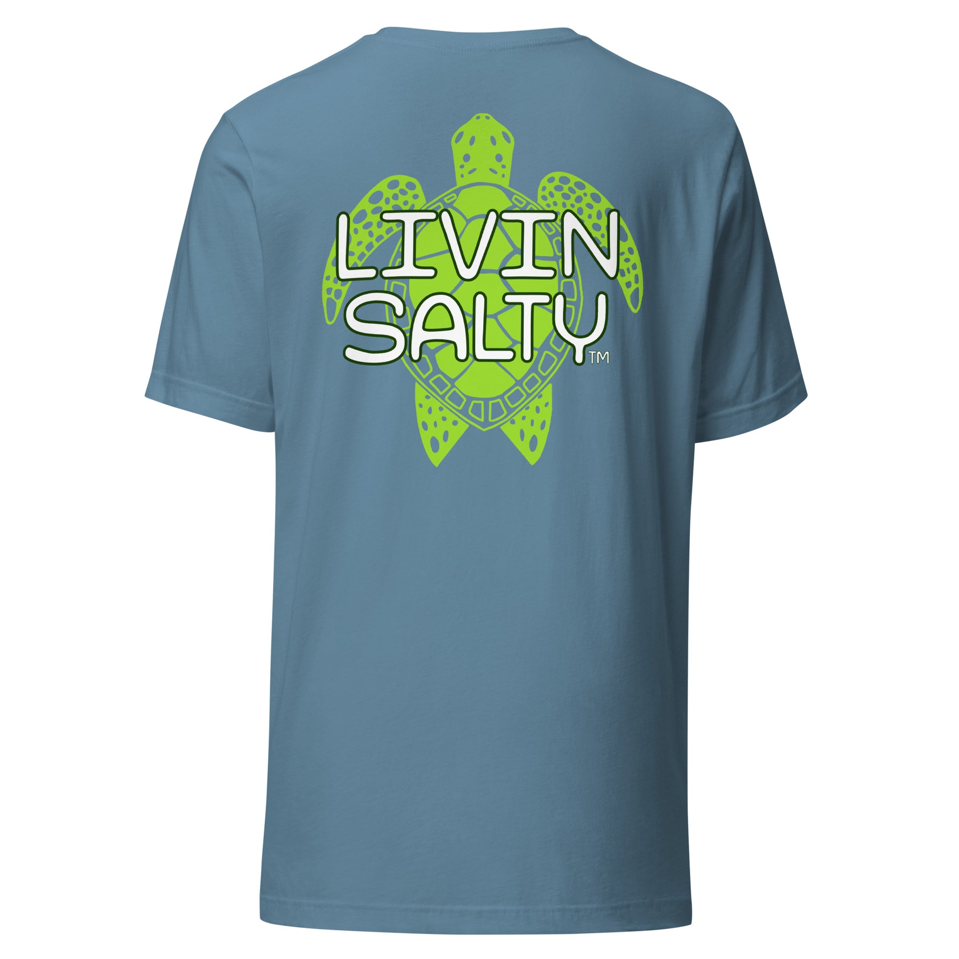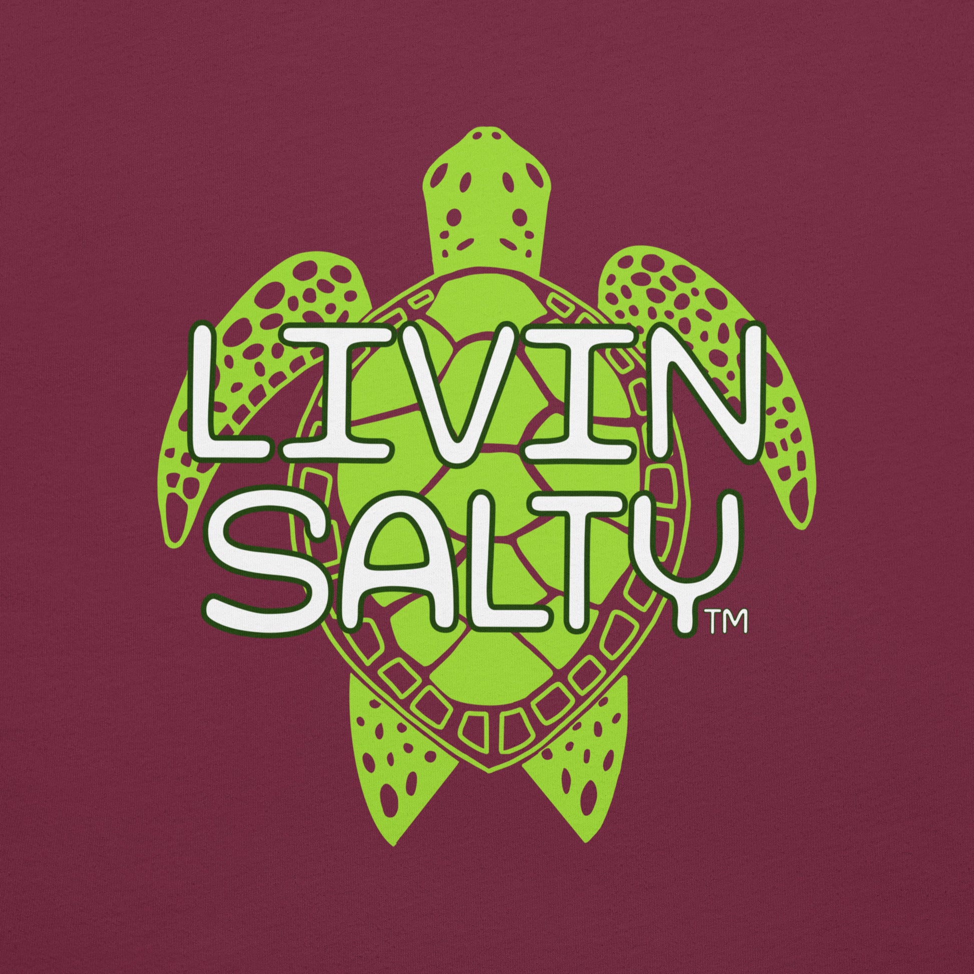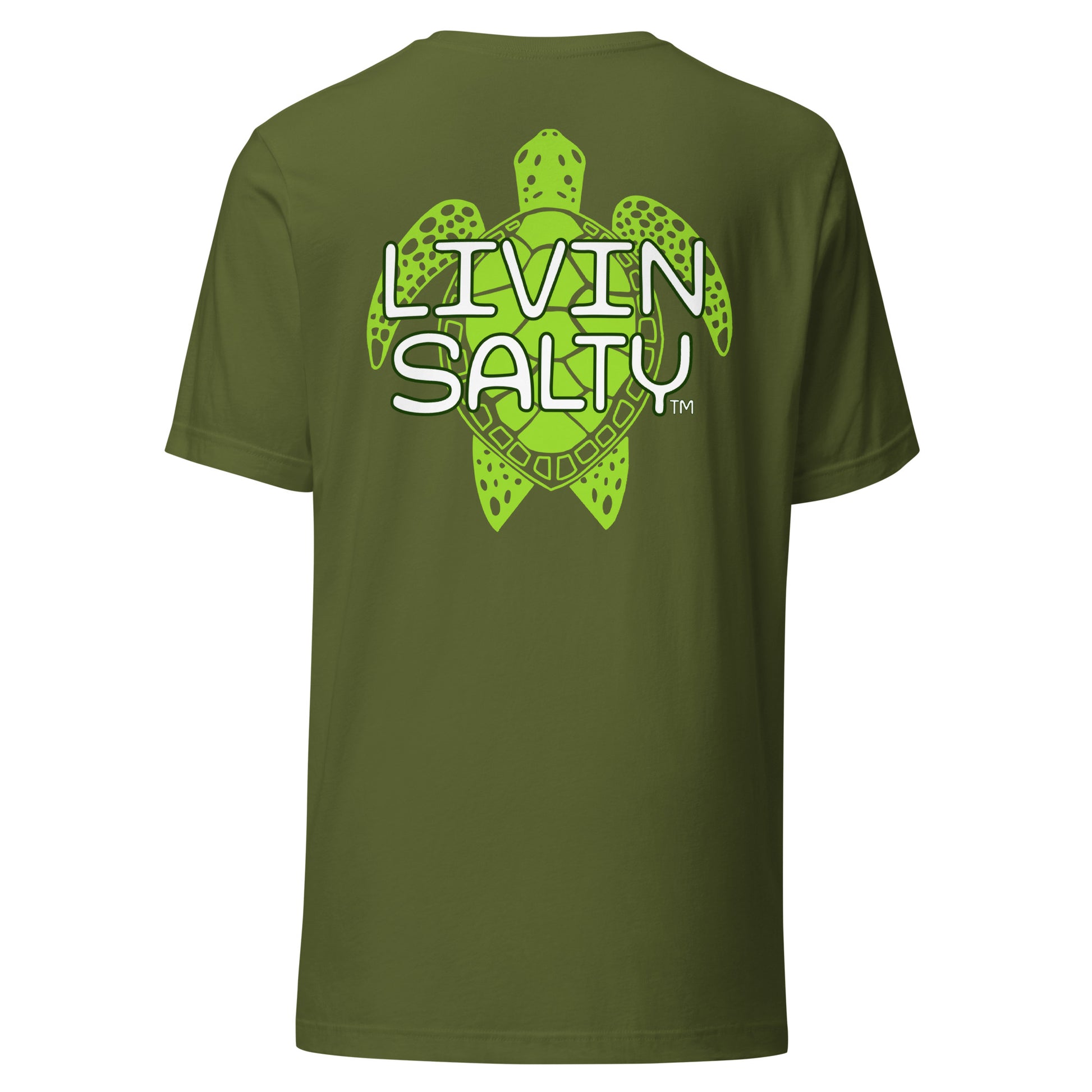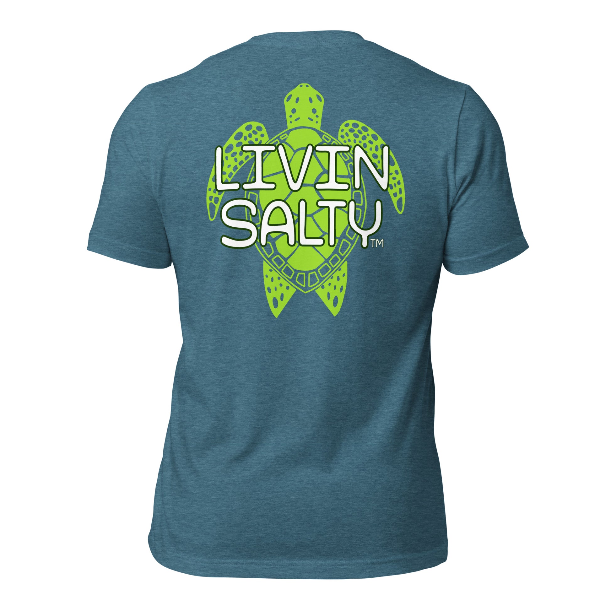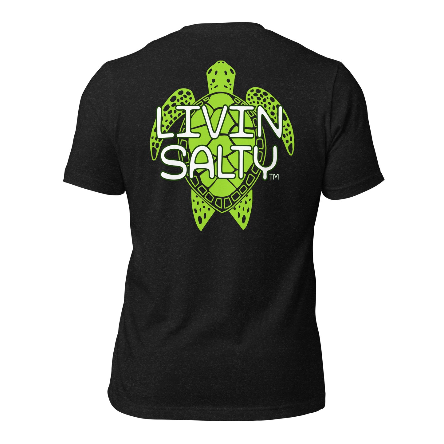 Featuring this simple bright green turtle design with LIVIN SALTY on the front and back.