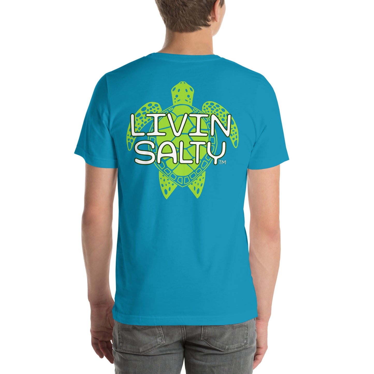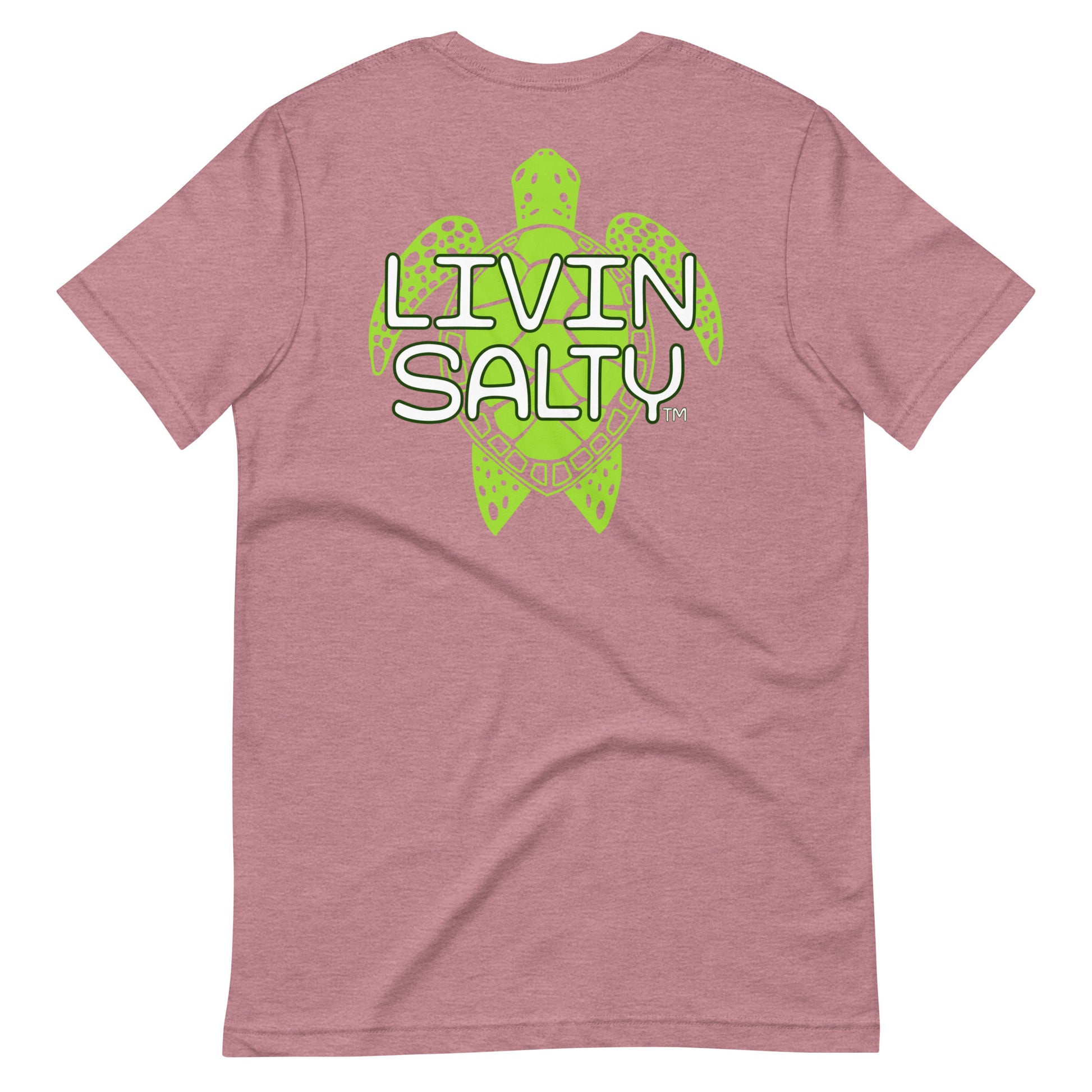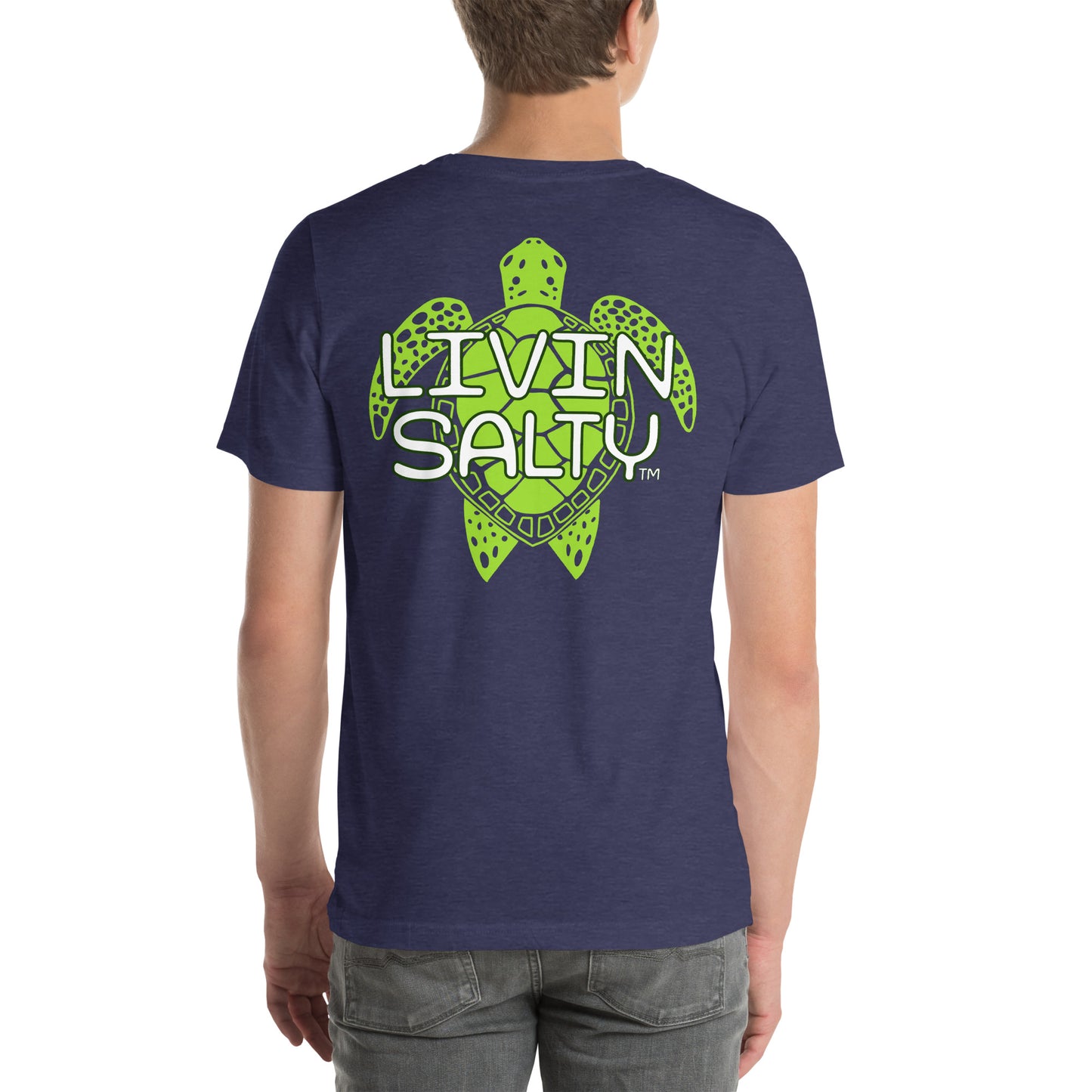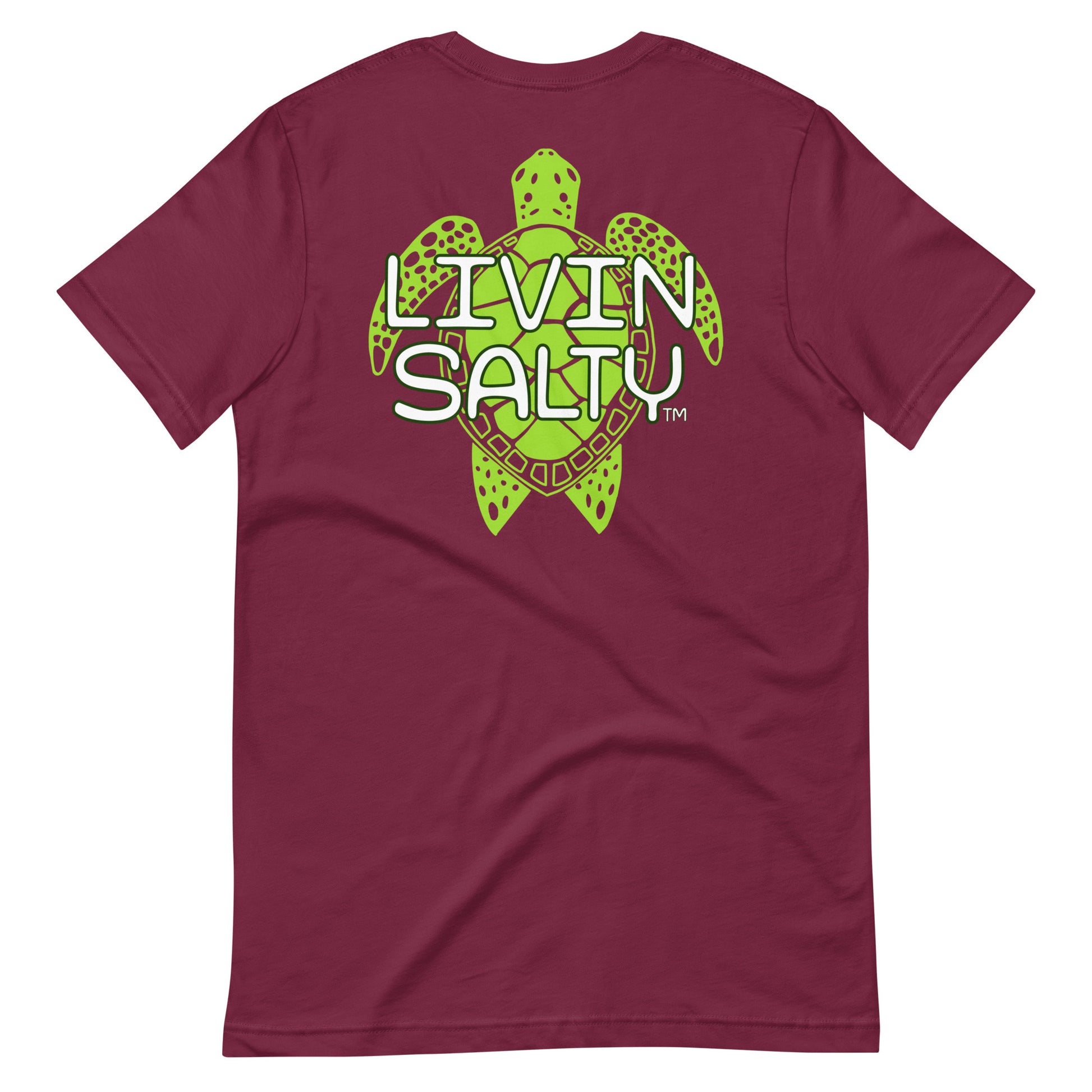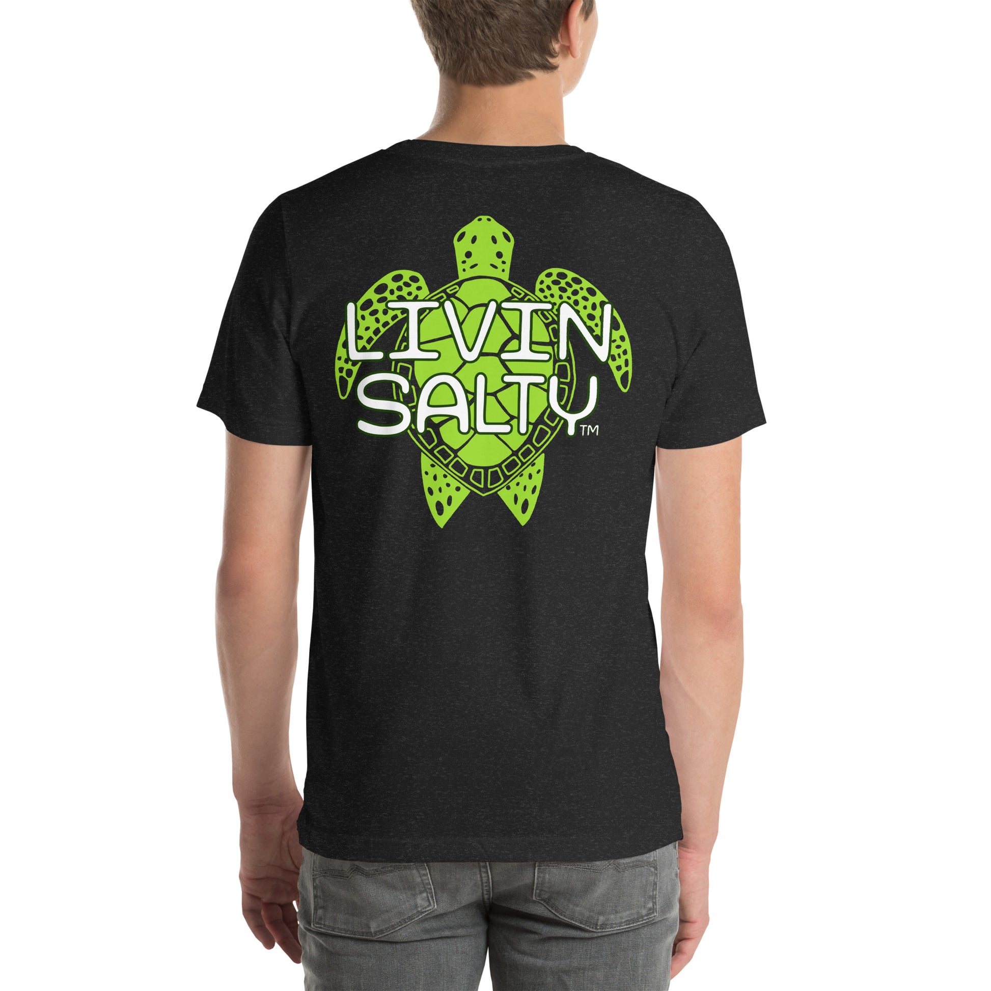 Featuring this simple bright green turtle design with LIVIN SALTY on the front and back.