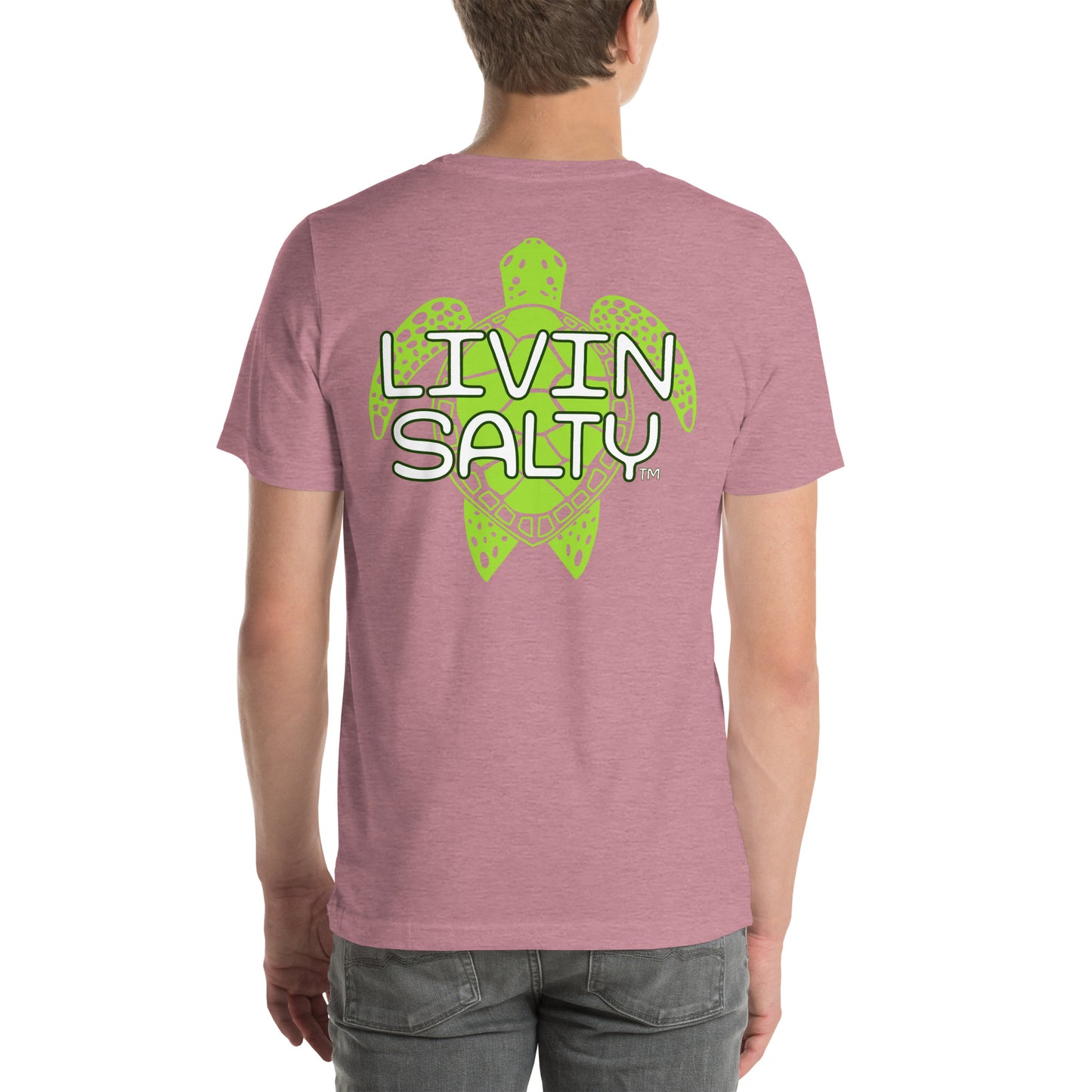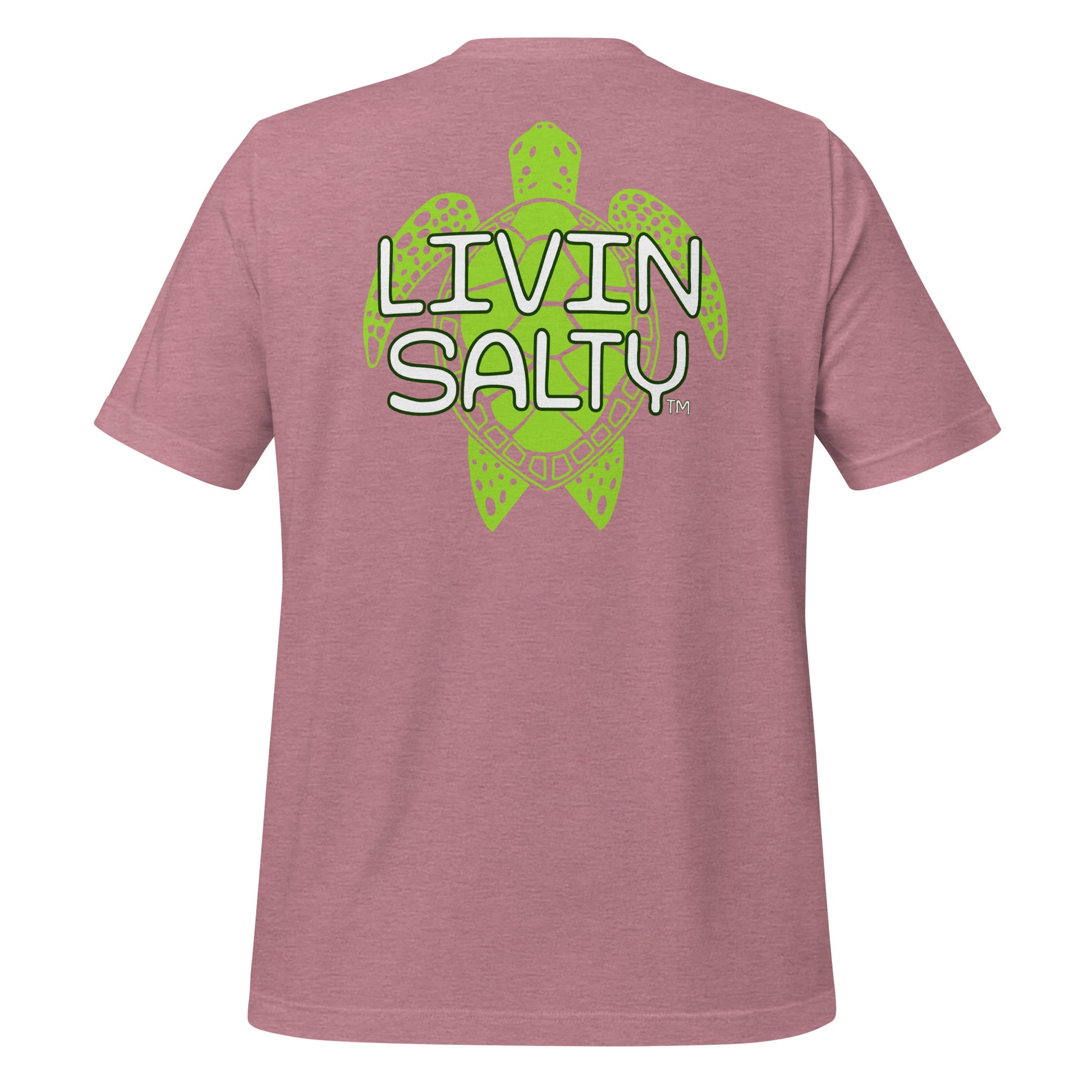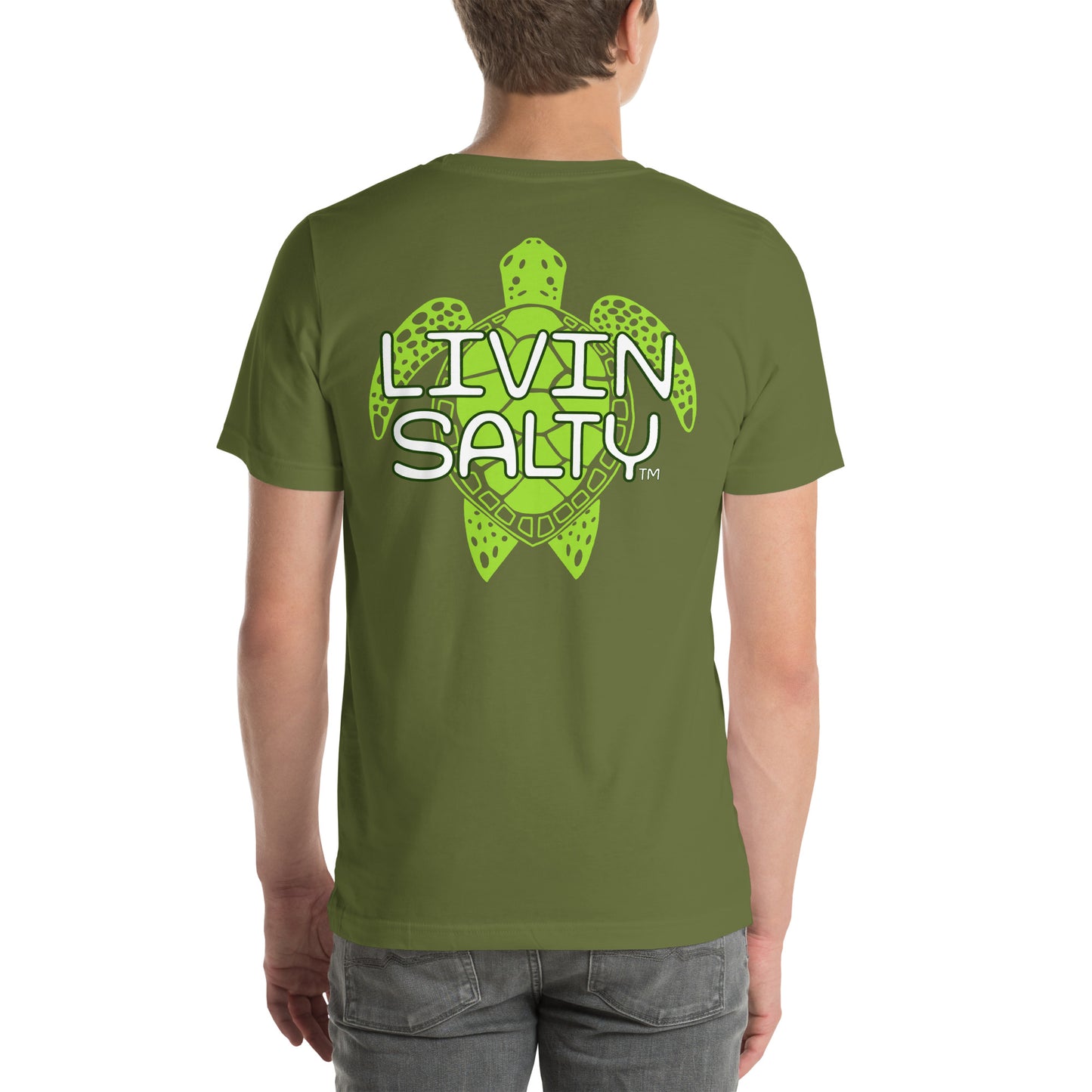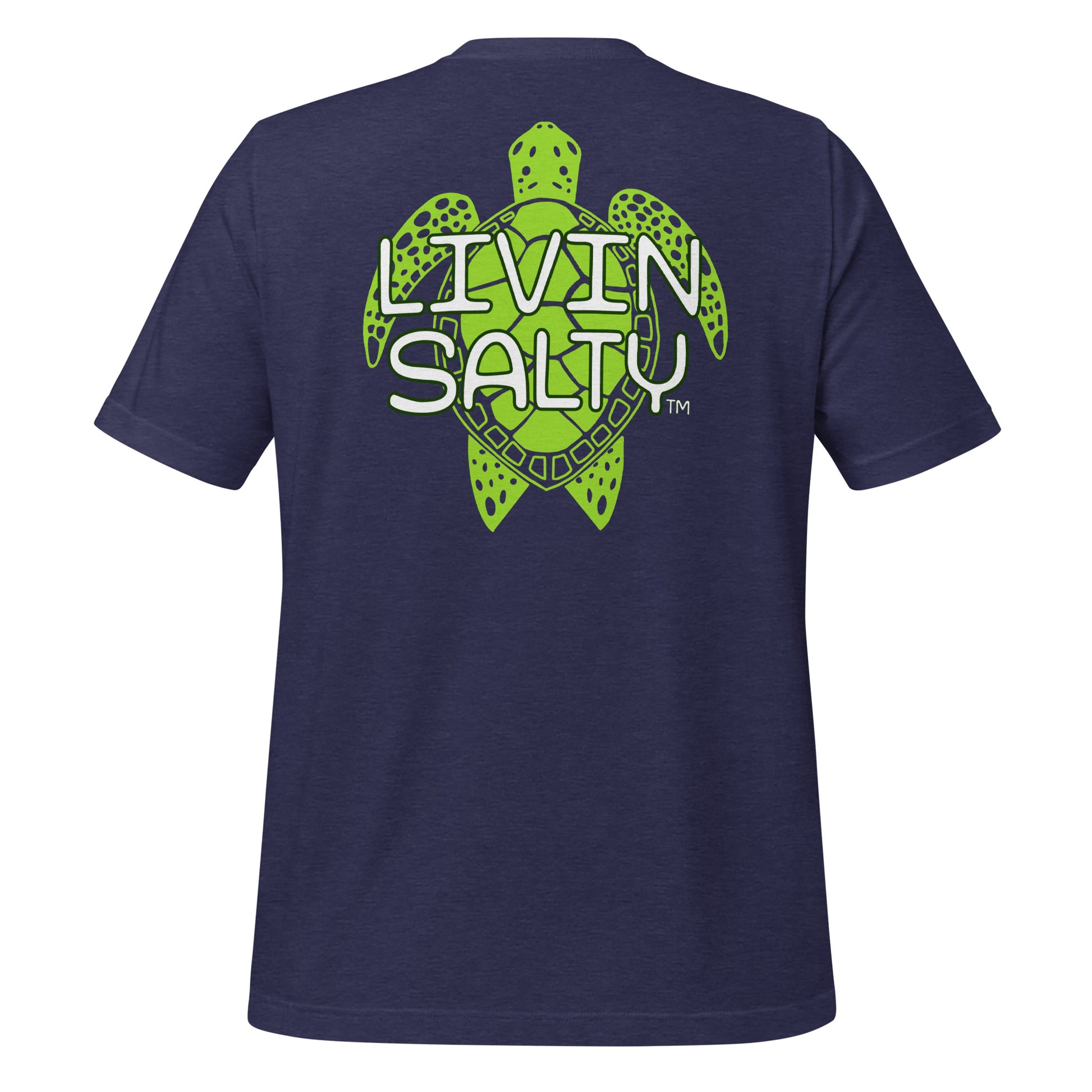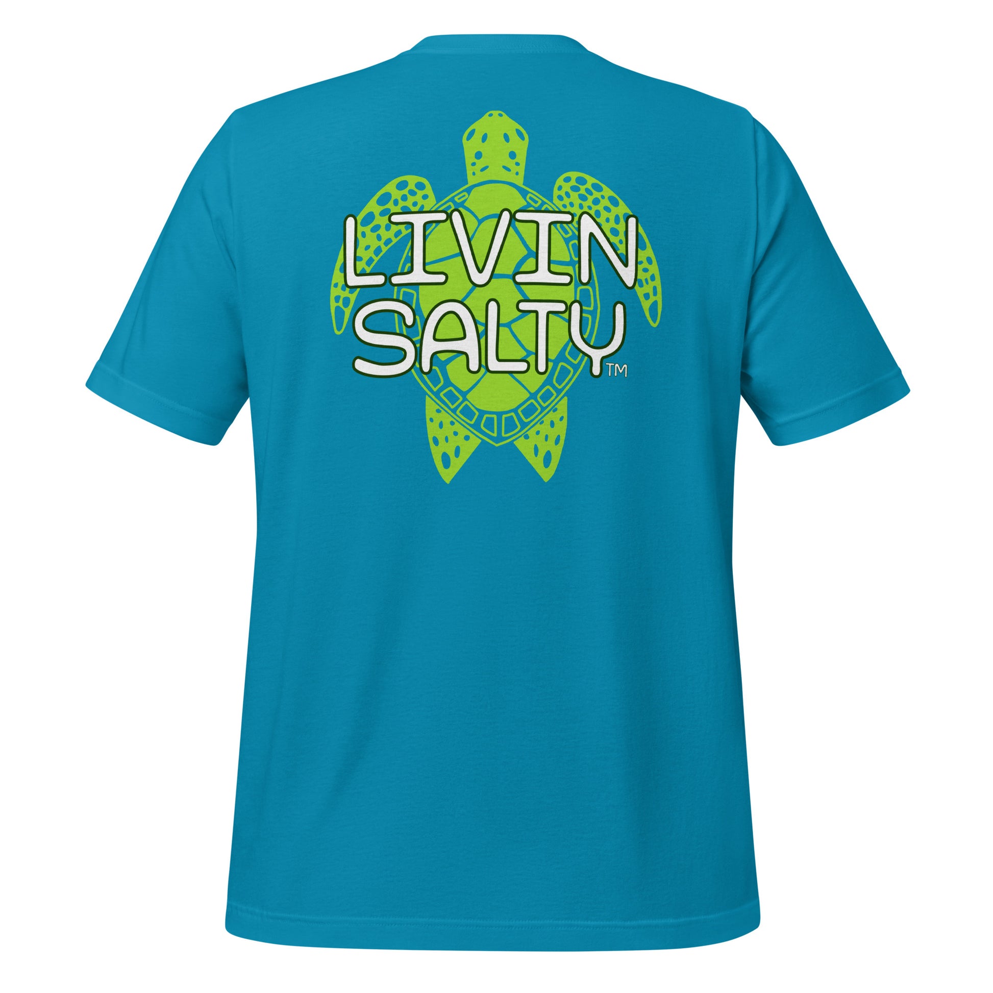 Featuring this simple bright green turtle design with LIVIN SALTY on the front and back.