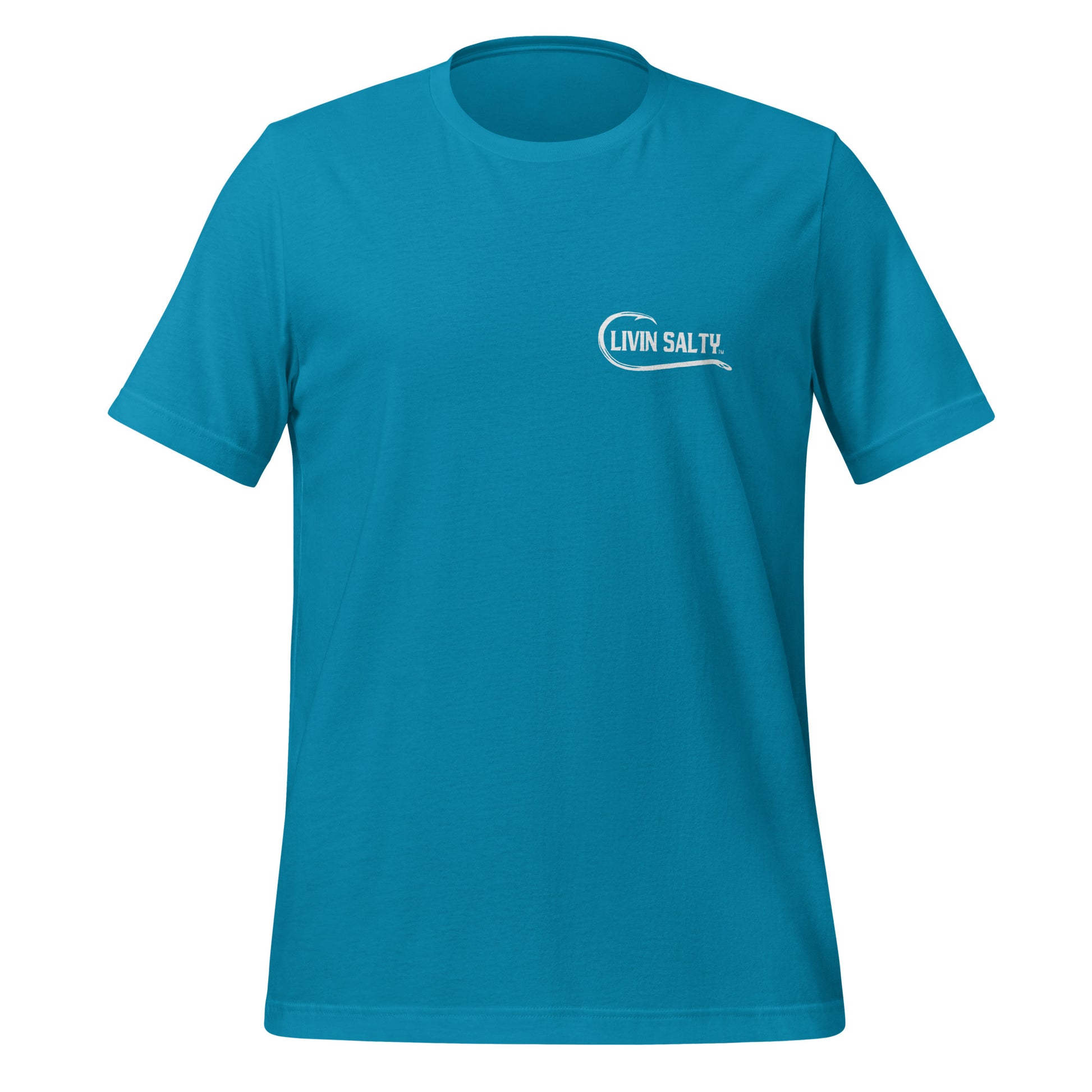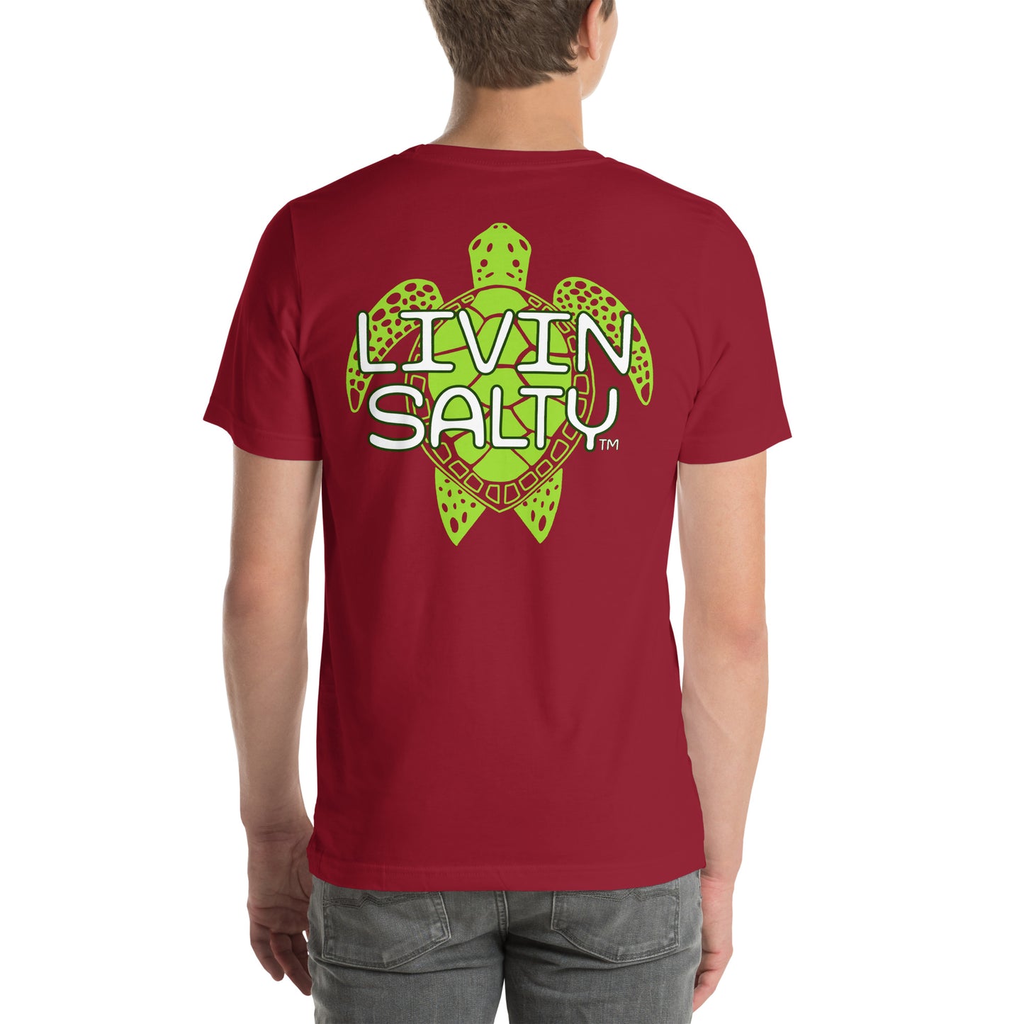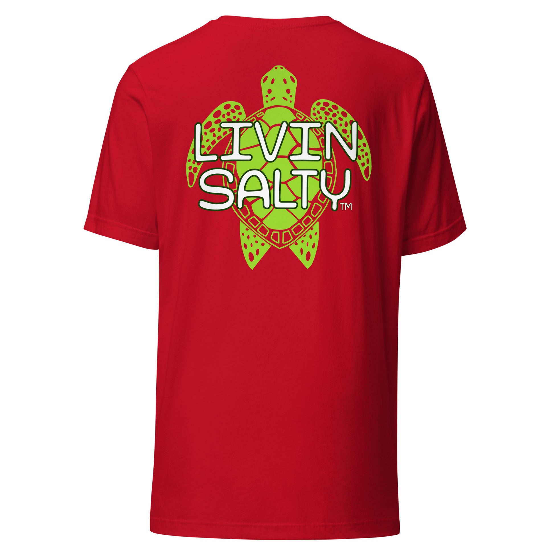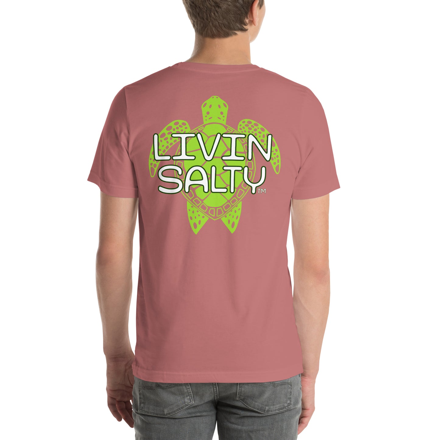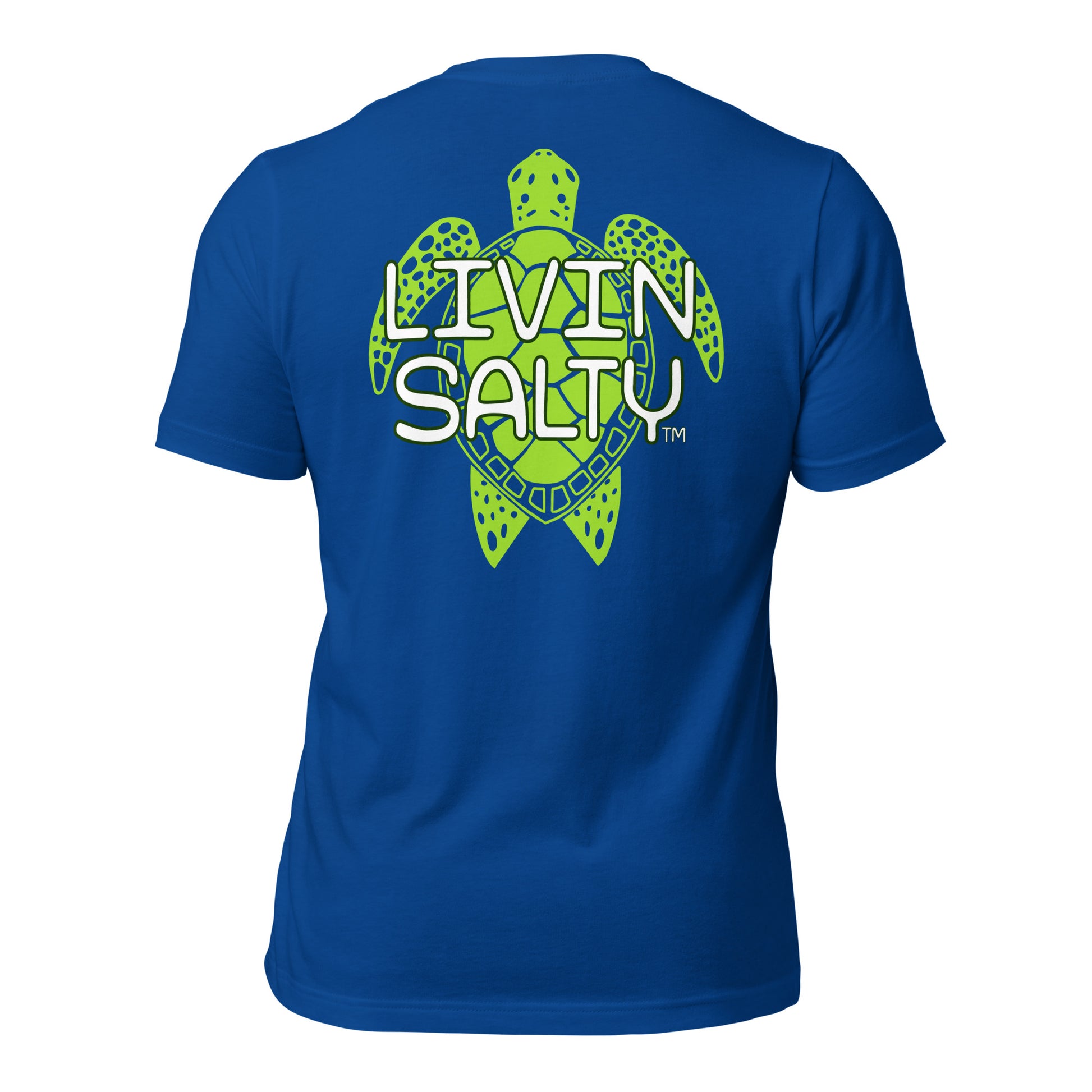 Featuring this simple bright green turtle design with LIVIN SALTY on the front and back.