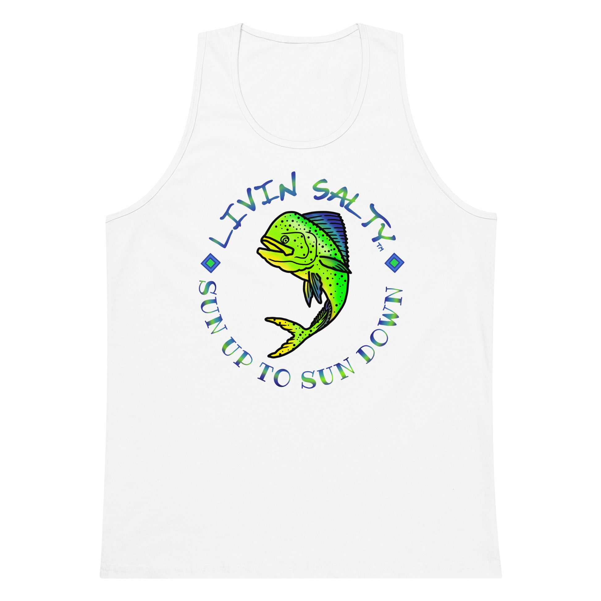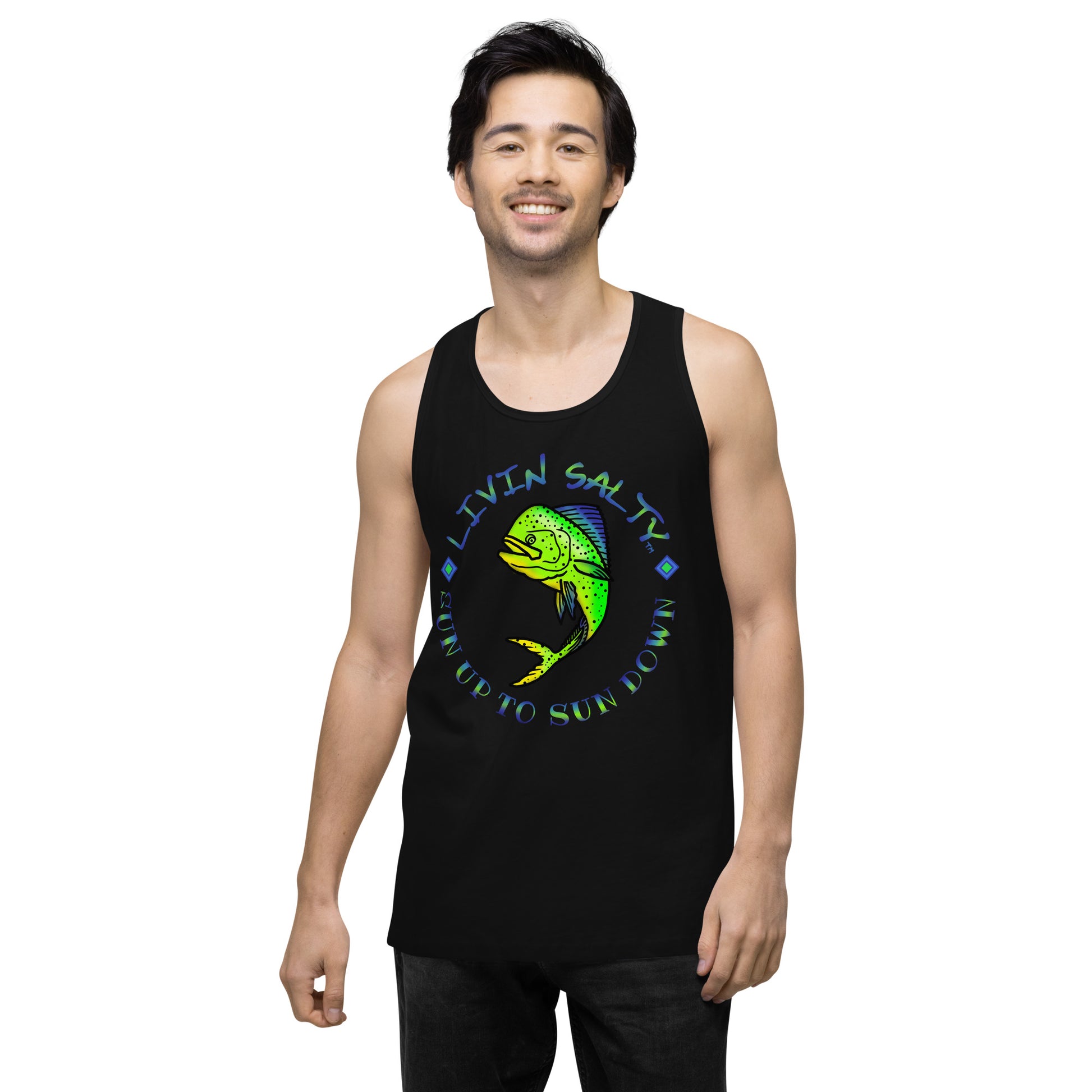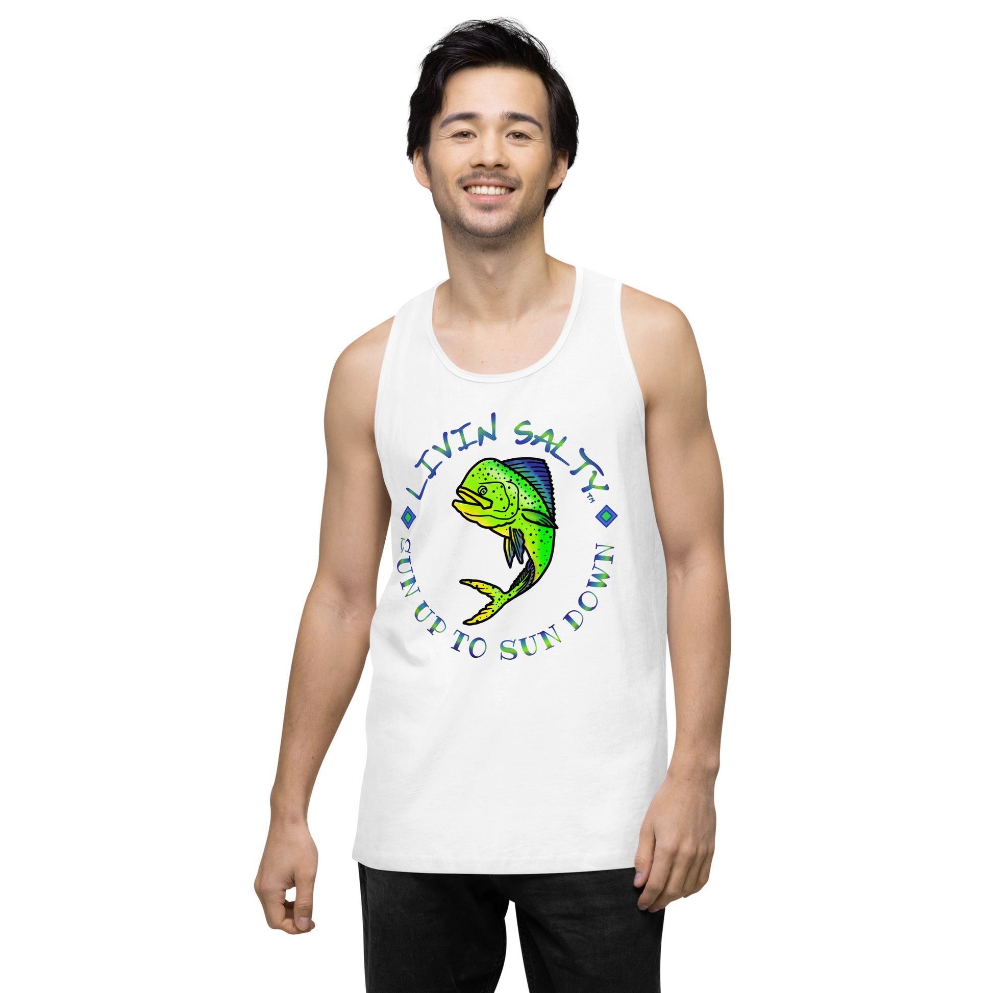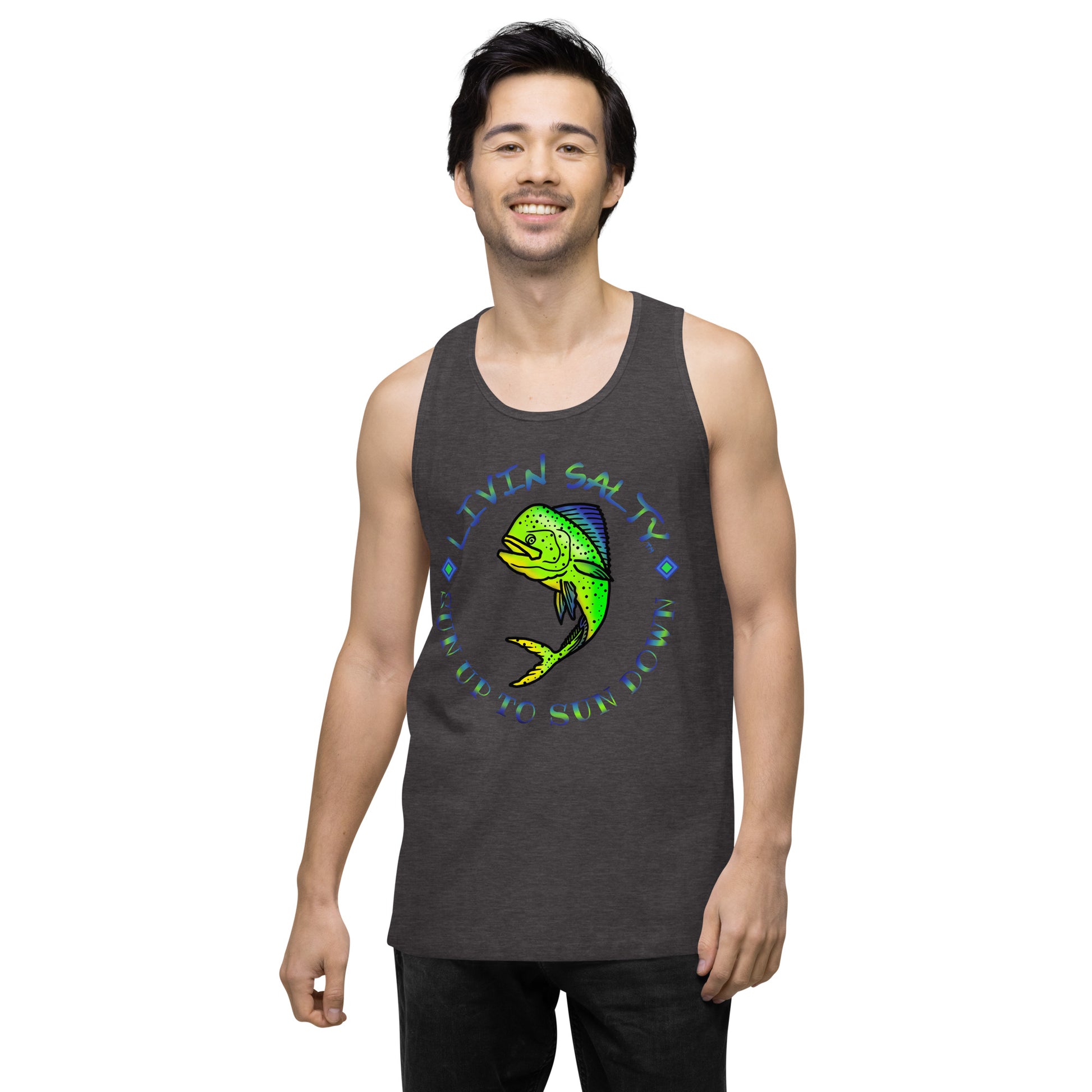 It’s always a good decision to invest in premium-quality basics that’ll look good and last long. The men’s premium tank top is exceptionally soft and smooth and made of durable materials. Featuring LIVIN SALTY sun up to sun down Mahi design front only.