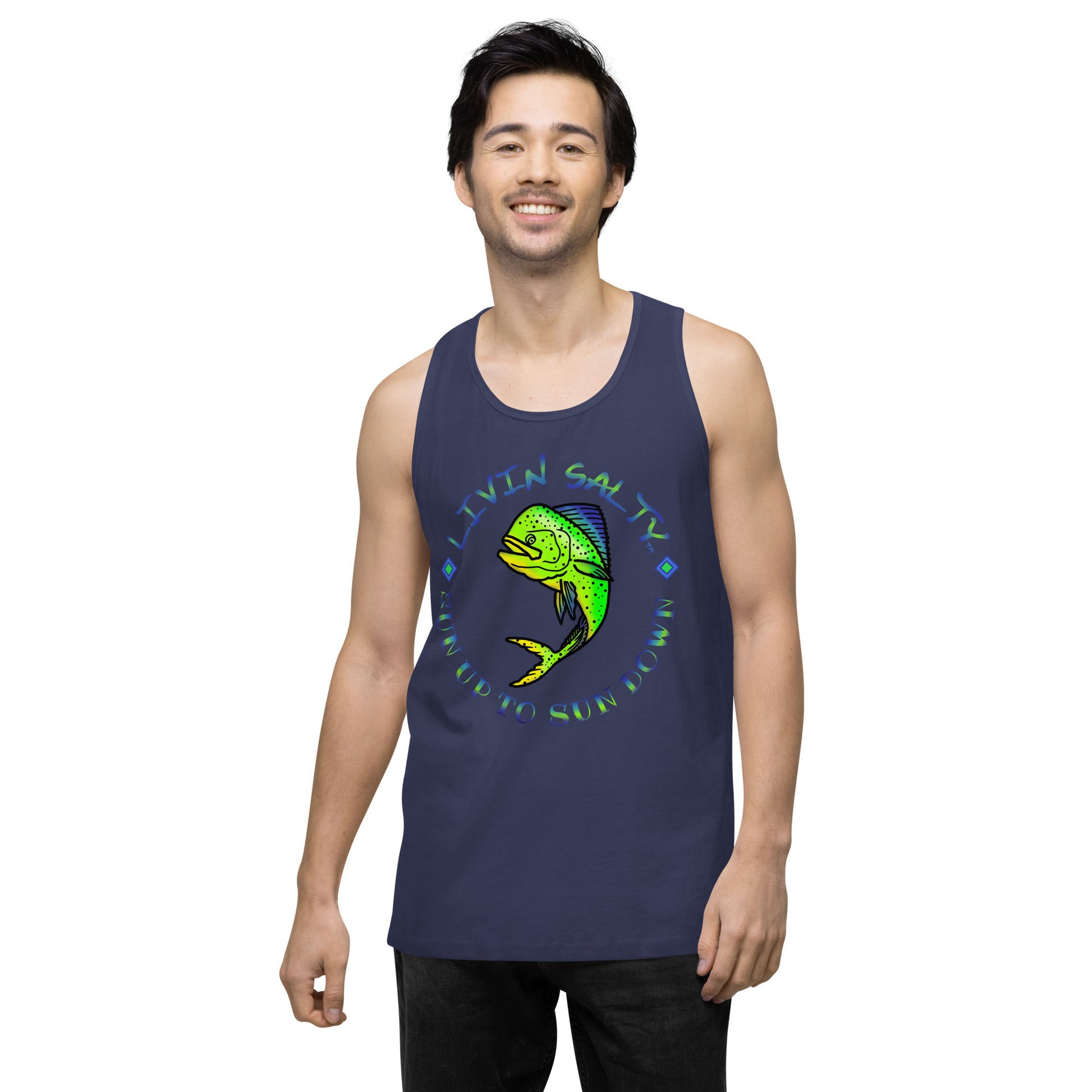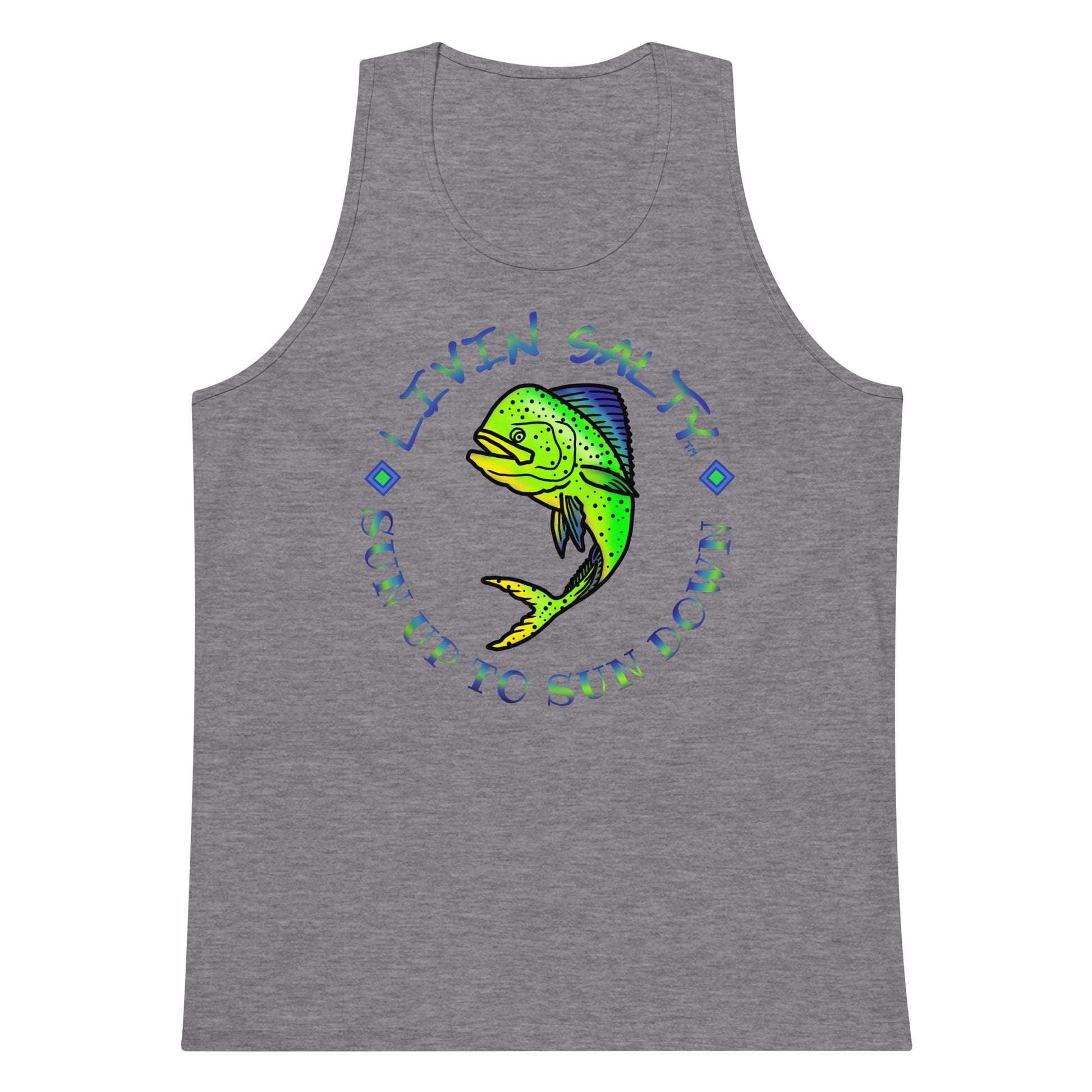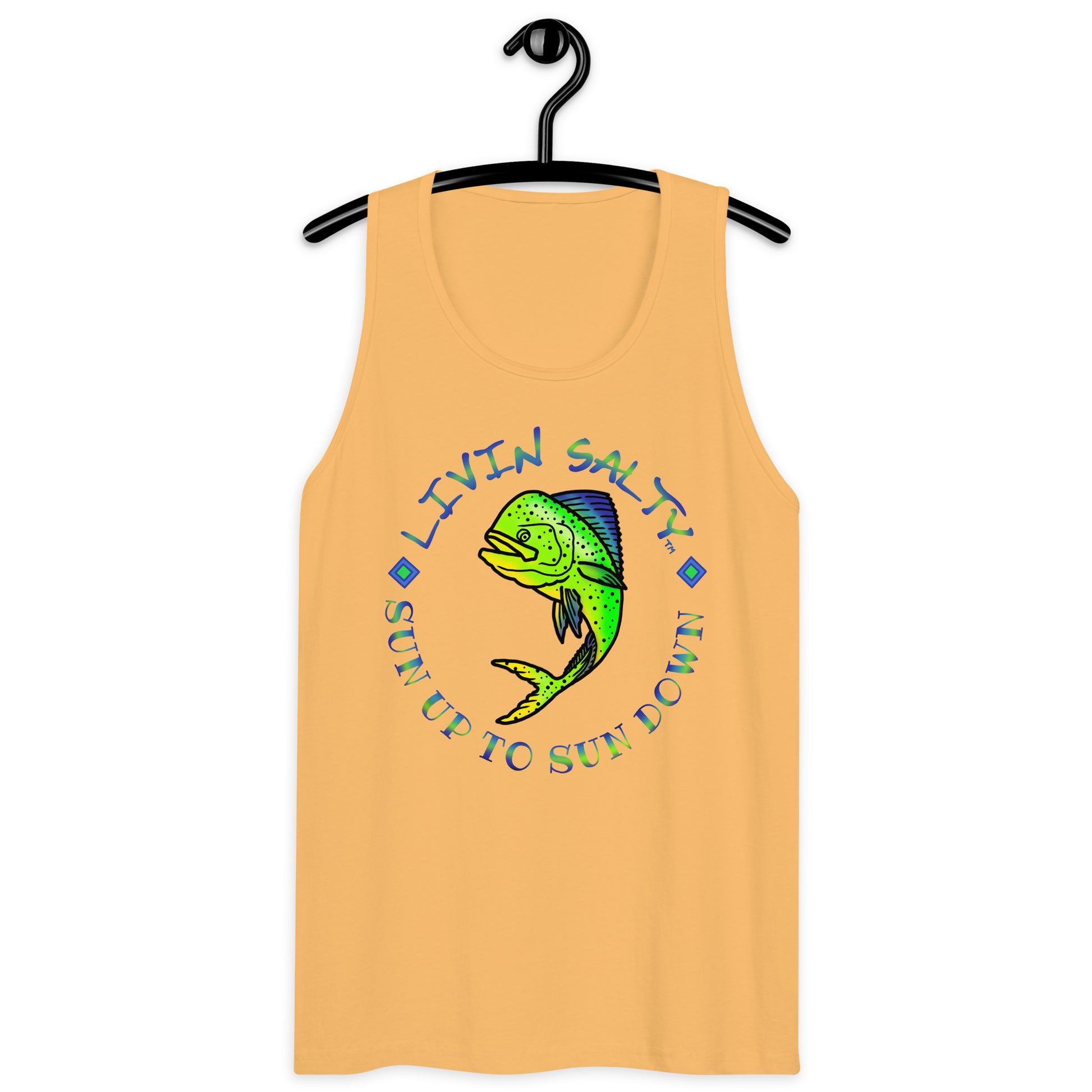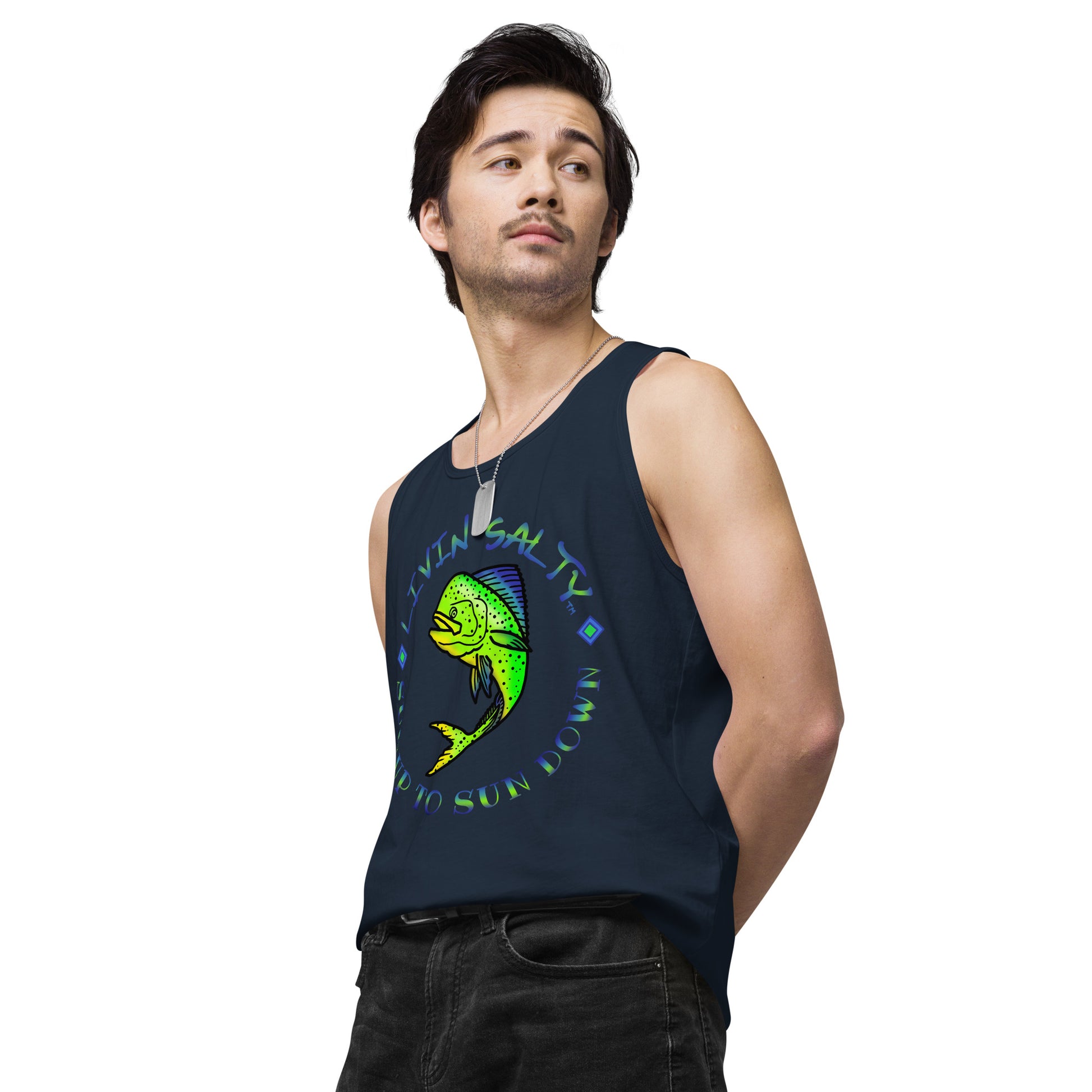 It’s always a good decision to invest in premium-quality basics that’ll look good and last long. The men’s premium tank top is exceptionally soft and smooth and made of durable materials. Featuring LIVIN SALTY sun up to sun down Mahi design front only.