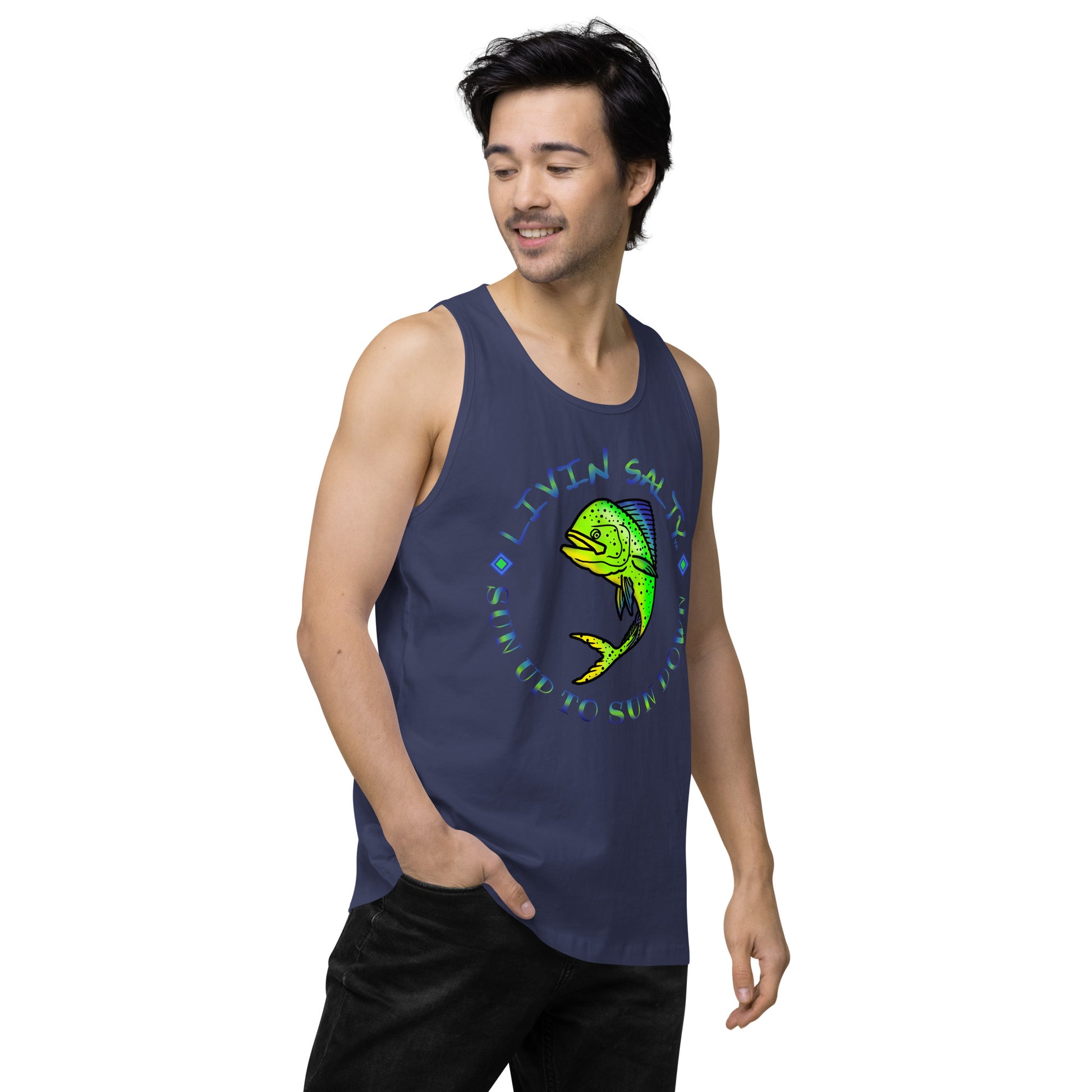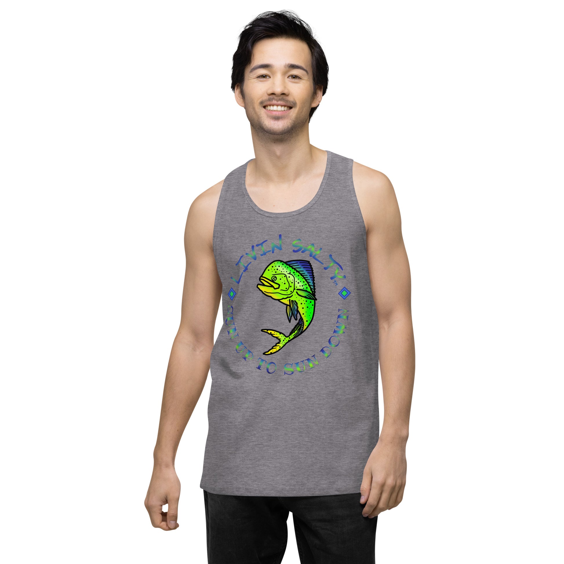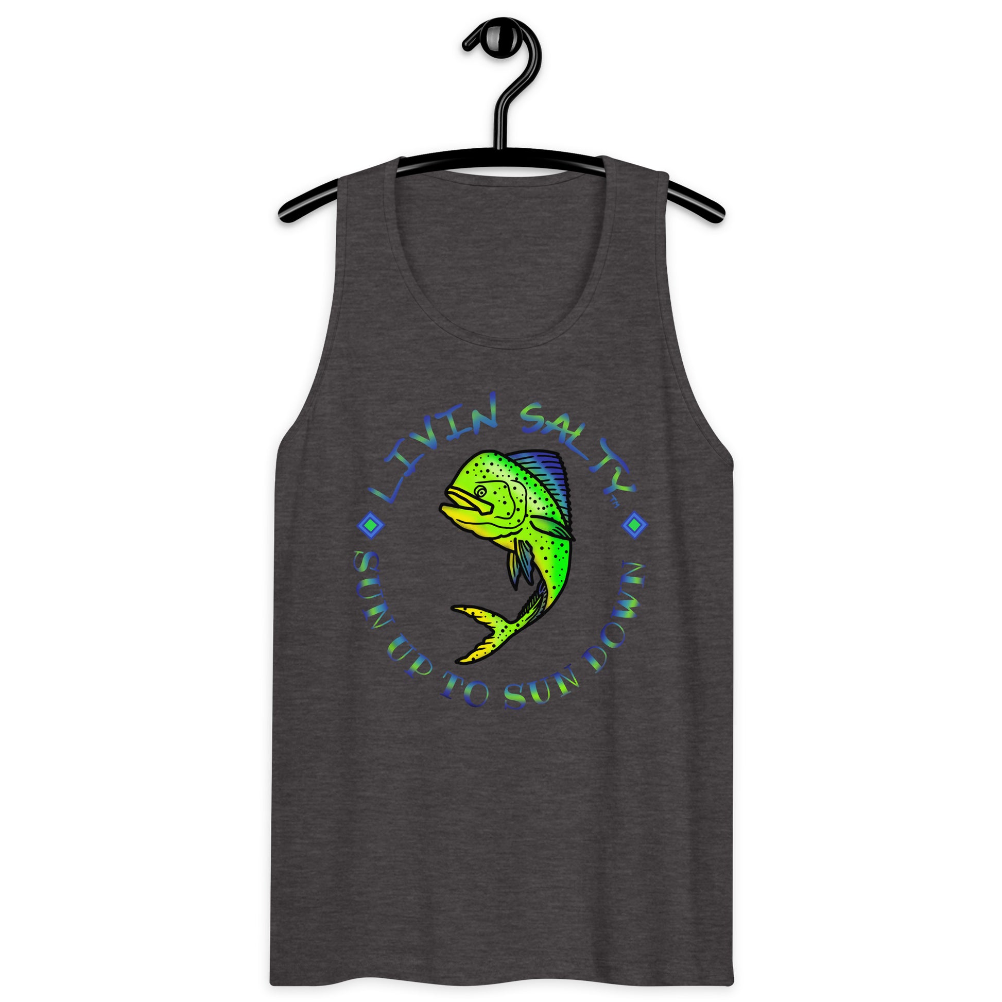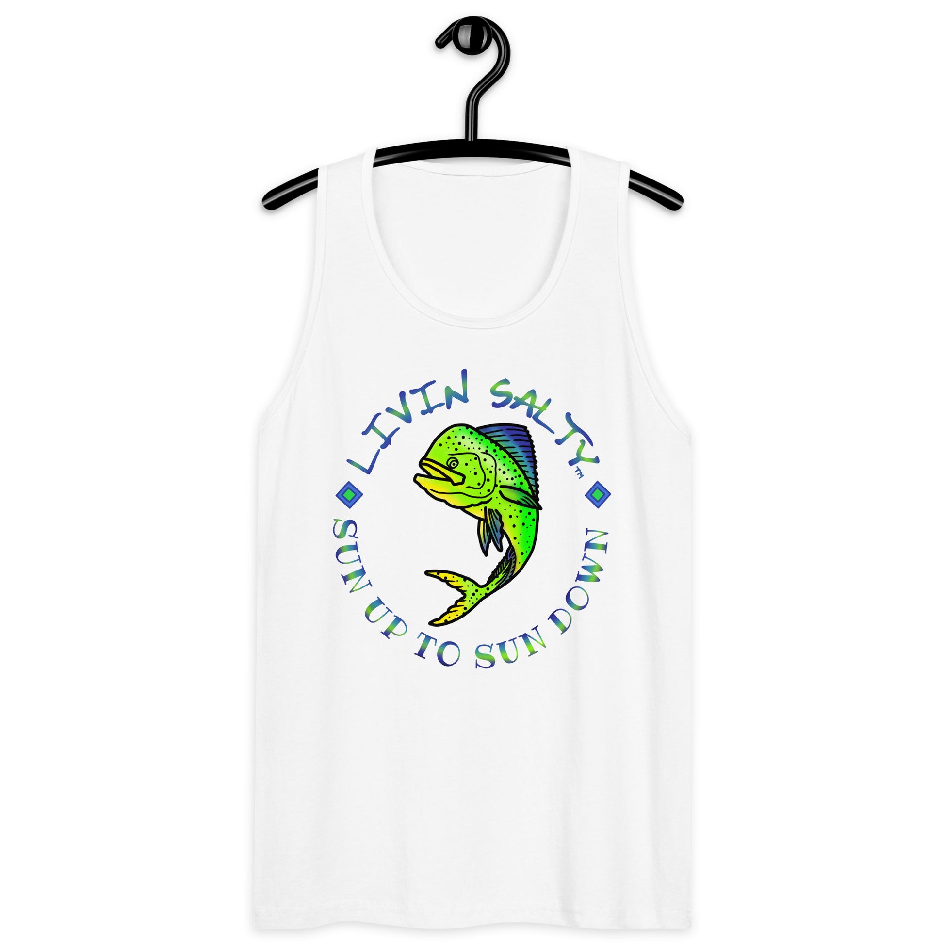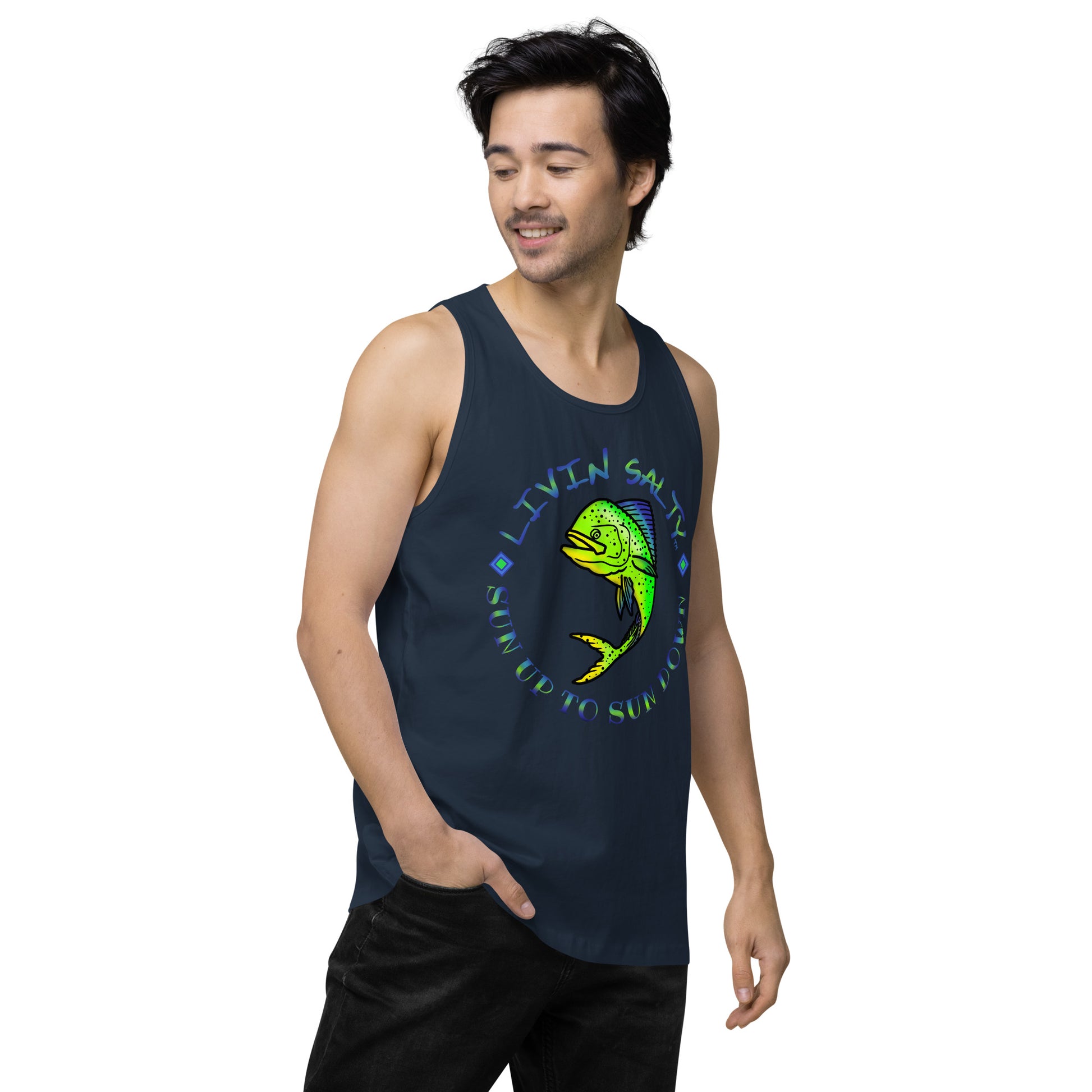 It’s always a good decision to invest in premium-quality basics that’ll look good and last long. The men’s premium tank top is exceptionally soft and smooth and made of durable materials. Featuring LIVIN SALTY sun up to sun down Mahi design front only.