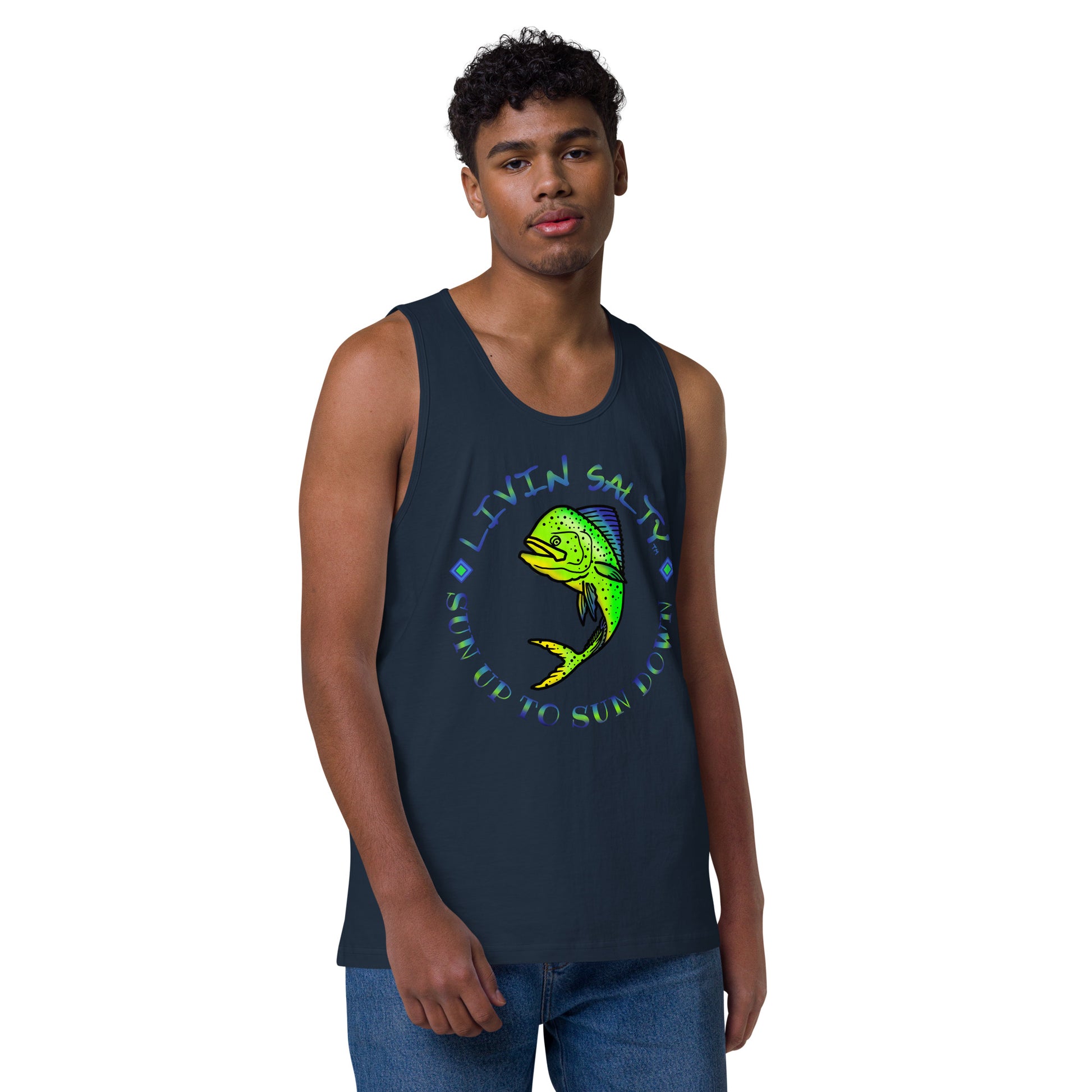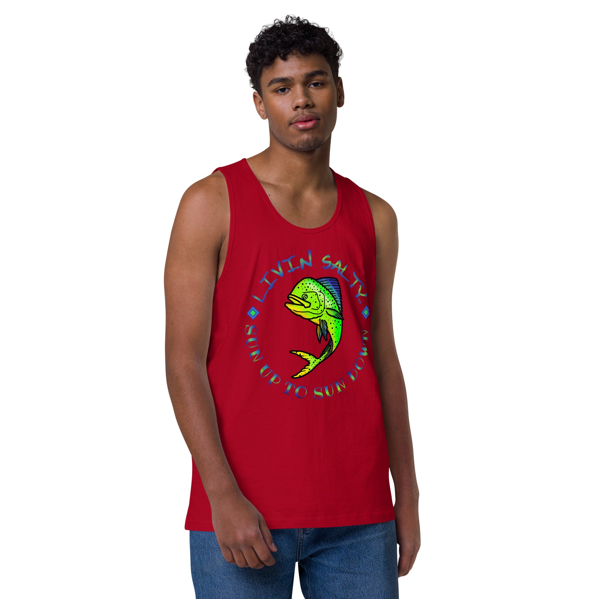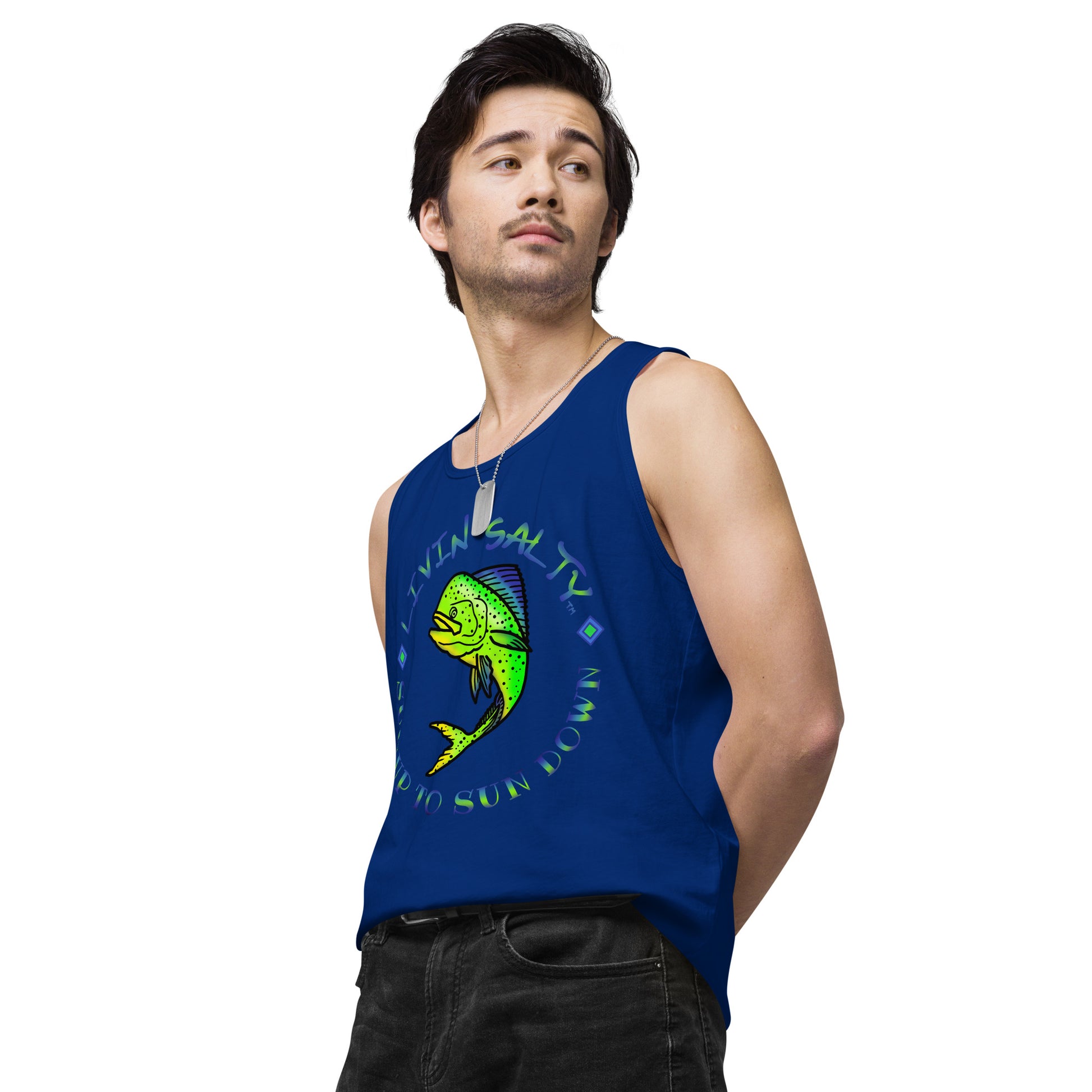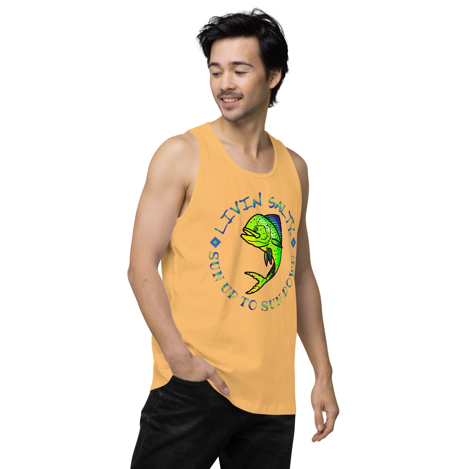 It’s always a good decision to invest in premium-quality basics that’ll look good and last long. The men’s premium tank top is exceptionally soft and smooth and made of durable materials. Featuring LIVIN SALTY sun up to sun down Mahi design front only.