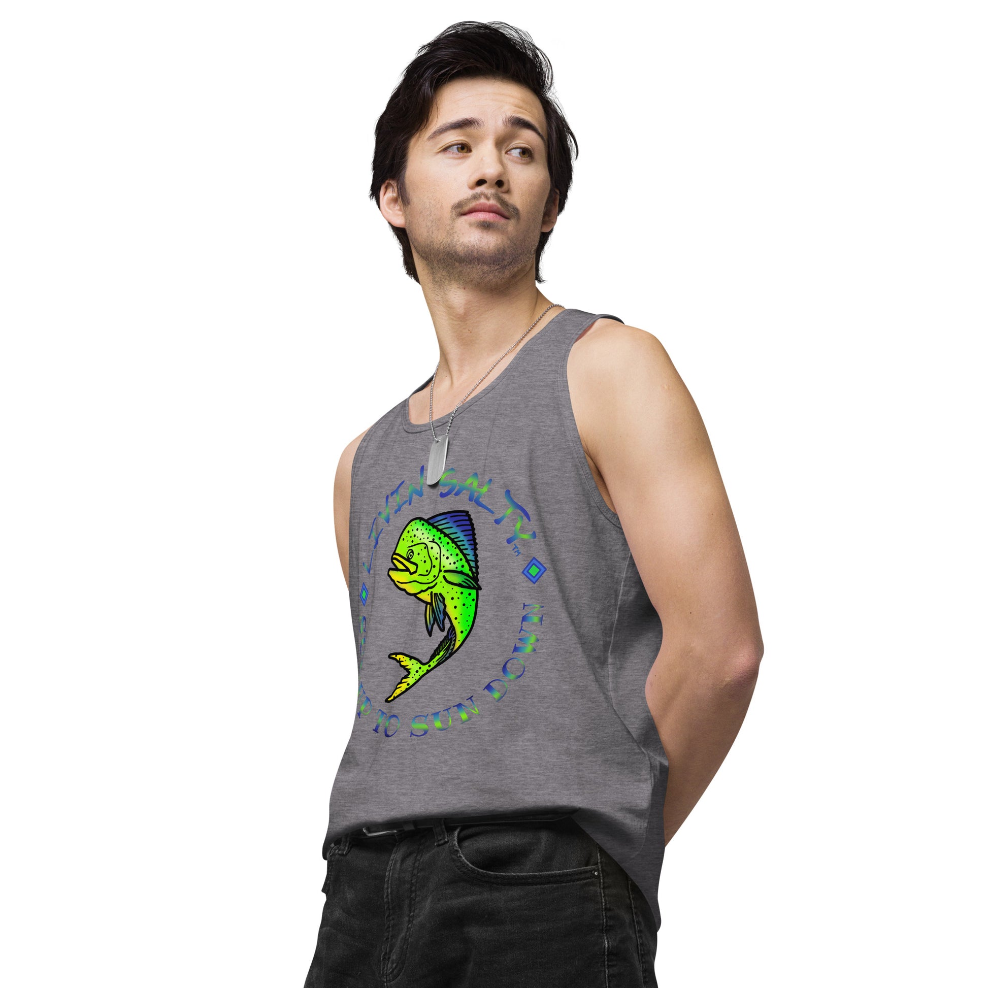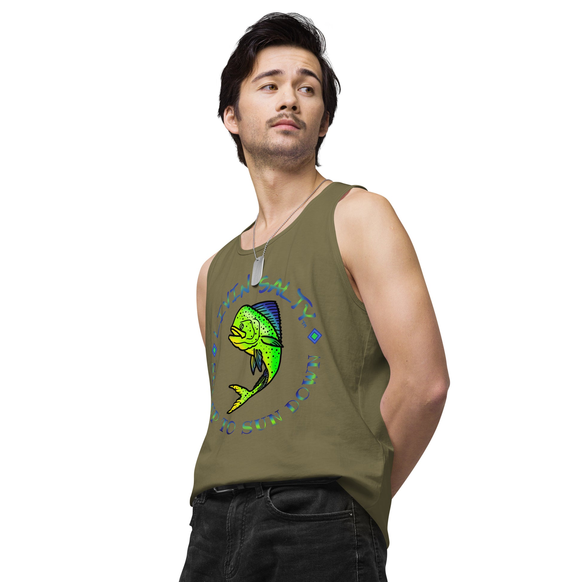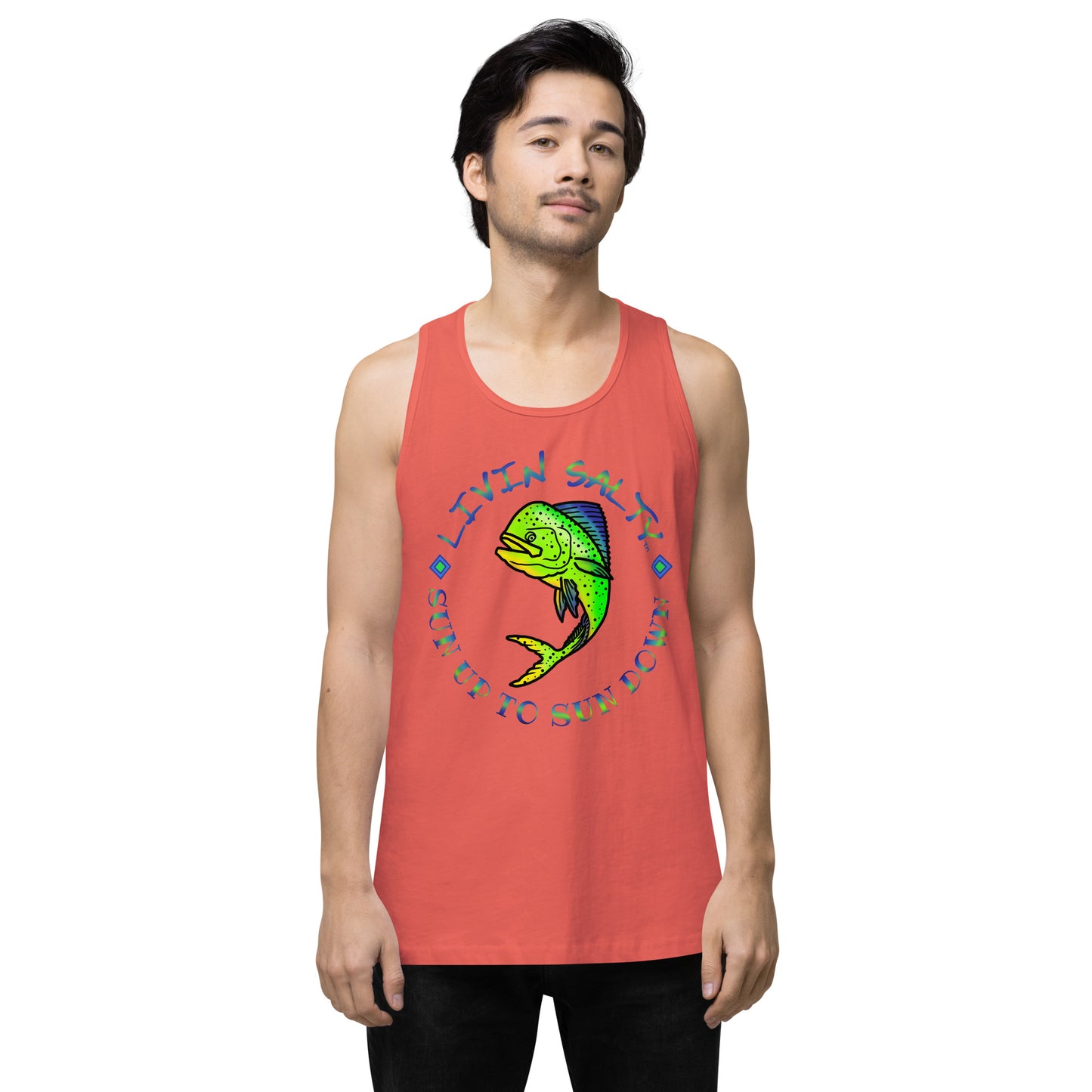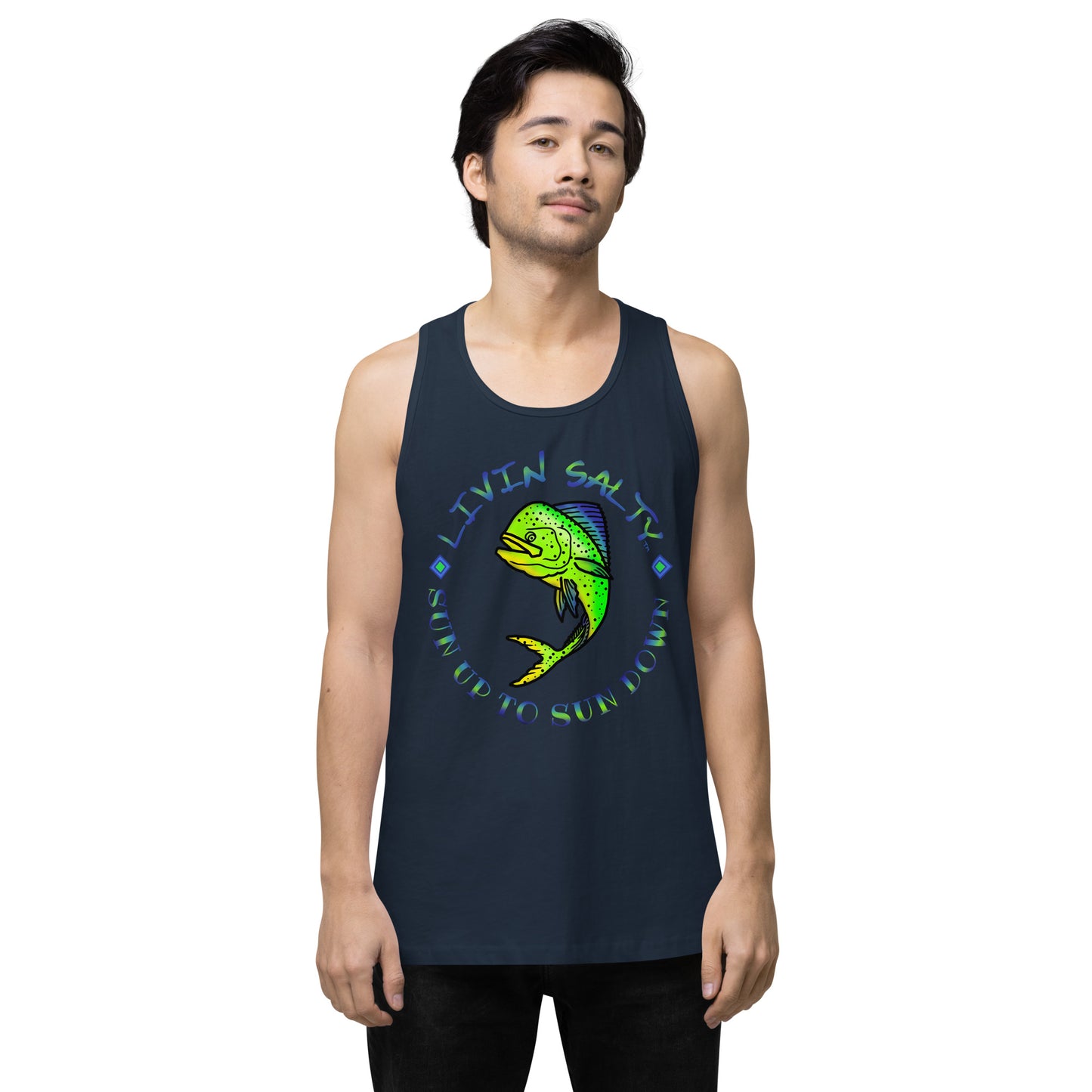 It’s always a good decision to invest in premium-quality basics that’ll look good and last long. The men’s premium tank top is exceptionally soft and smooth and made of durable materials. Featuring LIVIN SALTY sun up to sun down Mahi design front only.