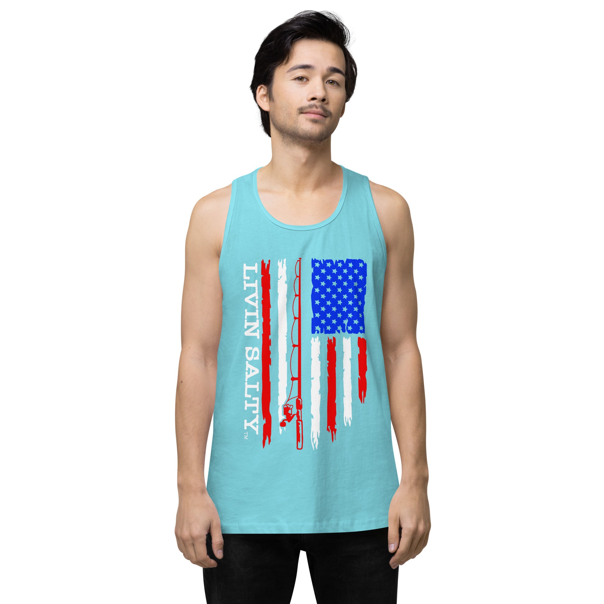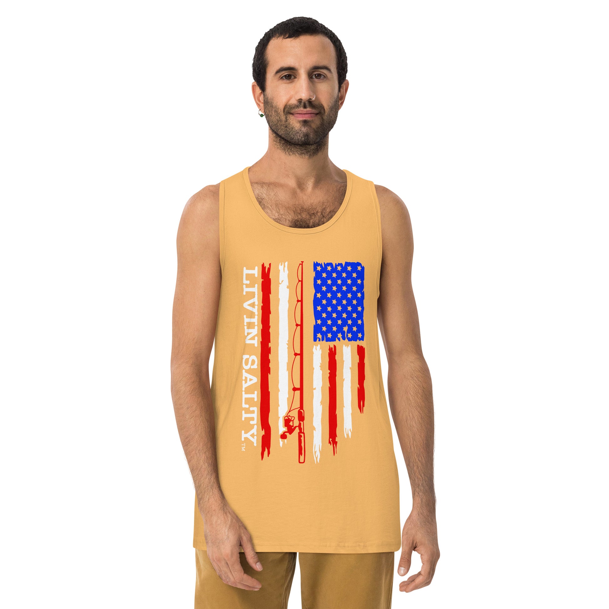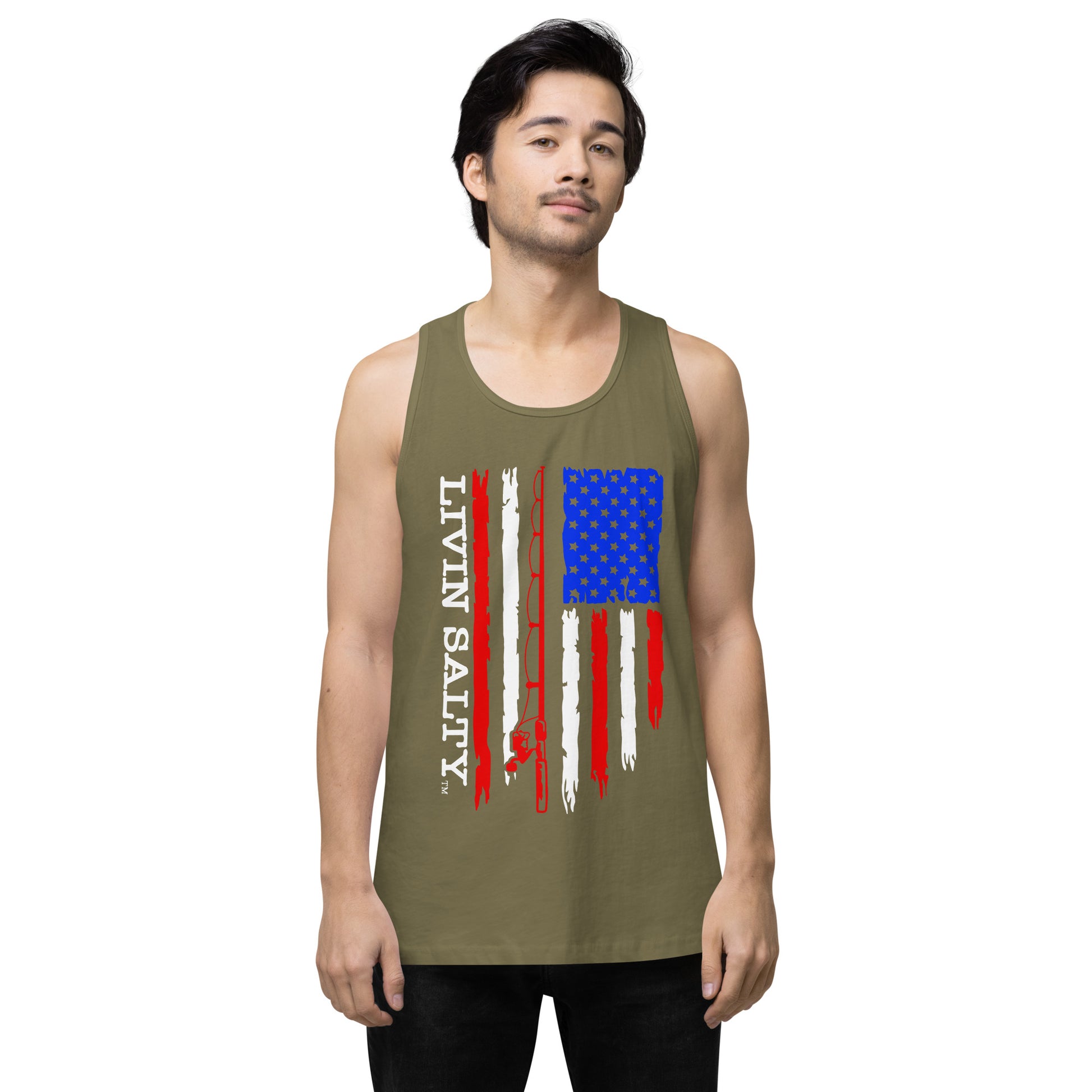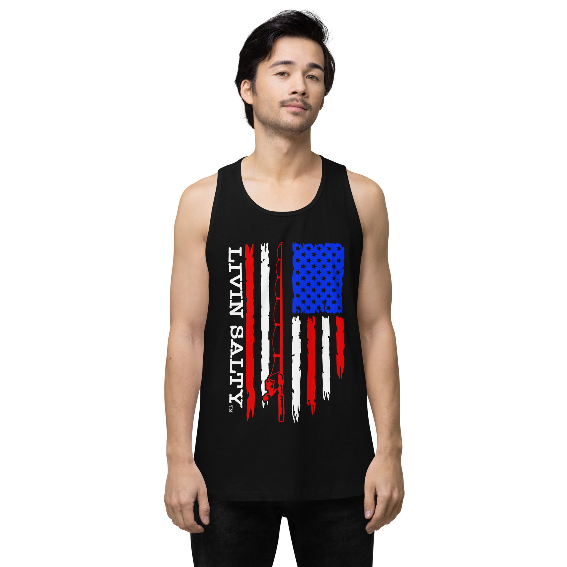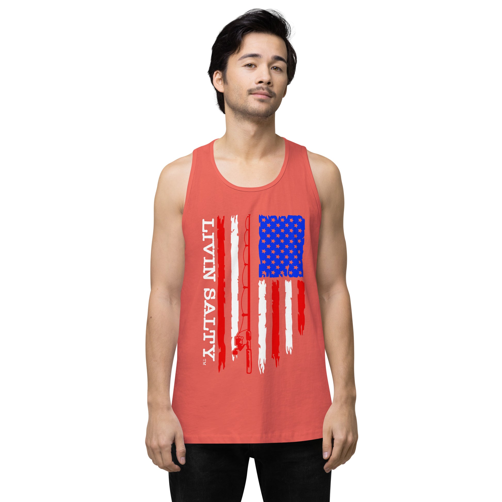 It’s always a good decision to invest in premium-quality basics that’ll look good and last long. The men’s premium tank top is exceptionally soft and smooth and made of durable materials. Featuring front long print LIVIN SALTY red, white, blue flag design.