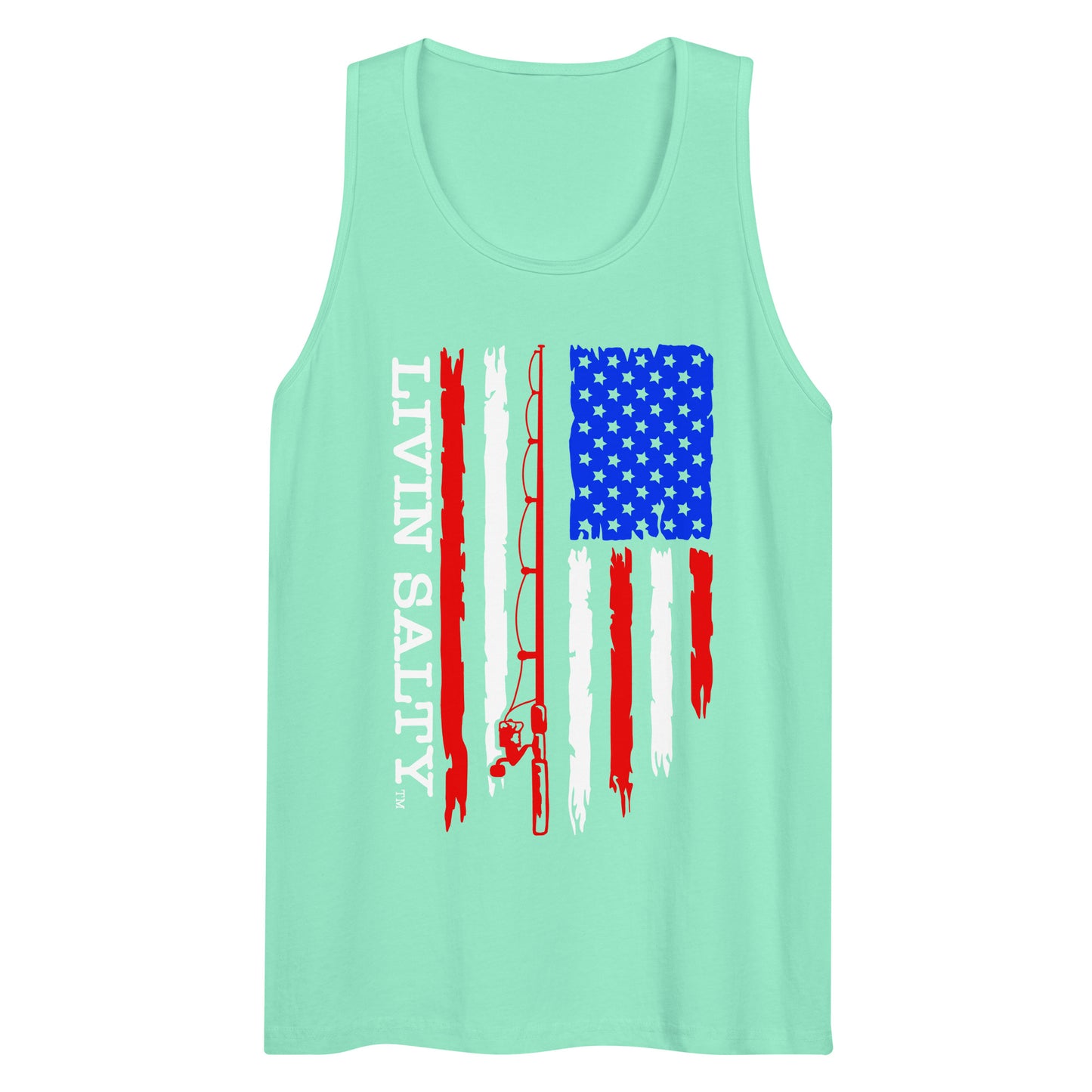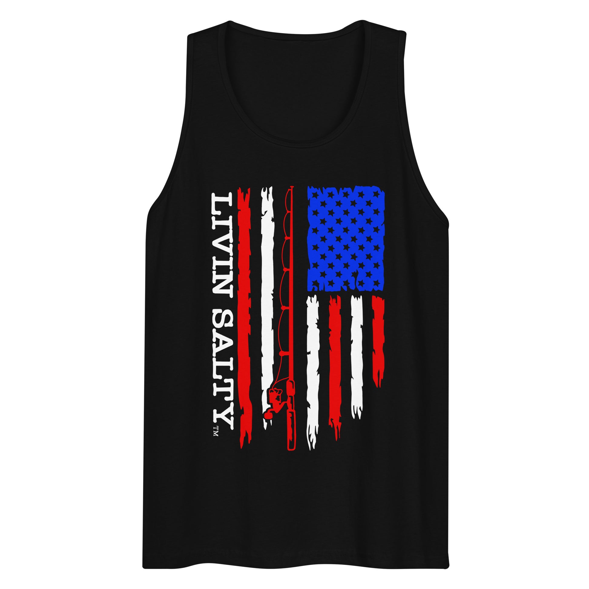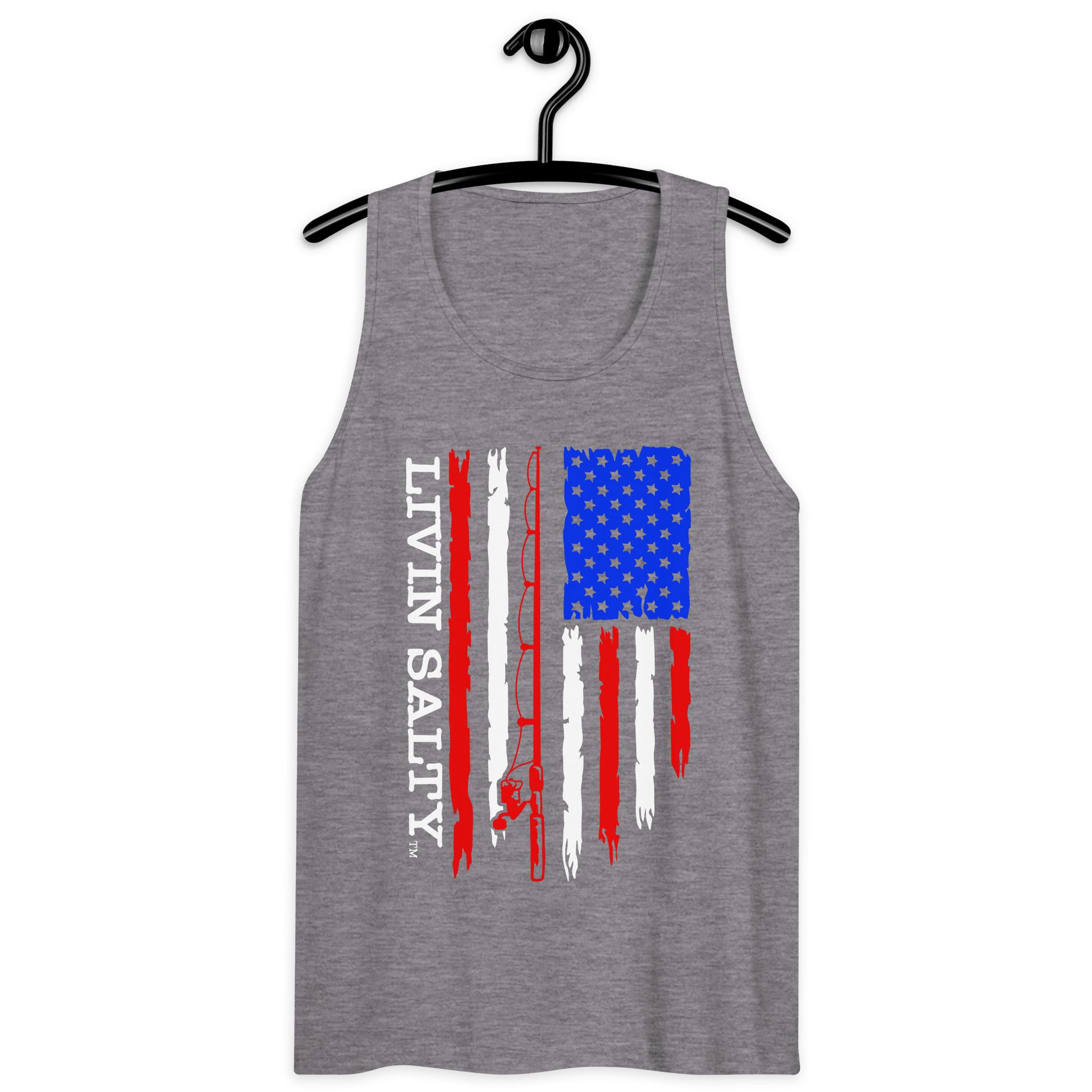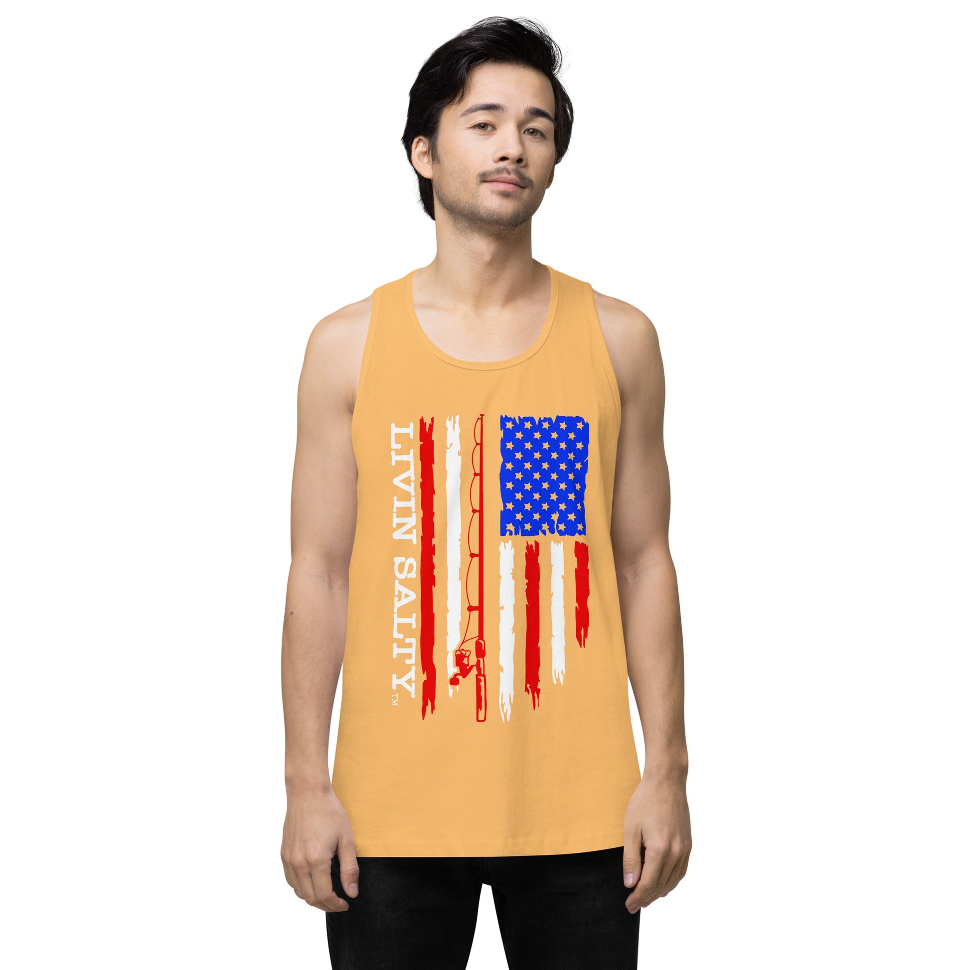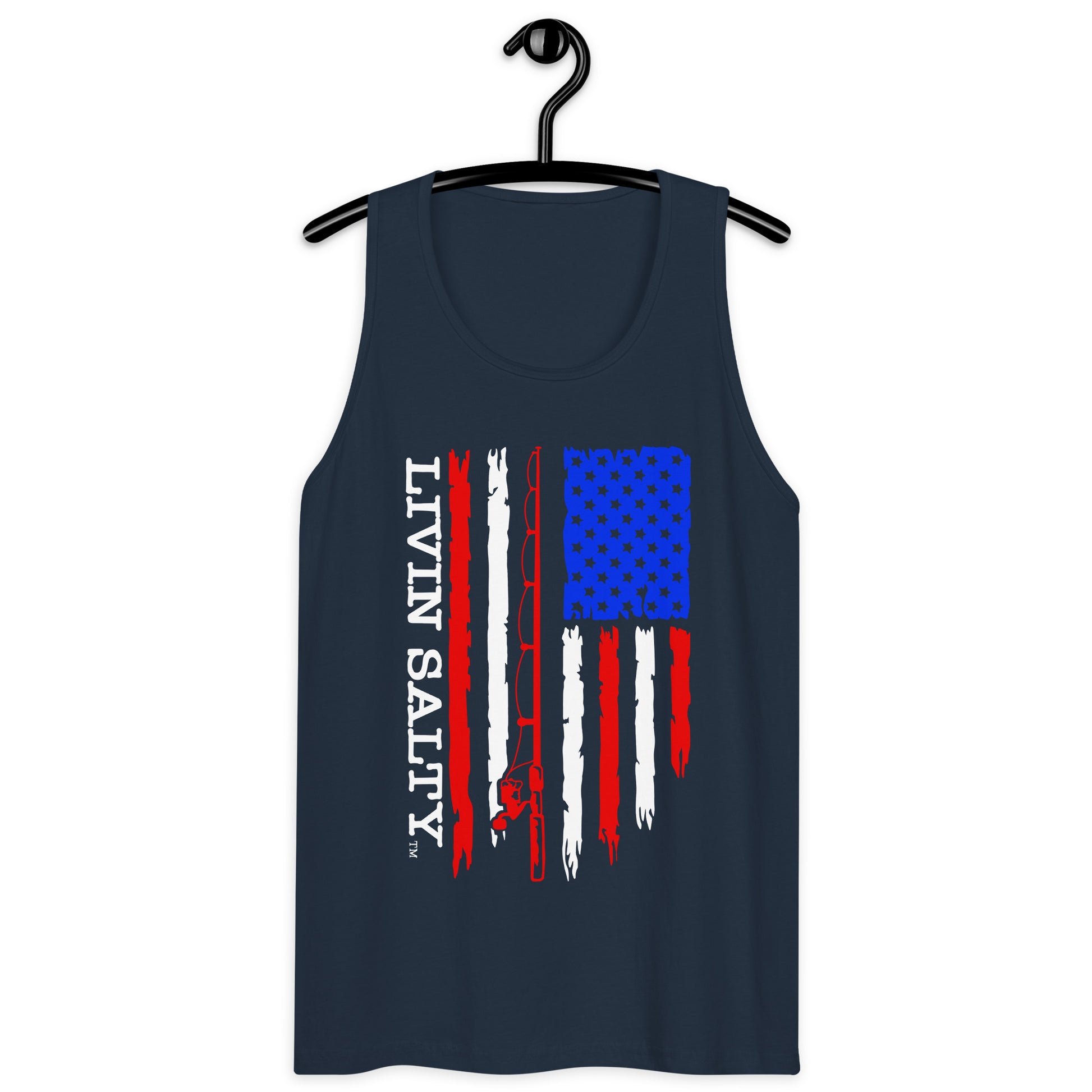 It’s always a good decision to invest in premium-quality basics that’ll look good and last long. The men’s premium tank top is exceptionally soft and smooth and made of durable materials. Featuring front long print LIVIN SALTY red, white, blue flag design.
