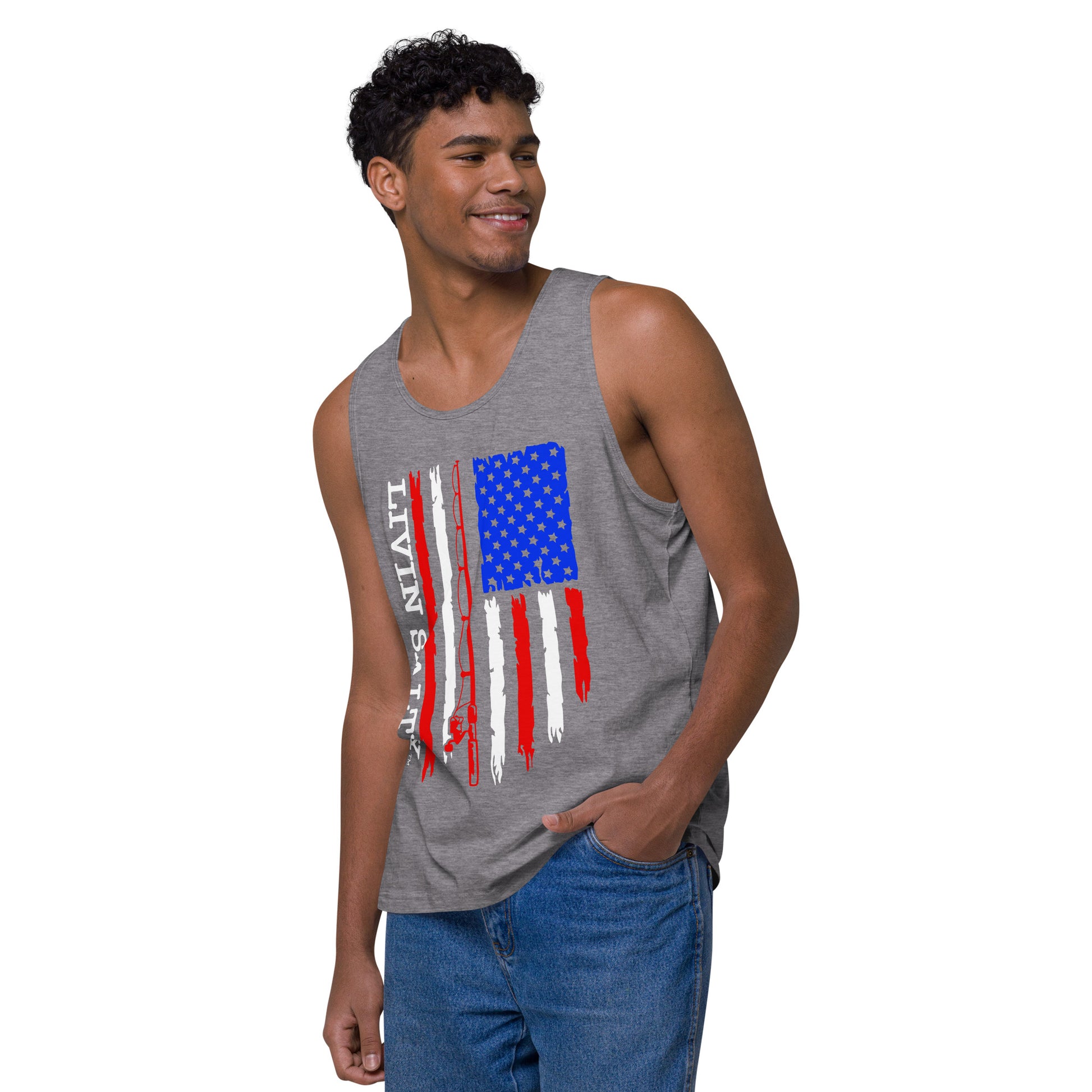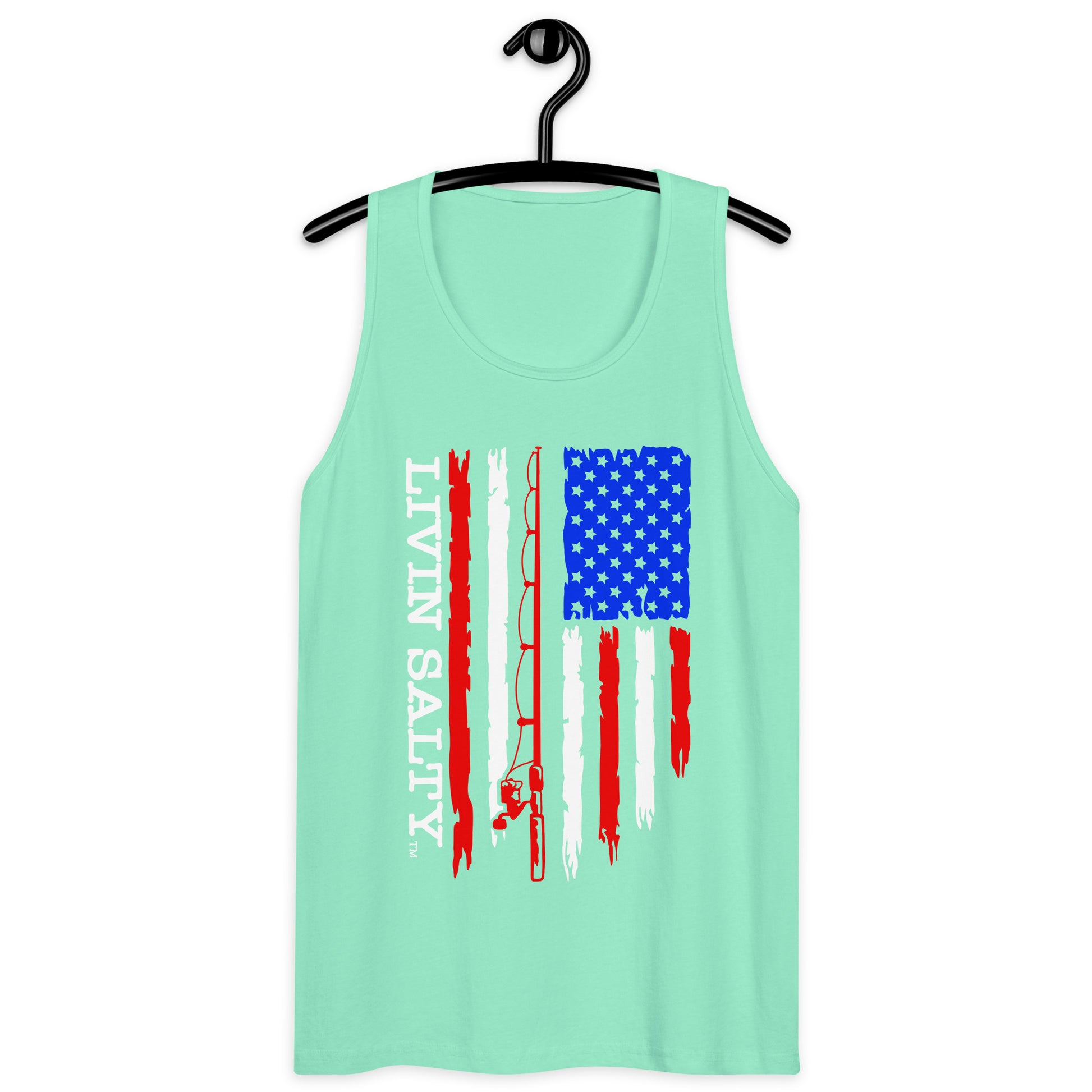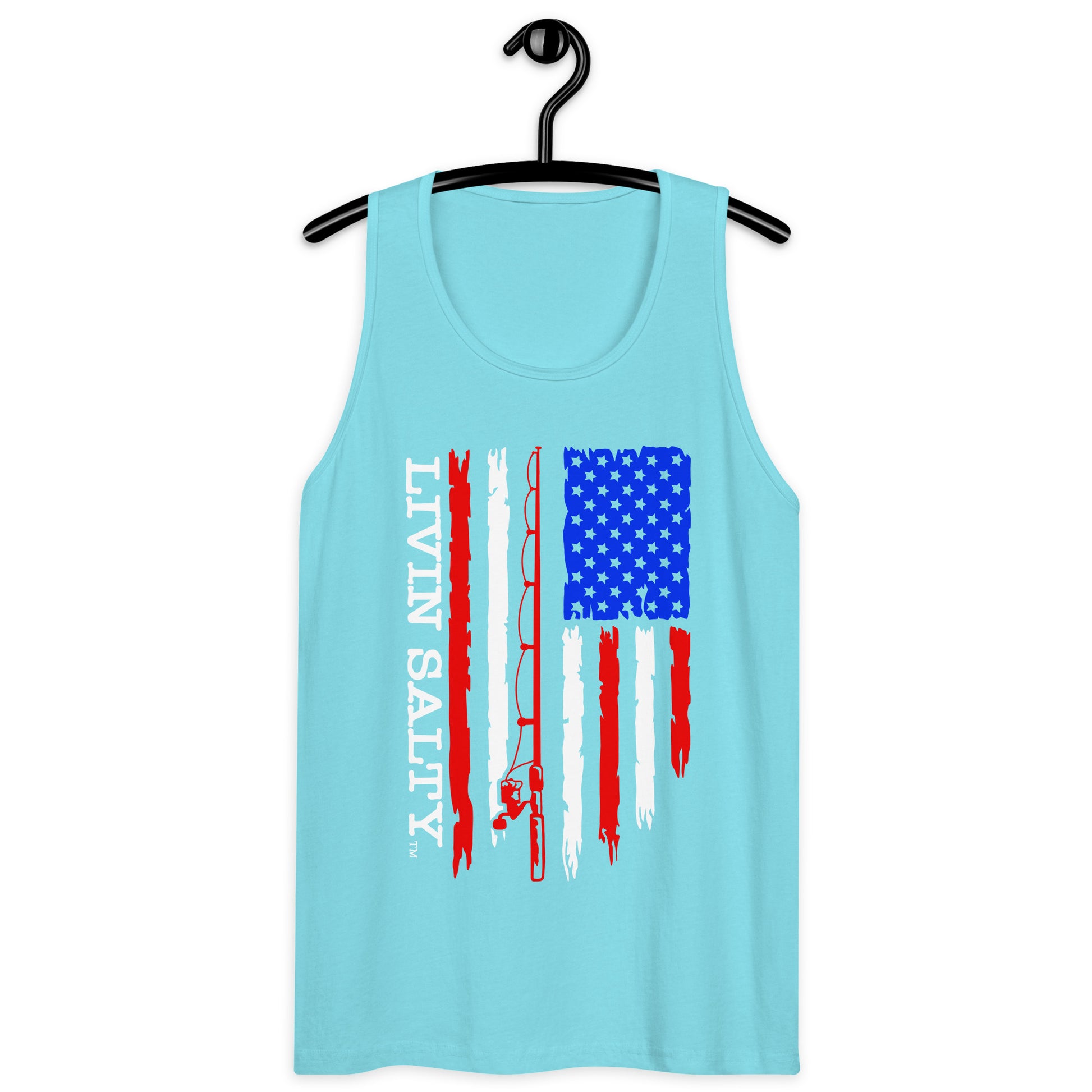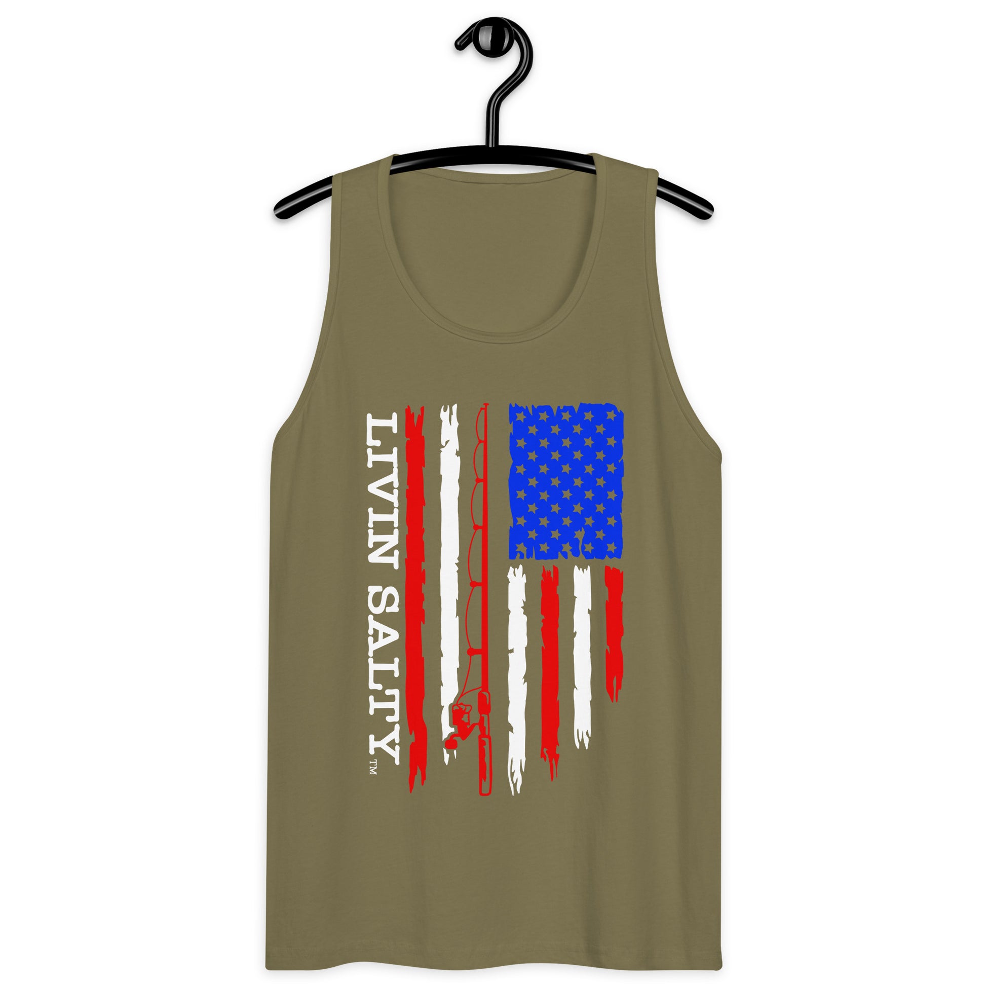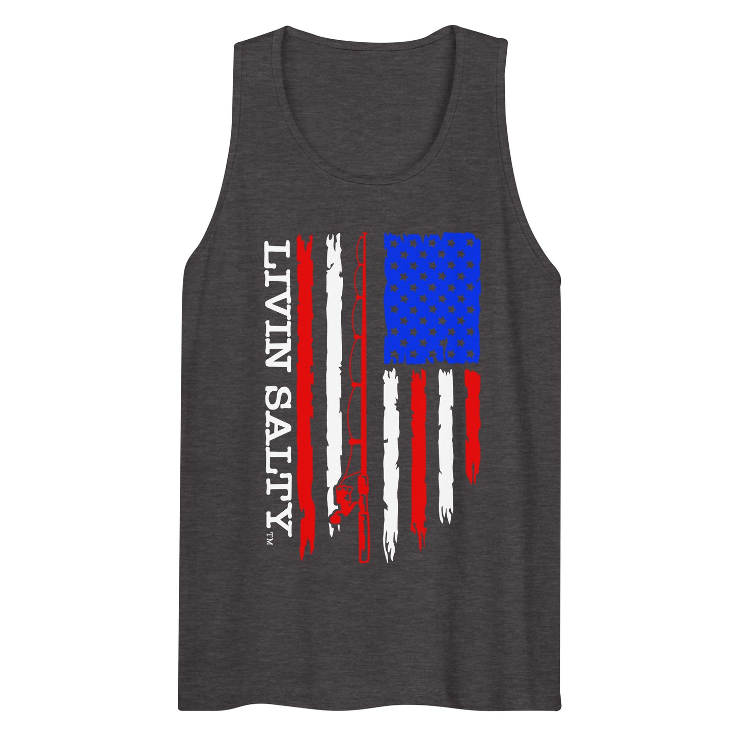 It’s always a good decision to invest in premium-quality basics that’ll look good and last long. The men’s premium tank top is exceptionally soft and smooth and made of durable materials. Featuring front long print LIVIN SALTY red, white, blue flag design.
