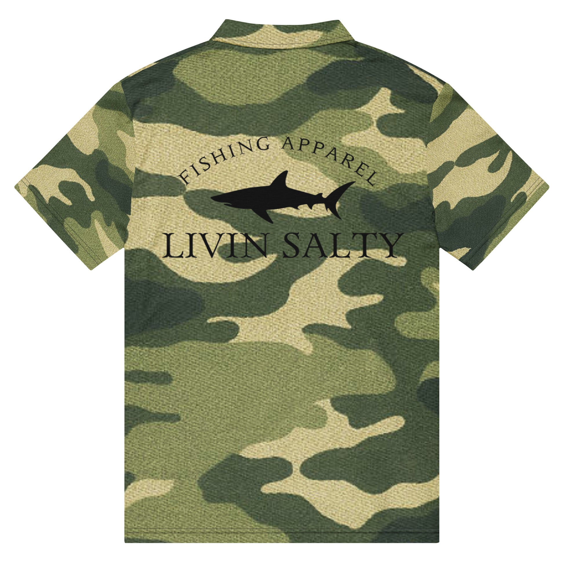 featuring this all over green camo print, with text infused LIVIN SALTY on the front chest with shark, and on the back shark design with LIVIN SALTY.