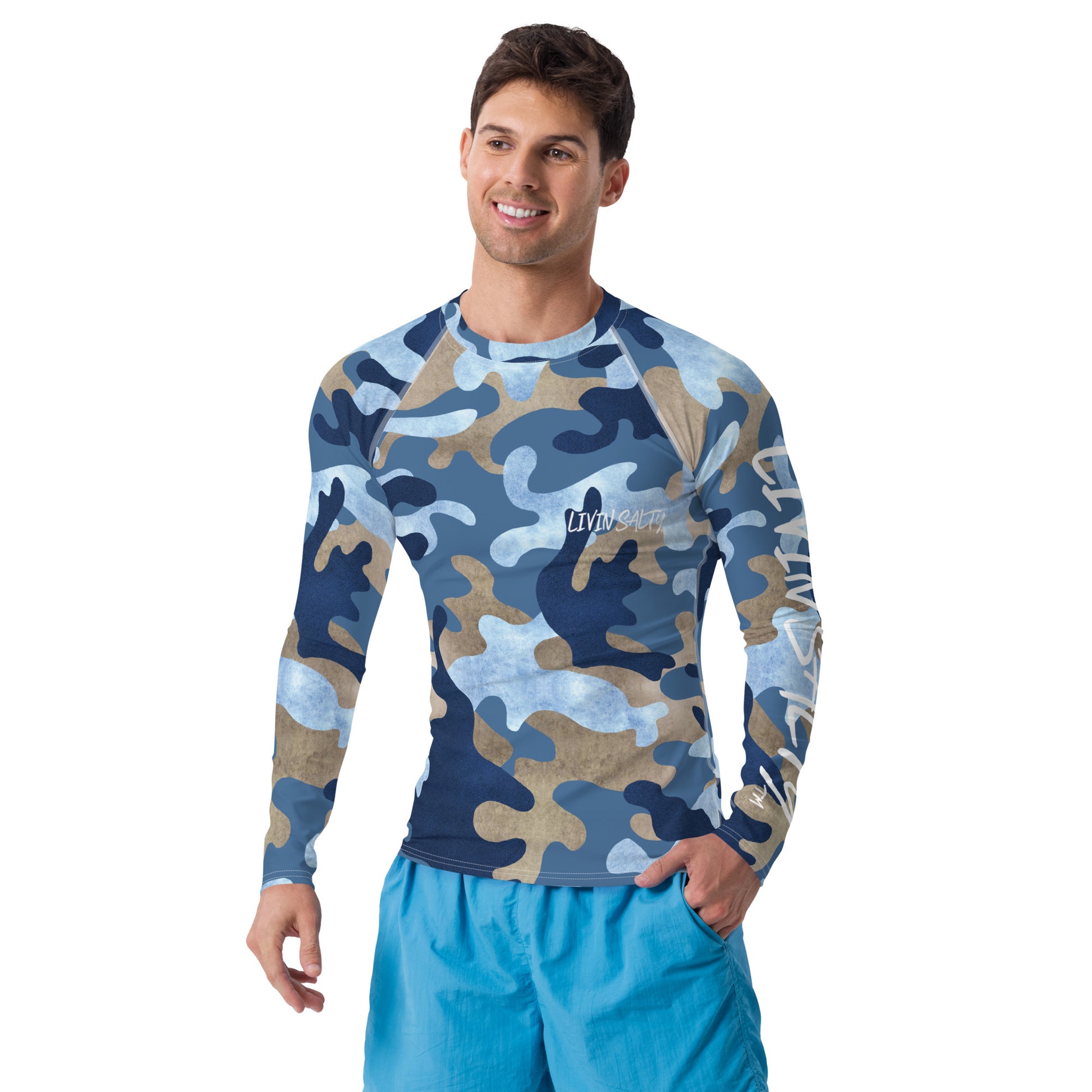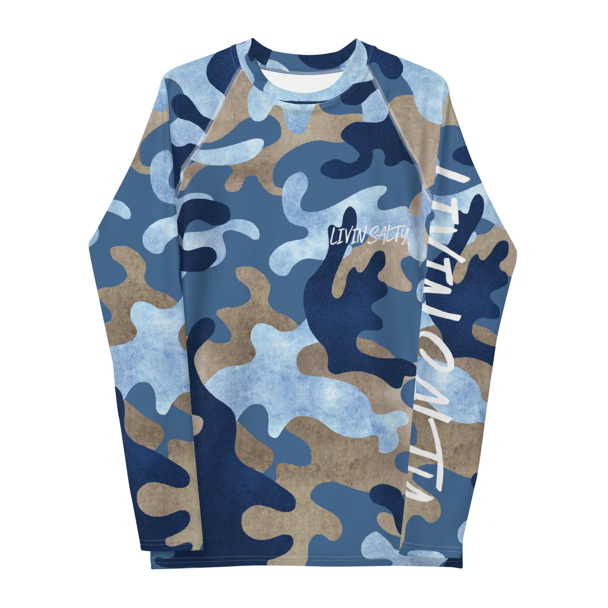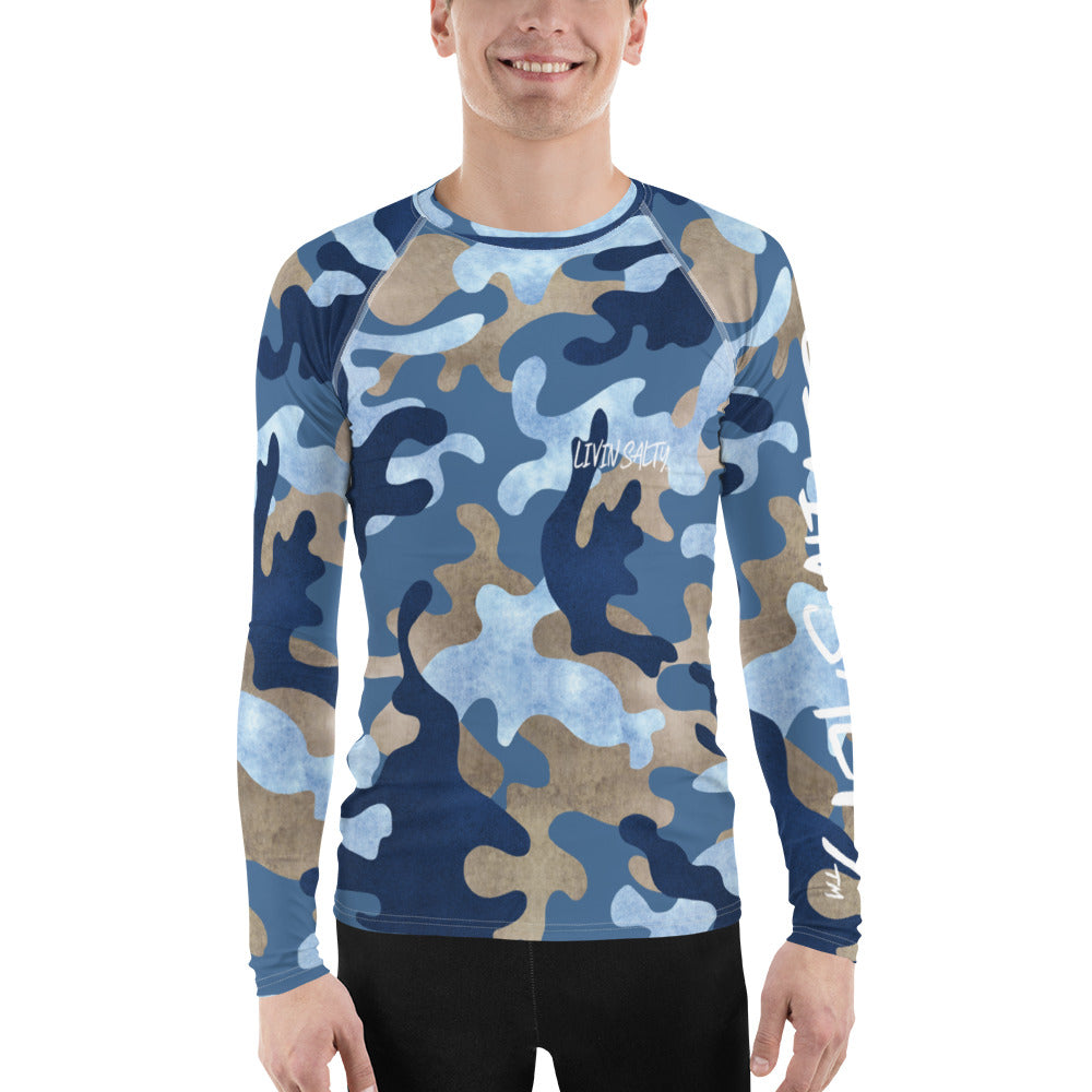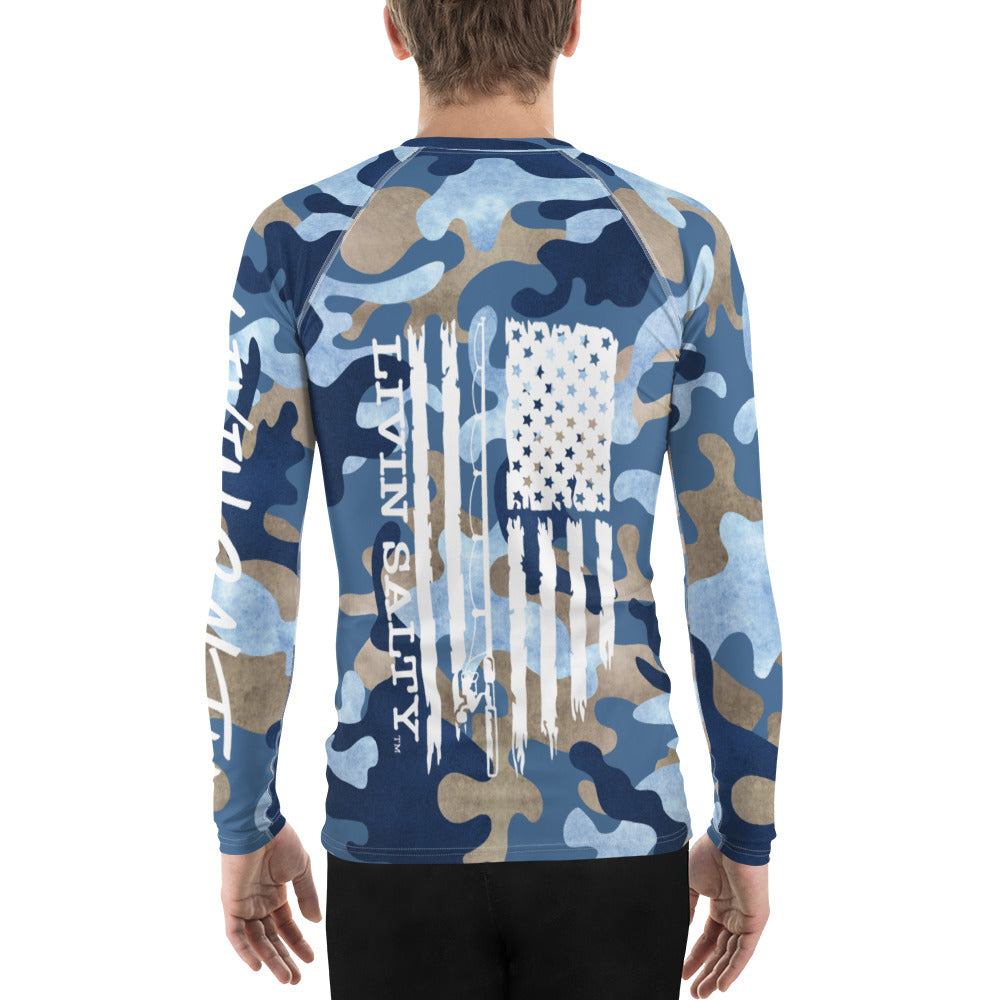 Features blue camo all around print, with LIVIN SALTY on the front and the LIVIN SALTY flag on the backside.