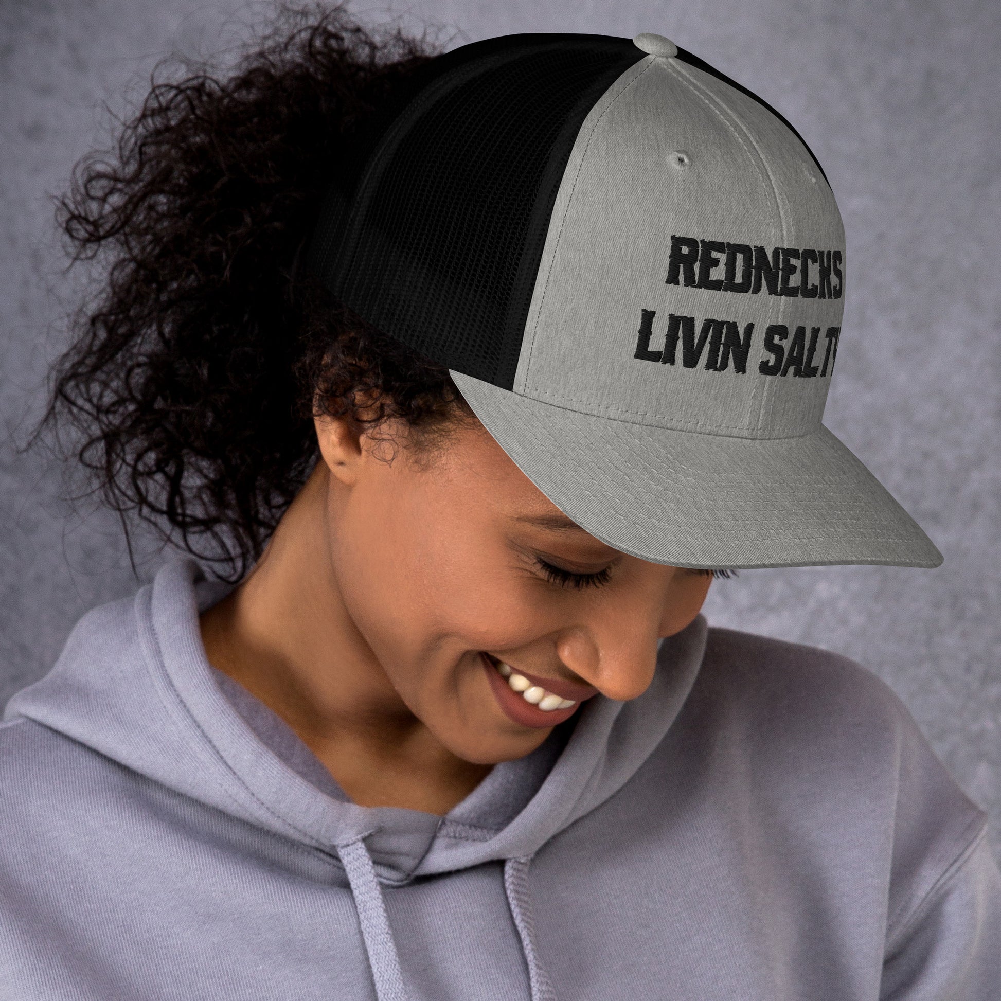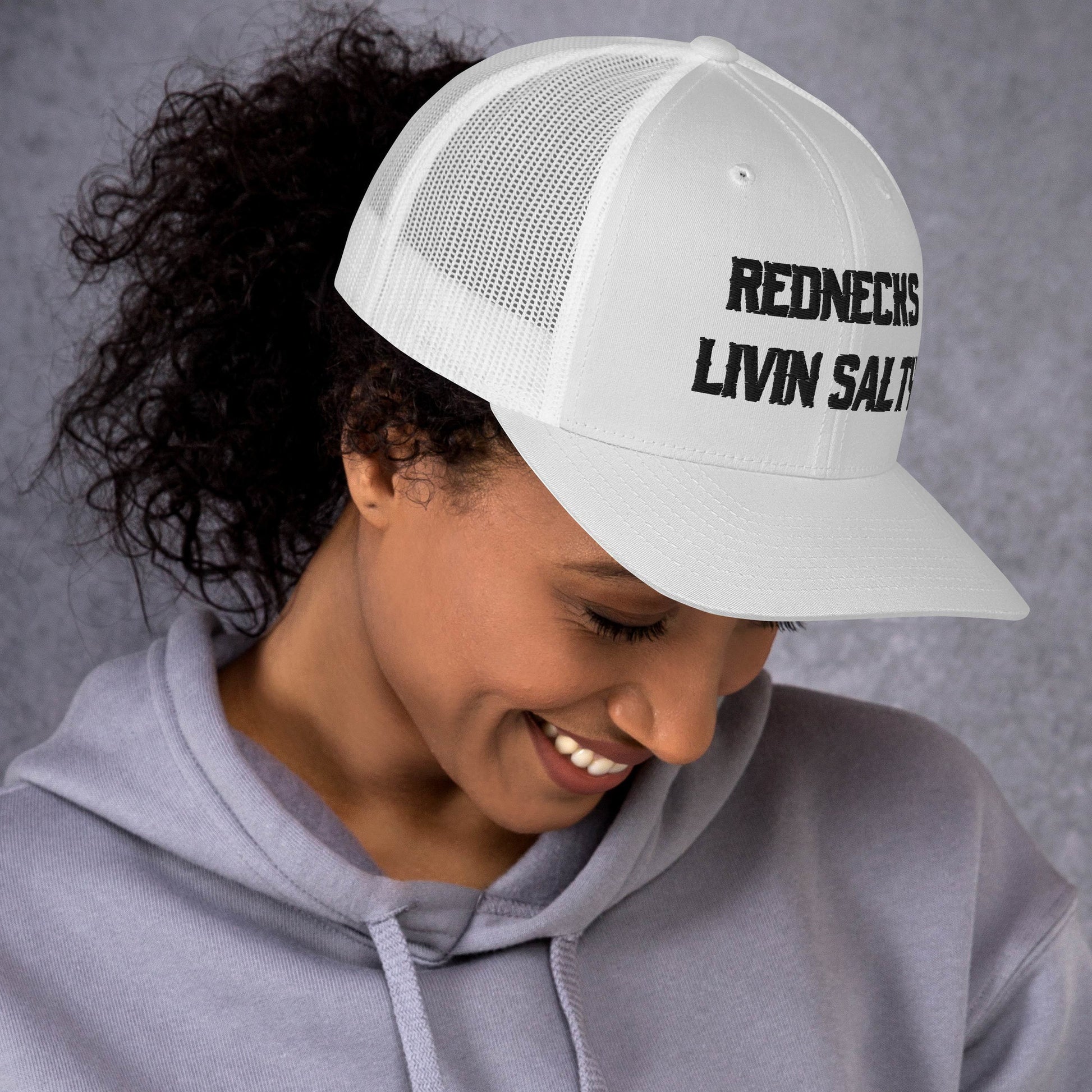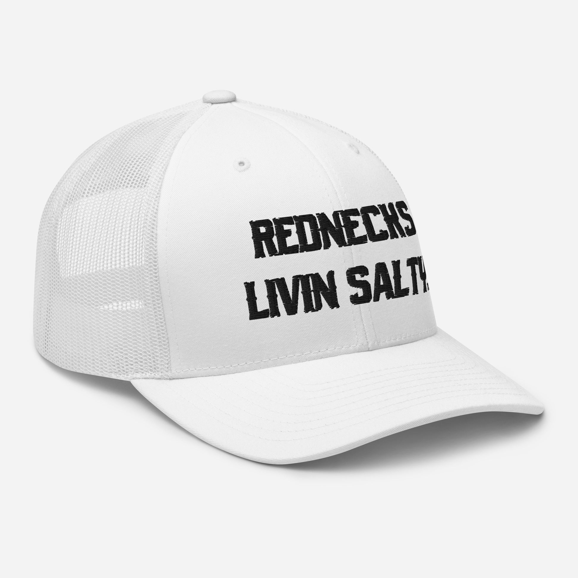 This six-panel trucker cap with a mesh back will be a comfy and classic choice for a perfect day in the sun. Features the REDNECKS LIVIN SALTY logo in big font.