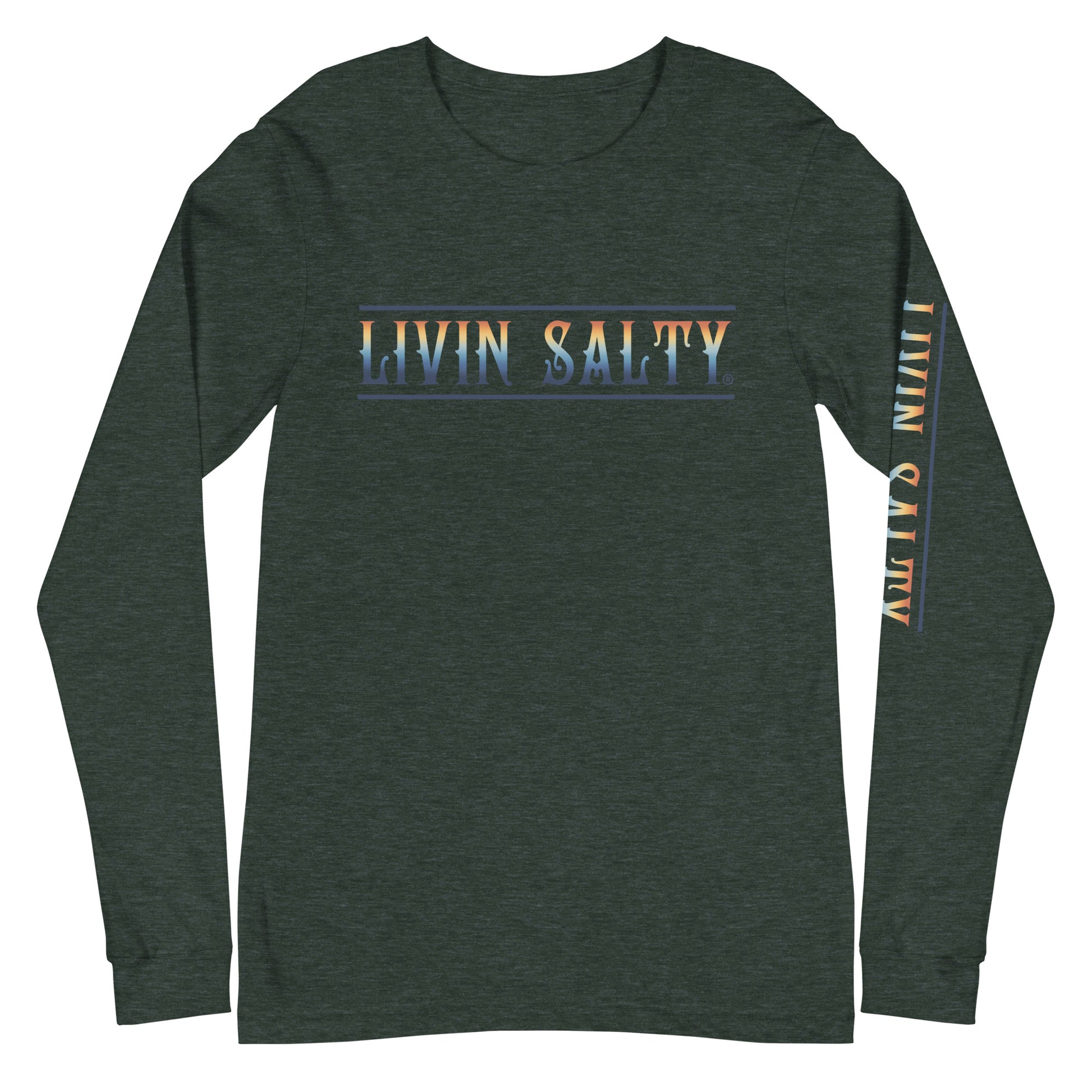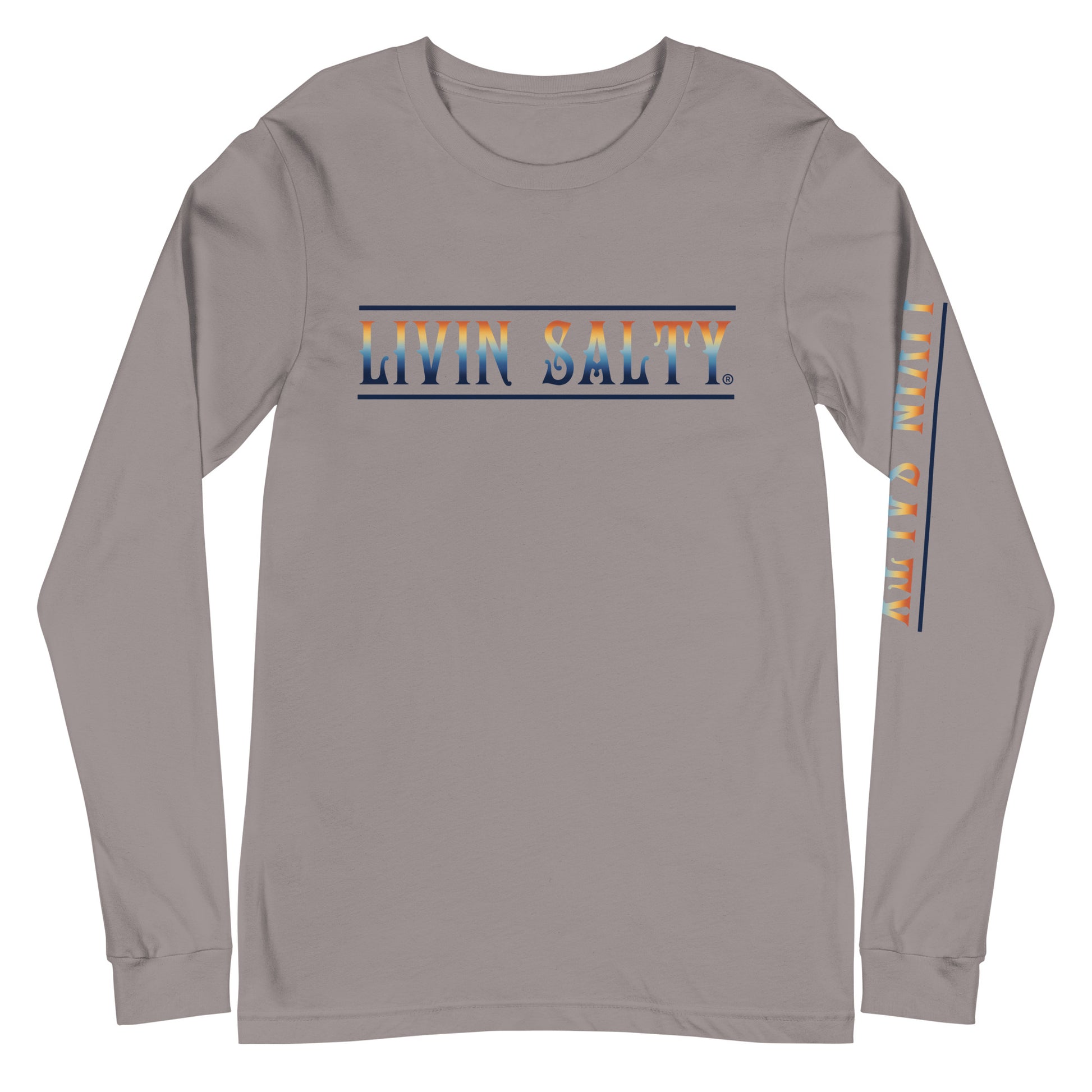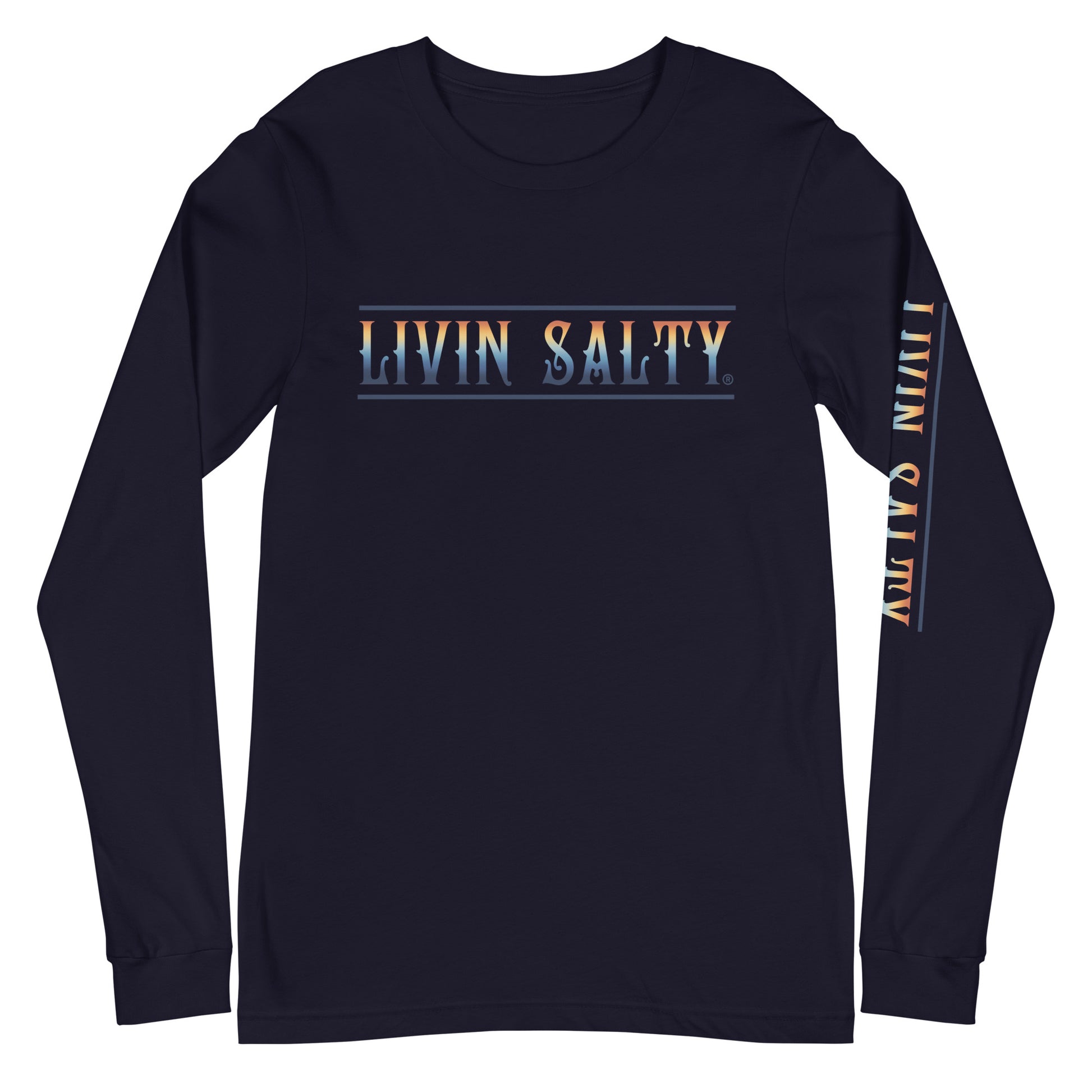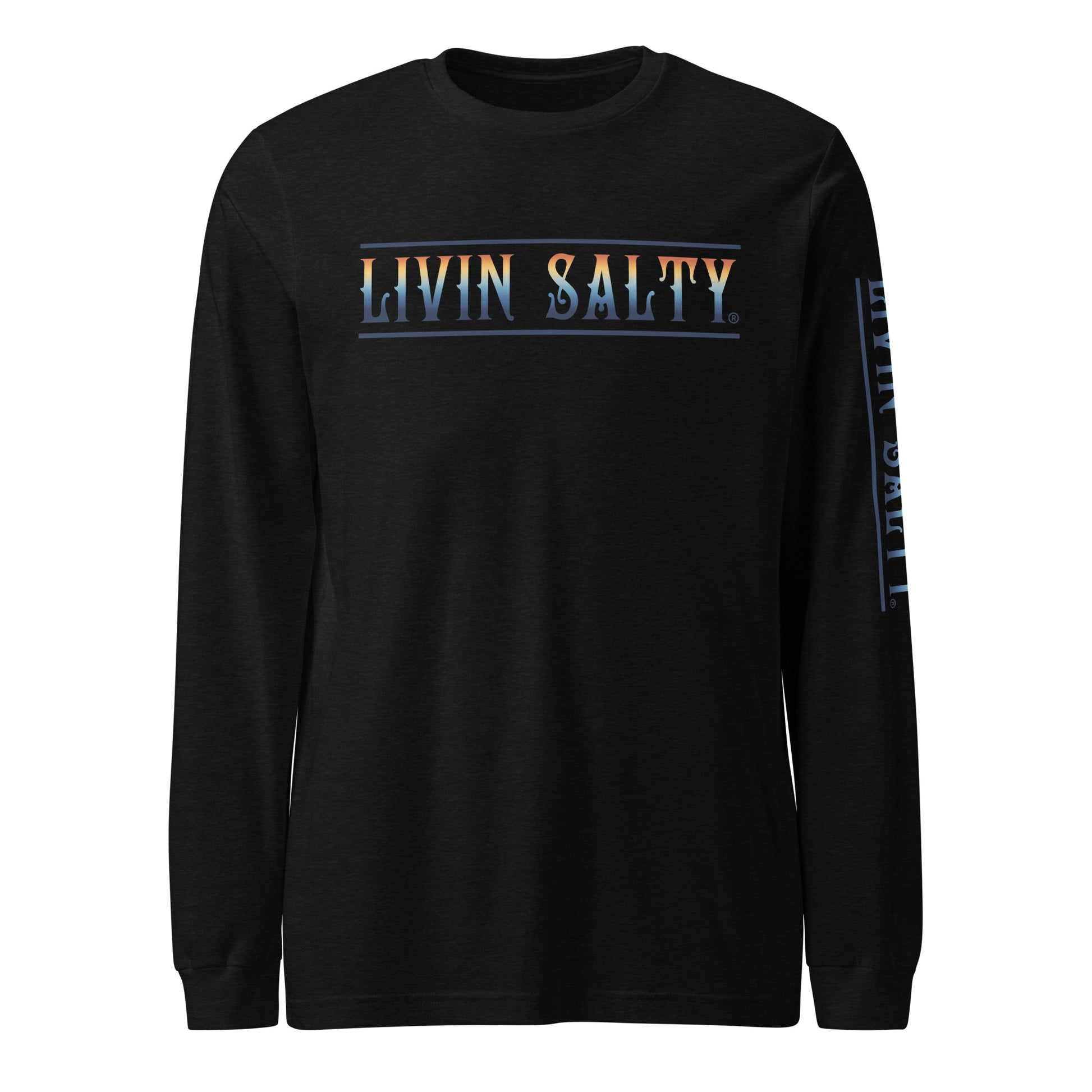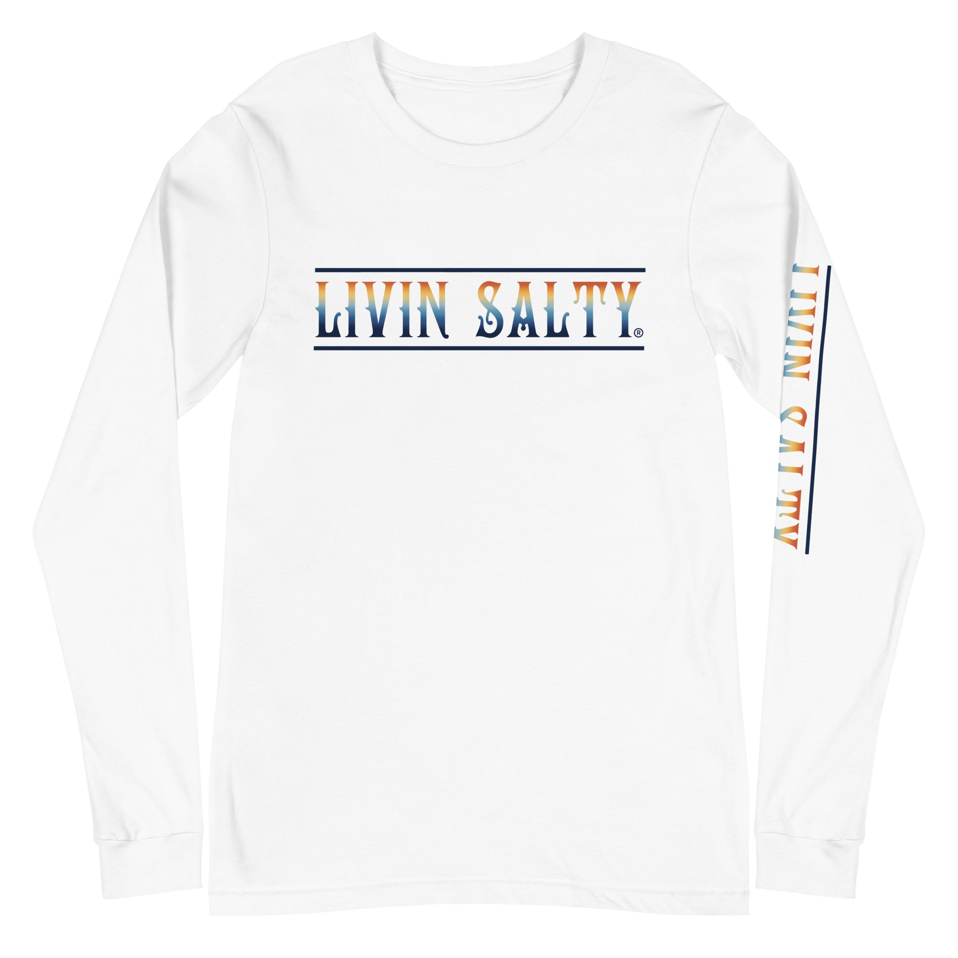 Featuring LIVIN SALTY across the chest, LIVIN SALTY down the left sleeve, and LIVIN SALTY sailfish design on the back.