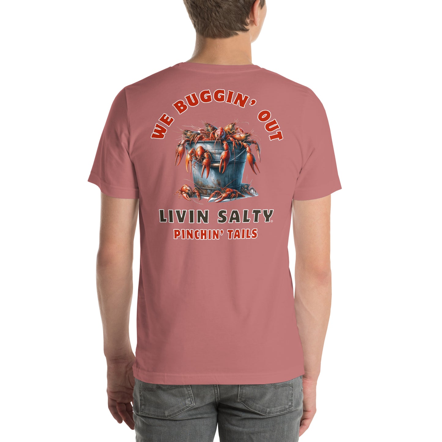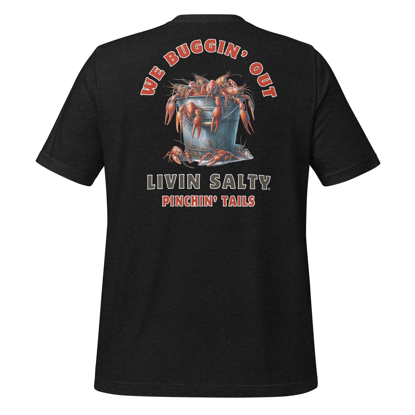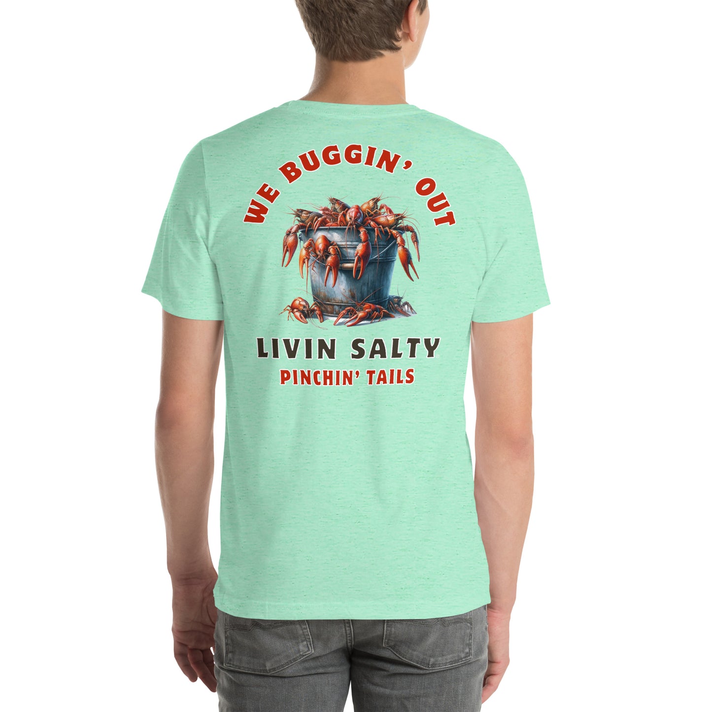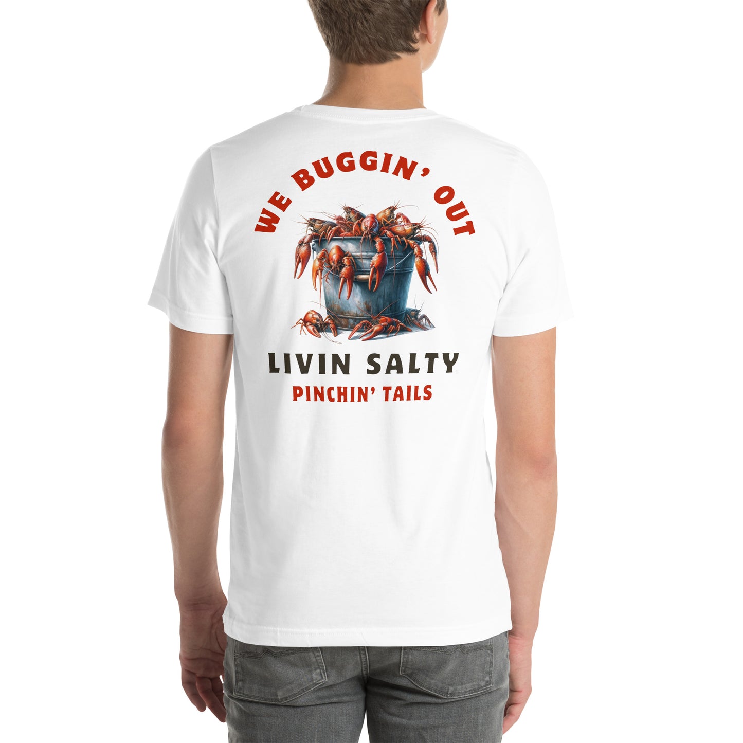 Featuring this two sided printed t shirt with the sayings “We buggin out” and “pinchin tails”. Front side contains a left sides chest print and back side contains a detailed bucket of crawfish with LIVIN SALTY.