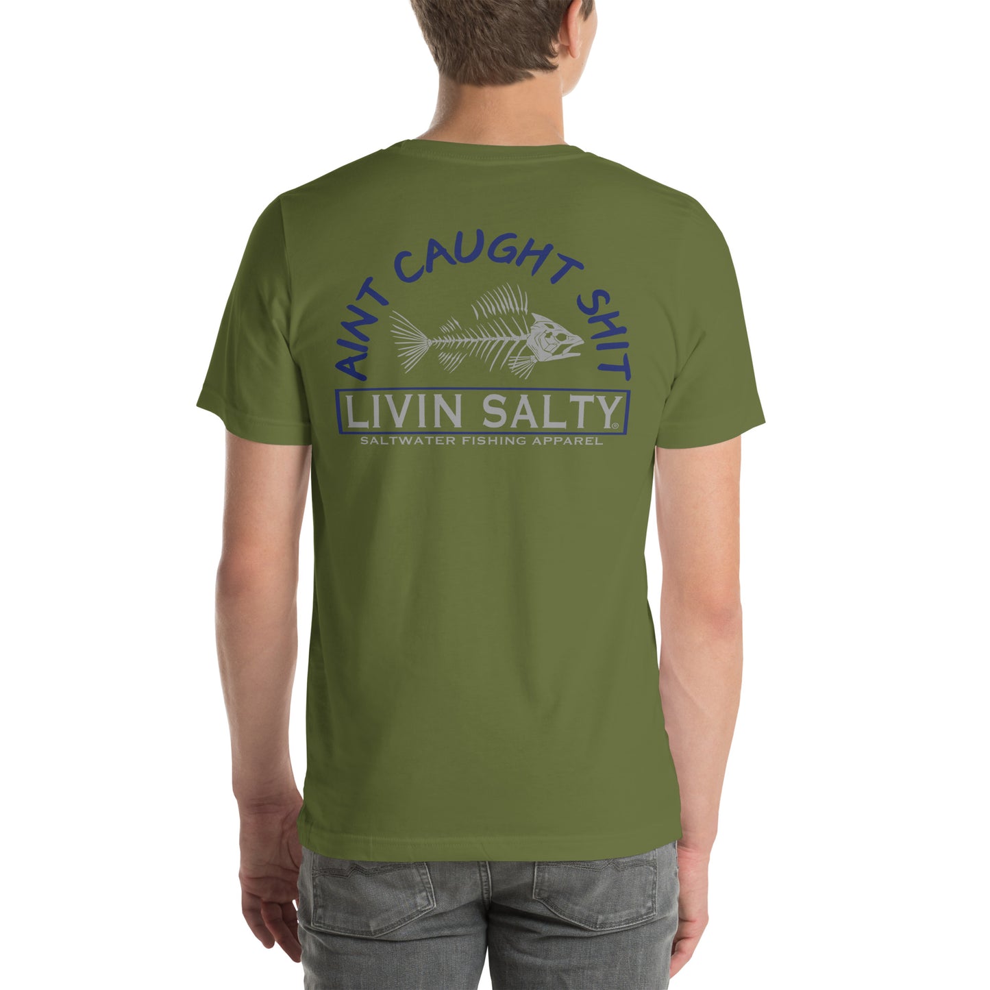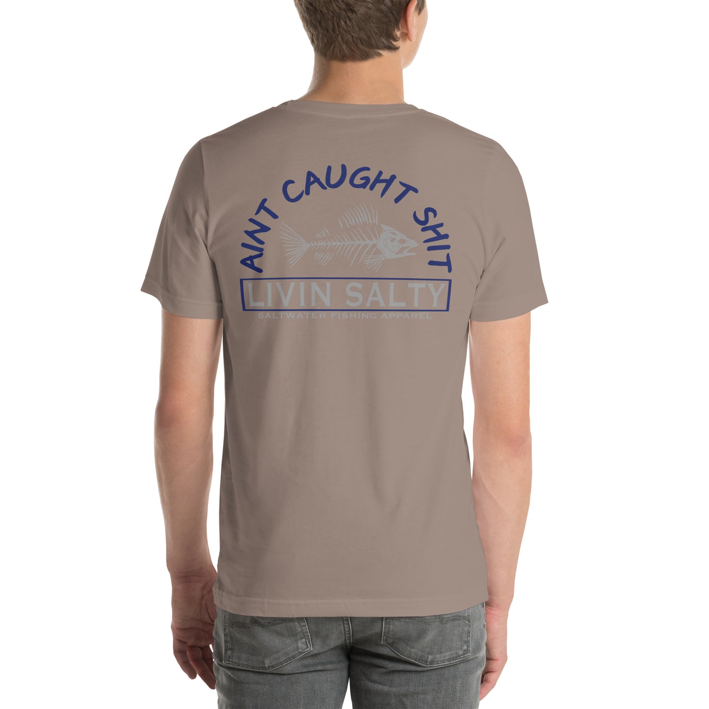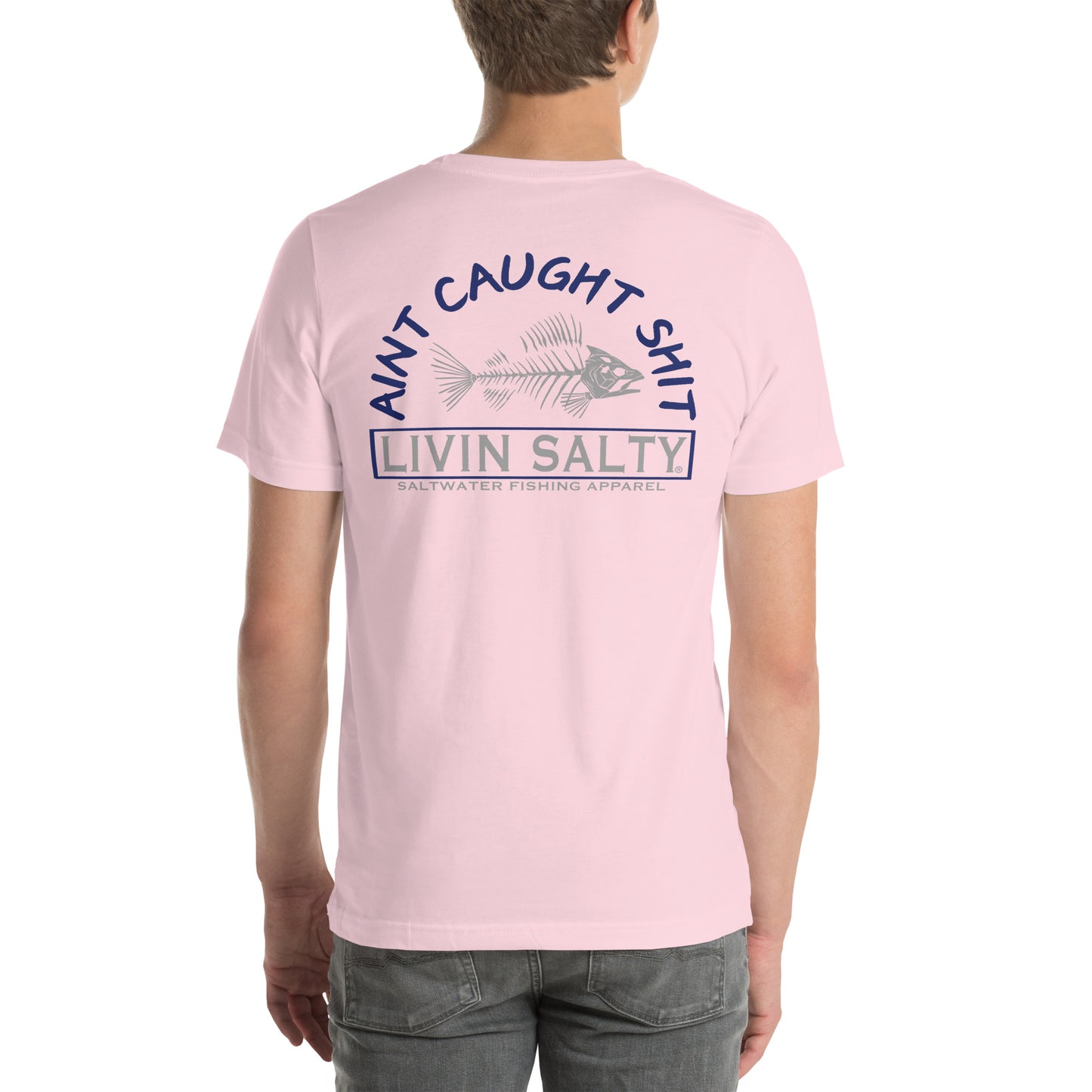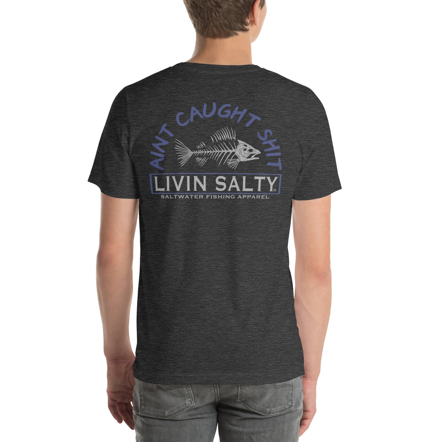 Featuring this LIVIN SALTY “Ain’t caught shit” with skeleton fish design.