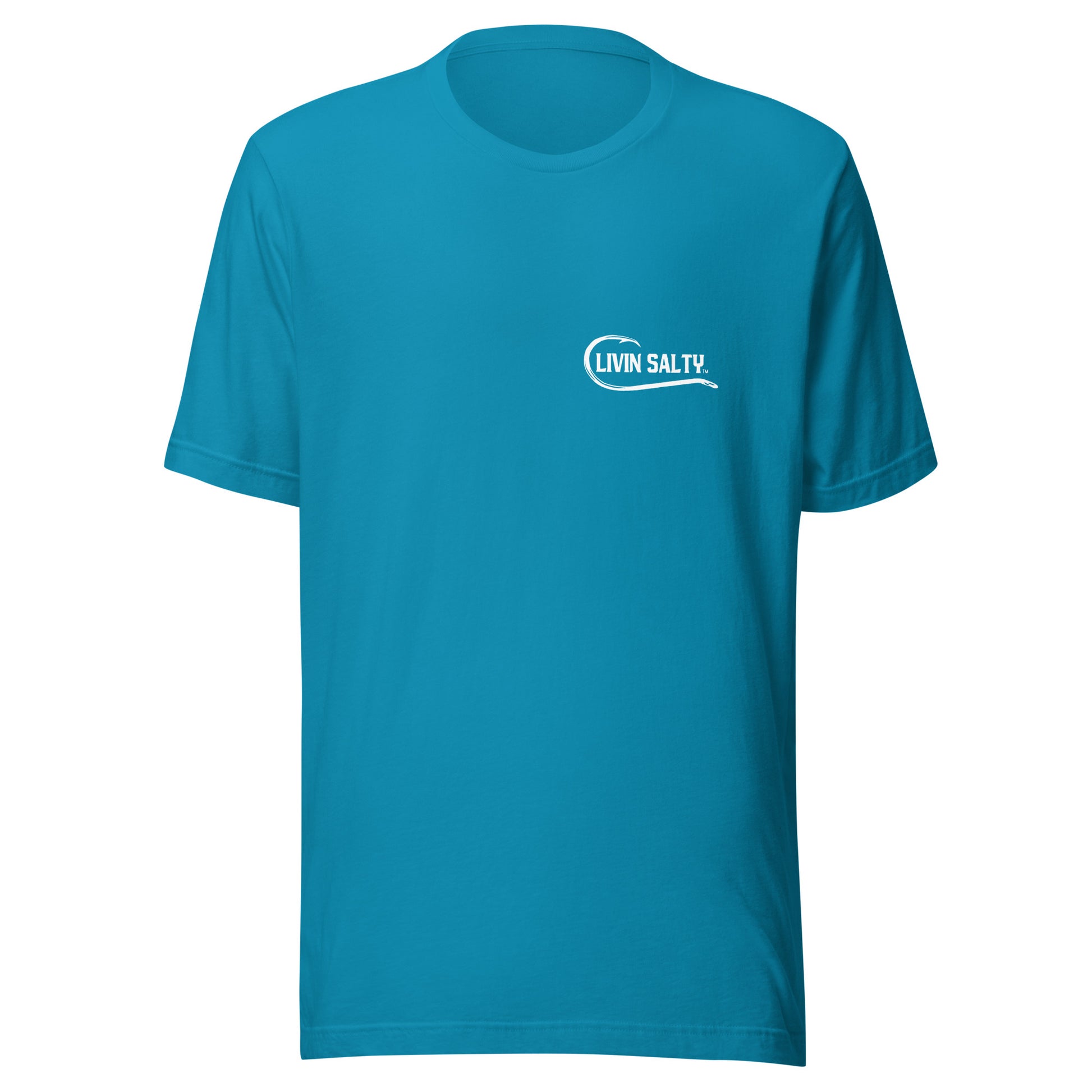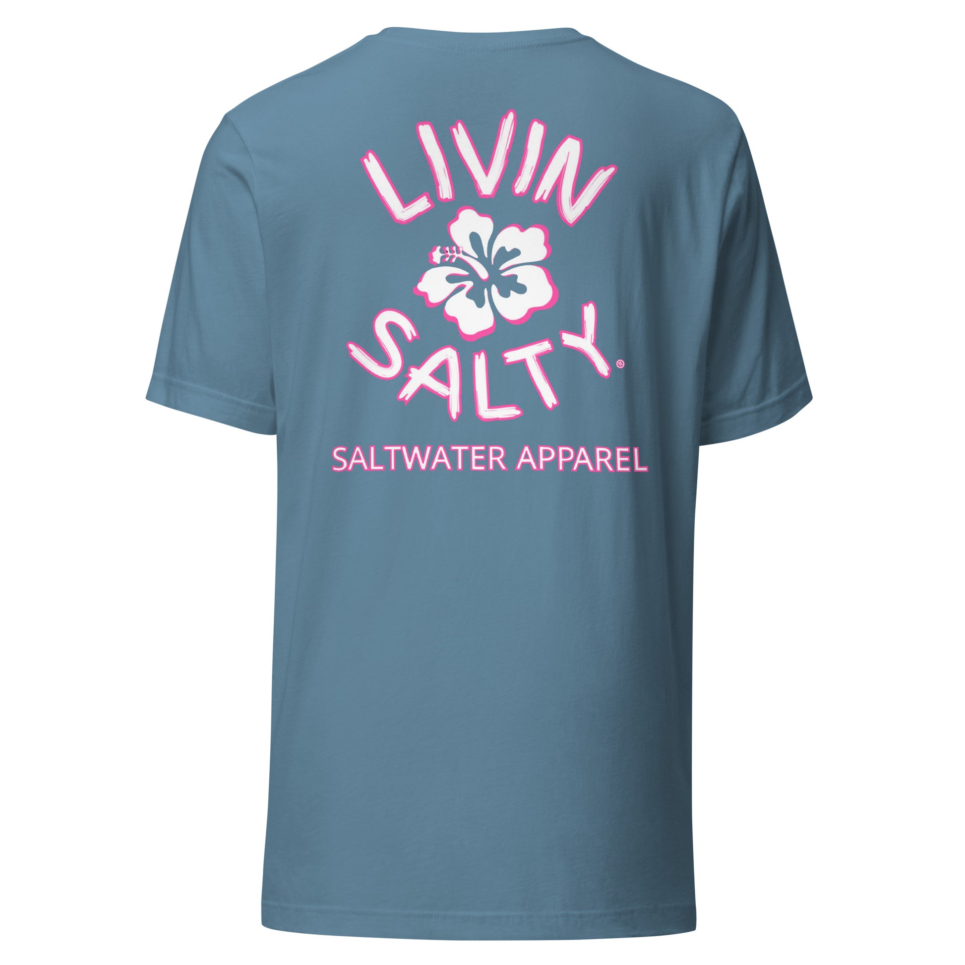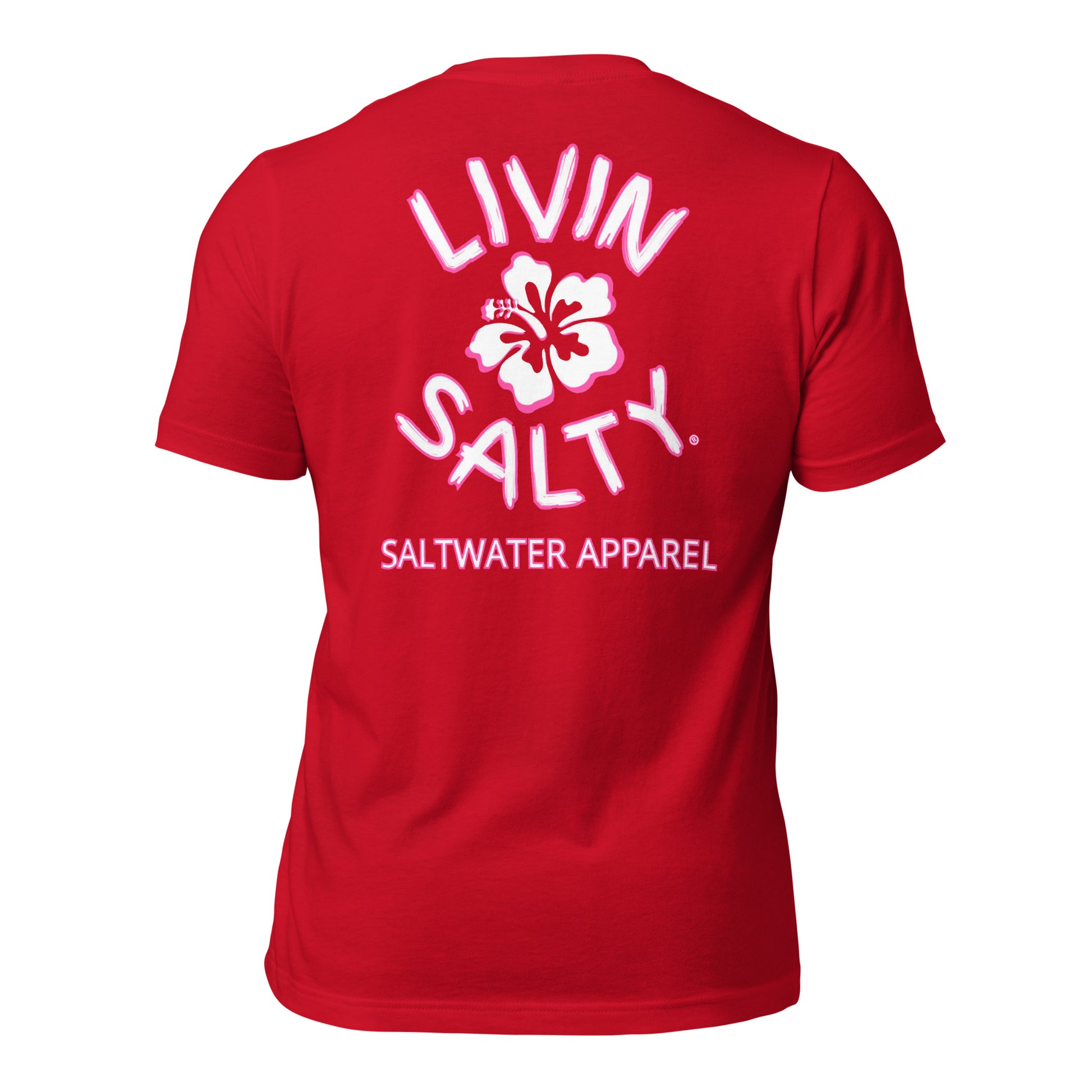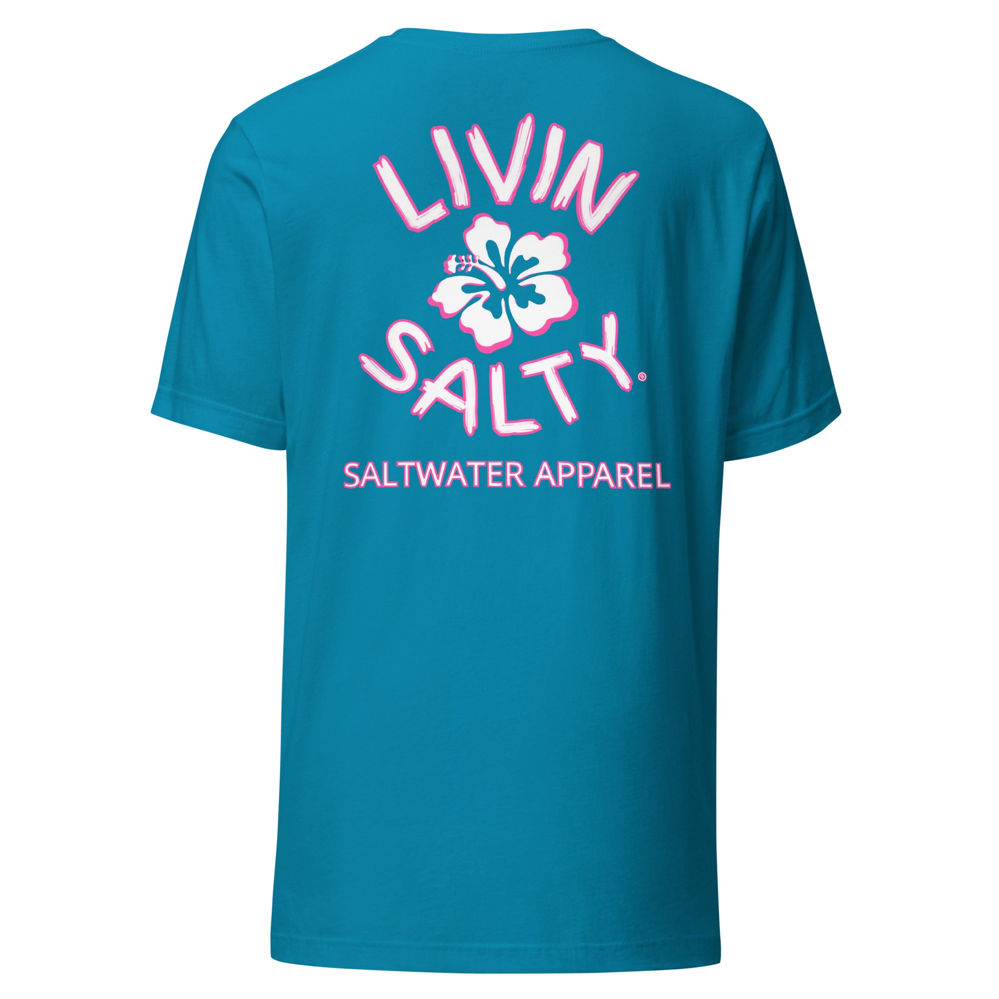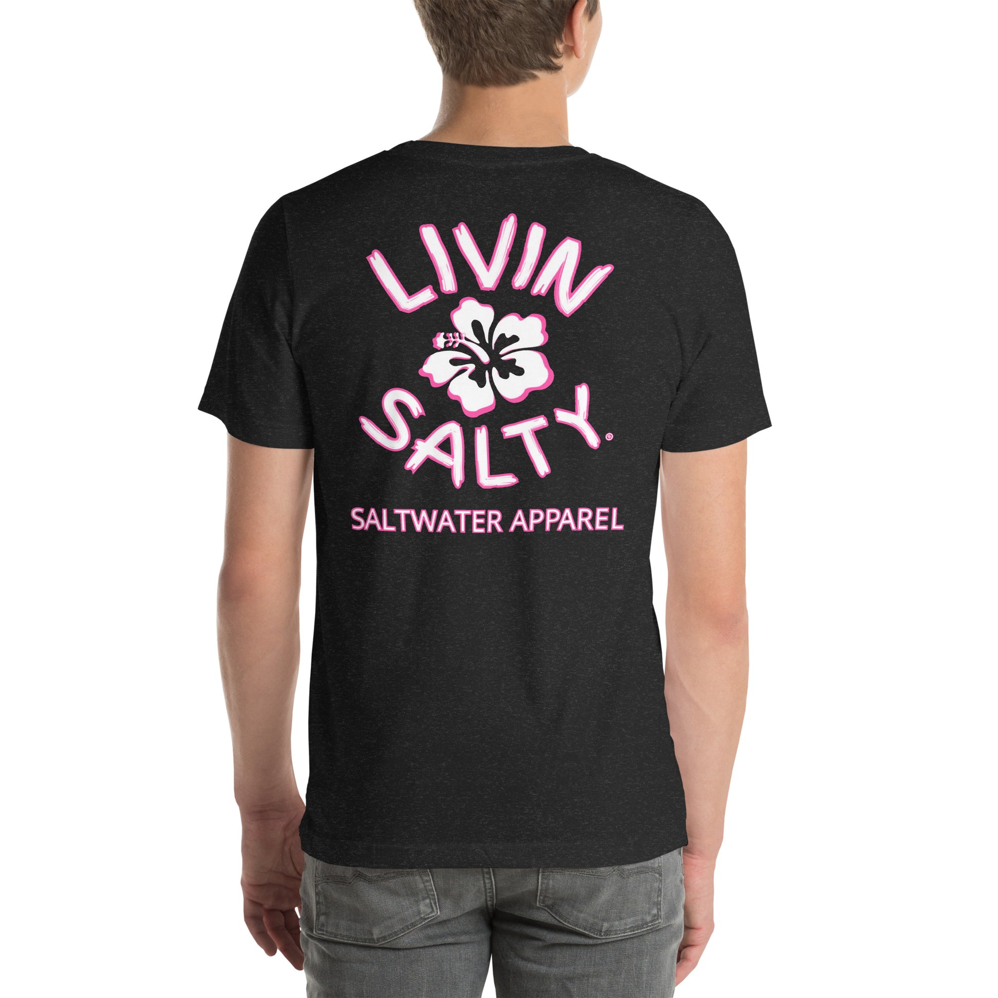 Featuring LIVIN SALTY hook logo on front left chest. With LIVIN SALTY in white and pink on the back.