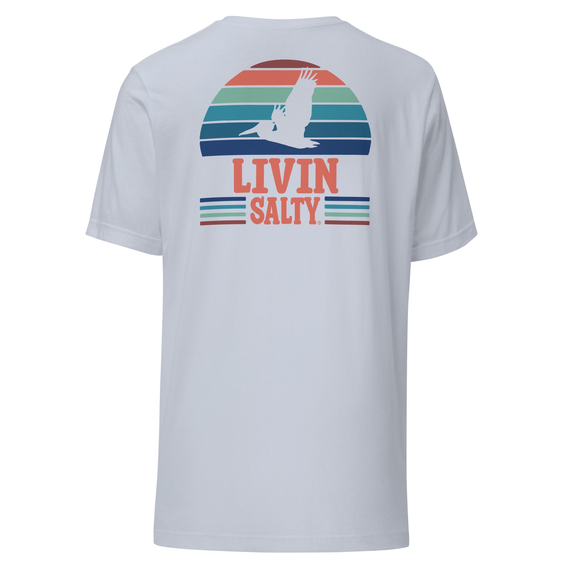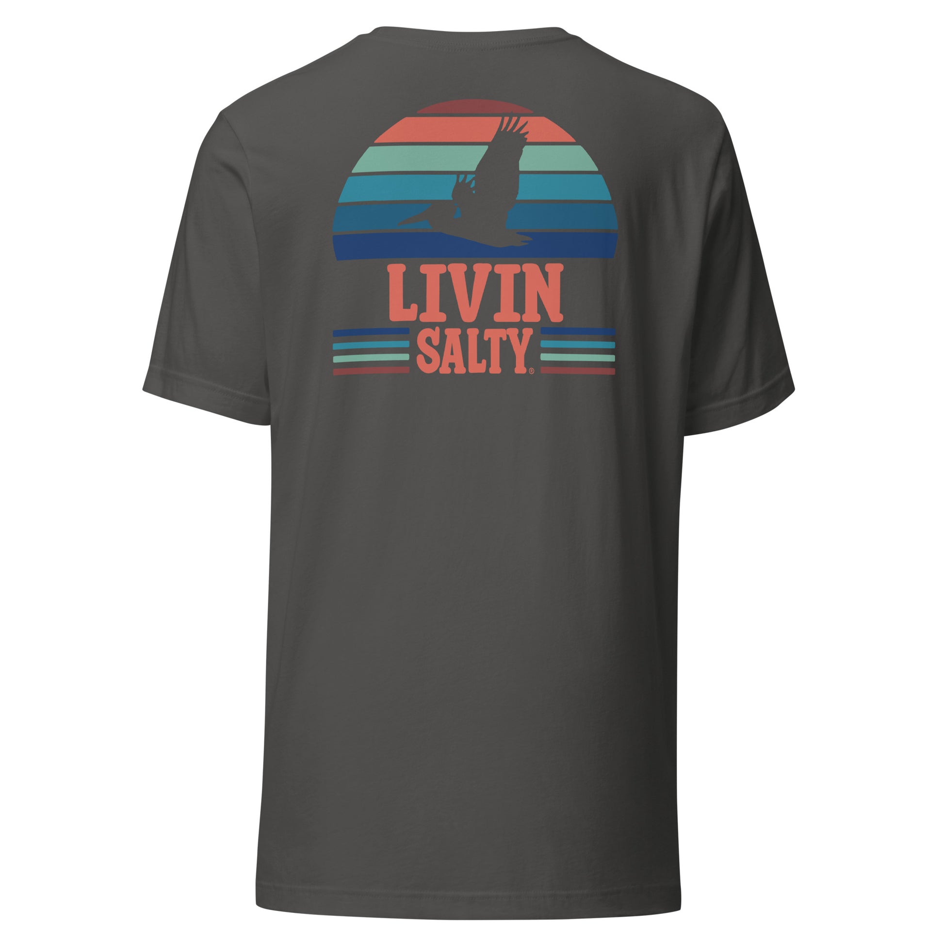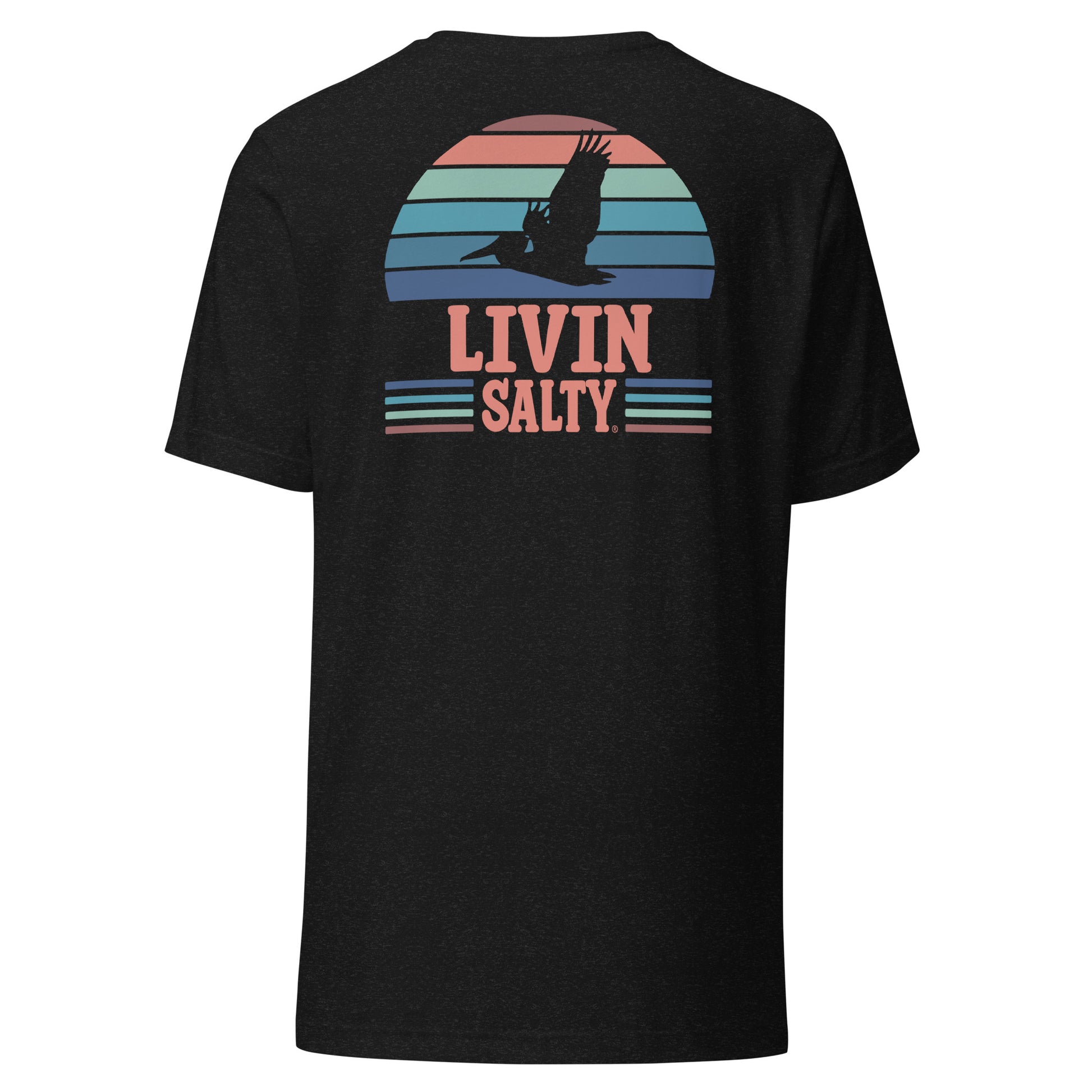 Featuring this LIVIN SALTY design with pelican on the back, with LIVIN SALTY on front left chest.
