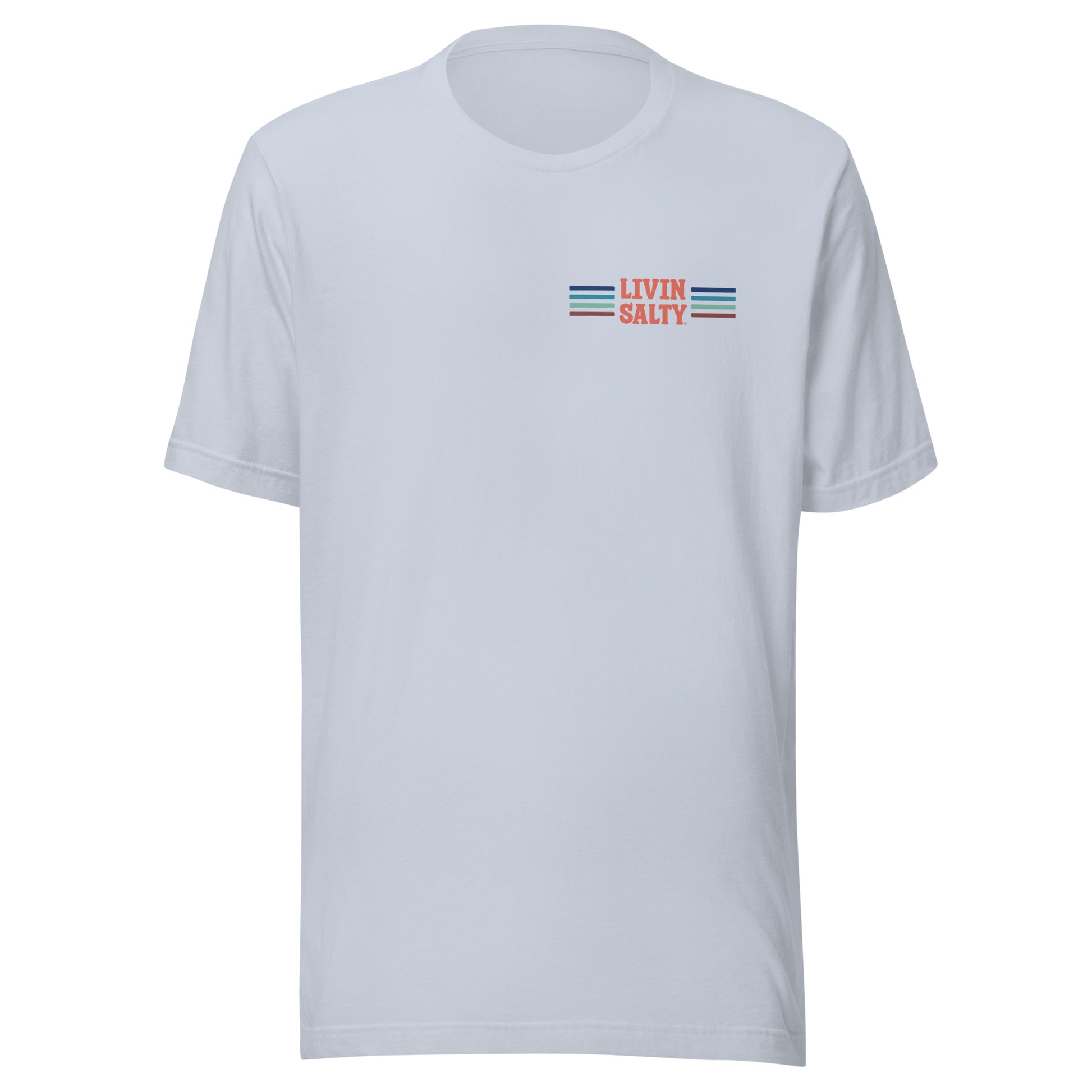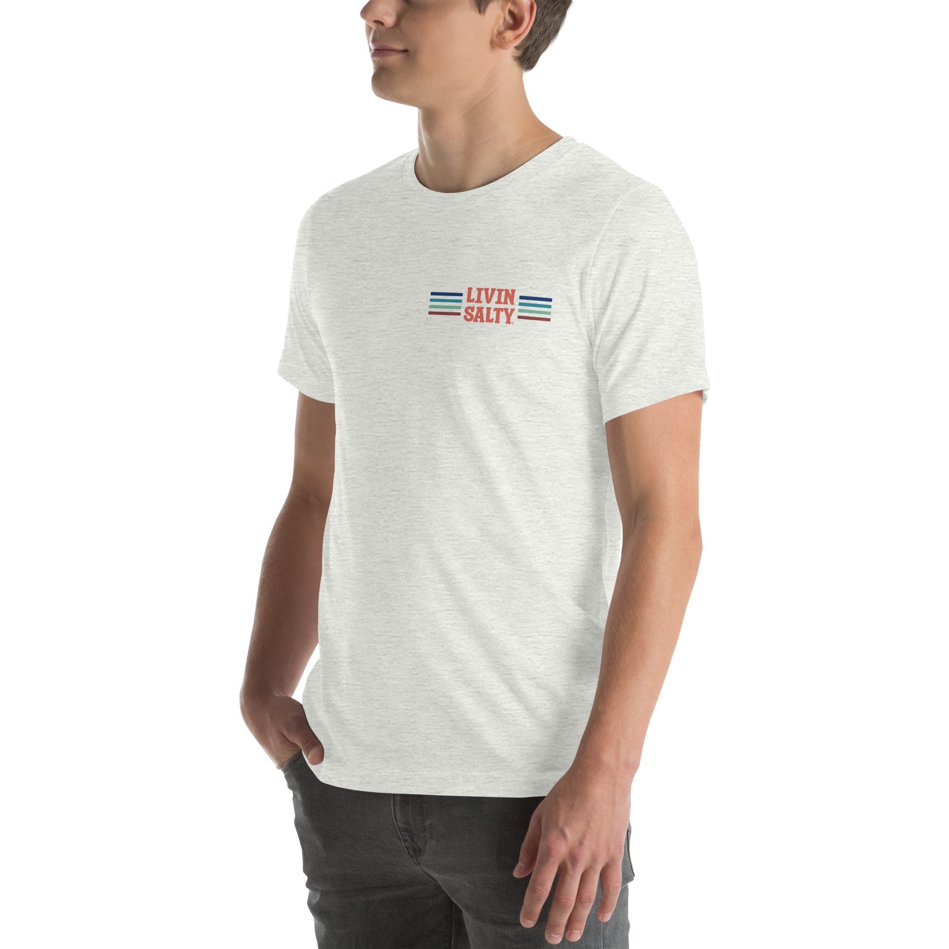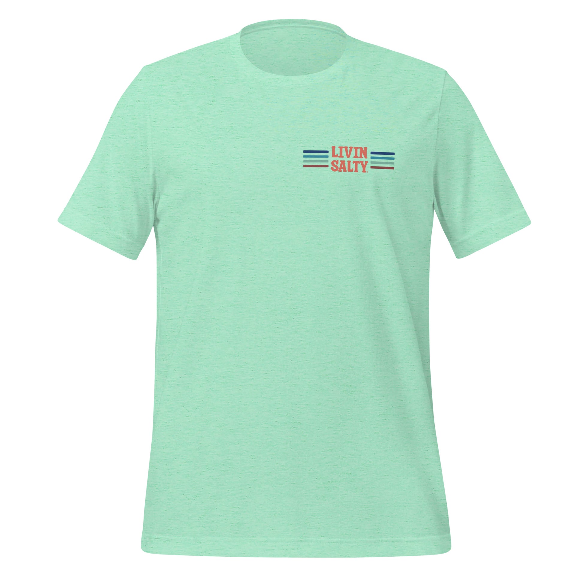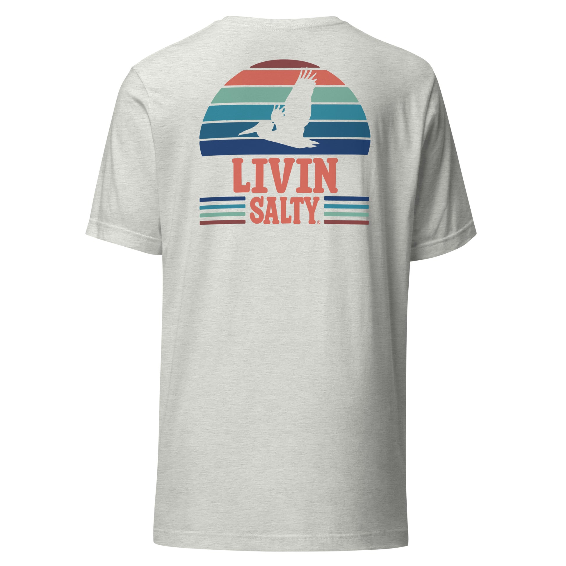 Featuring this LIVIN SALTY design with pelican on the back, with LIVIN SALTY on front left chest.