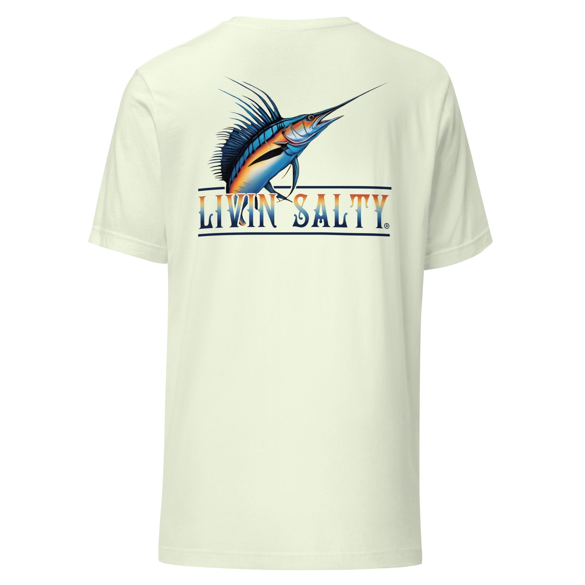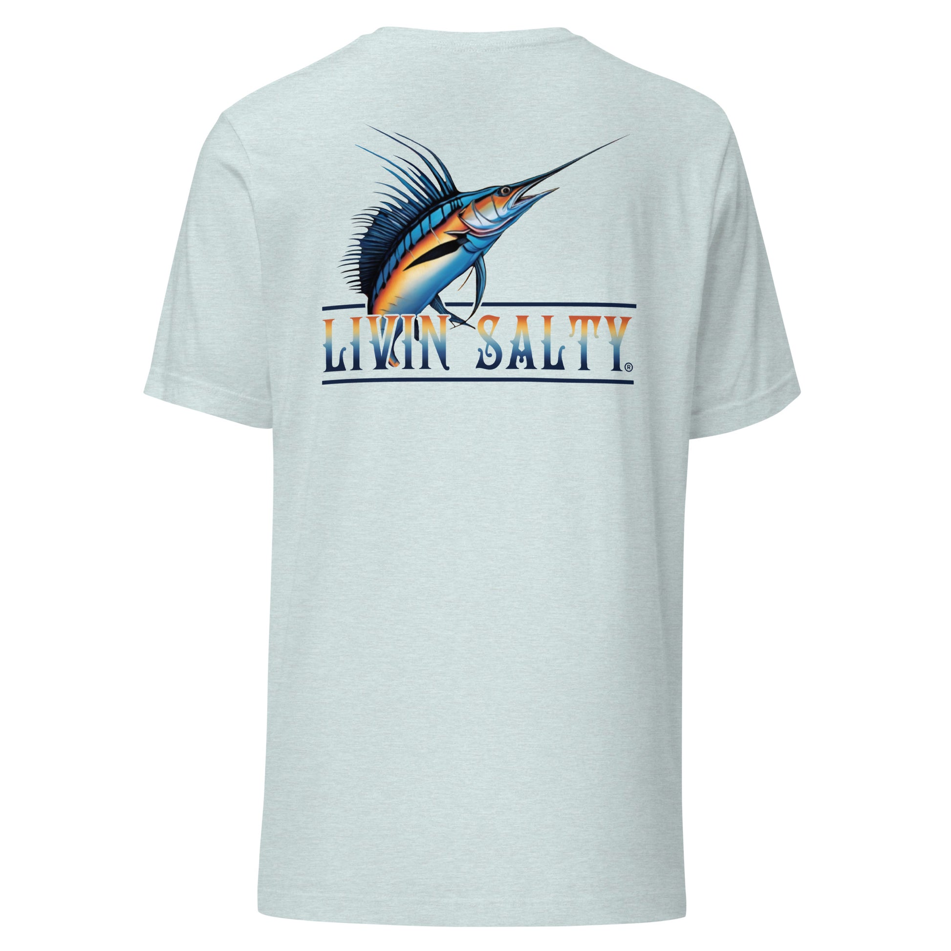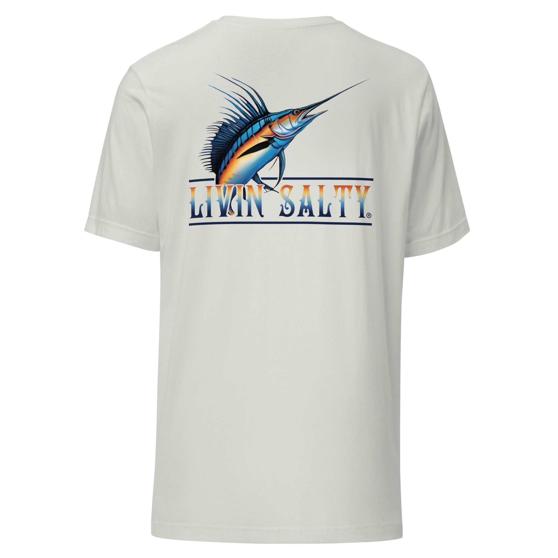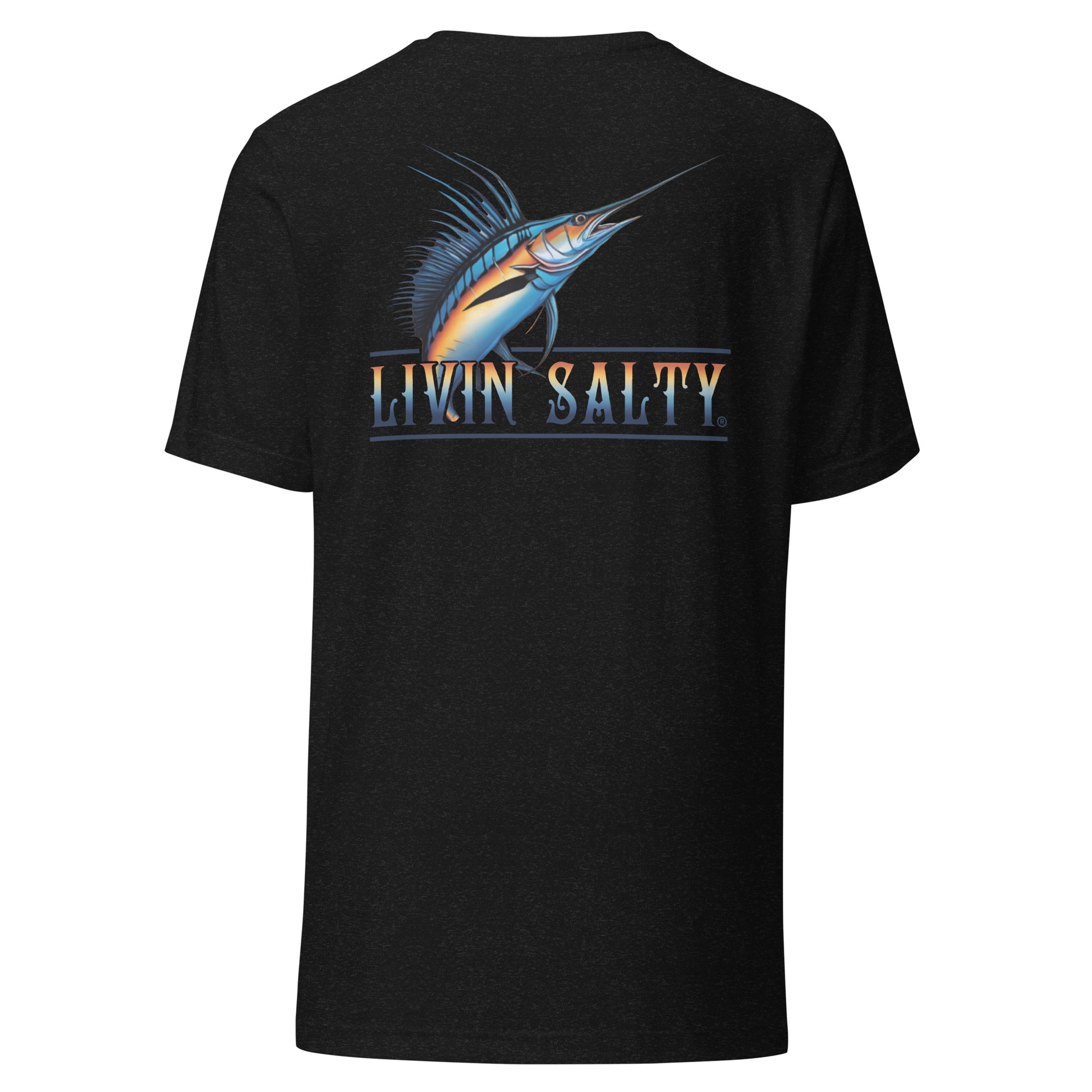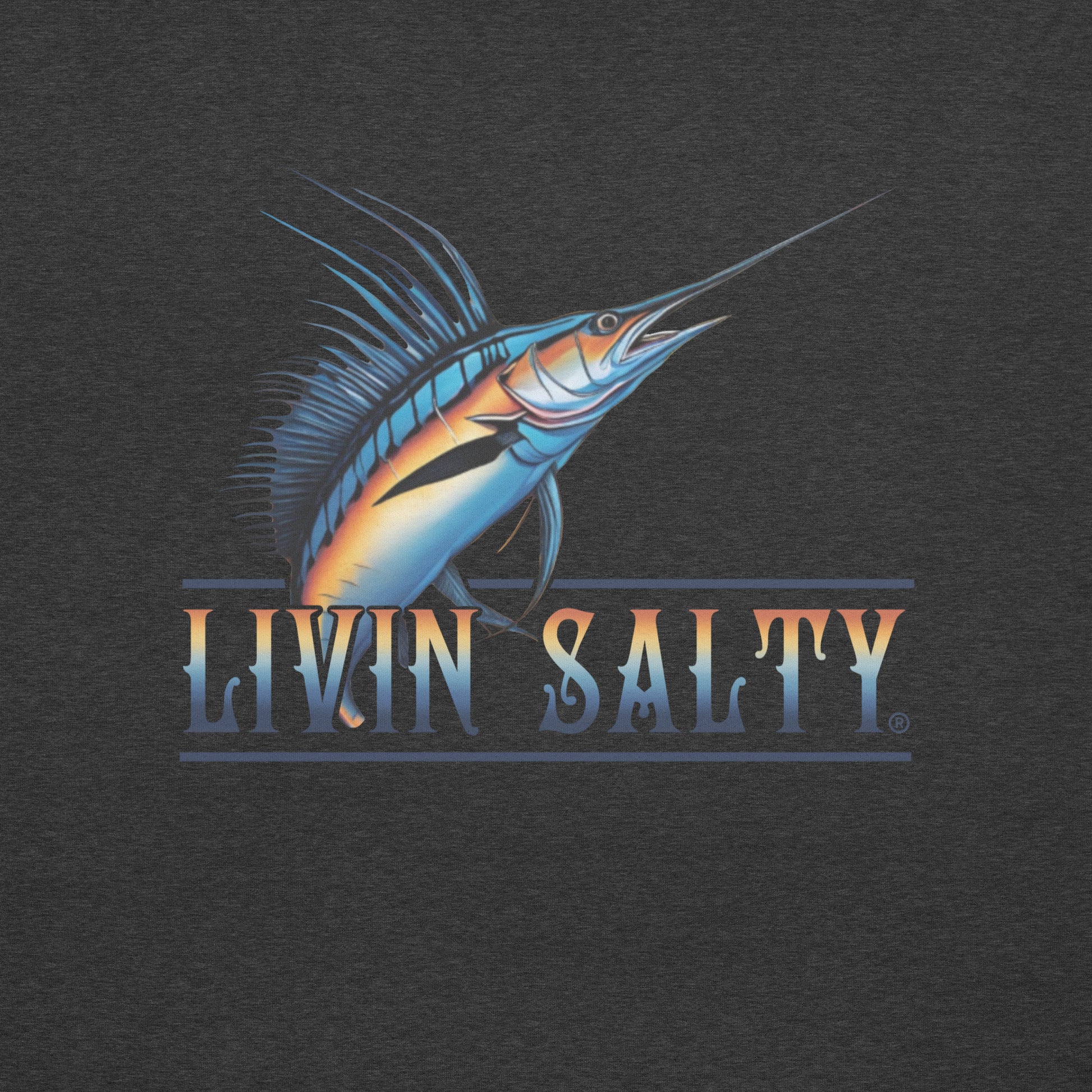Featuring LIVIN SALTY across the chest, with LIVIN SALTY sailfish design on the back.