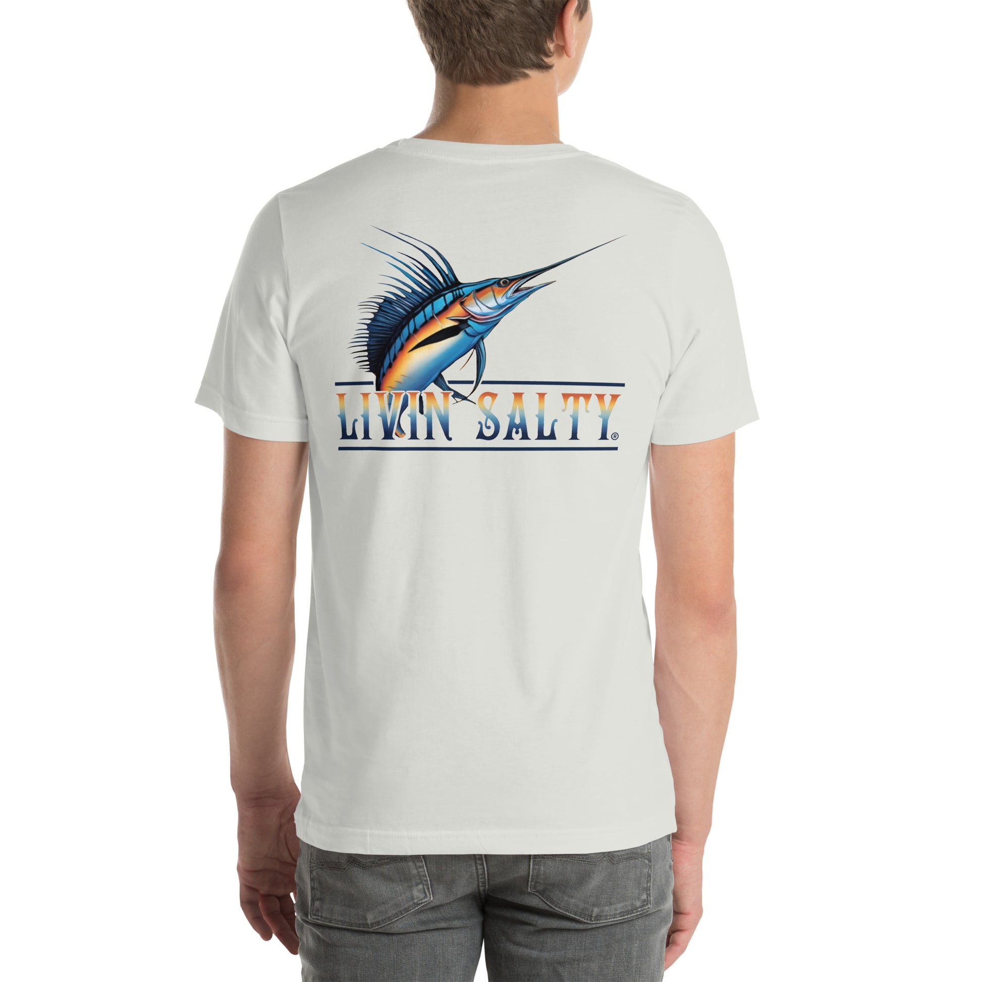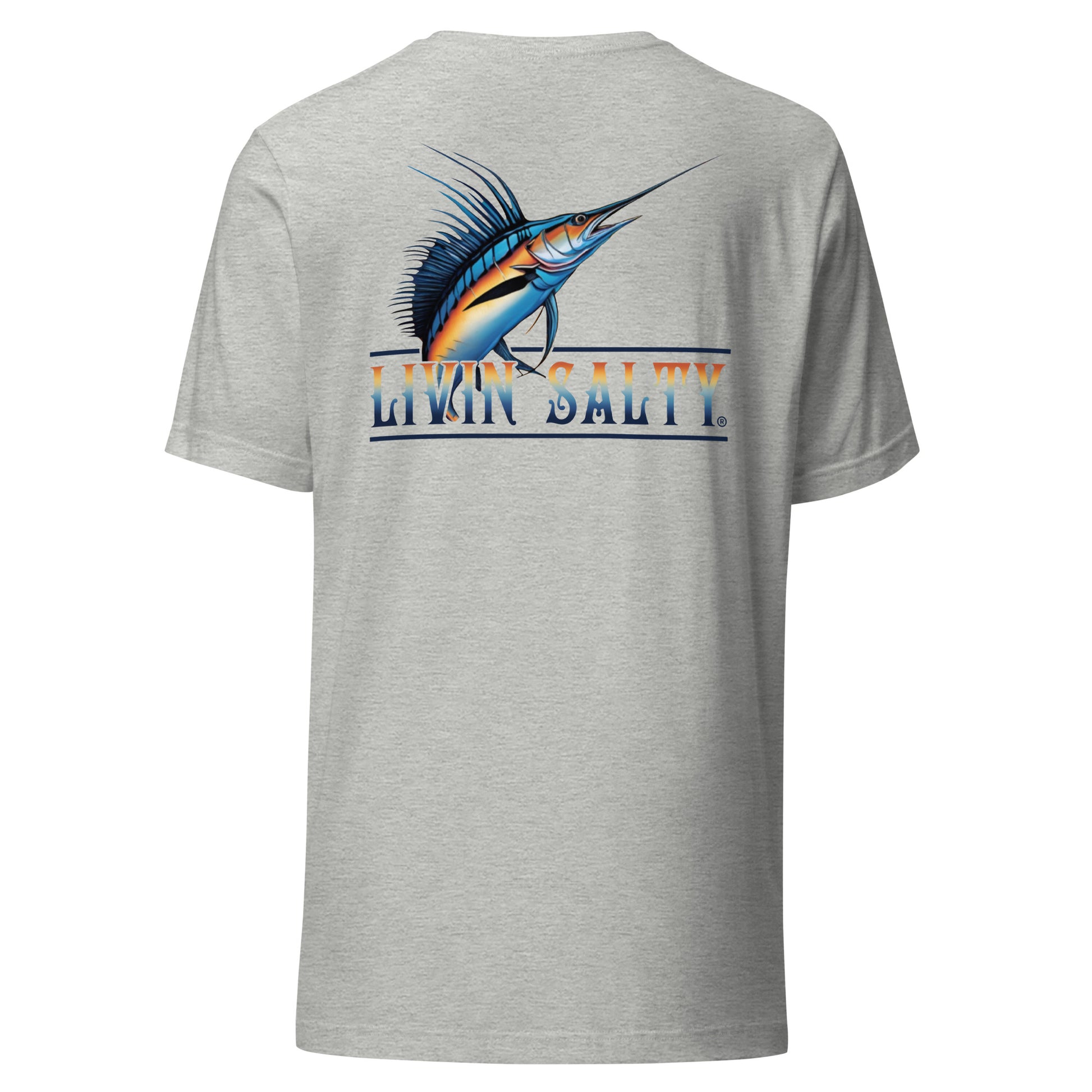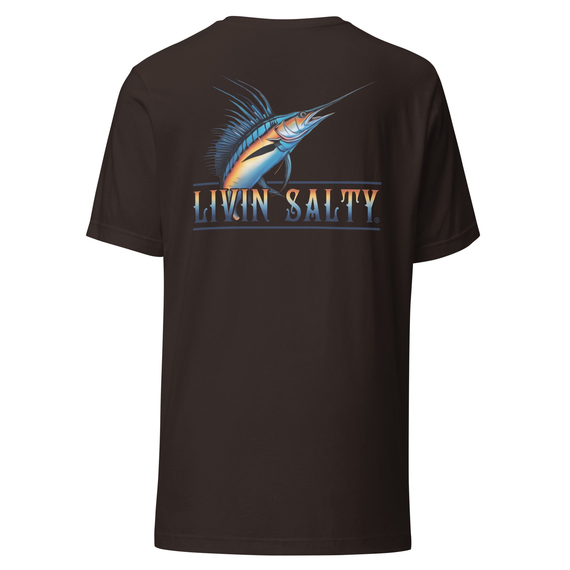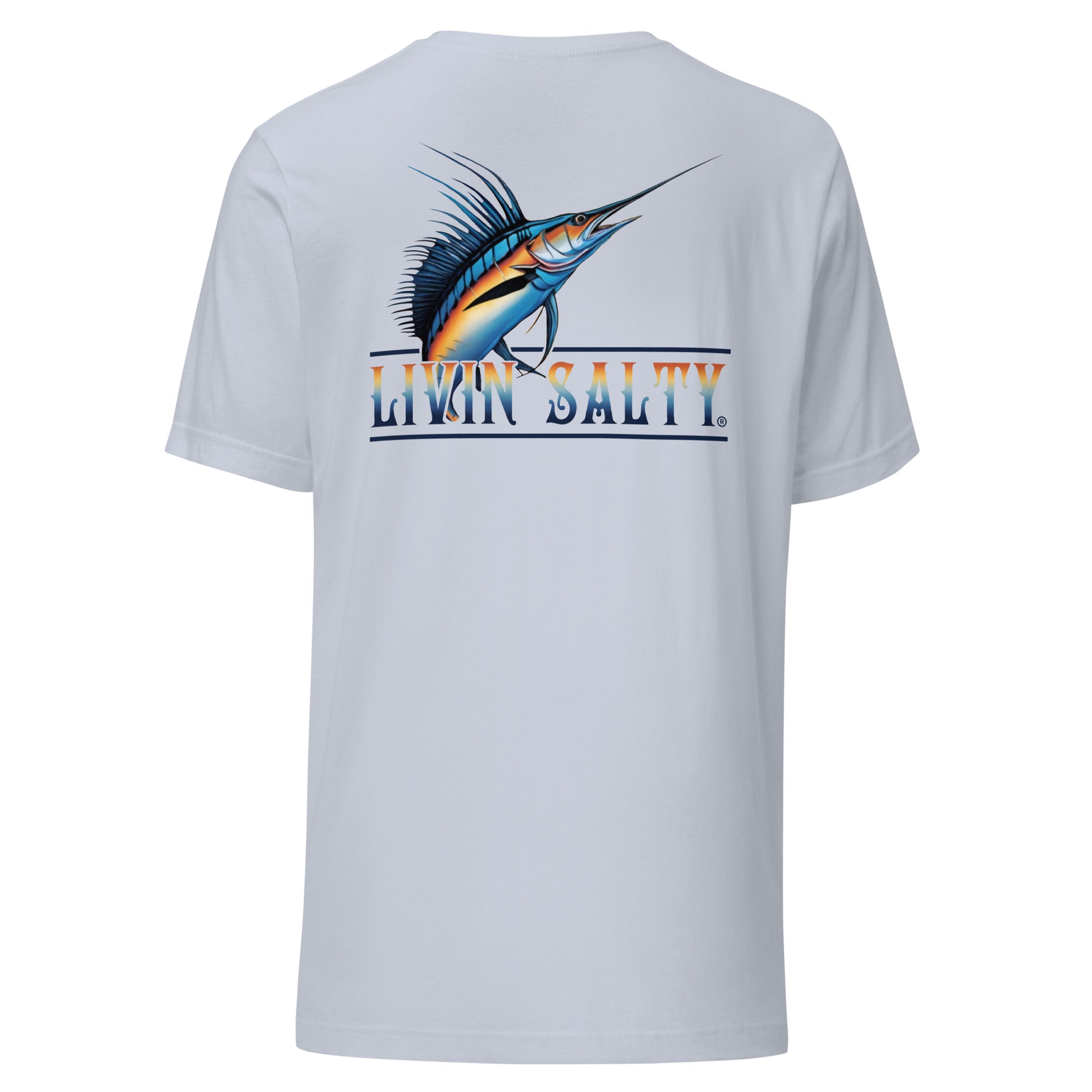 Featuring LIVIN SALTY across the chest, with LIVIN SALTY sailfish design on the back.