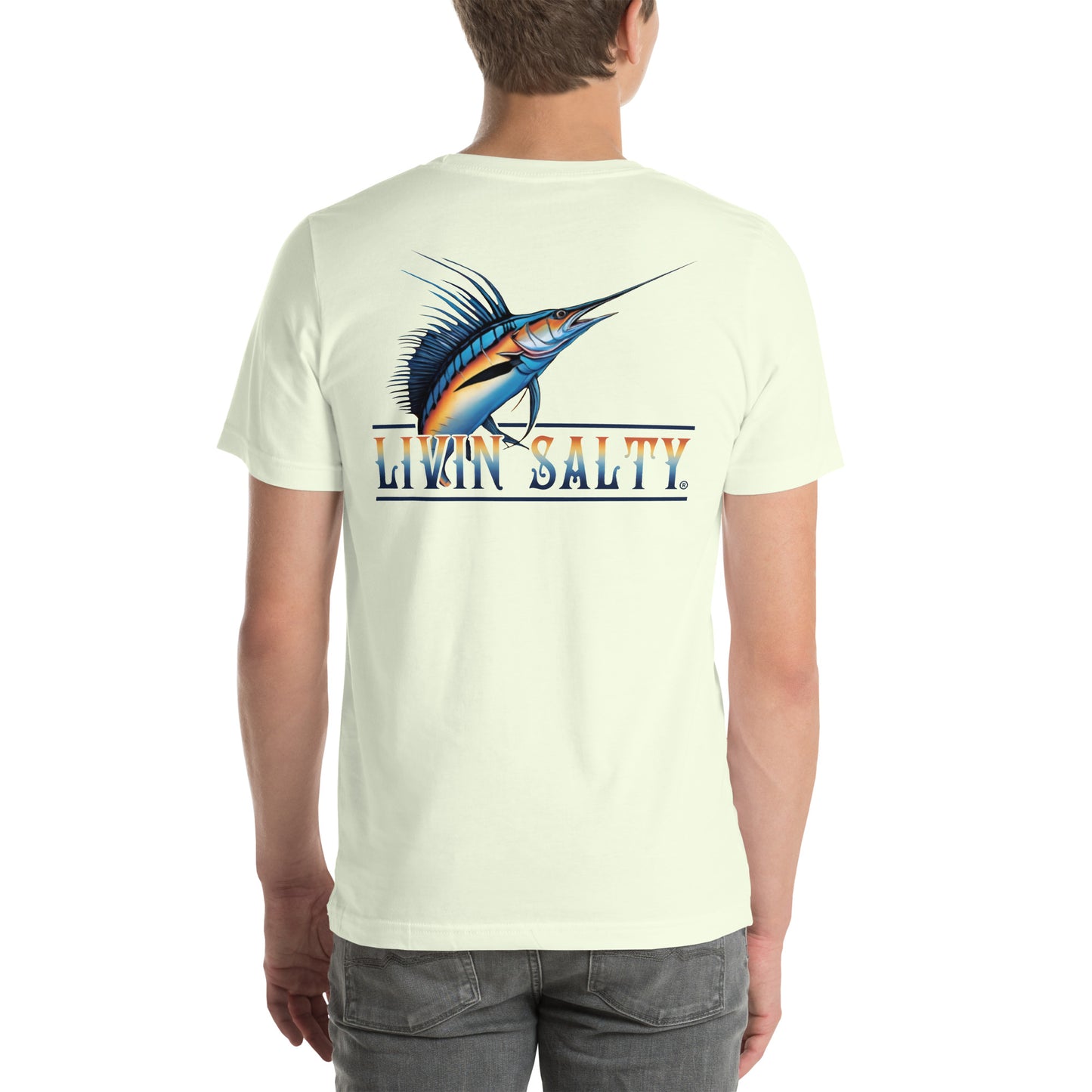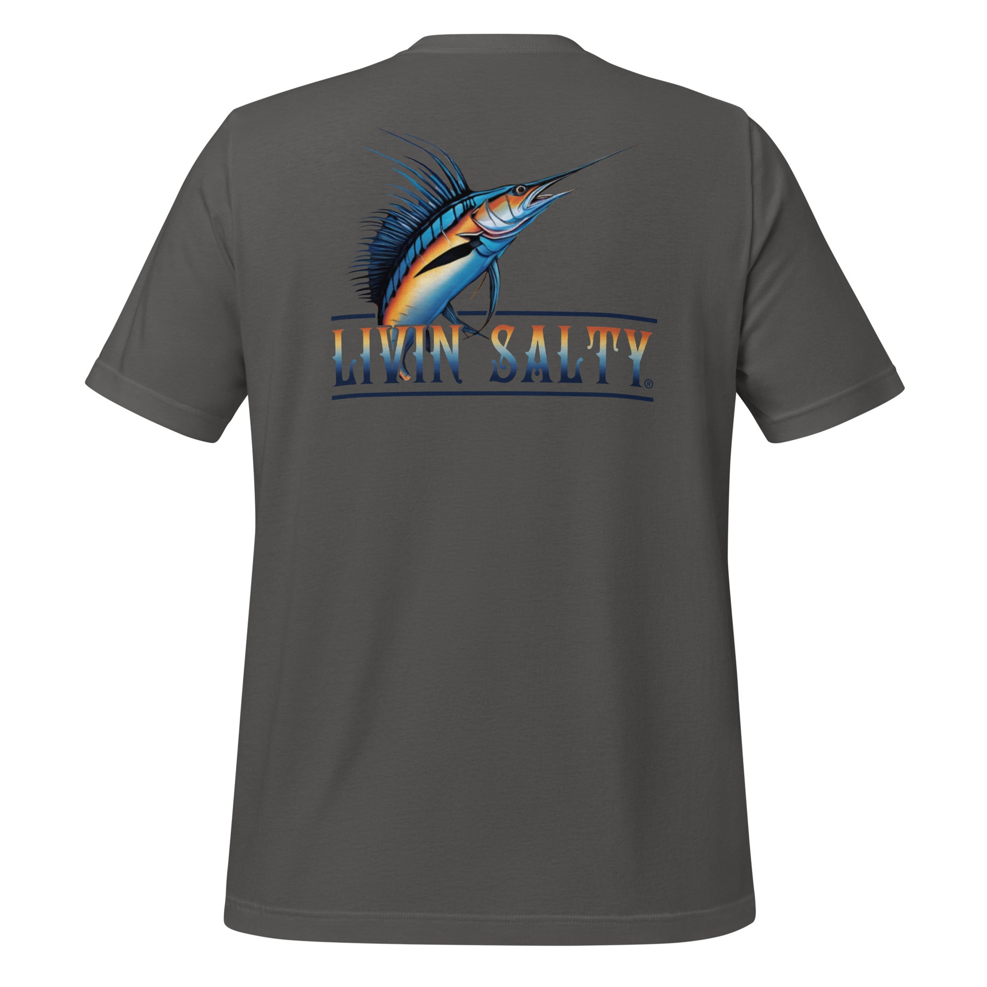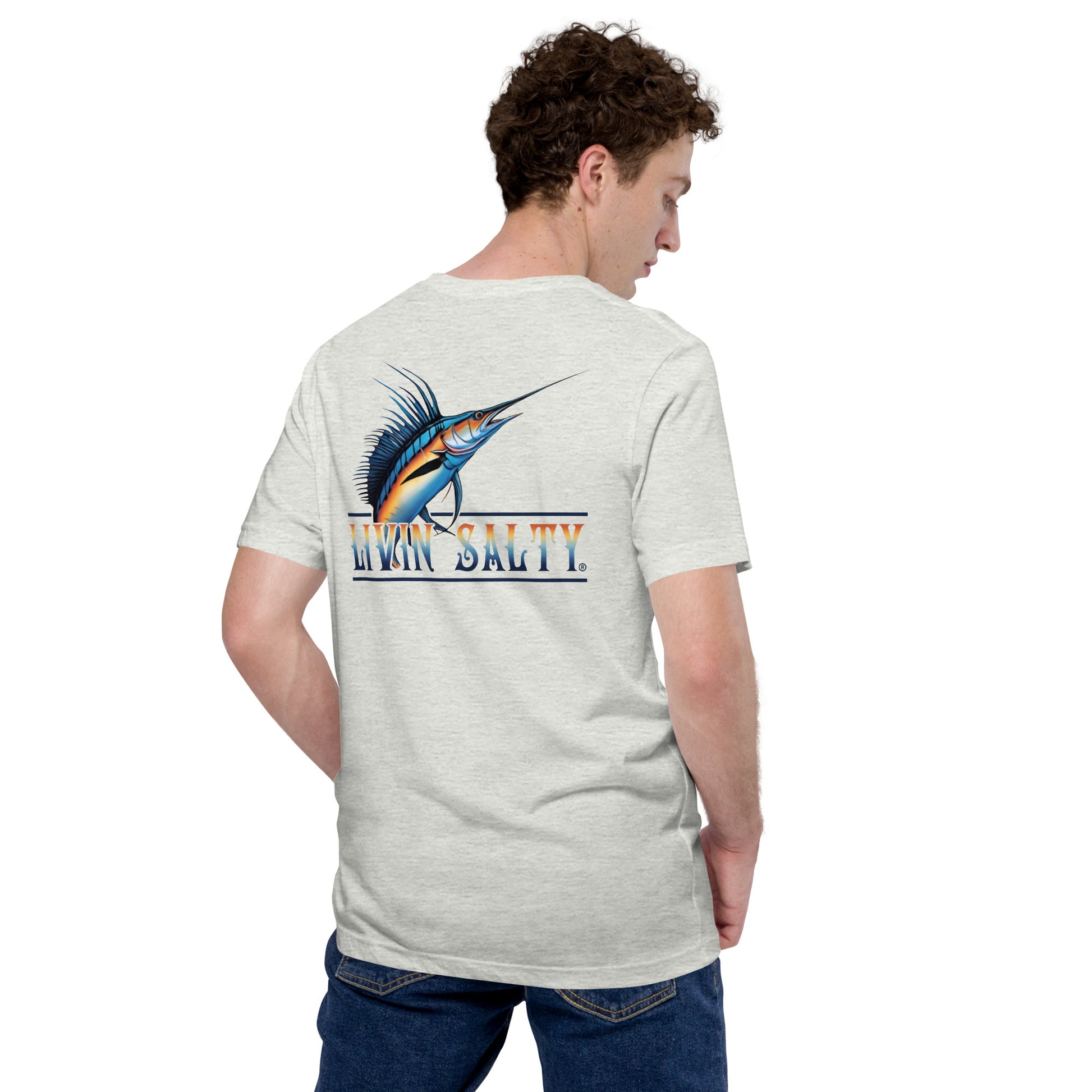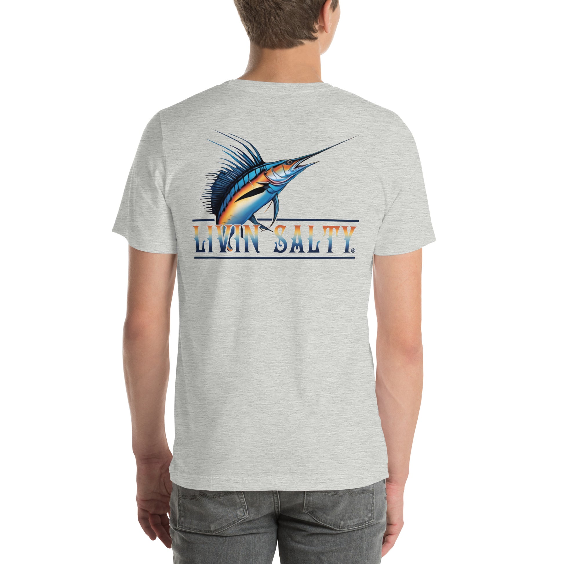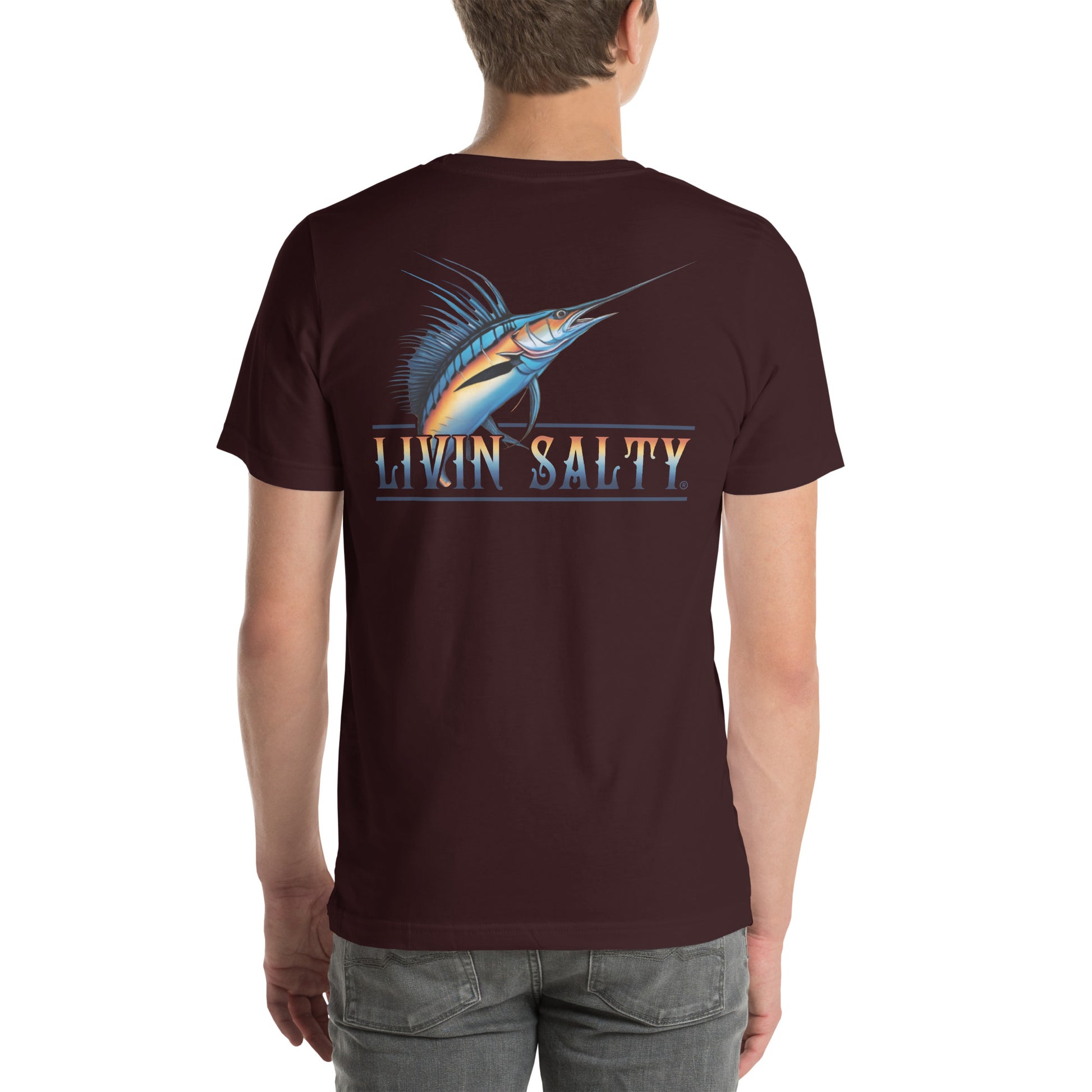 Featuring LIVIN SALTY across the chest, with LIVIN SALTY sailfish design on the back.