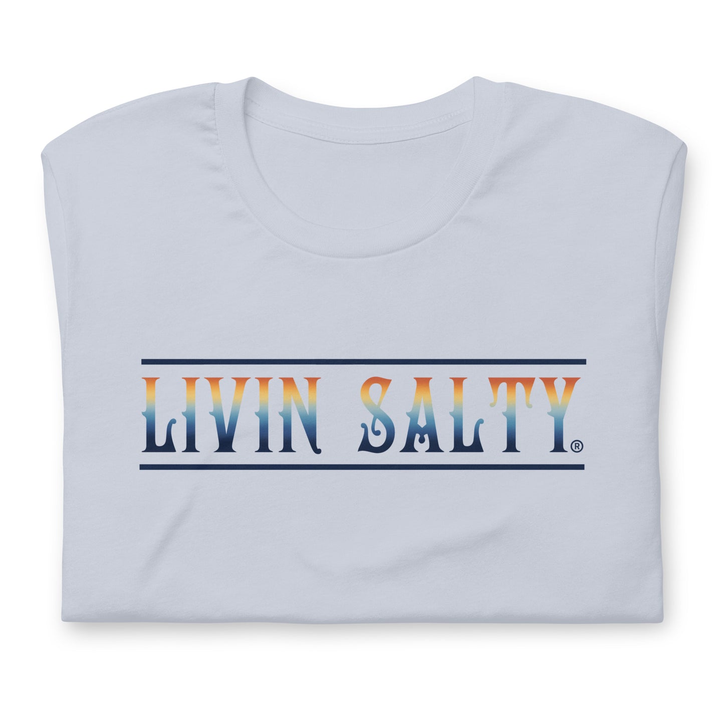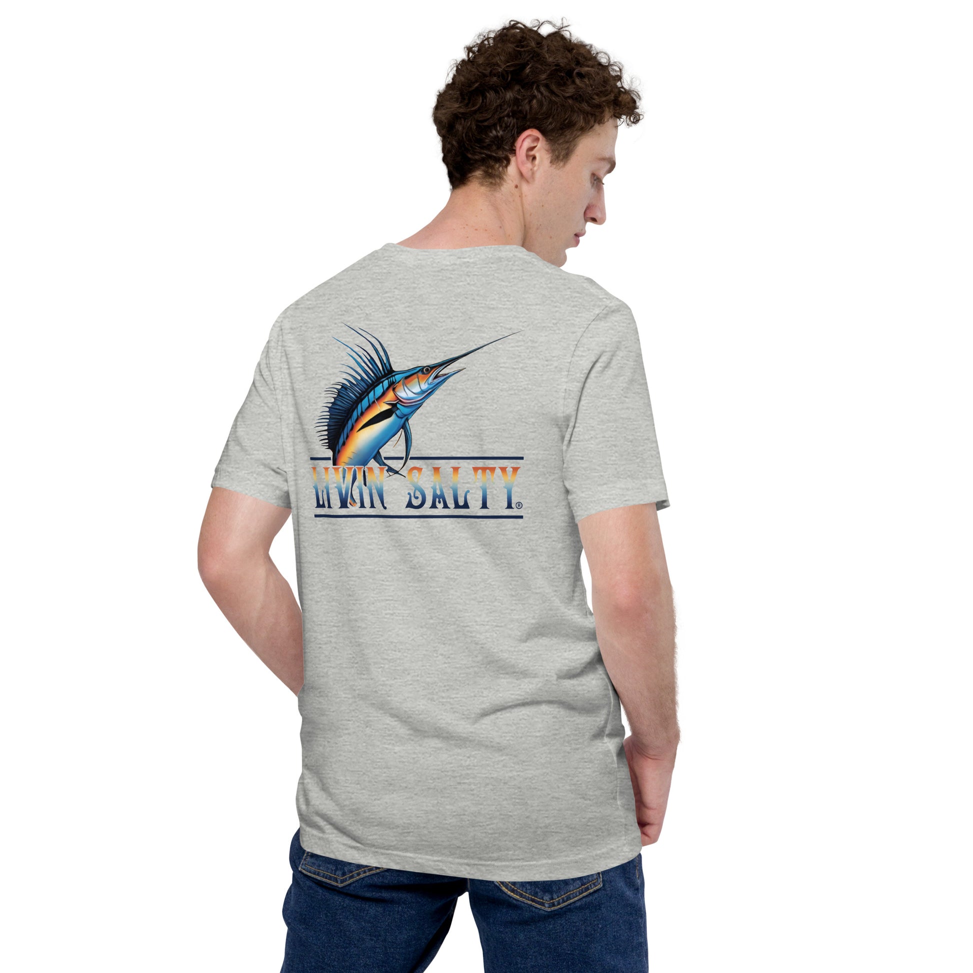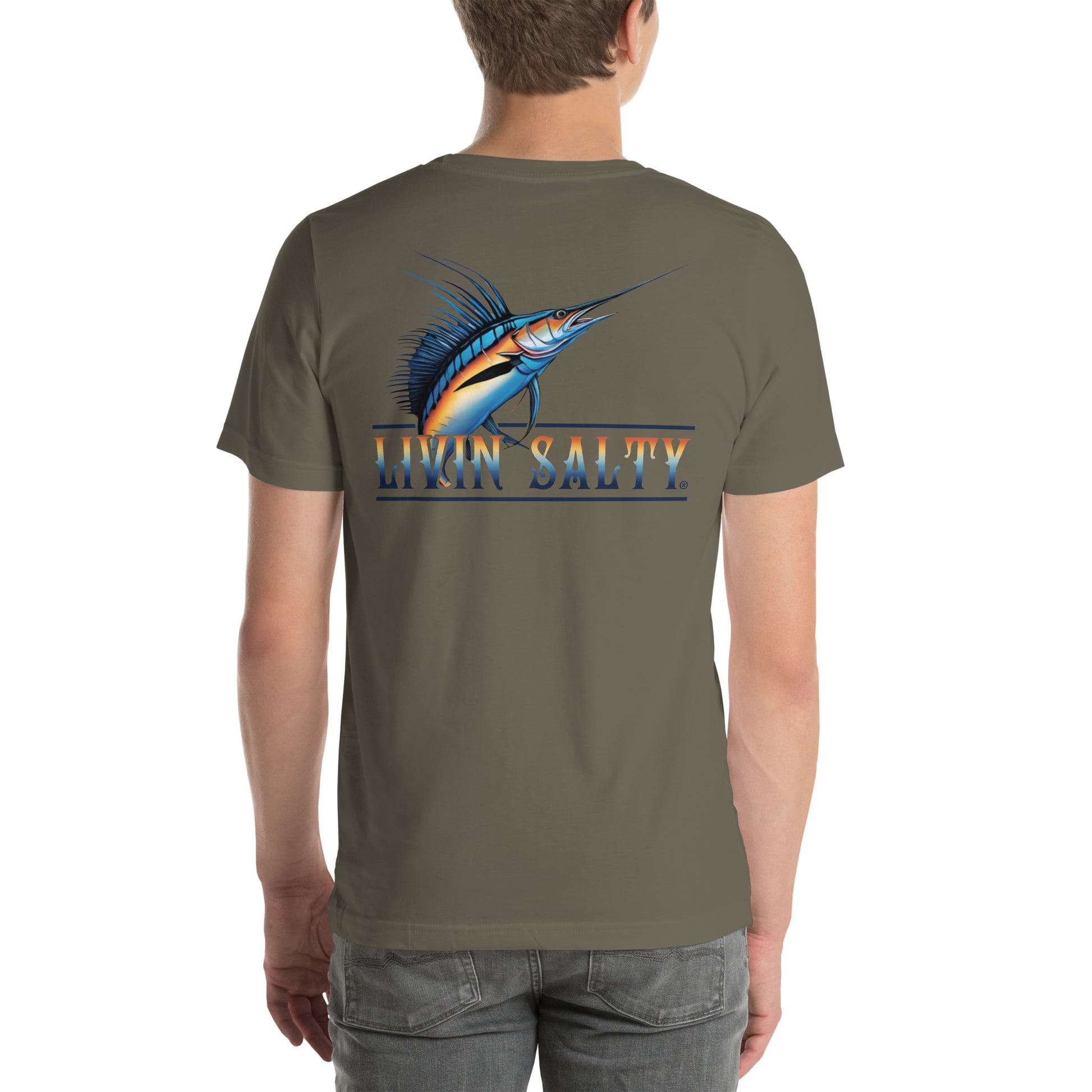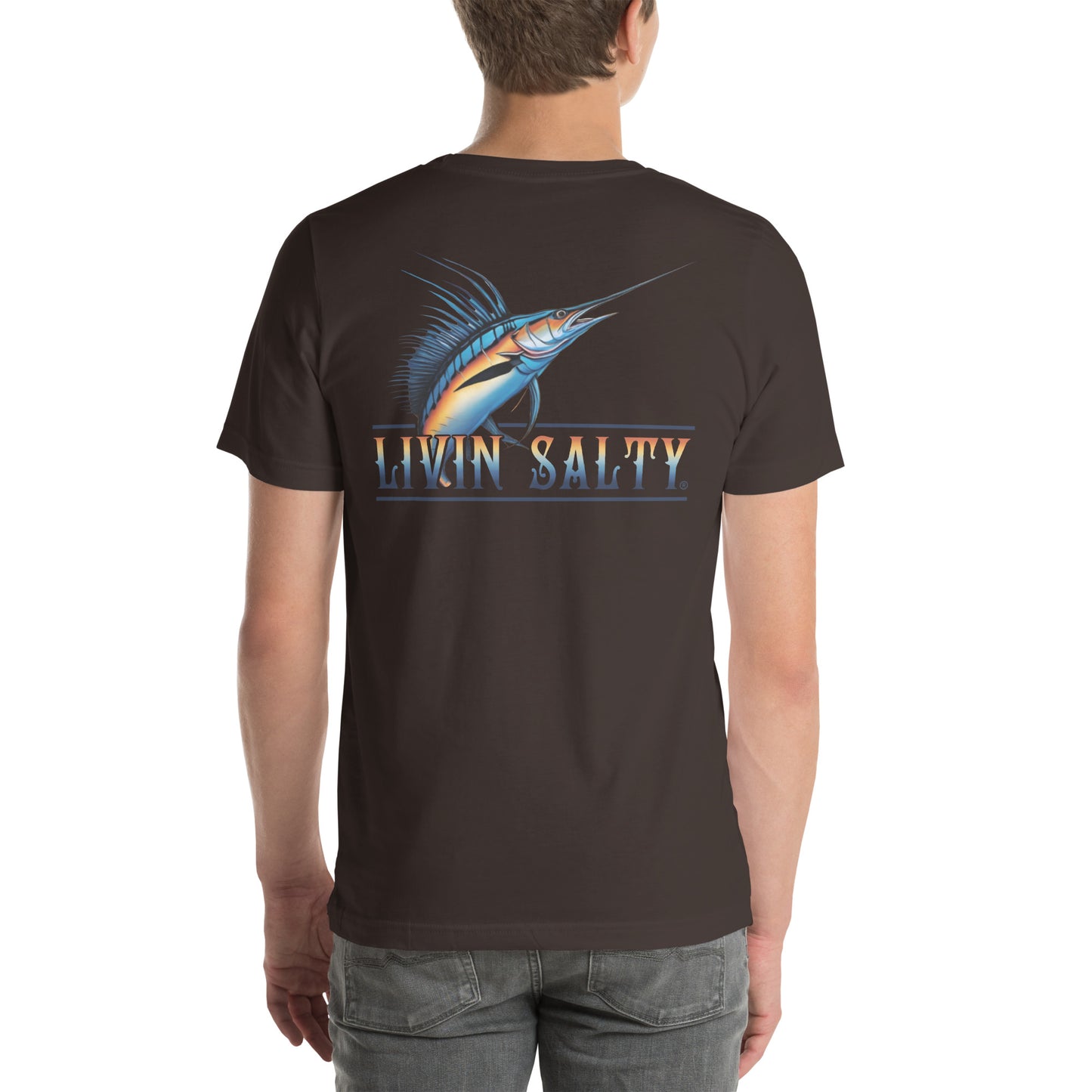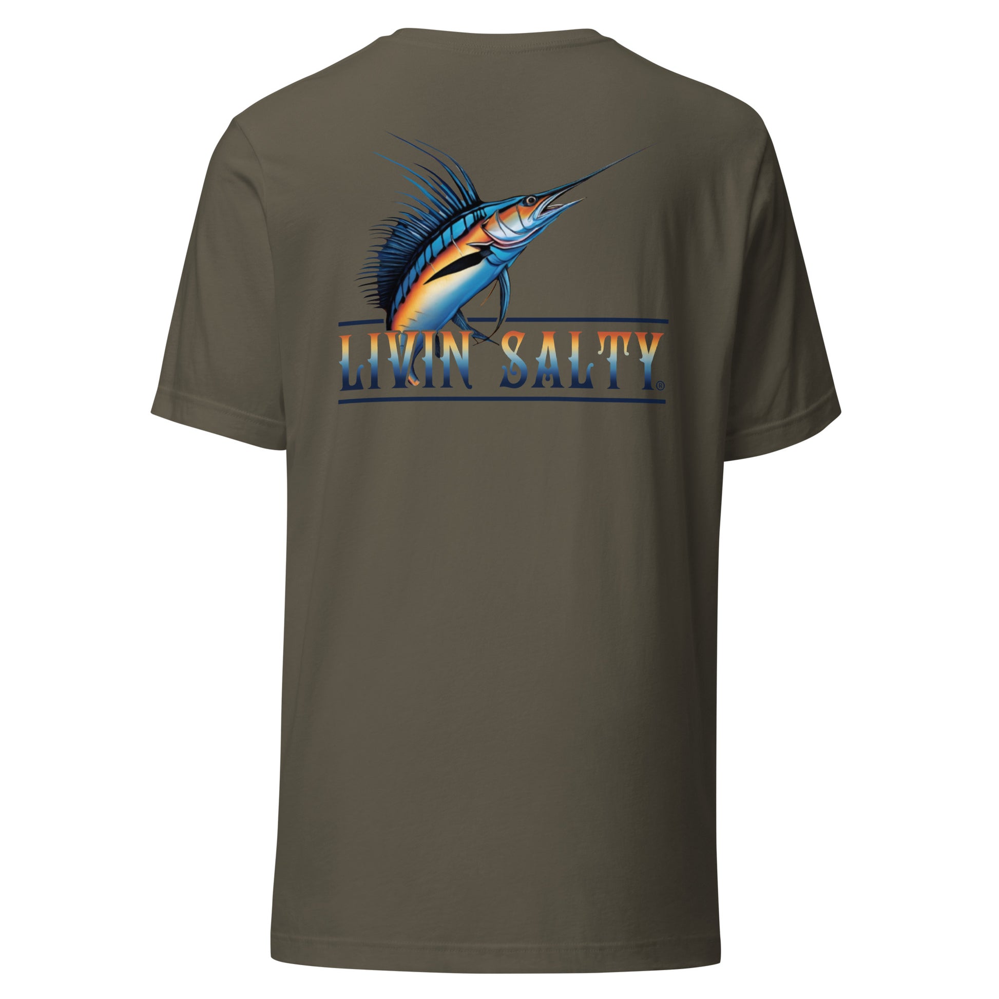 Featuring LIVIN SALTY across the chest, with LIVIN SALTY sailfish design on the back.