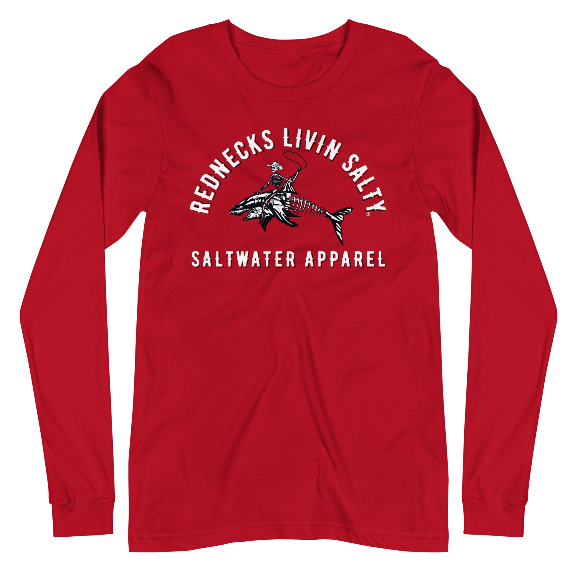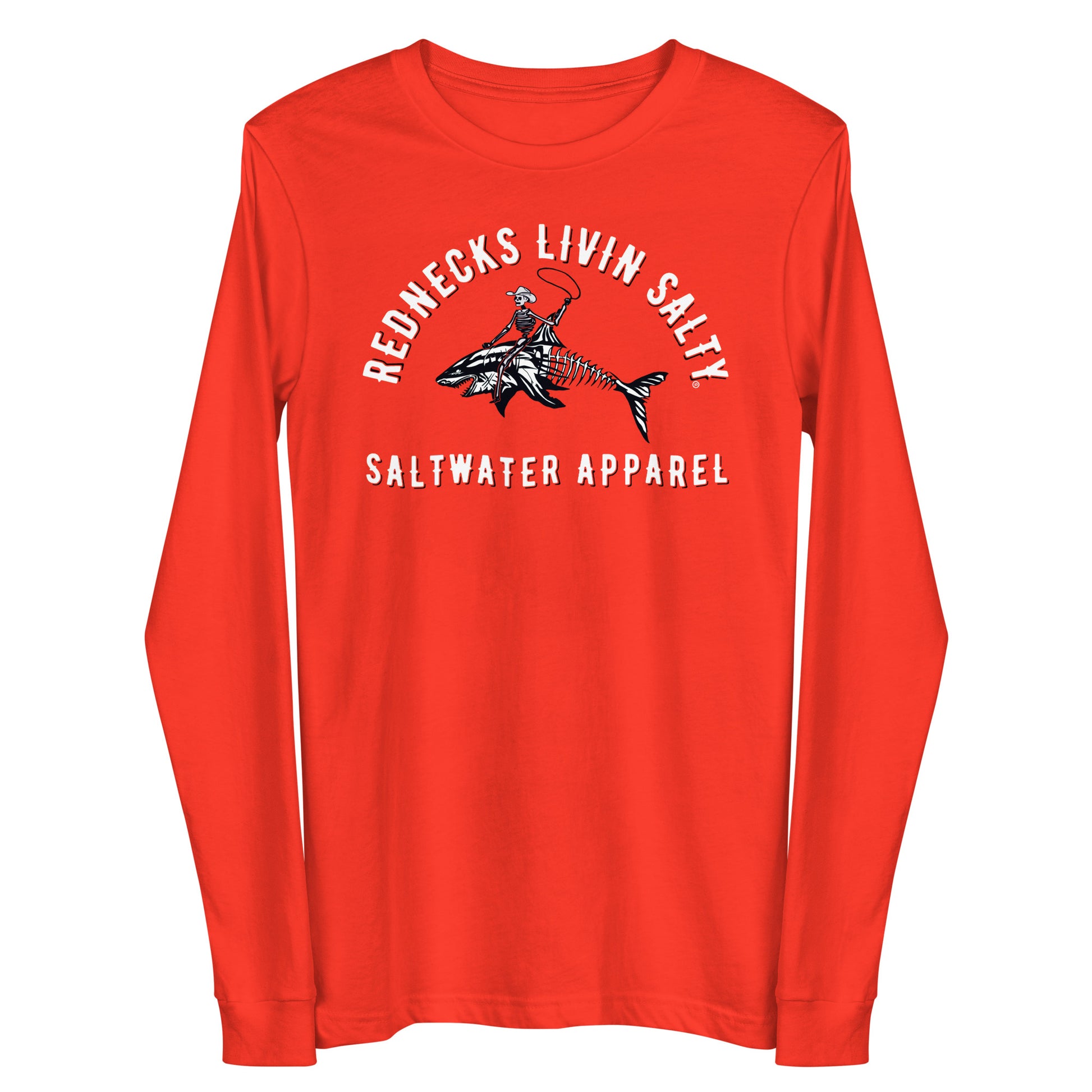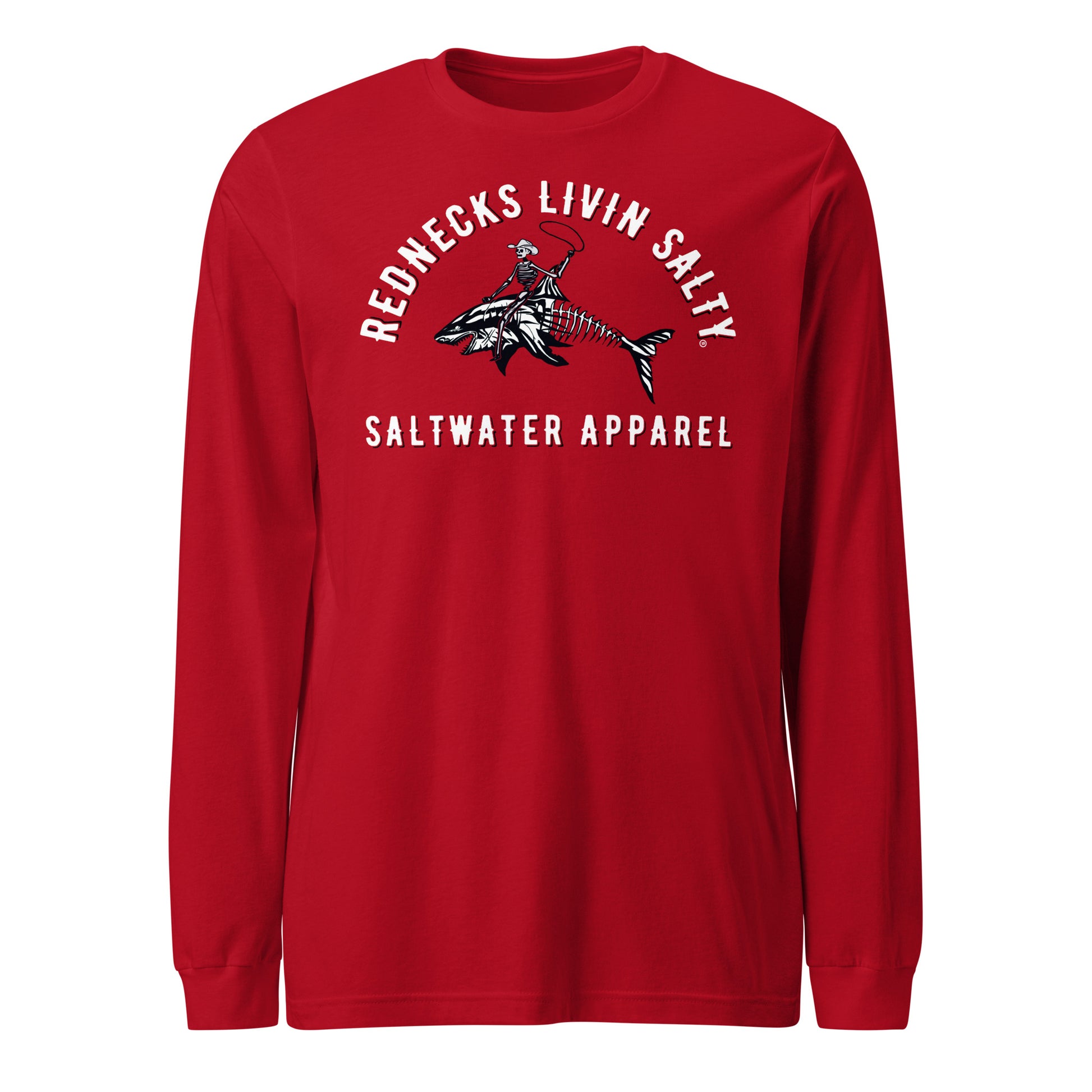 Featuring this long sleeve cotton shirt with a front only print. Designed with a black and white of a skeleton cowboy riding a skeleton shark.
