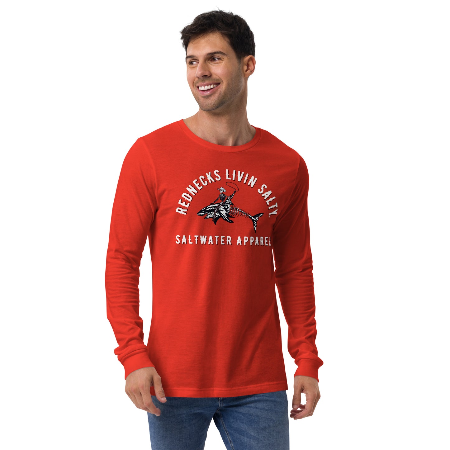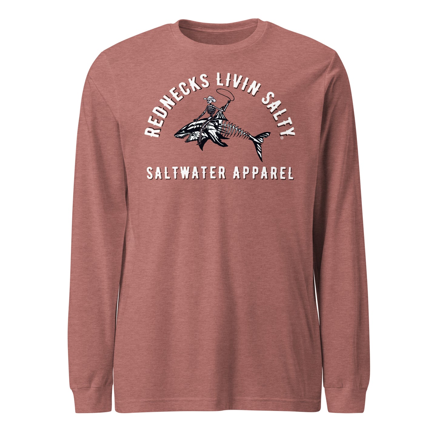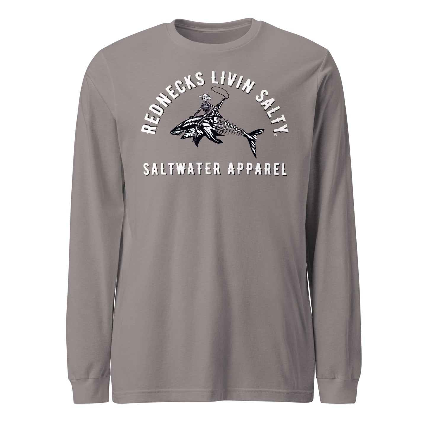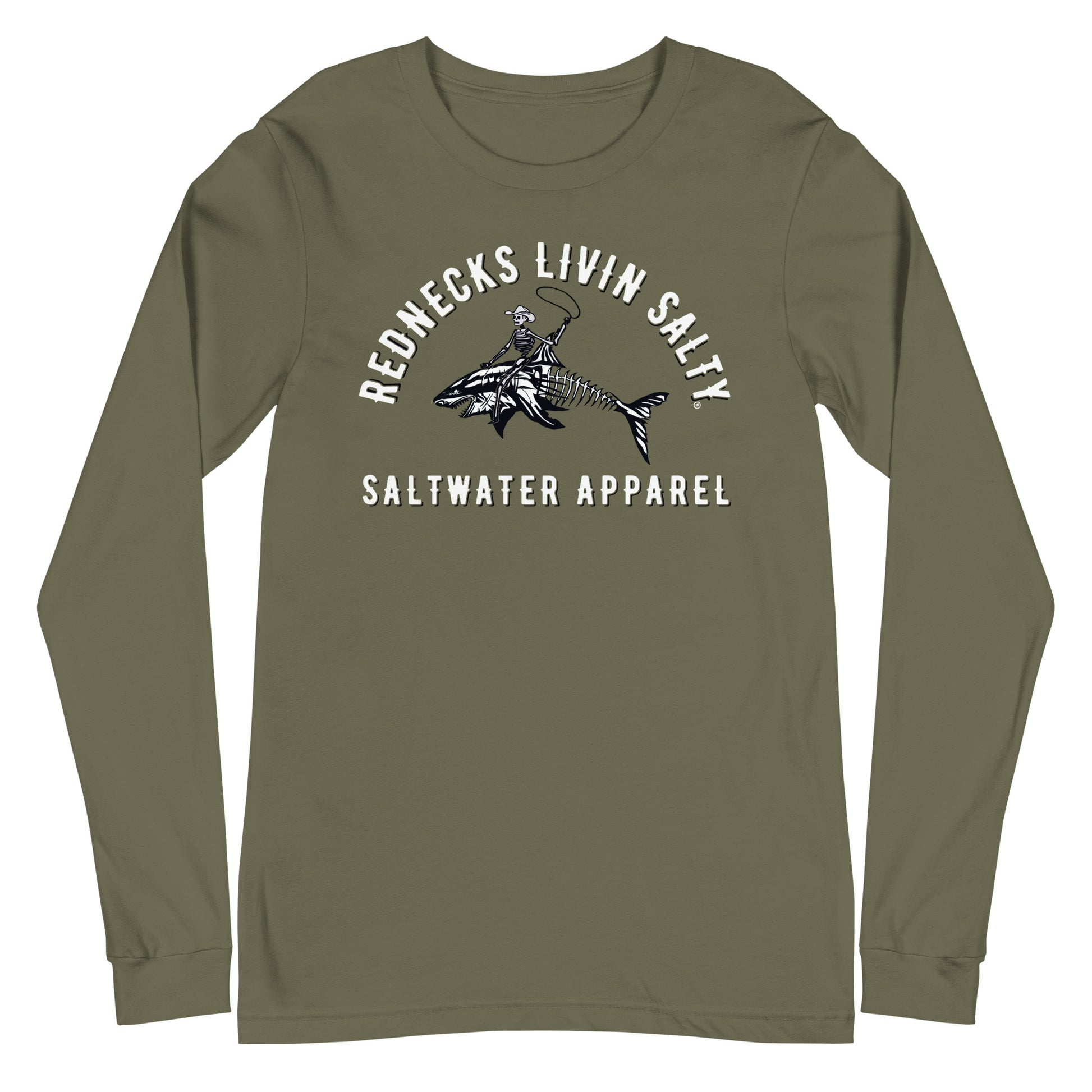 Featuring this long sleeve cotton shirt with a front only print. Designed with a black and white of a skeleton cowboy riding a skeleton shark.