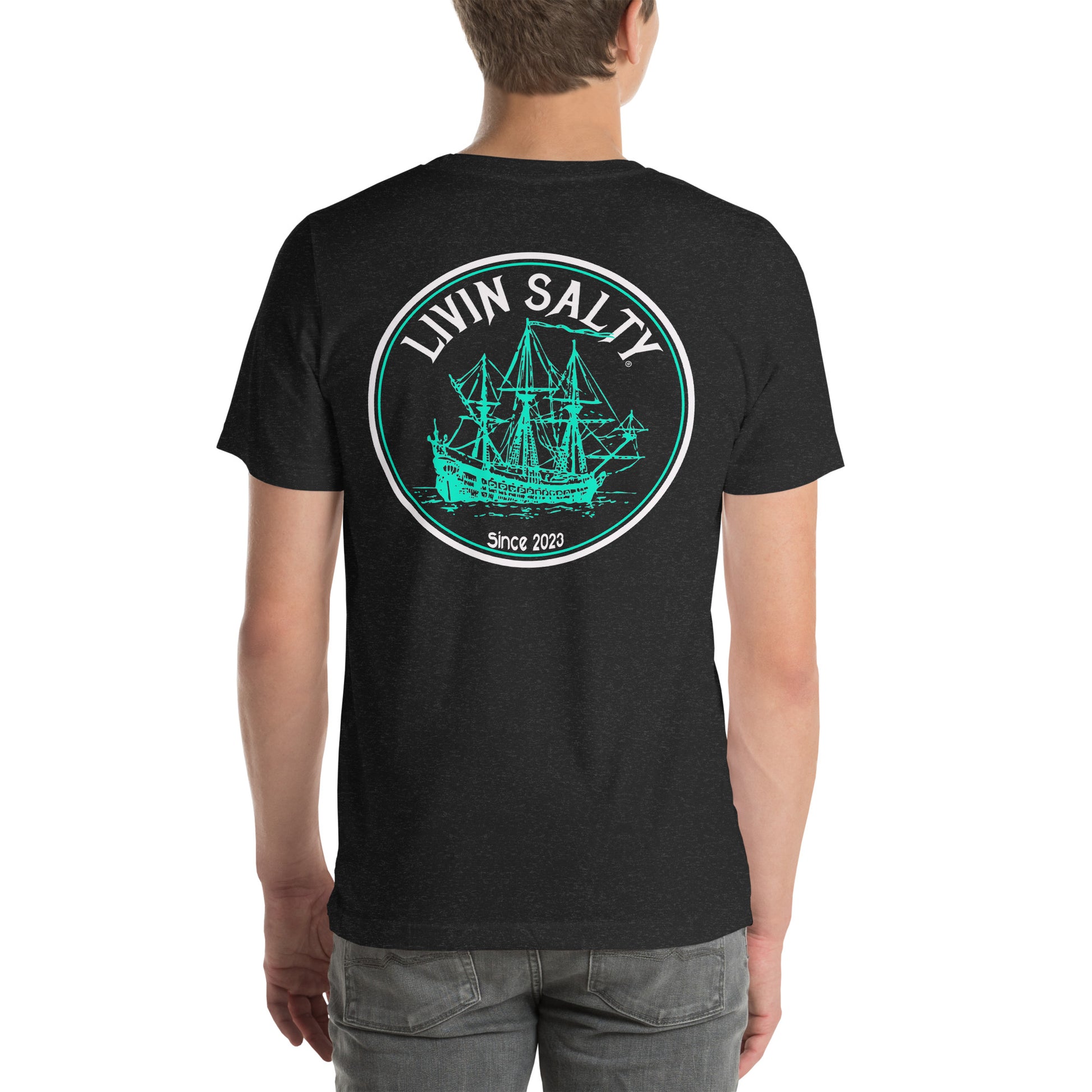 Featuring LIVIN SALTY ship logo on left chest, with LIVIN SALTY ship design on the back.