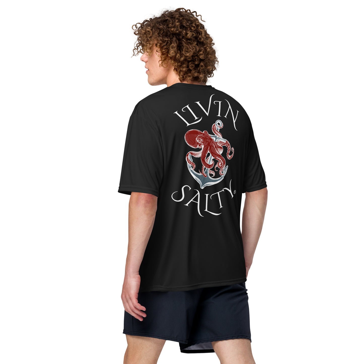 Featuring this design with LIVIN SALTY on front left chest, and an octopus wrapped around an anchor design.
