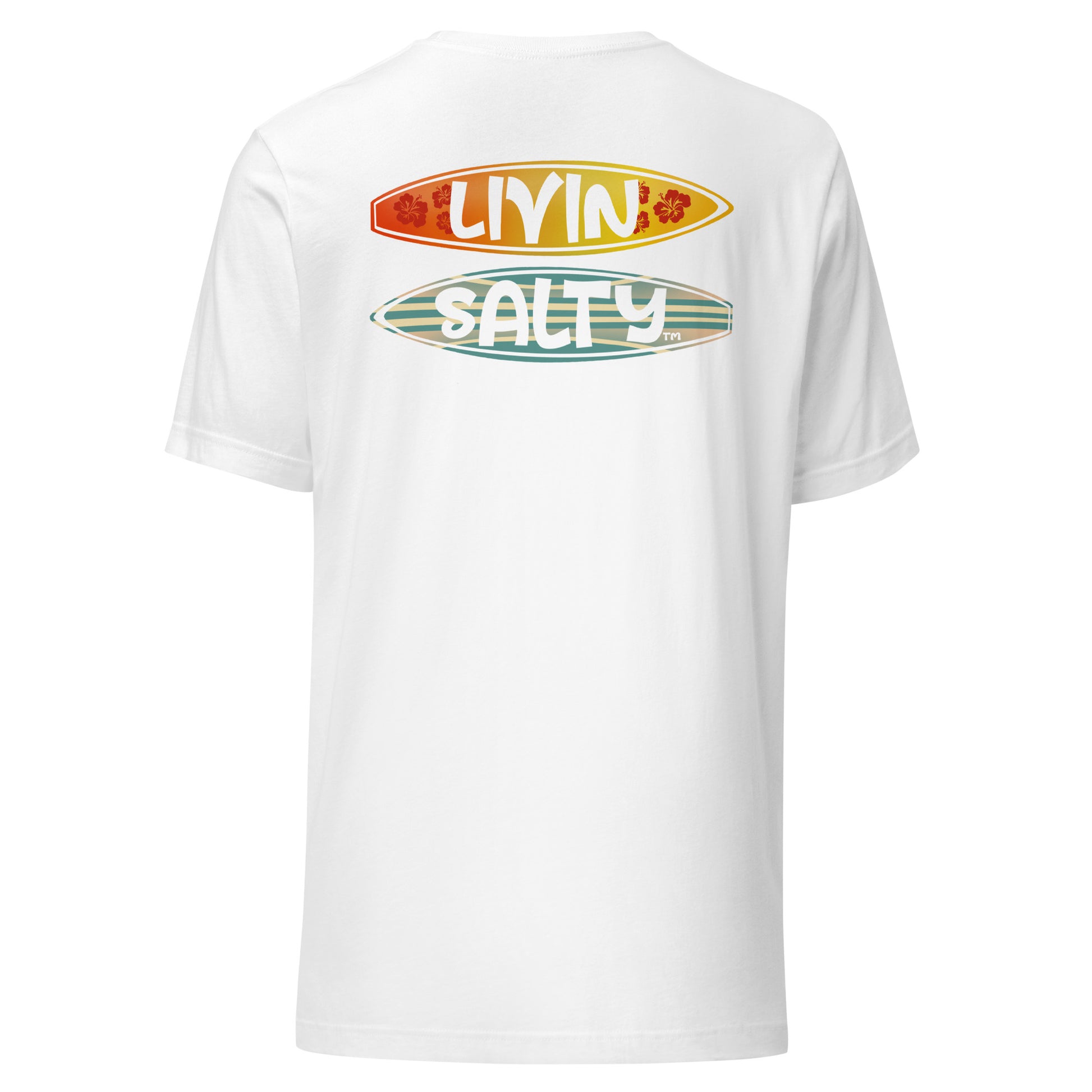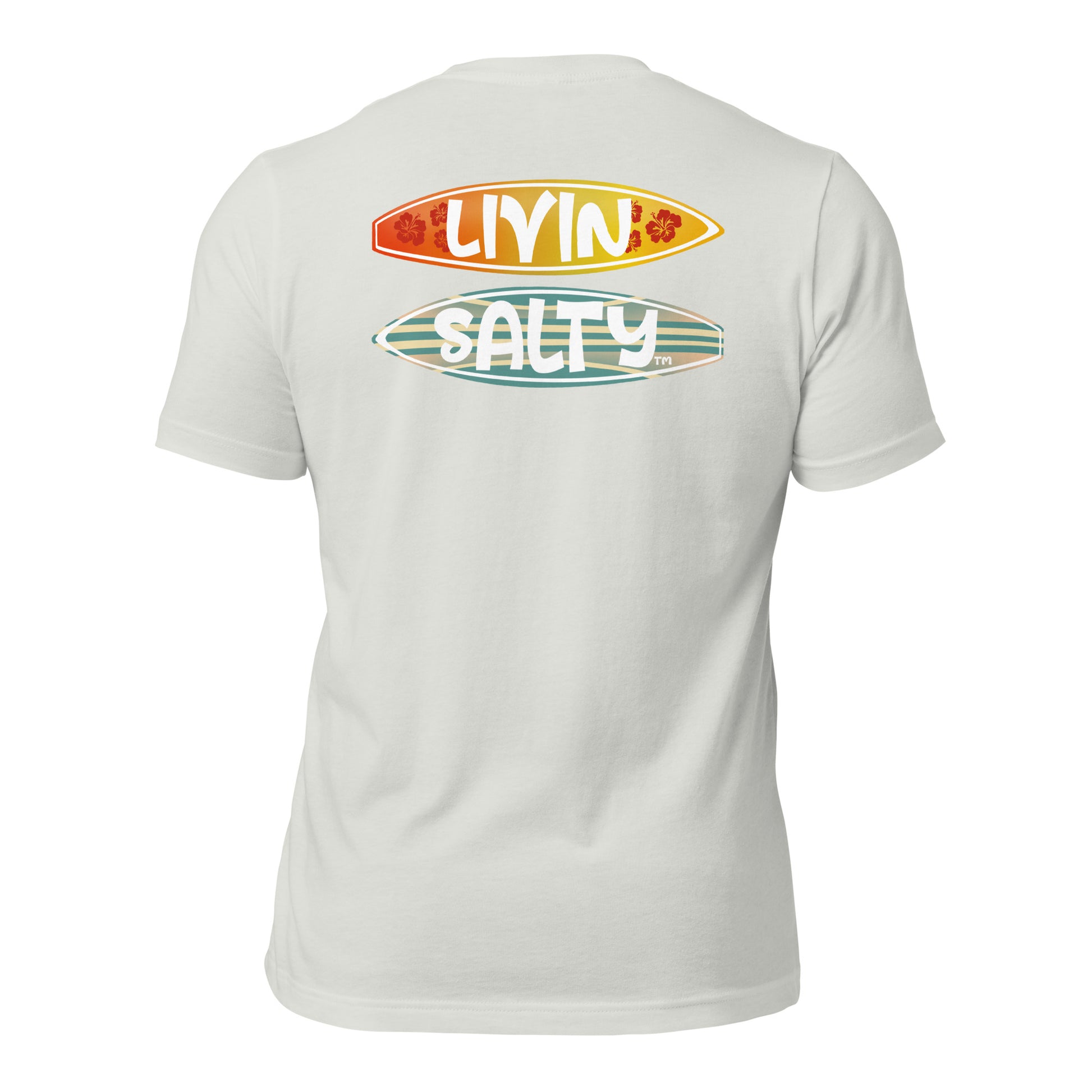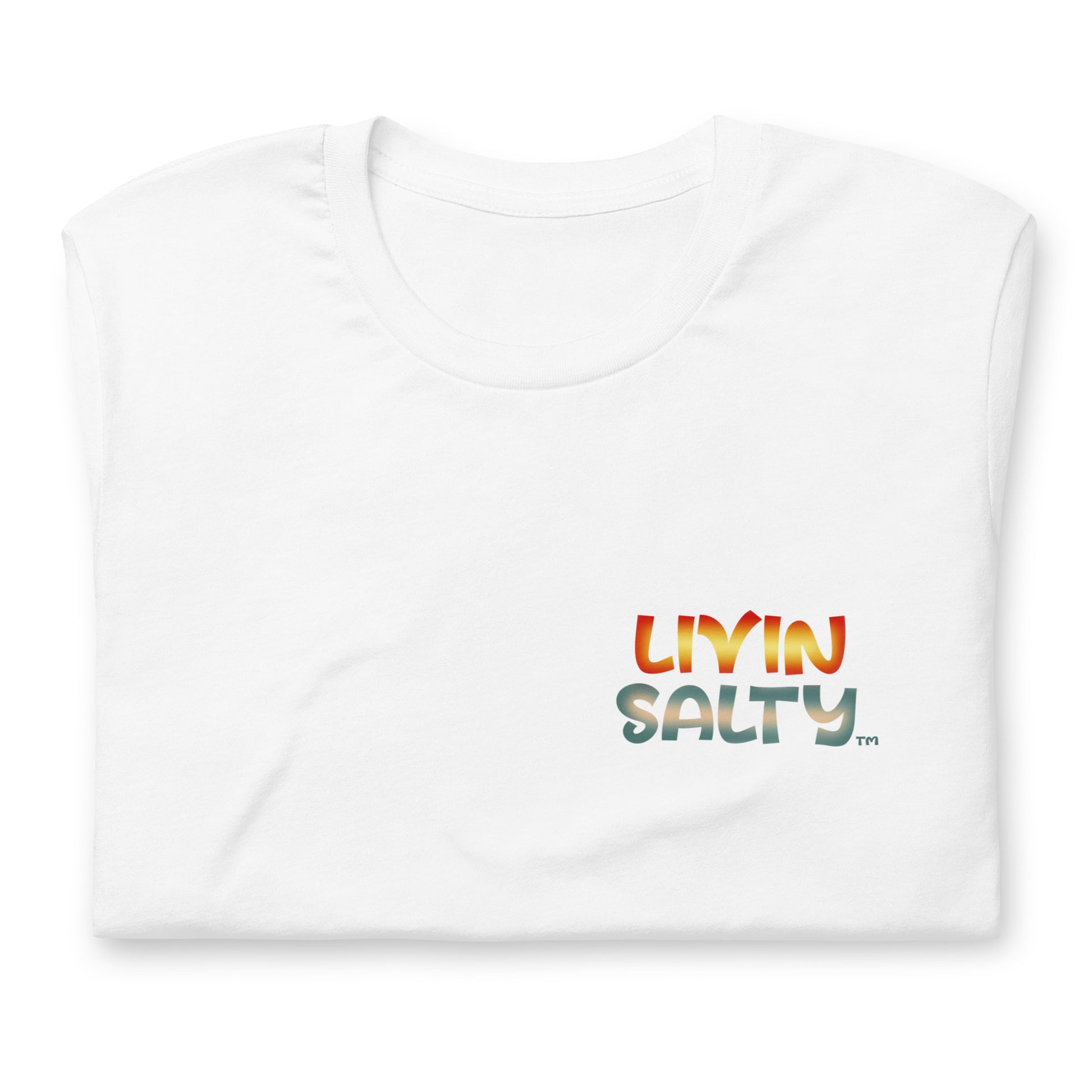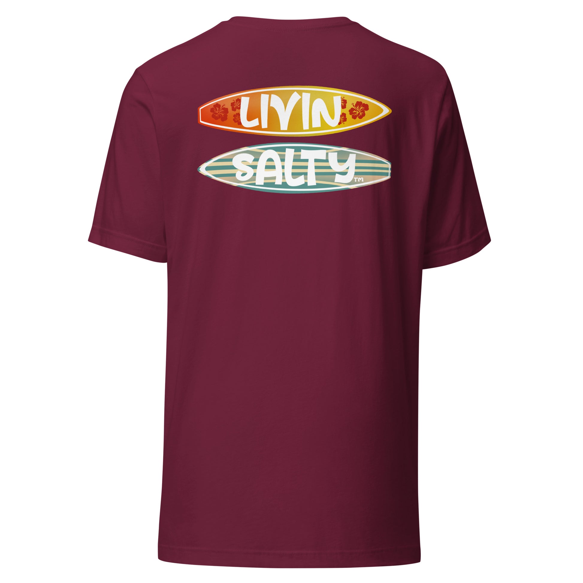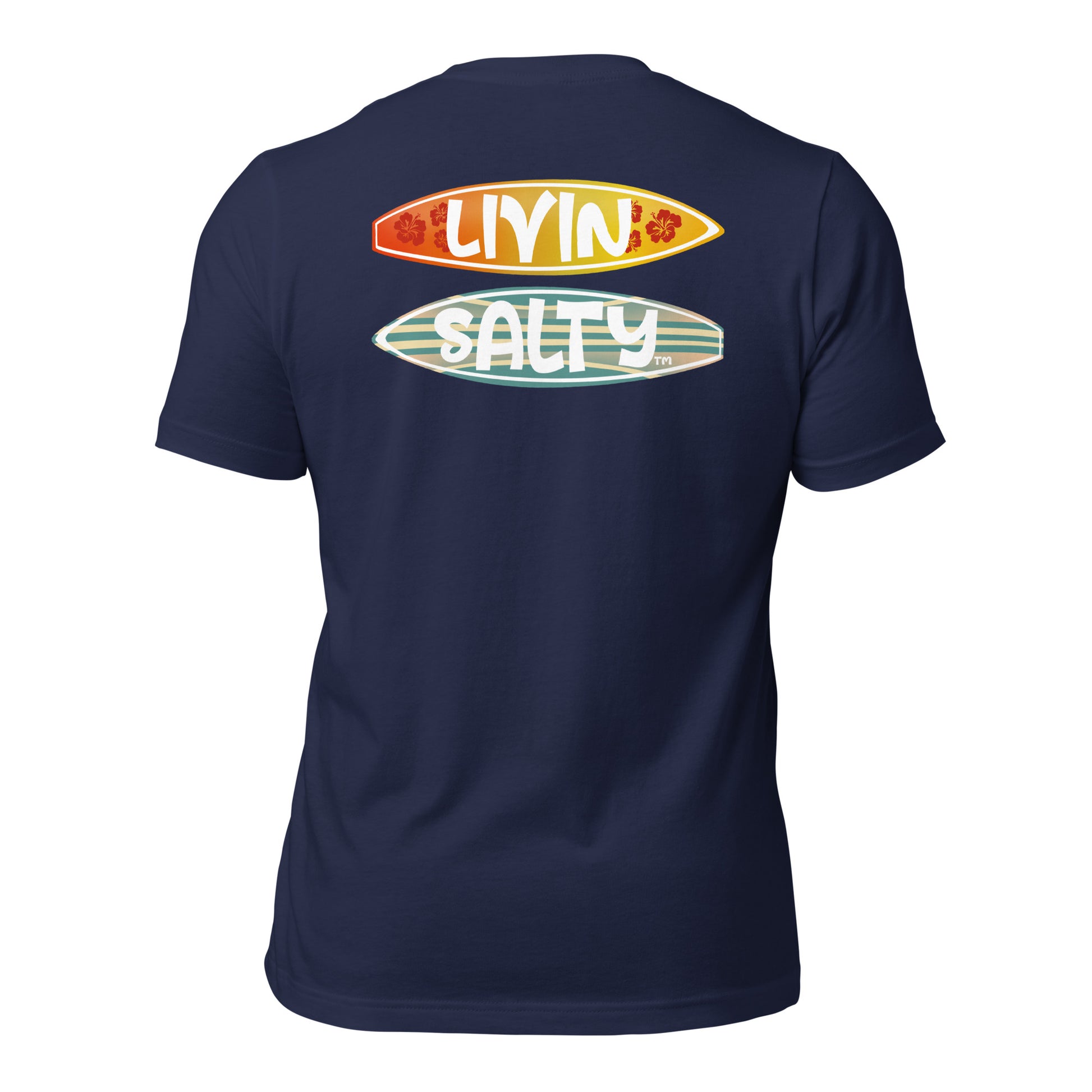 Featuring front left chest LIVIN SALTY with LIVIN SALTY surf board design on the back.