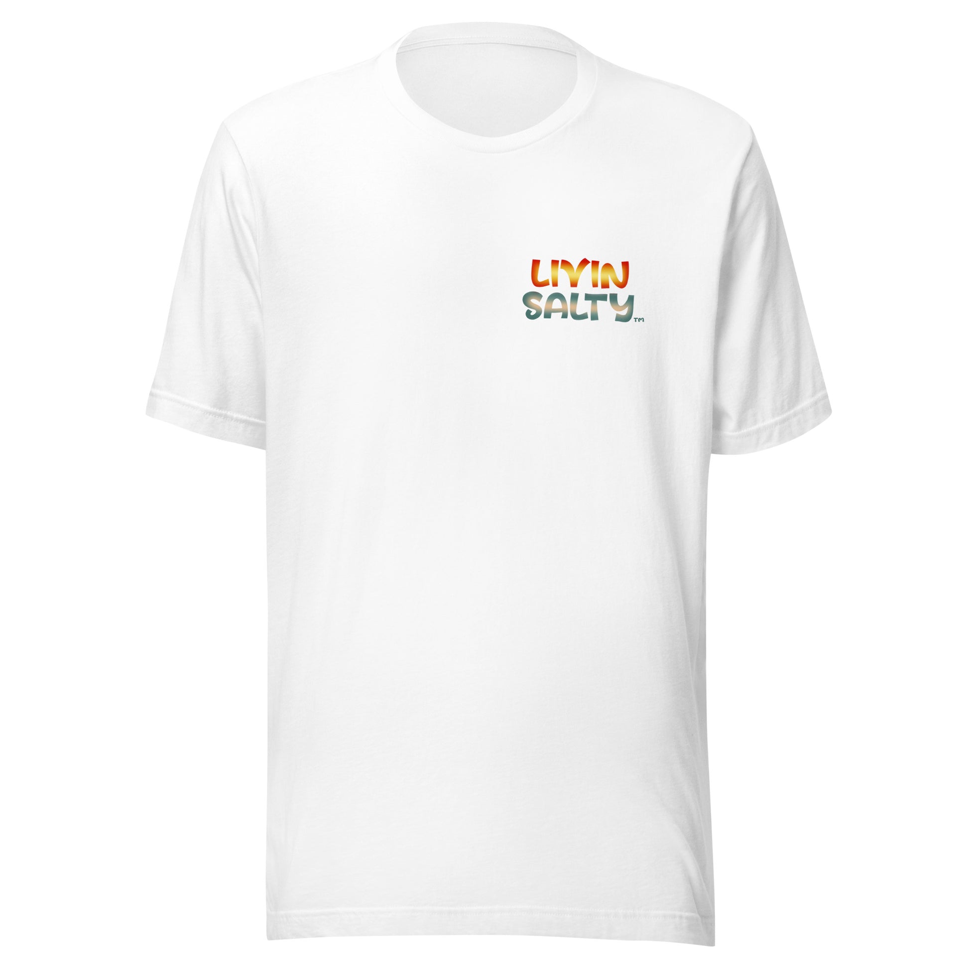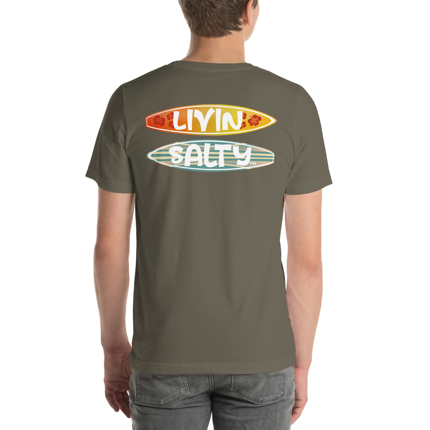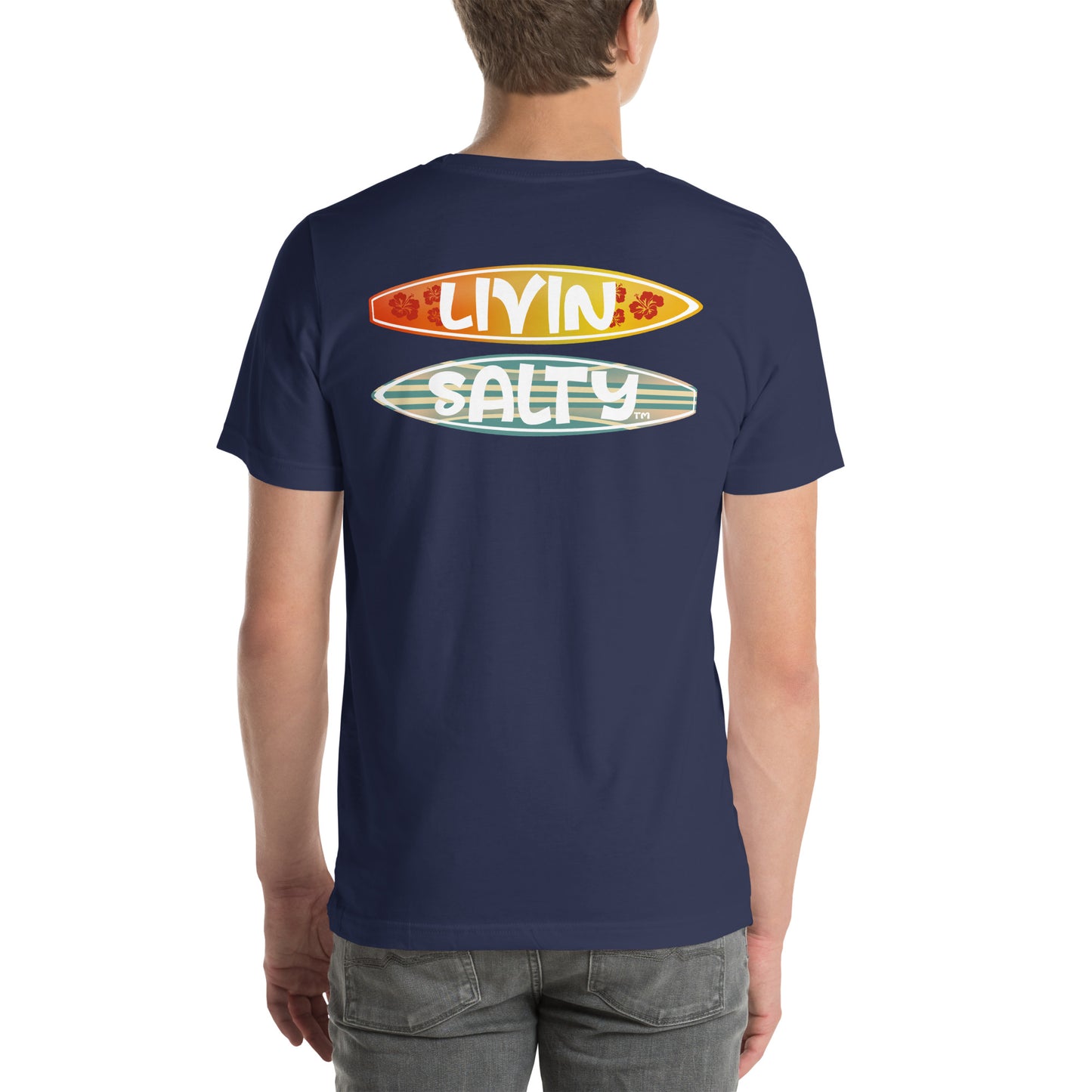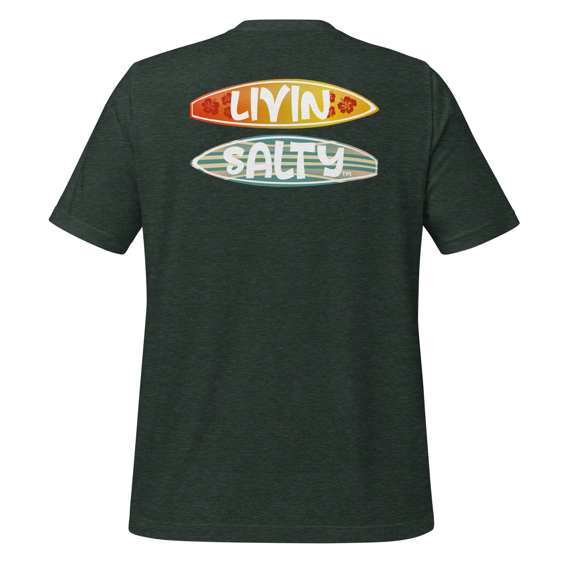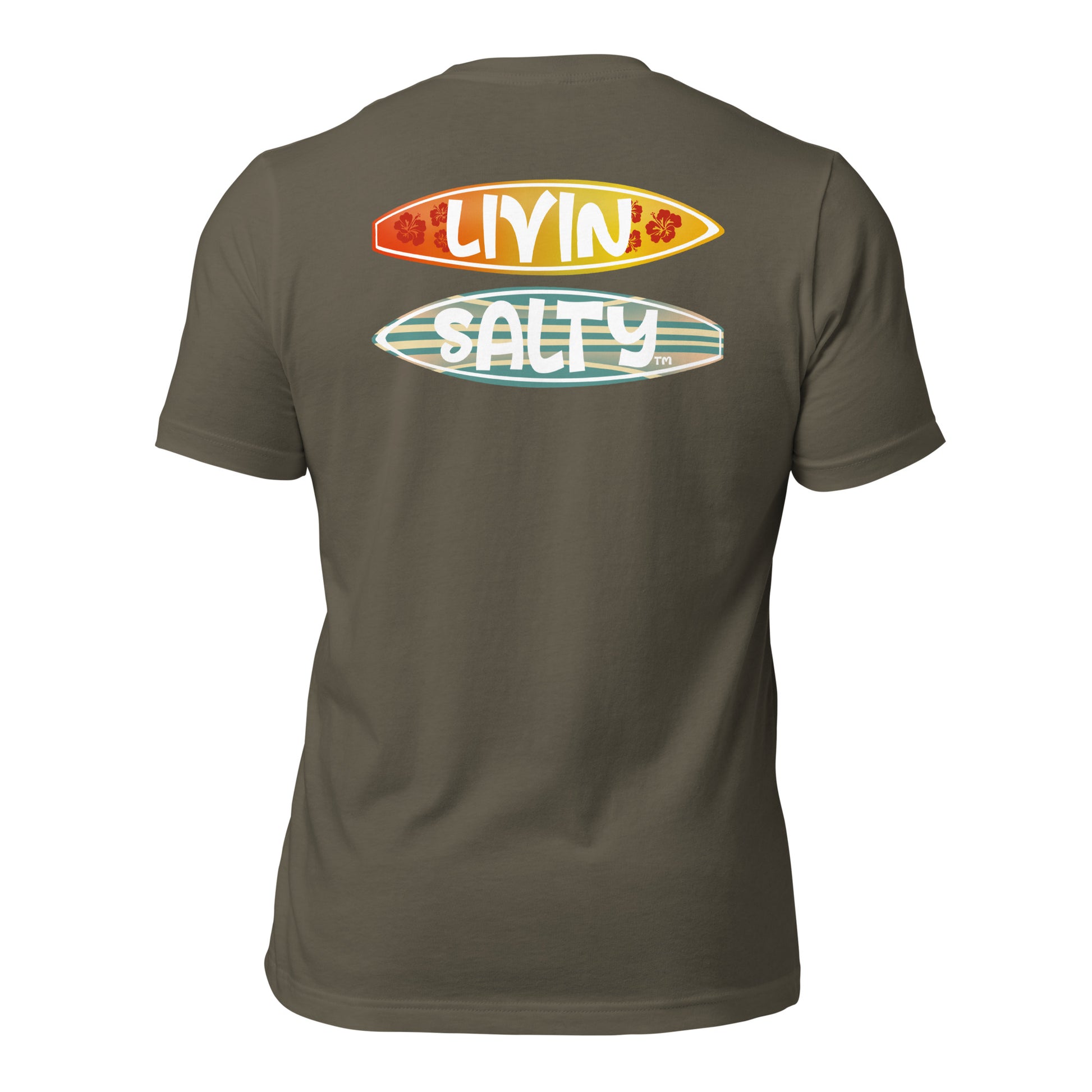 Featuring front left chest LIVIN SALTY with LIVIN SALTY surf board design on the back.