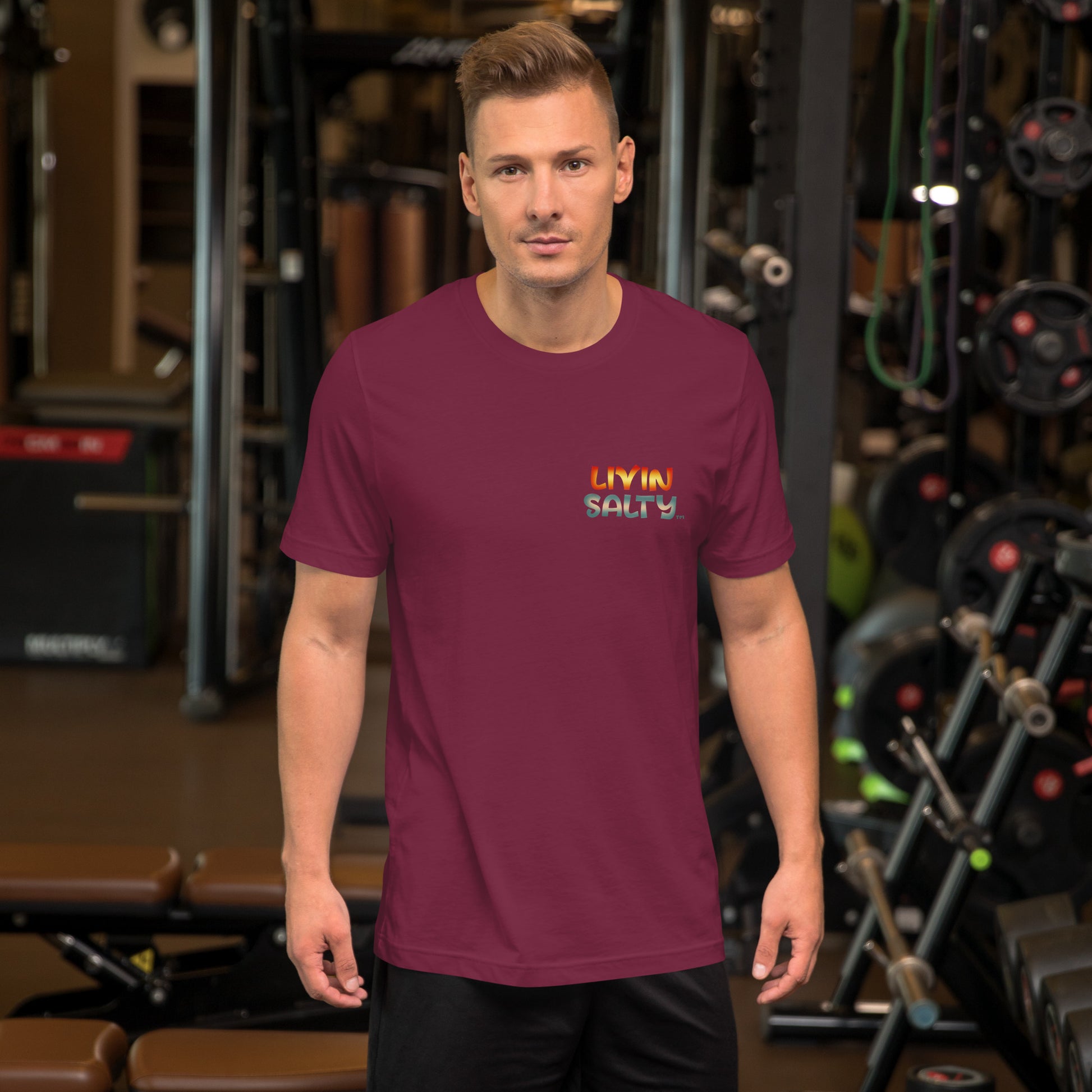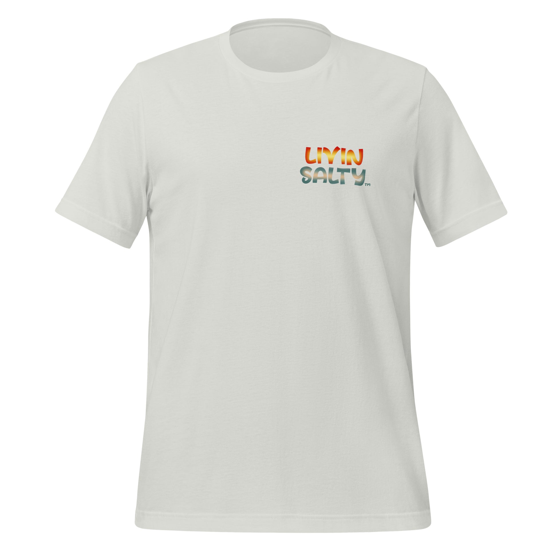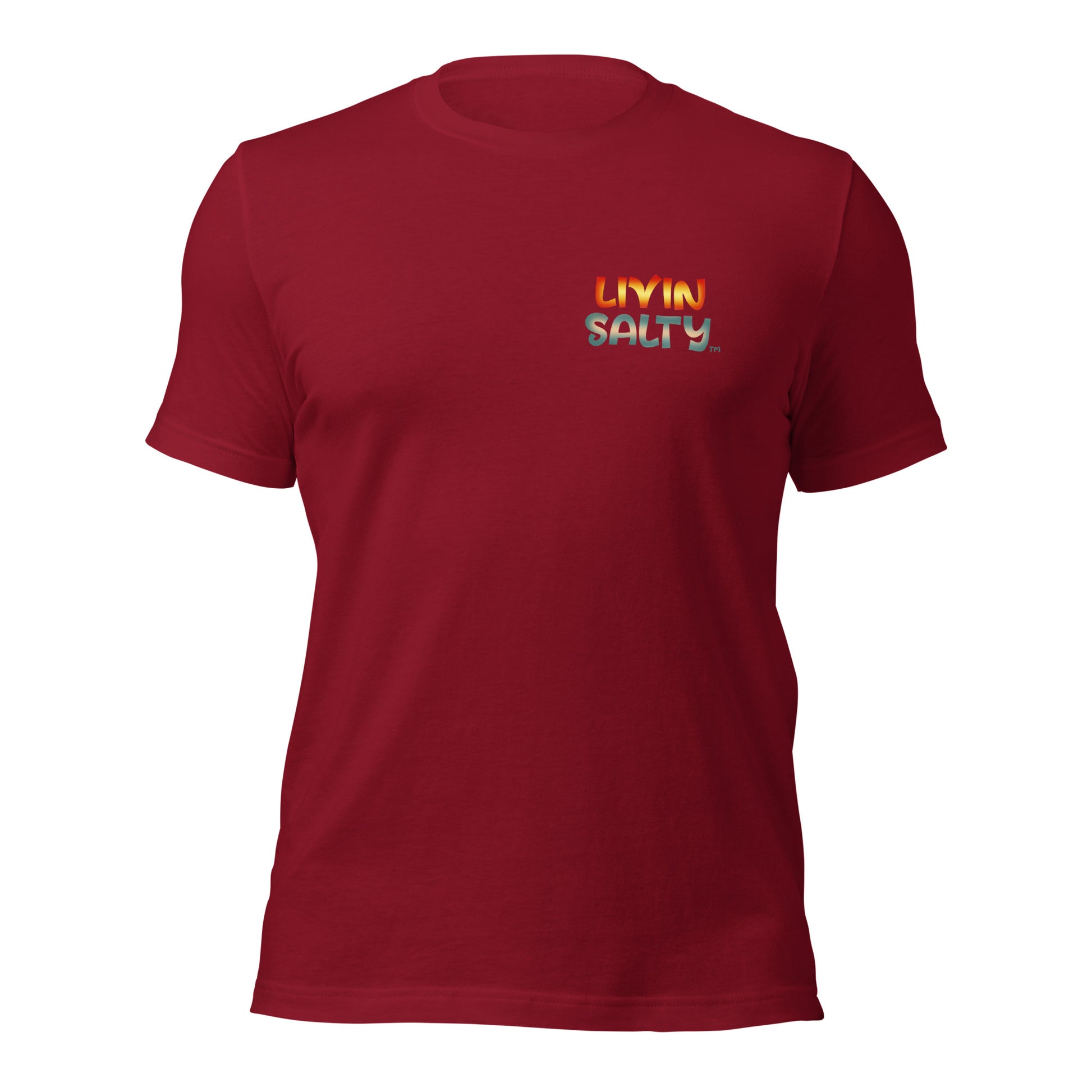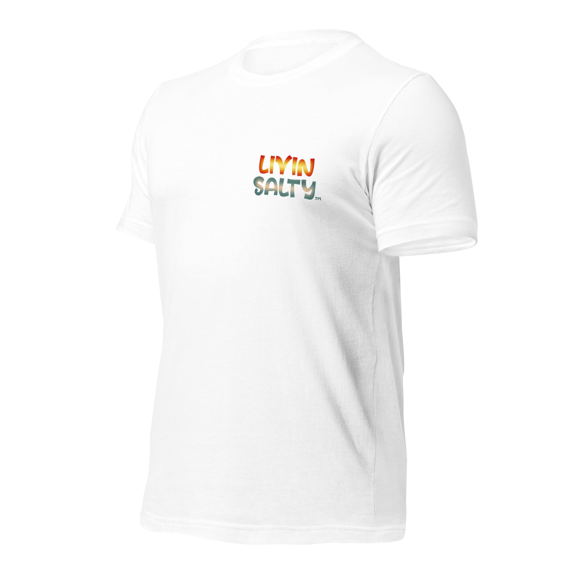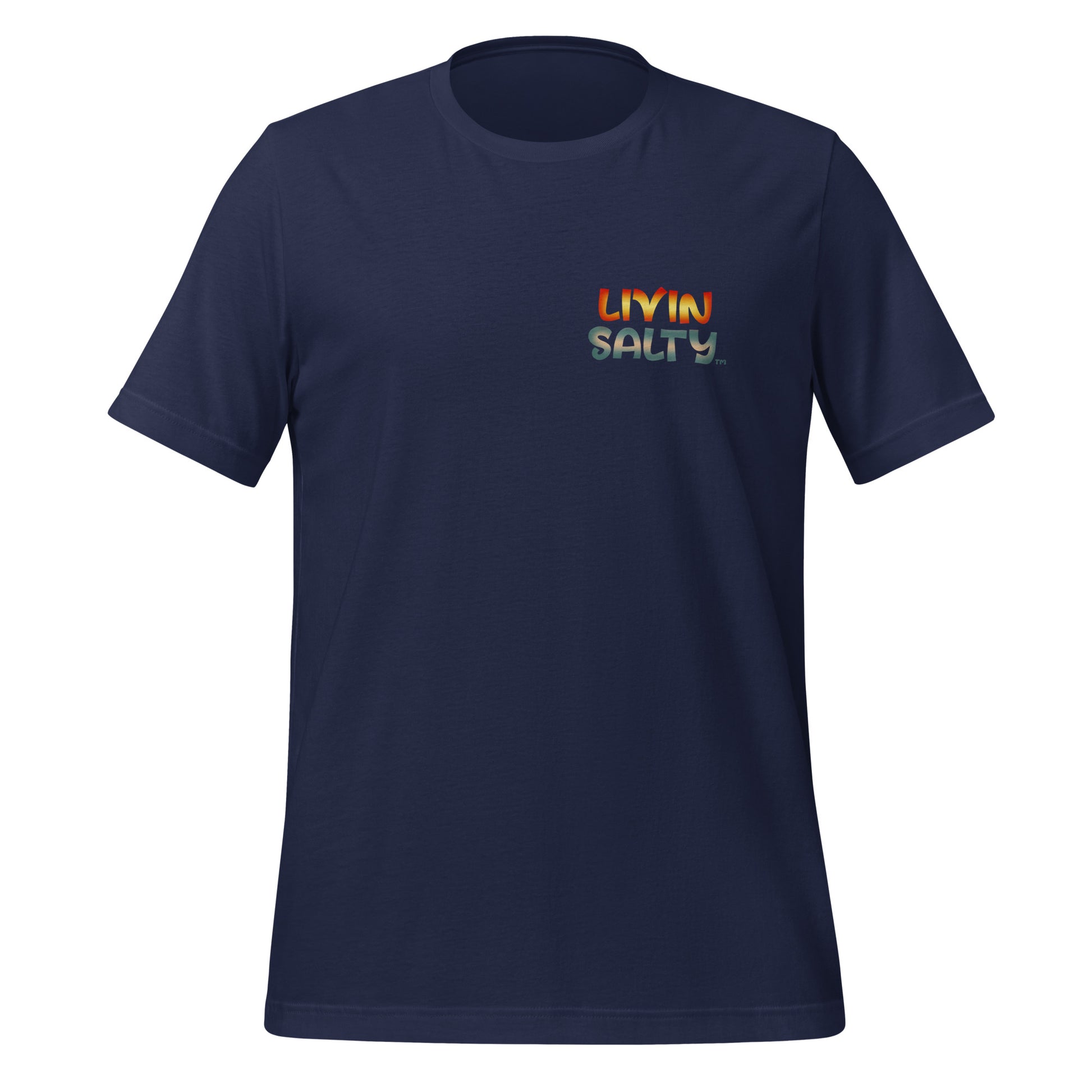 Featuring front left chest LIVIN SALTY with LIVIN SALTY surf board design on the back.