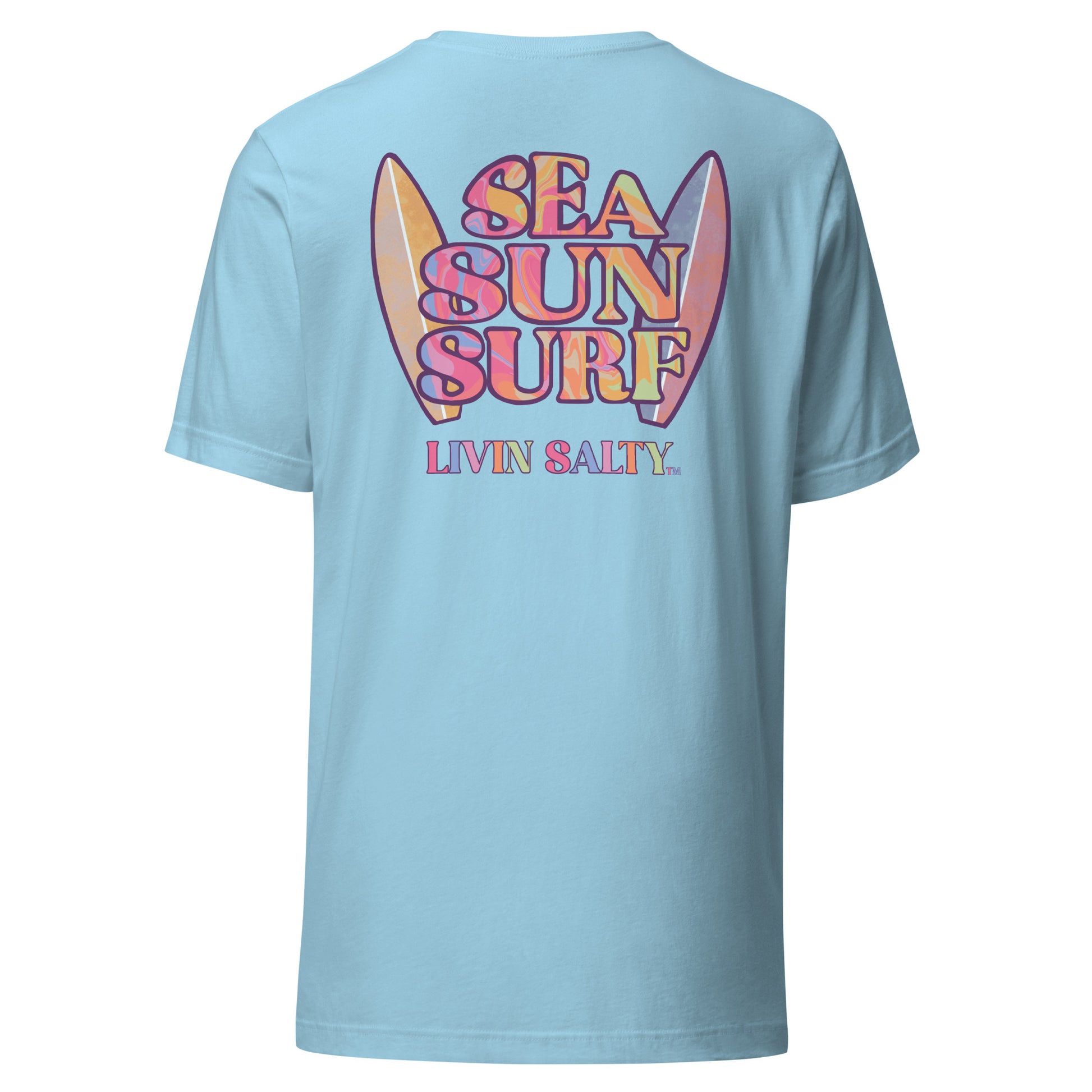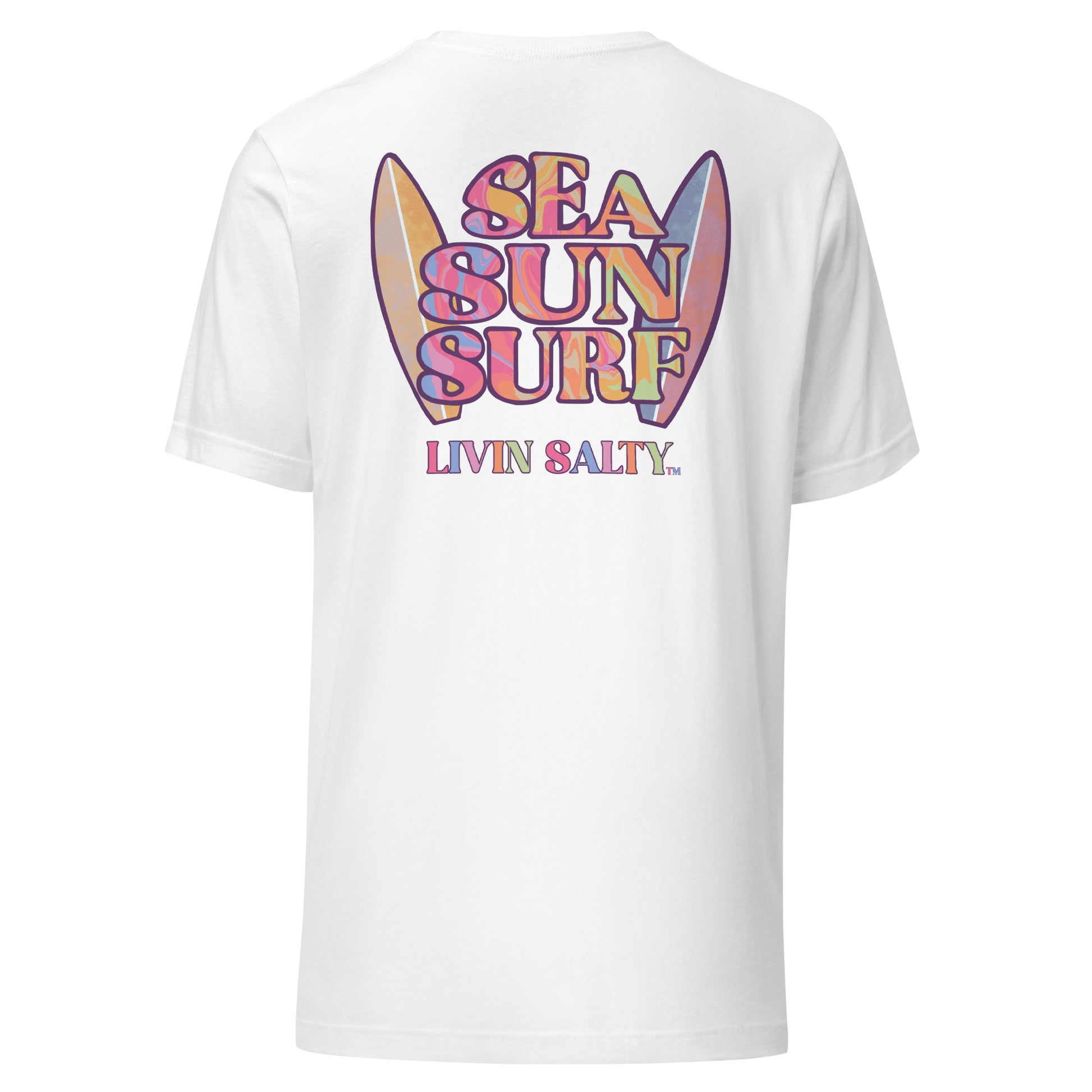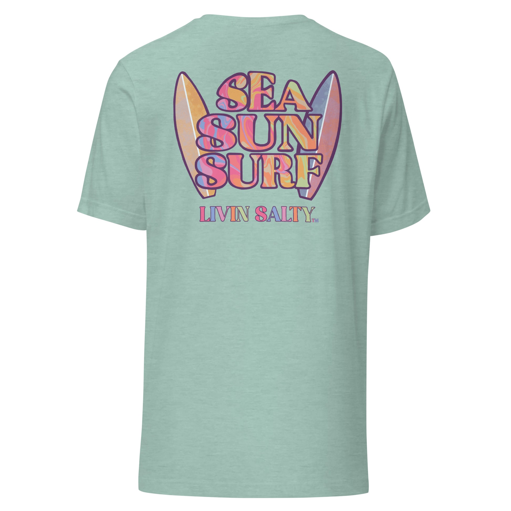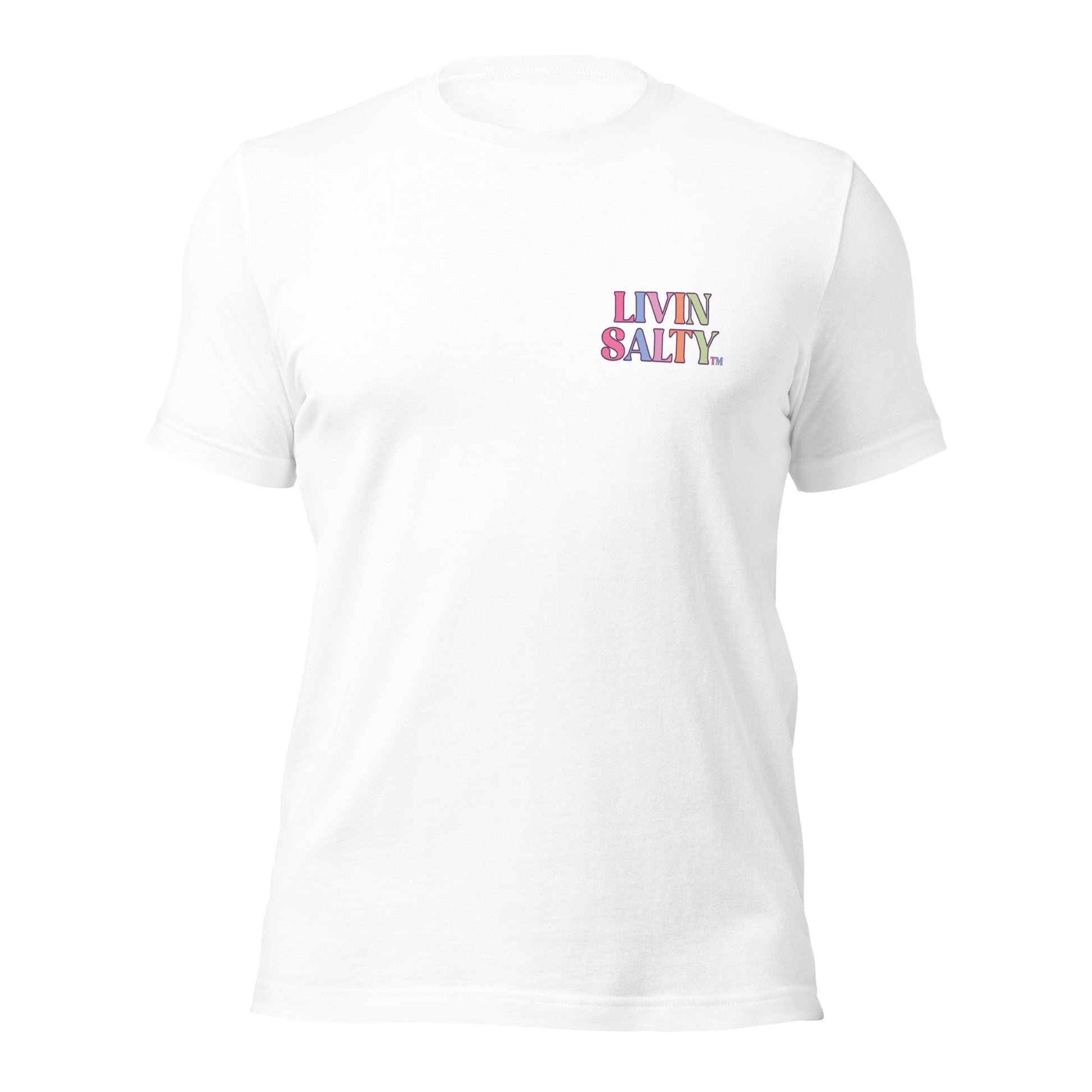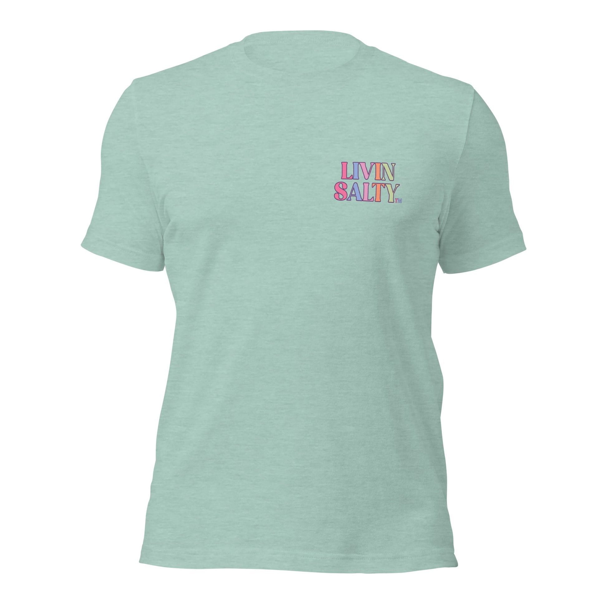 This colorful design features LIVIN SALTY on the front with LIVIN SALTY Sea, Sun, Surf on the back.