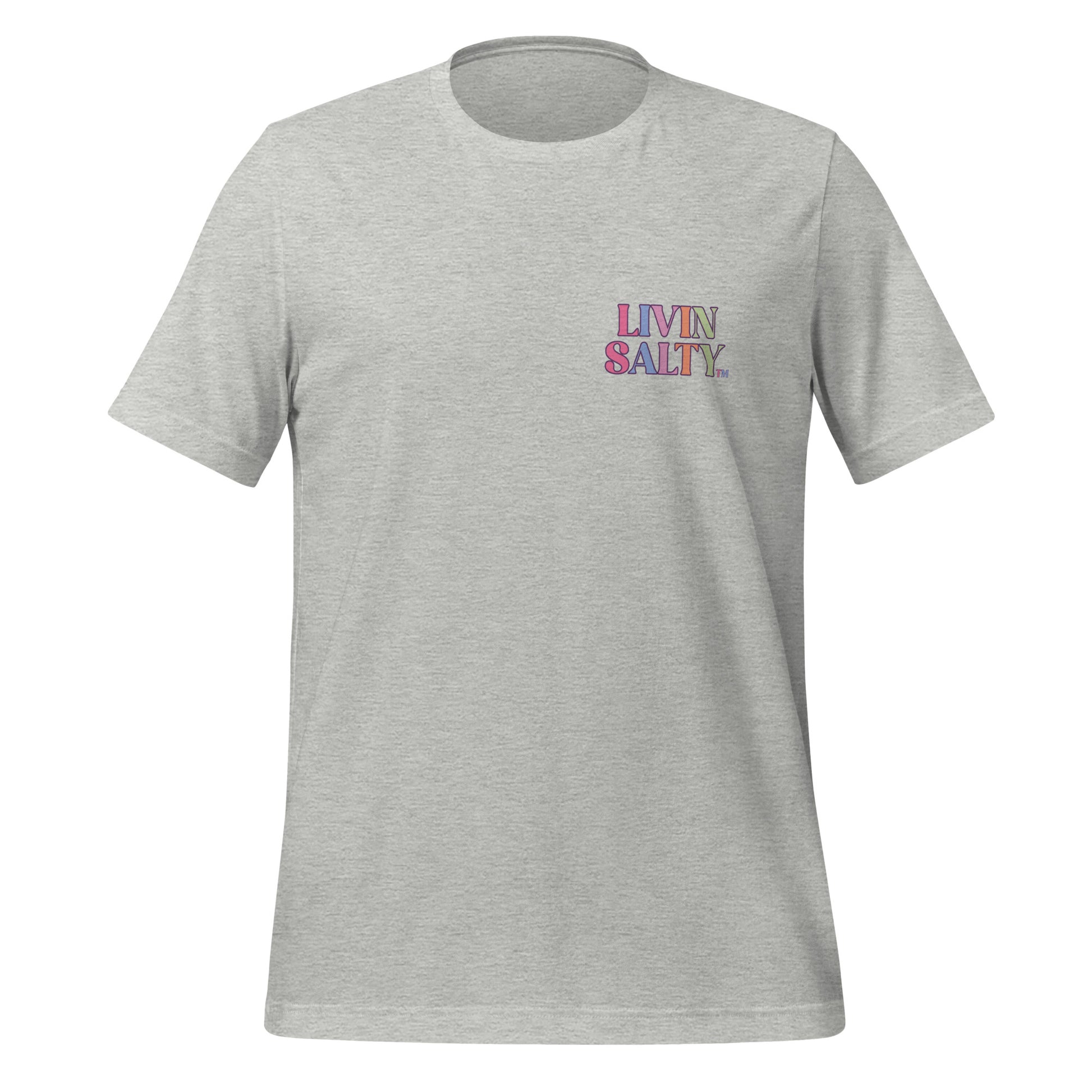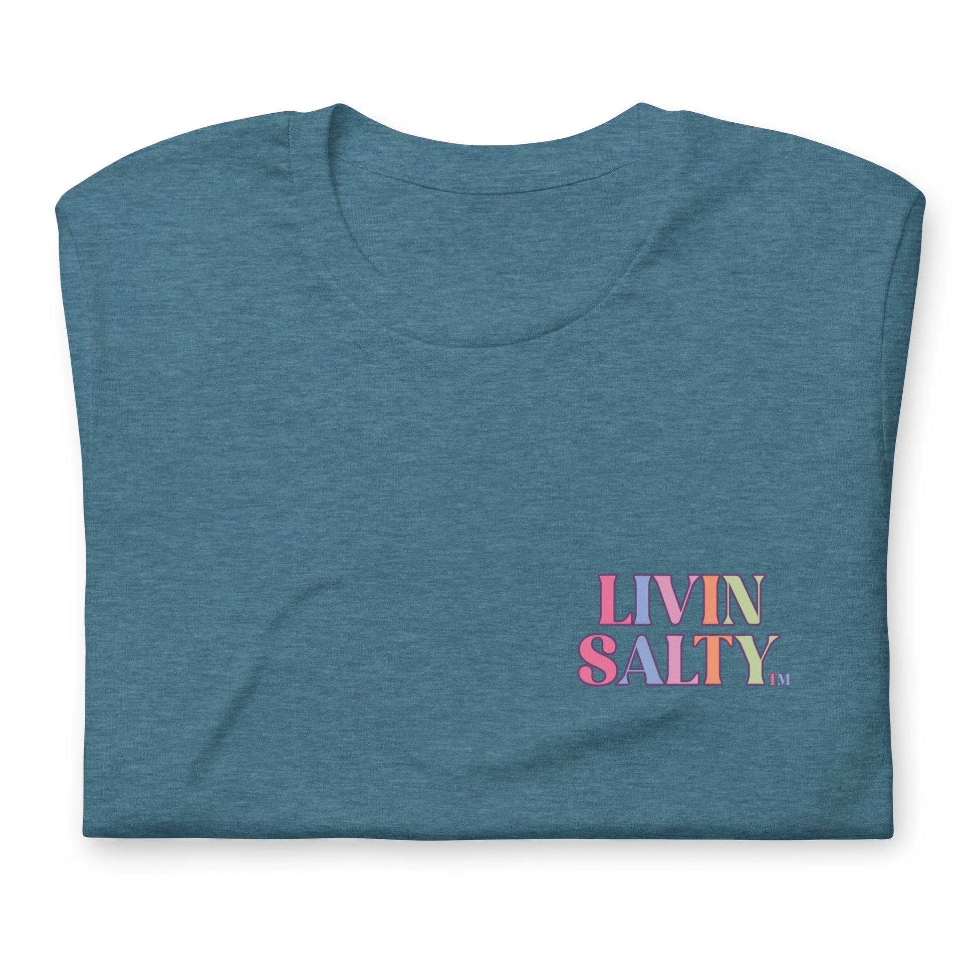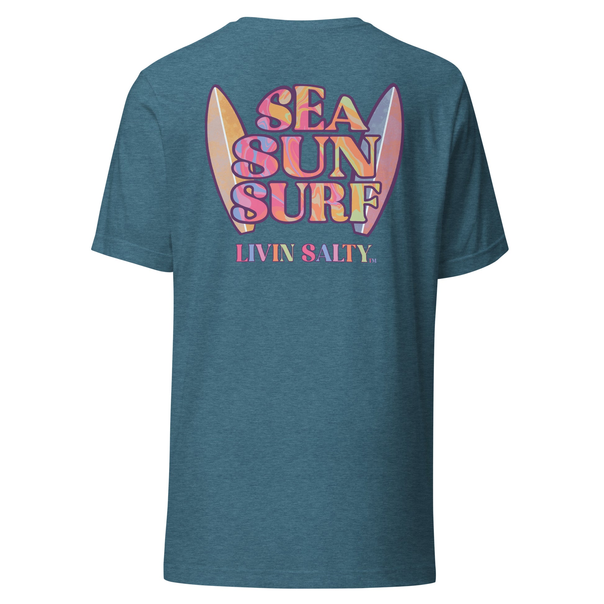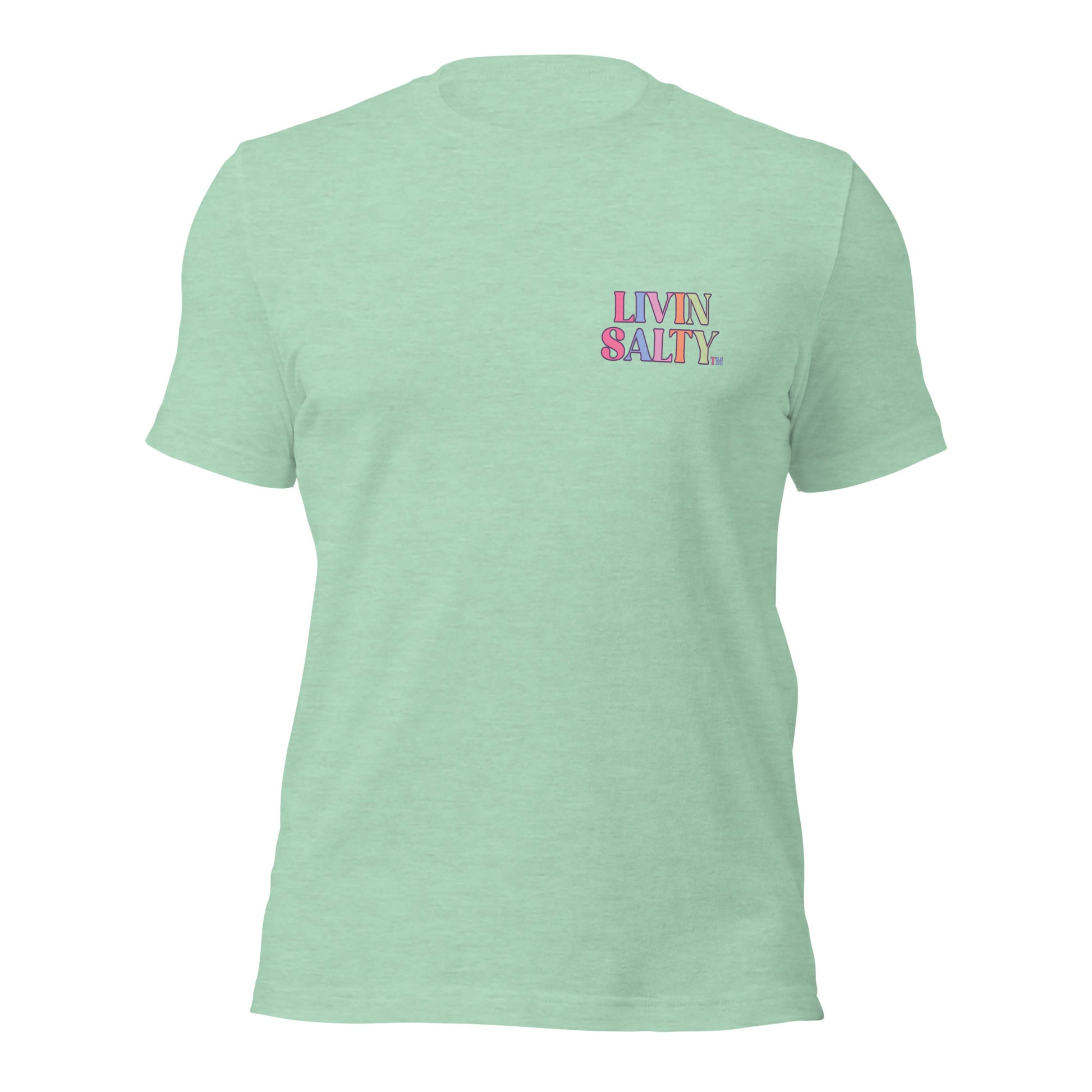This colorful design features LIVIN SALTY on the front with LIVIN SALTY Sea, Sun, Surf on the back.