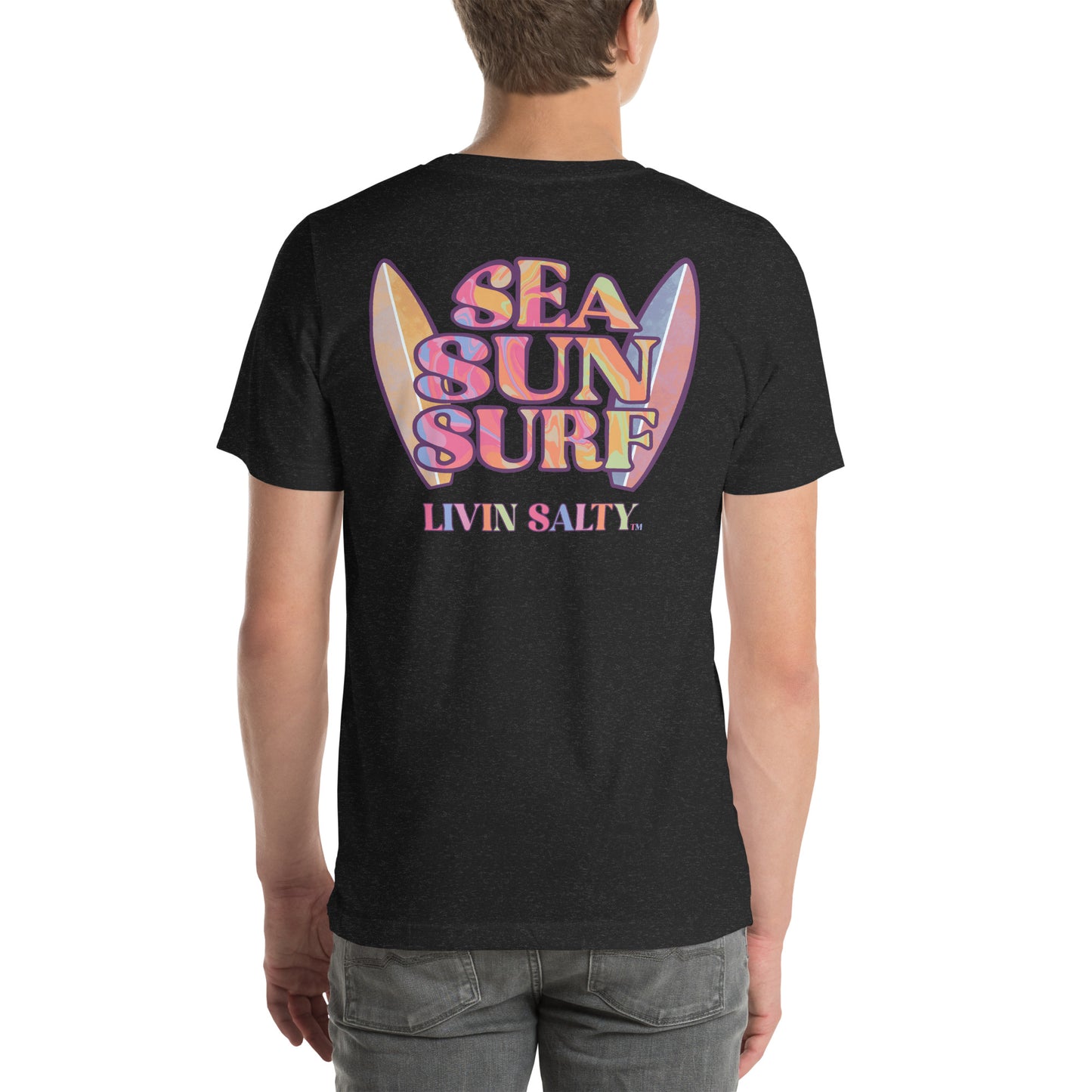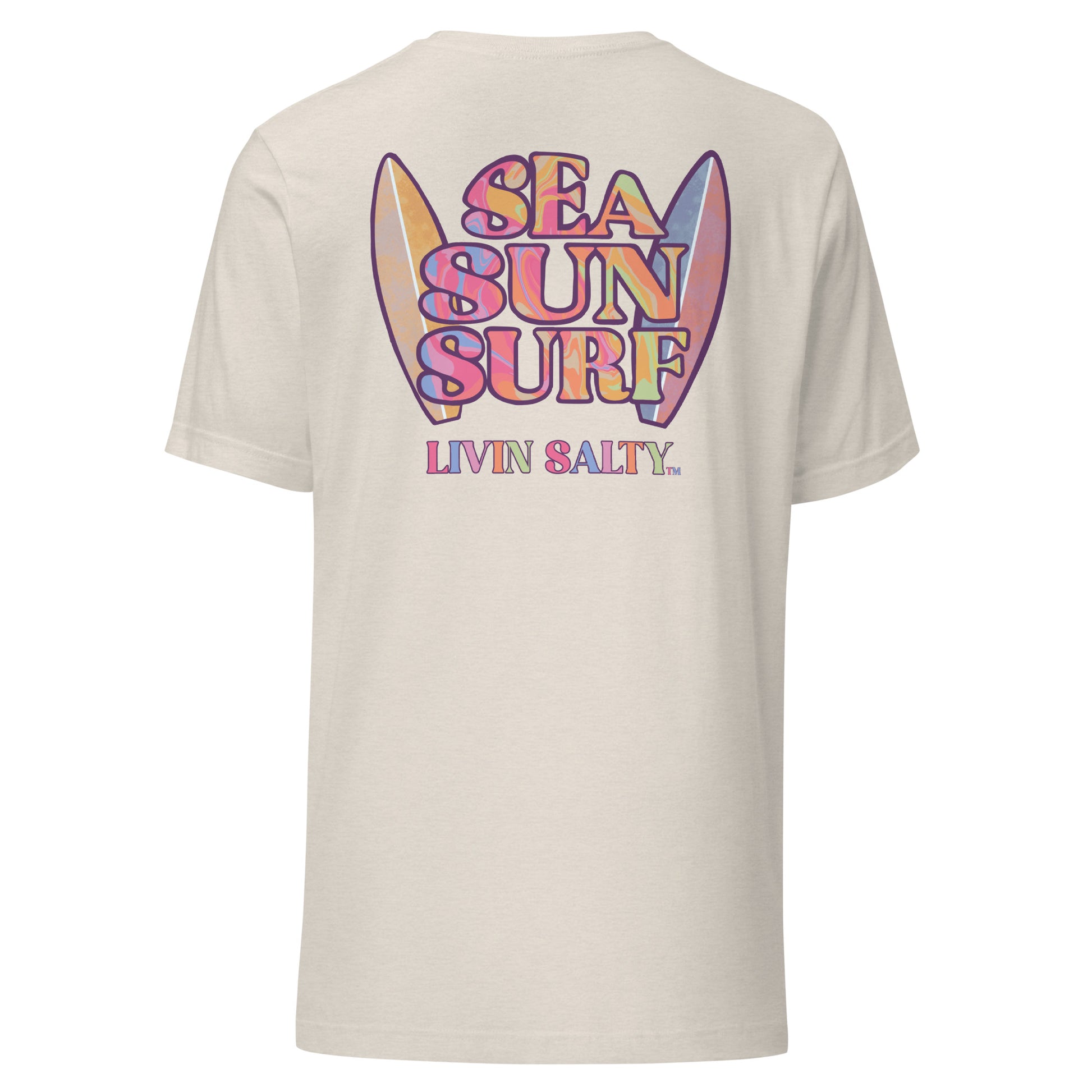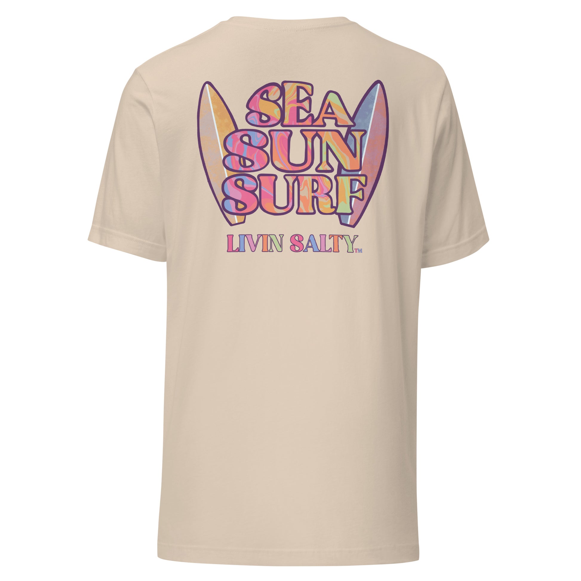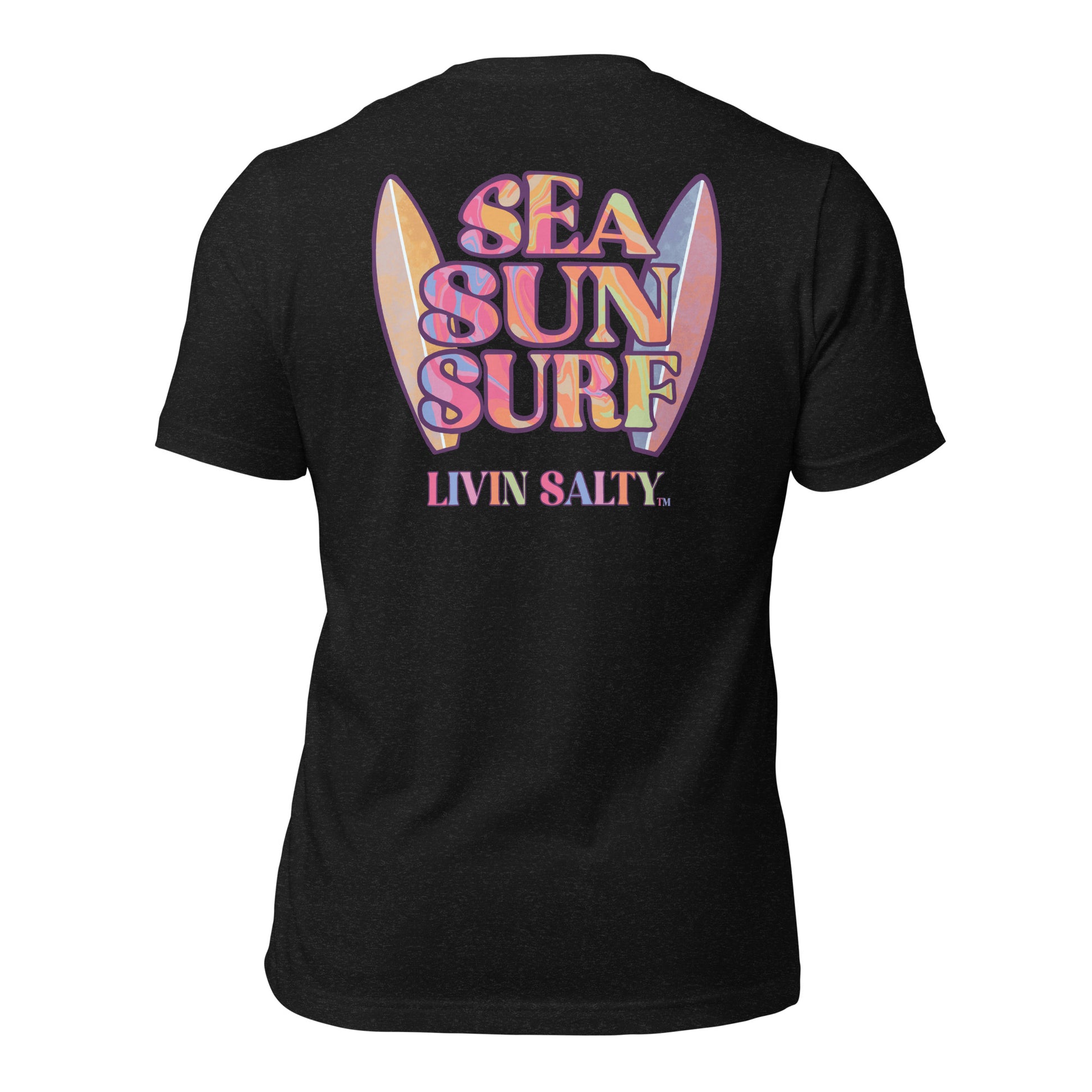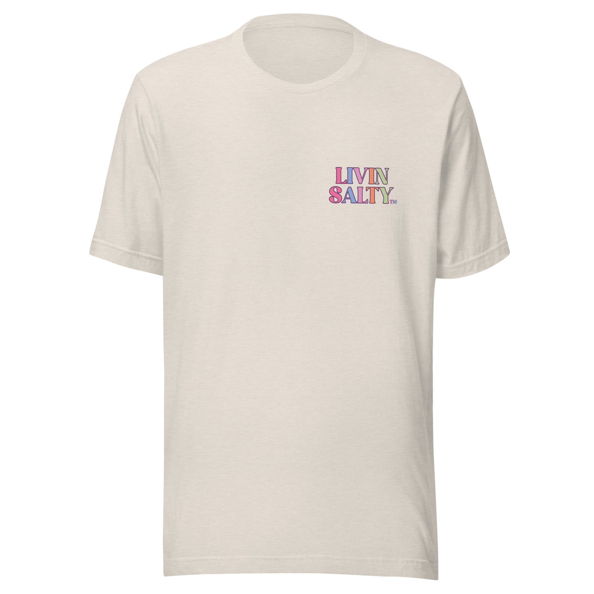This colorful design features LIVIN SALTY on the front with LIVIN SALTY Sea, Sun, Surf on the back.
