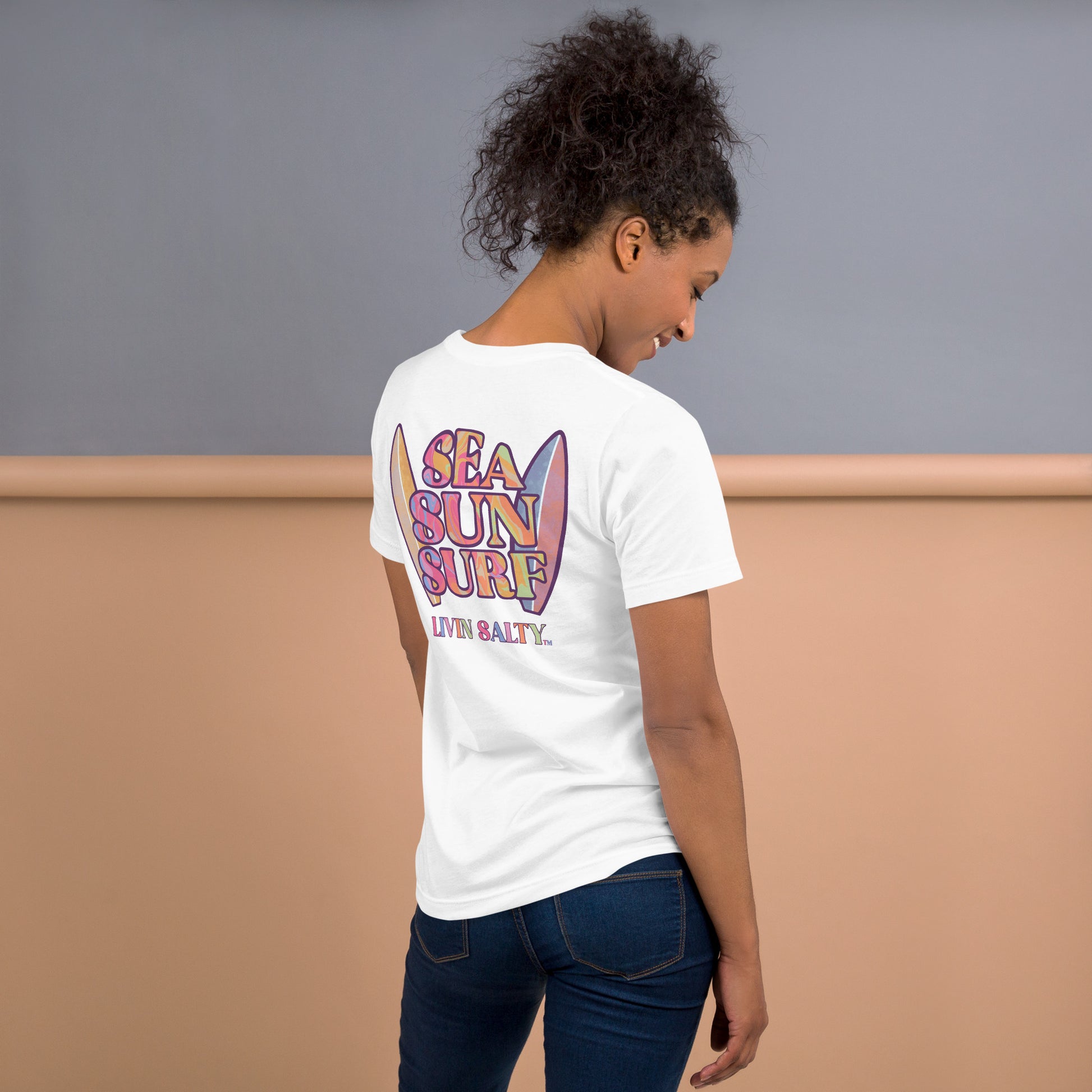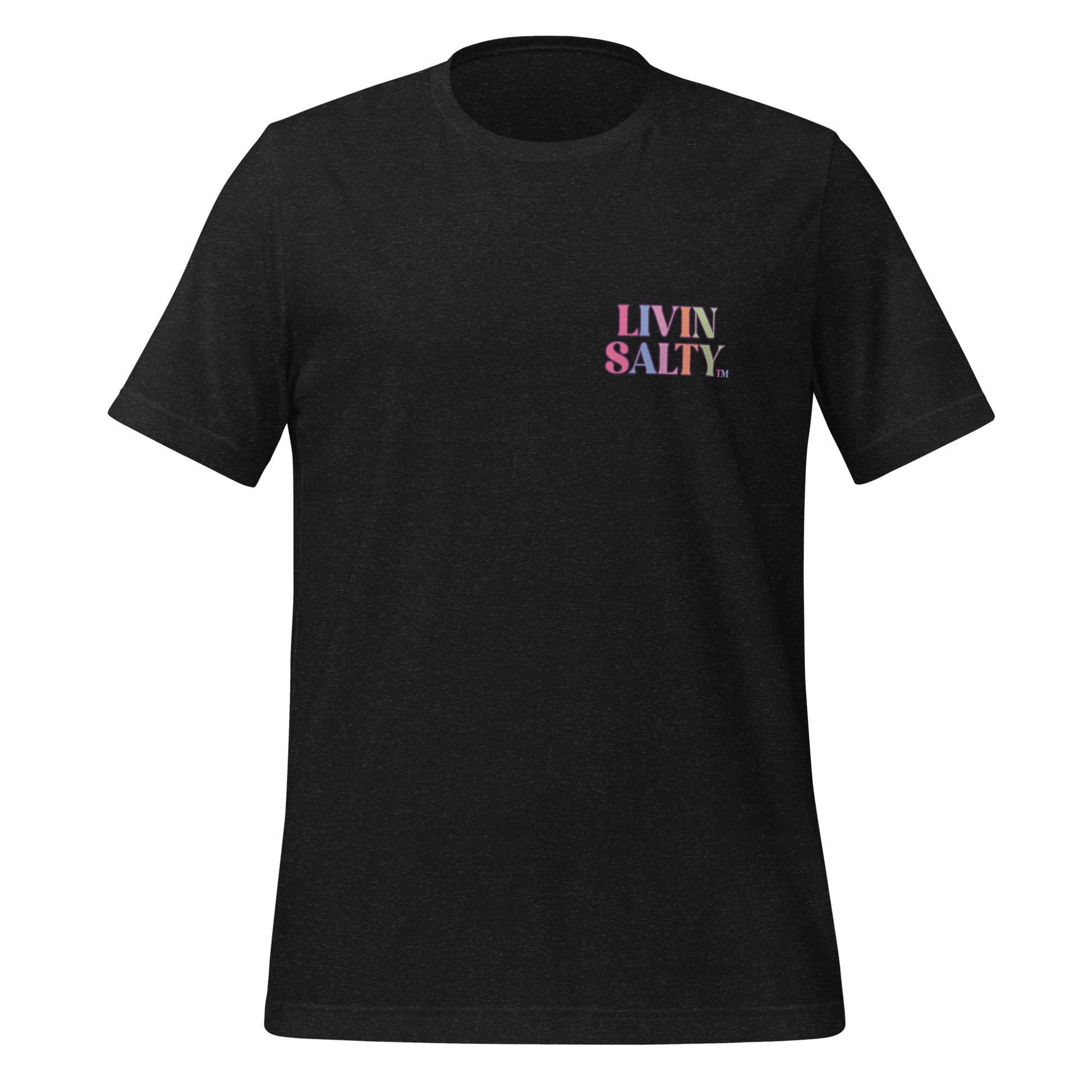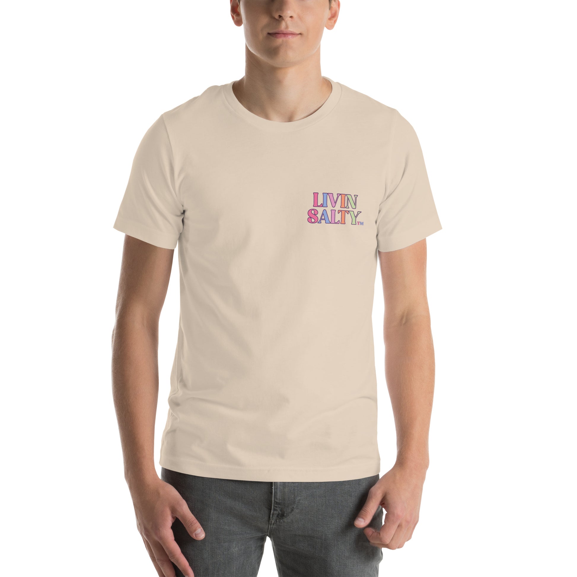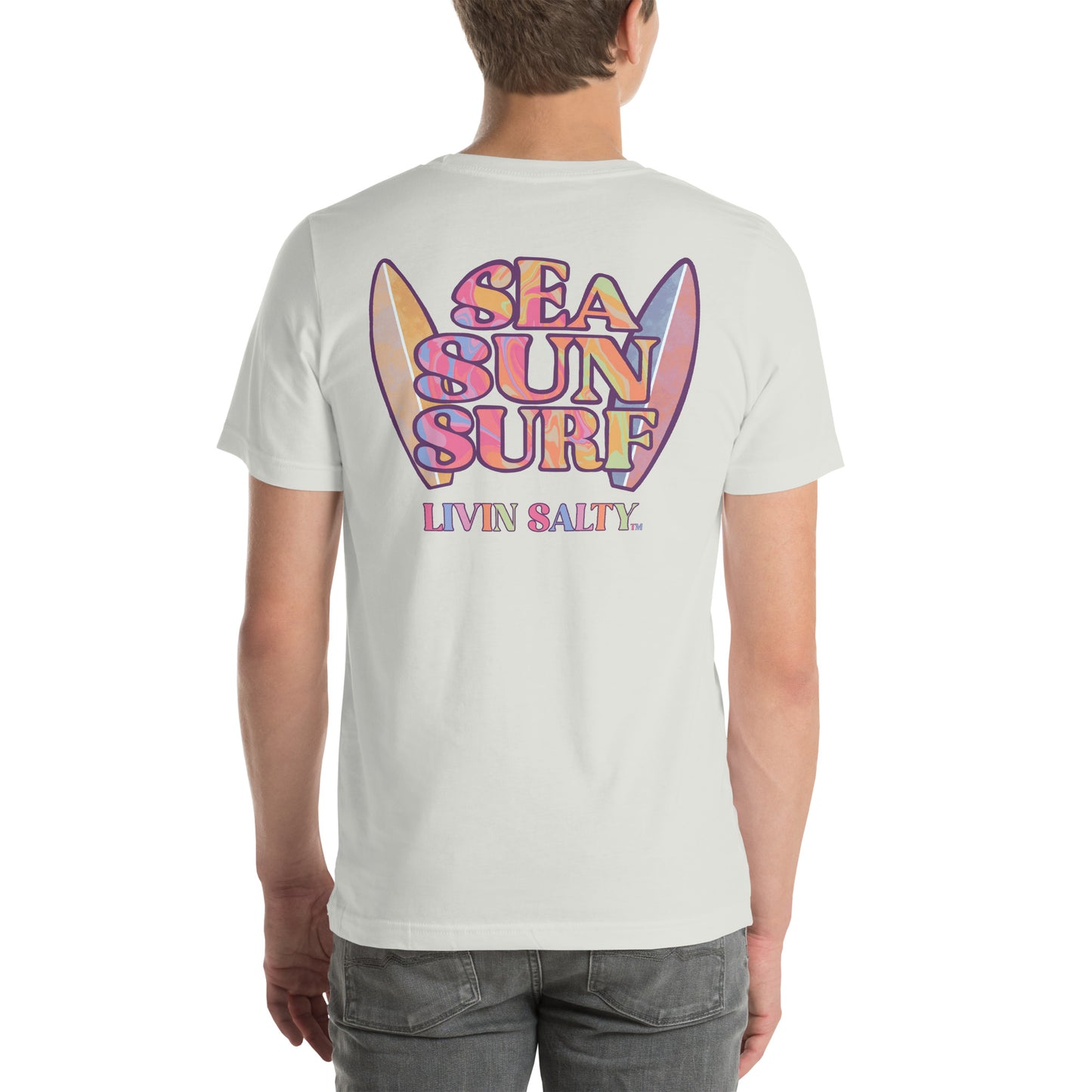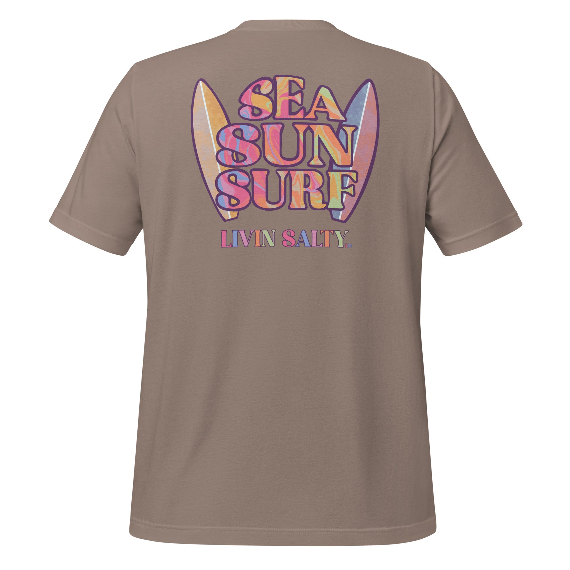 This colorful design features LIVIN SALTY on the front with LIVIN SALTY Sea, Sun, Surf on the back.